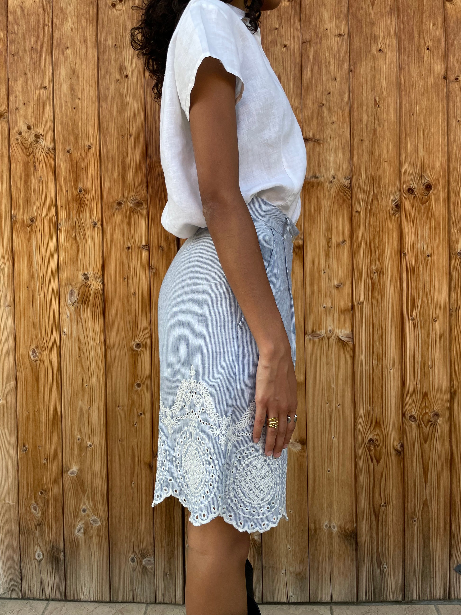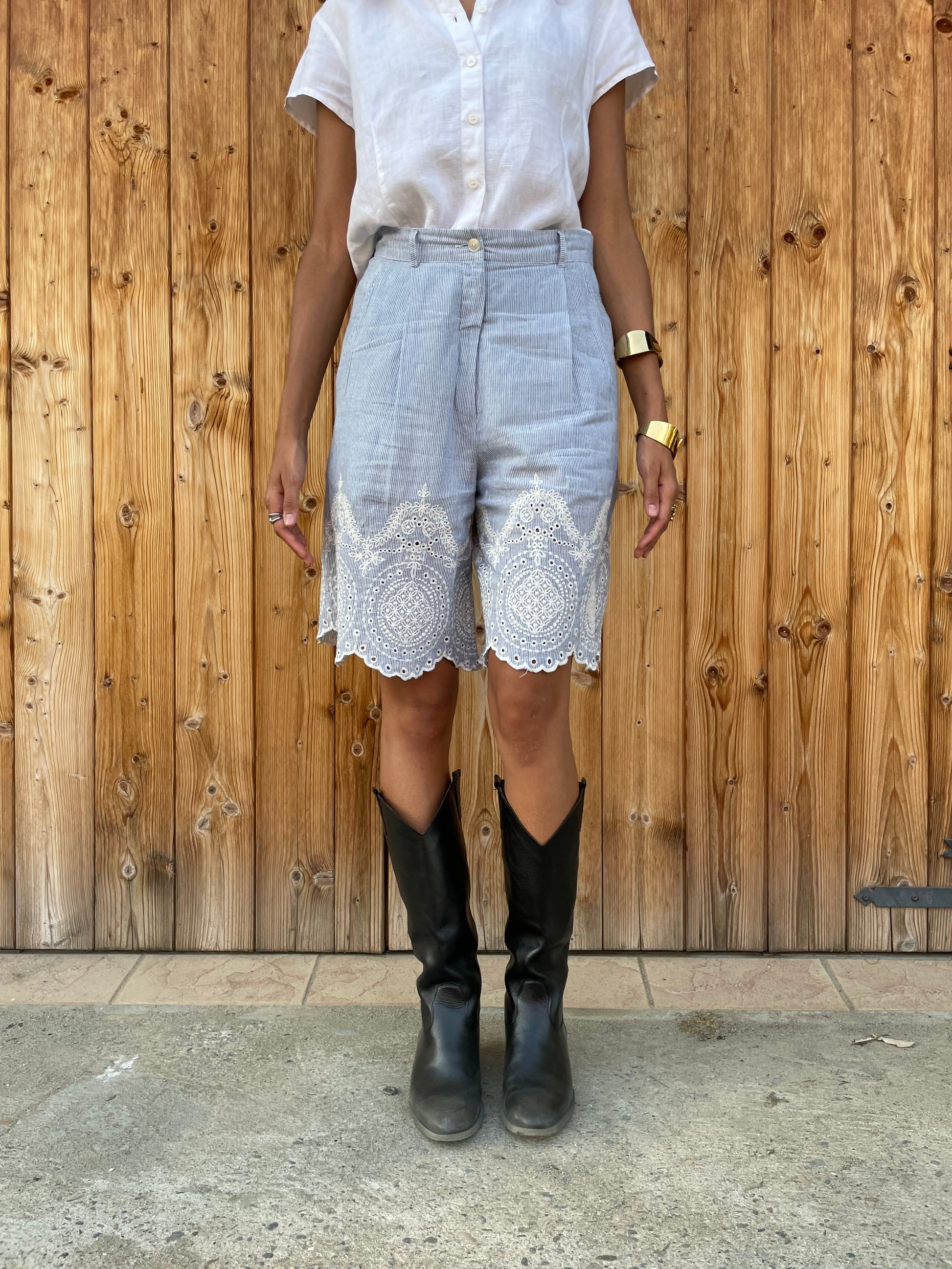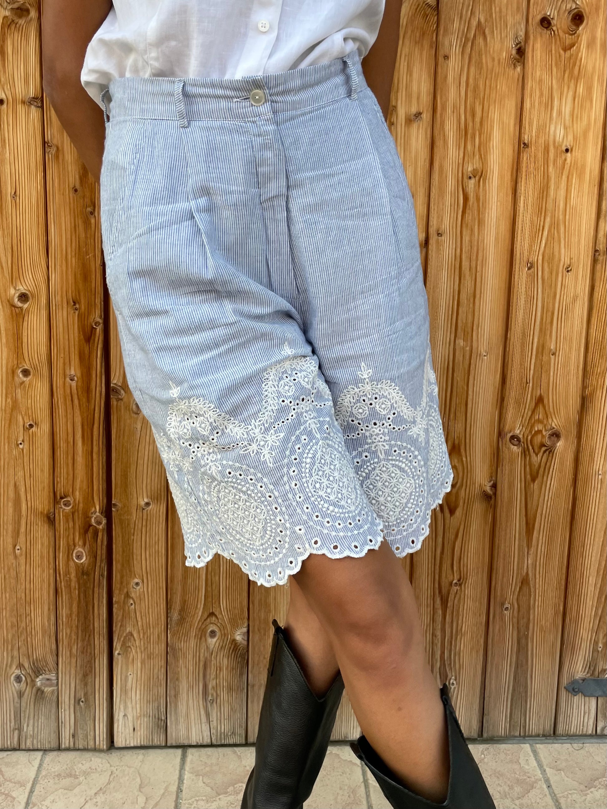 Bellissimo bermuda vichy bianco e azzurro con dettagli in pizzo.
