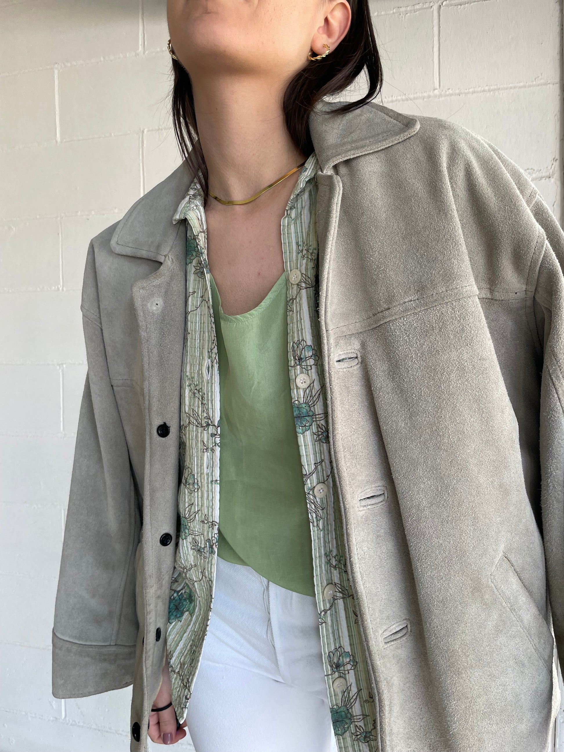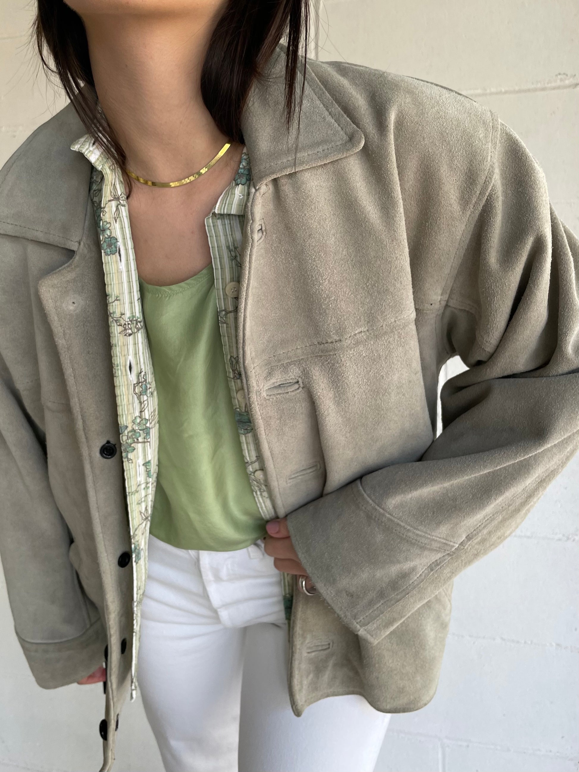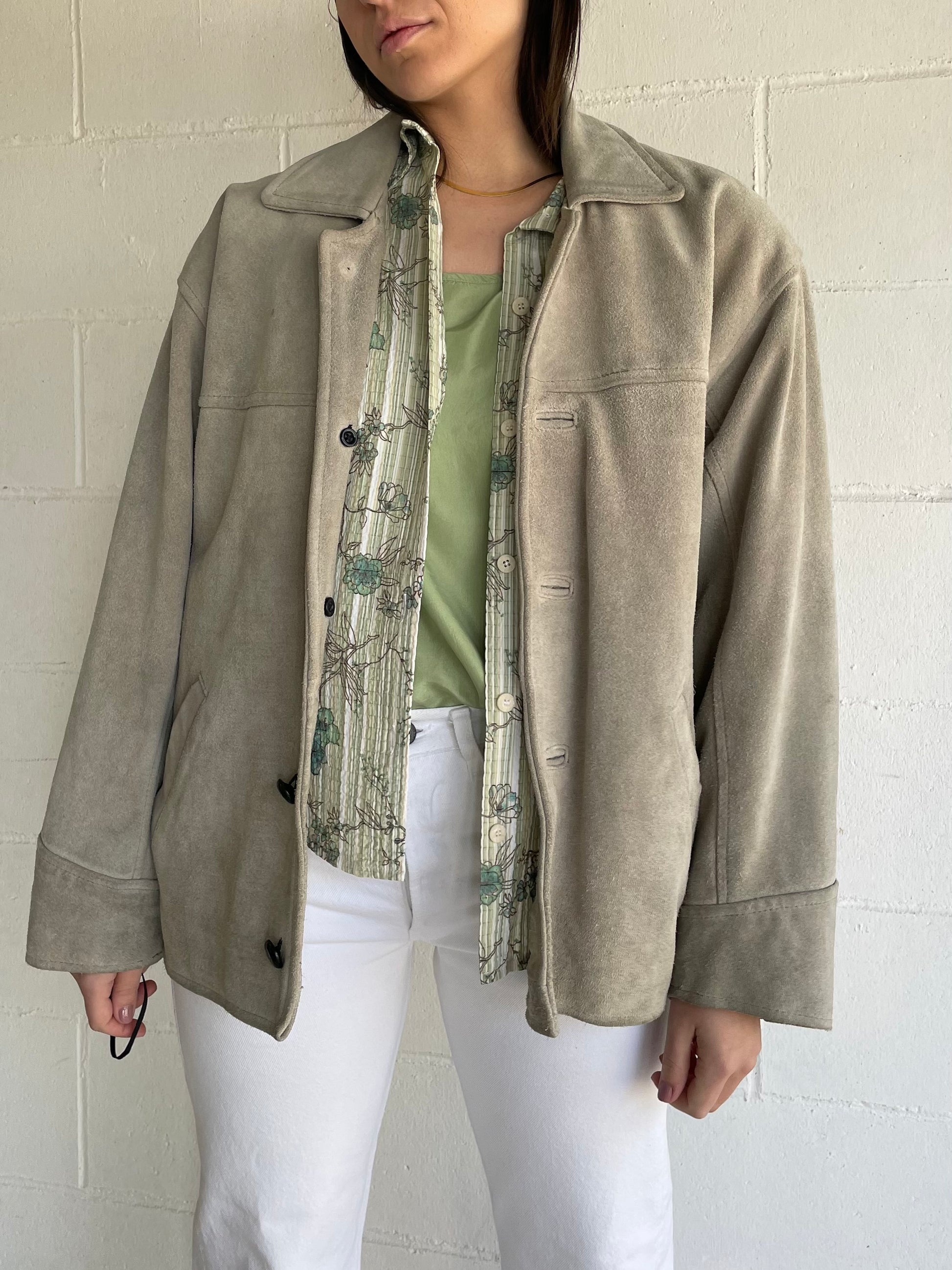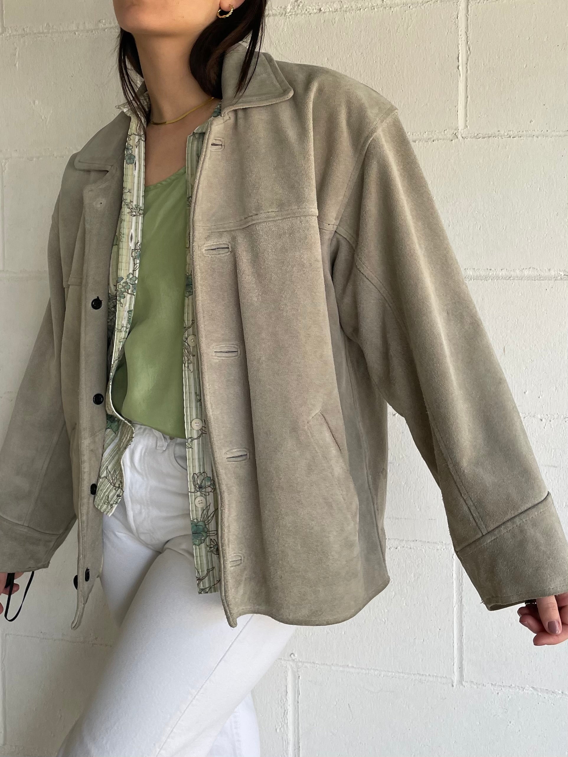 Giaccone scamosciato in vera pelle color ghiaccio / verde salvia.