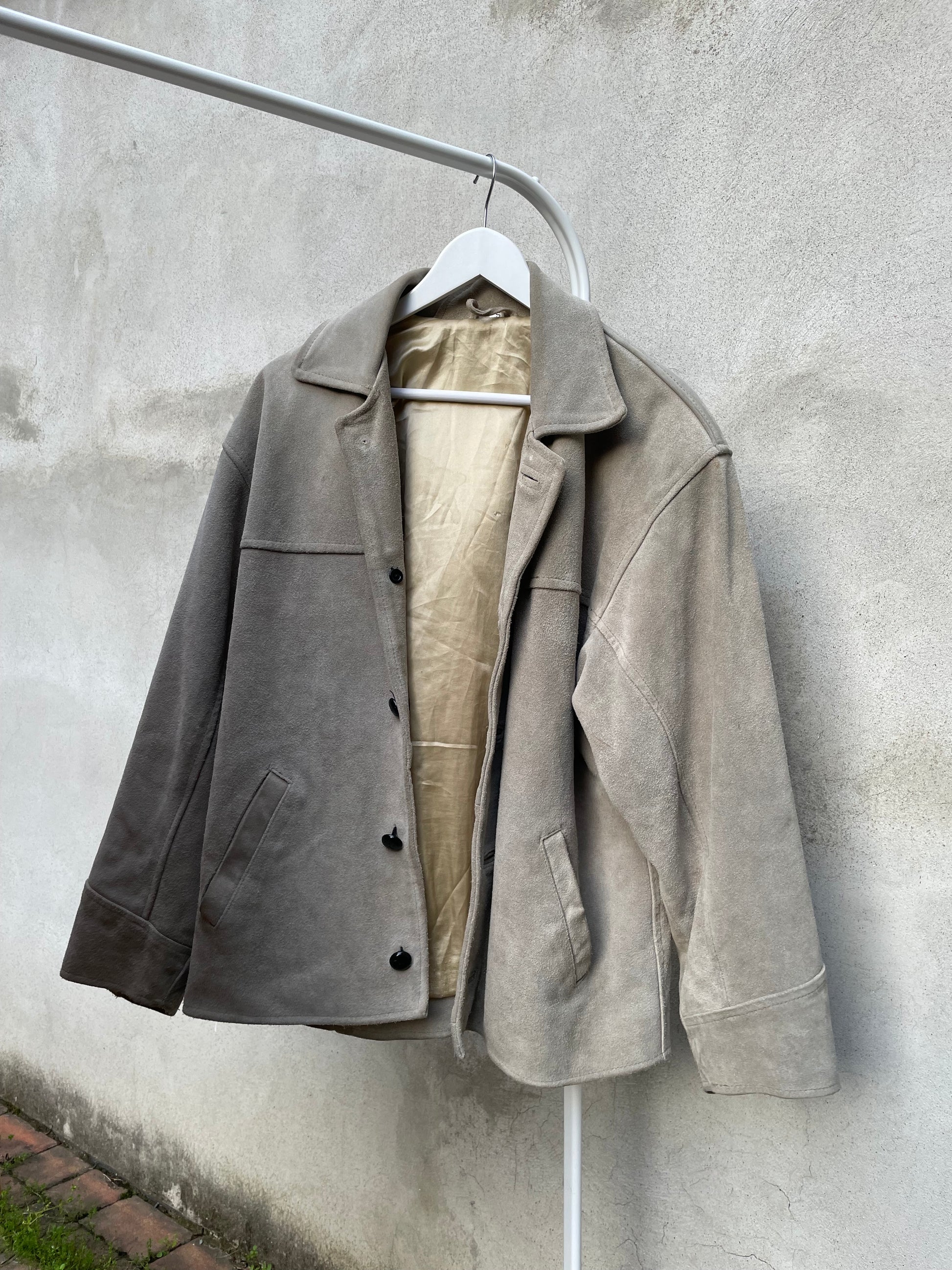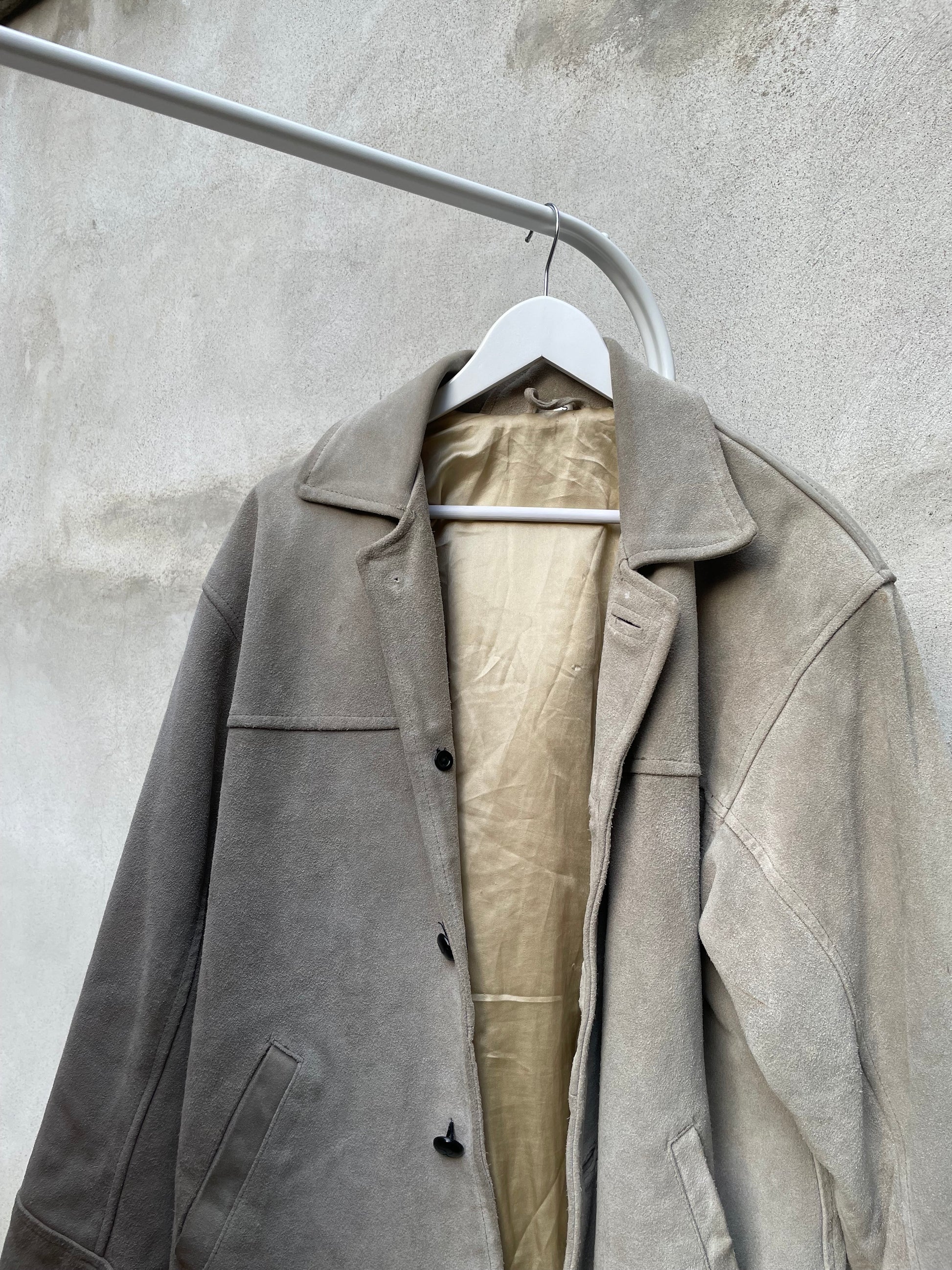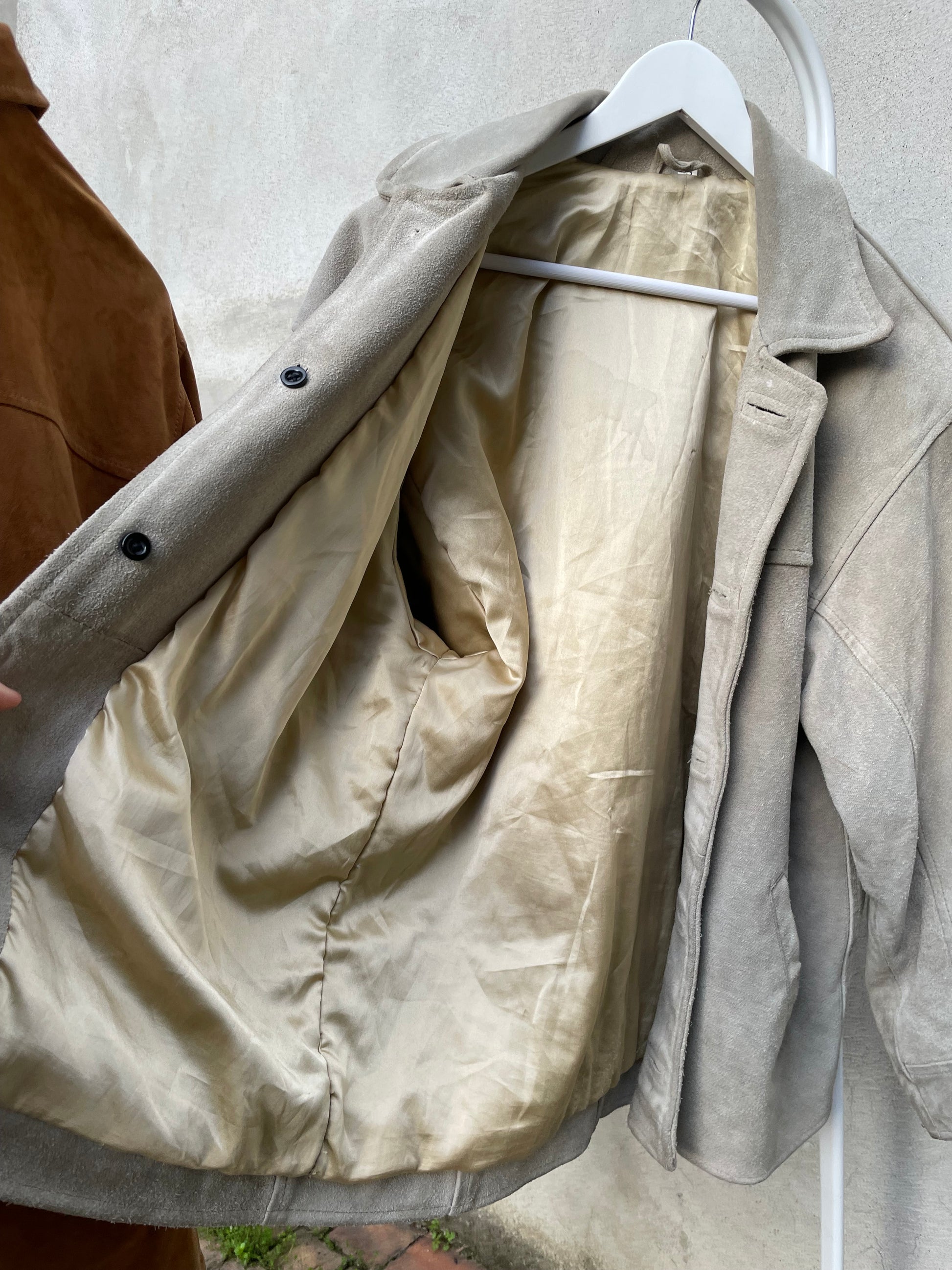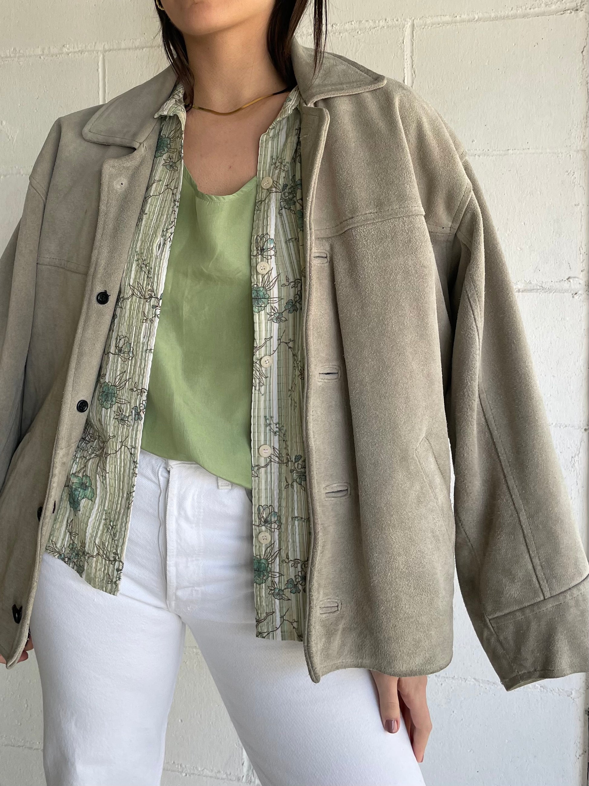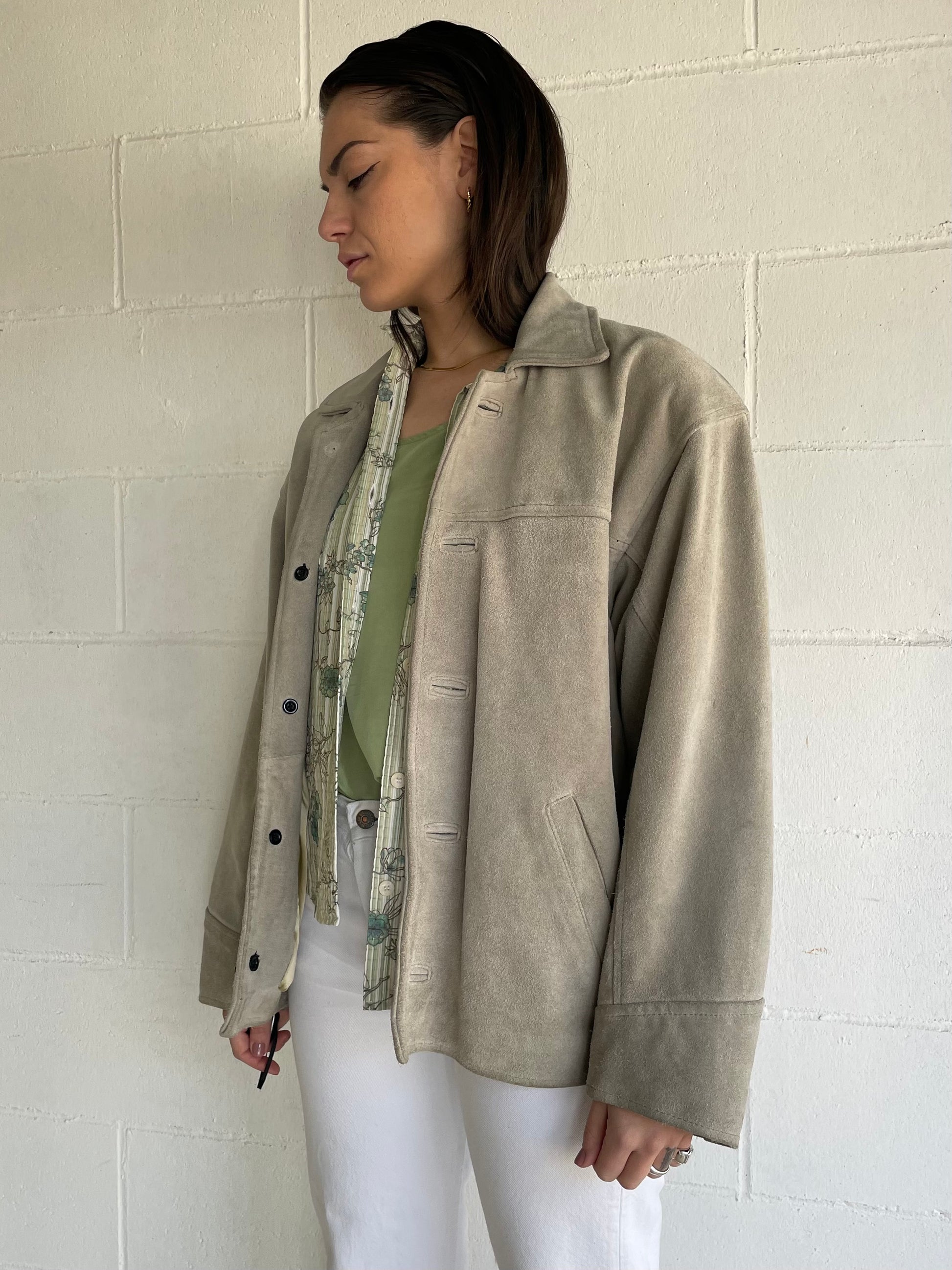 Giaccone scamosciato in vera pelle color ghiaccio / verde salvia.
