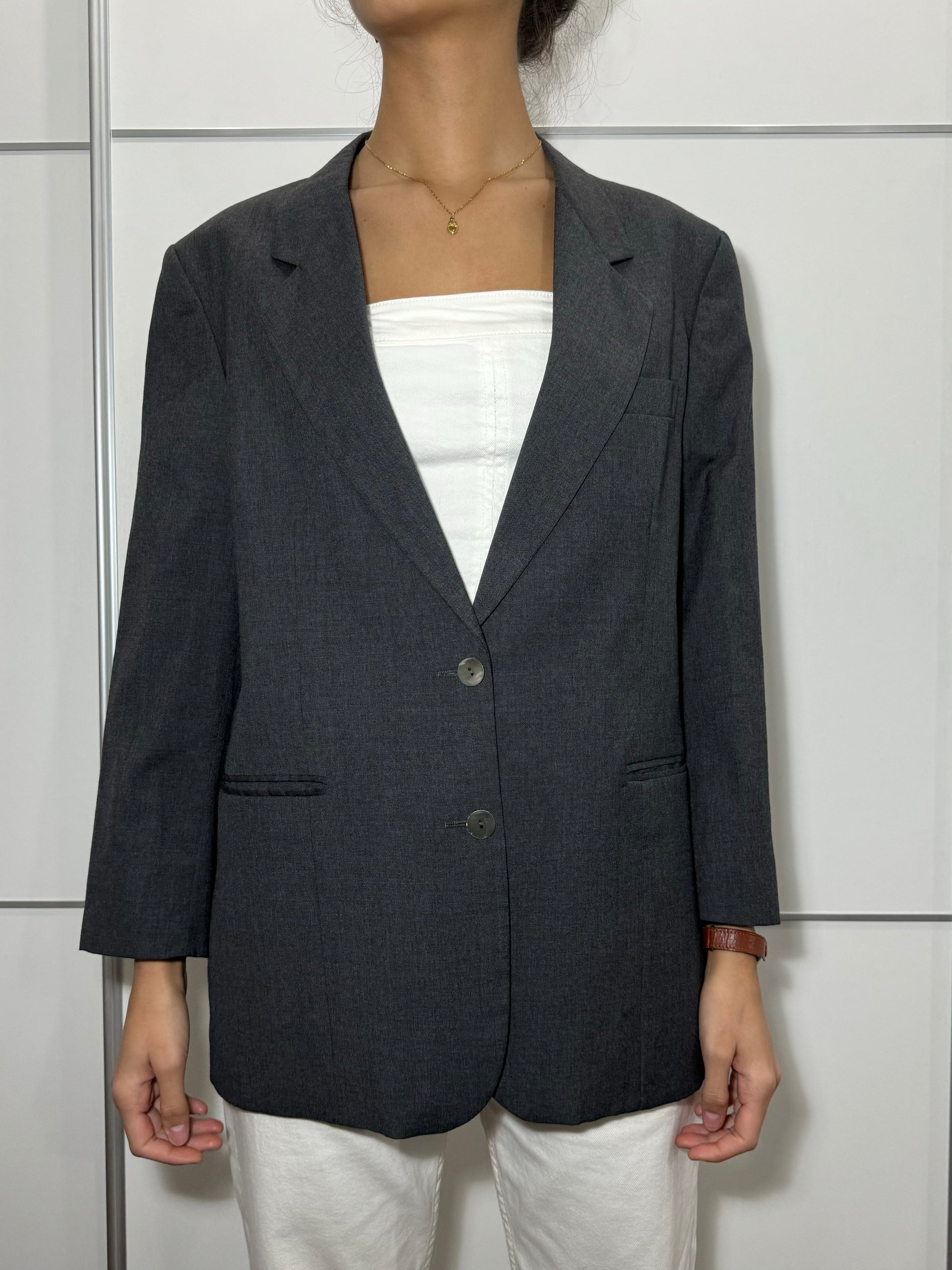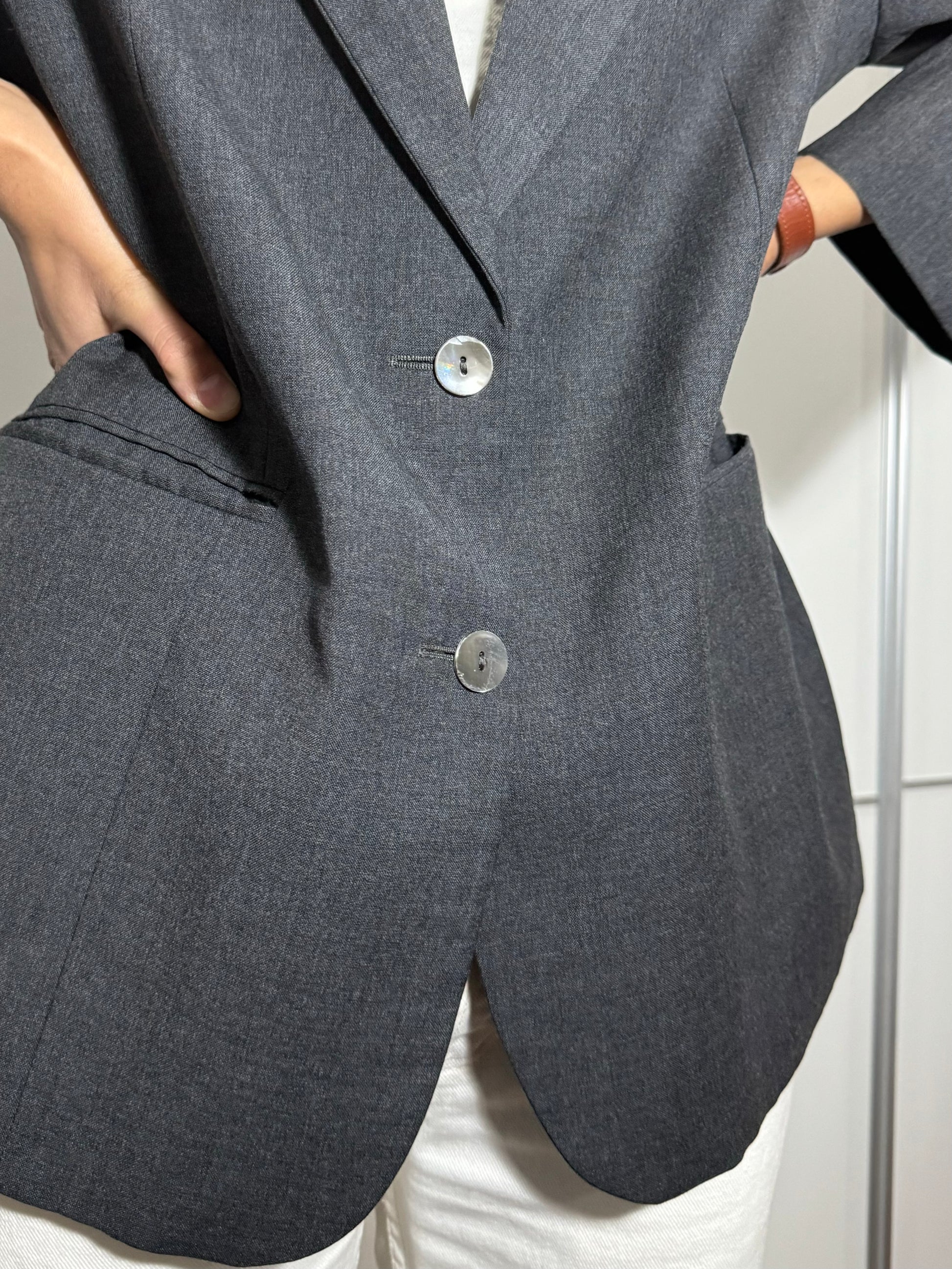 Blazer donna monopetto grigio 100% lana vergine, bottoni in madreperla.