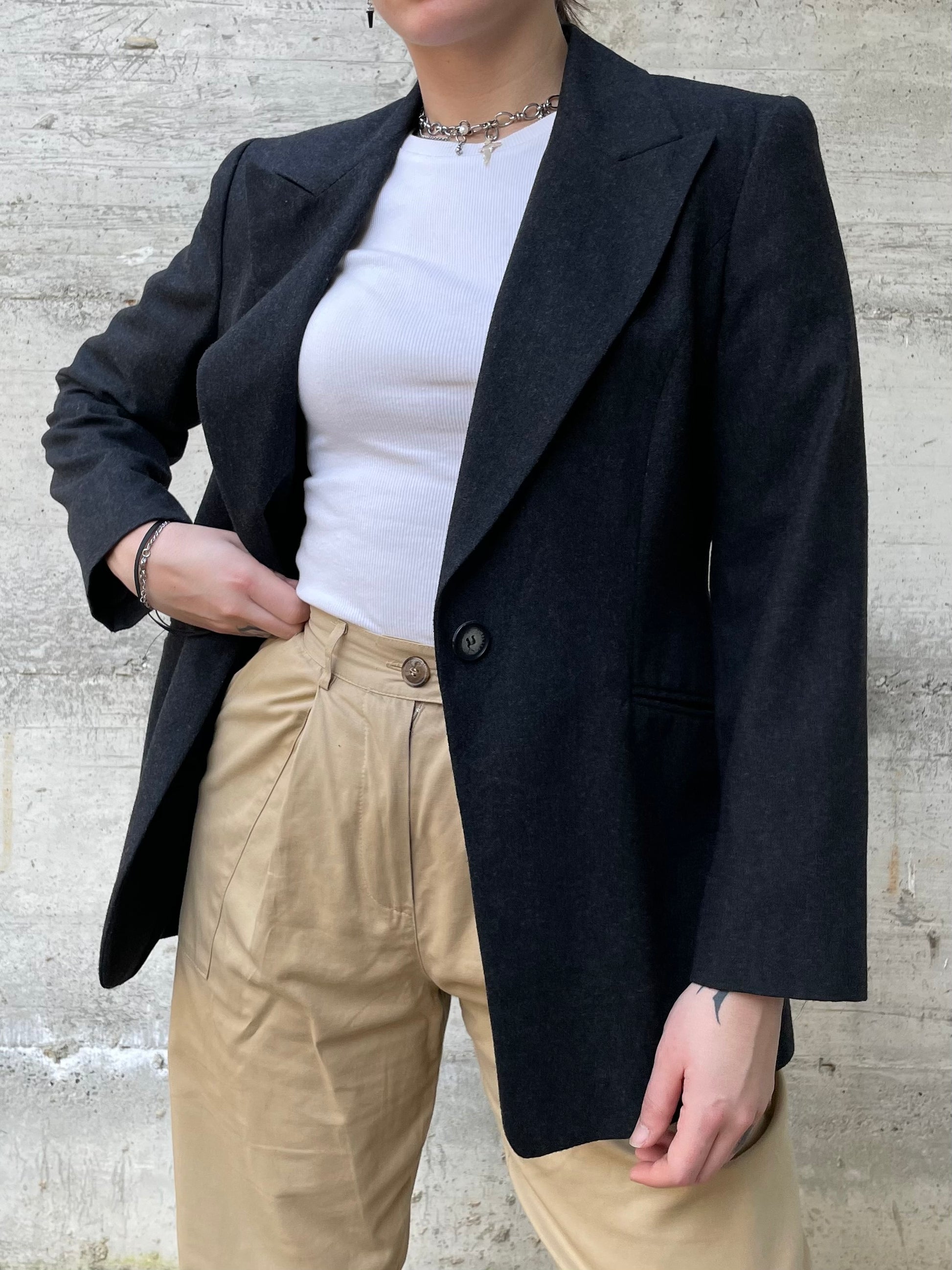 Blazer monopetto grigio scuro 80% lana, modello sfiancato, chiusura con un bottone frontale, tasche a filetto.