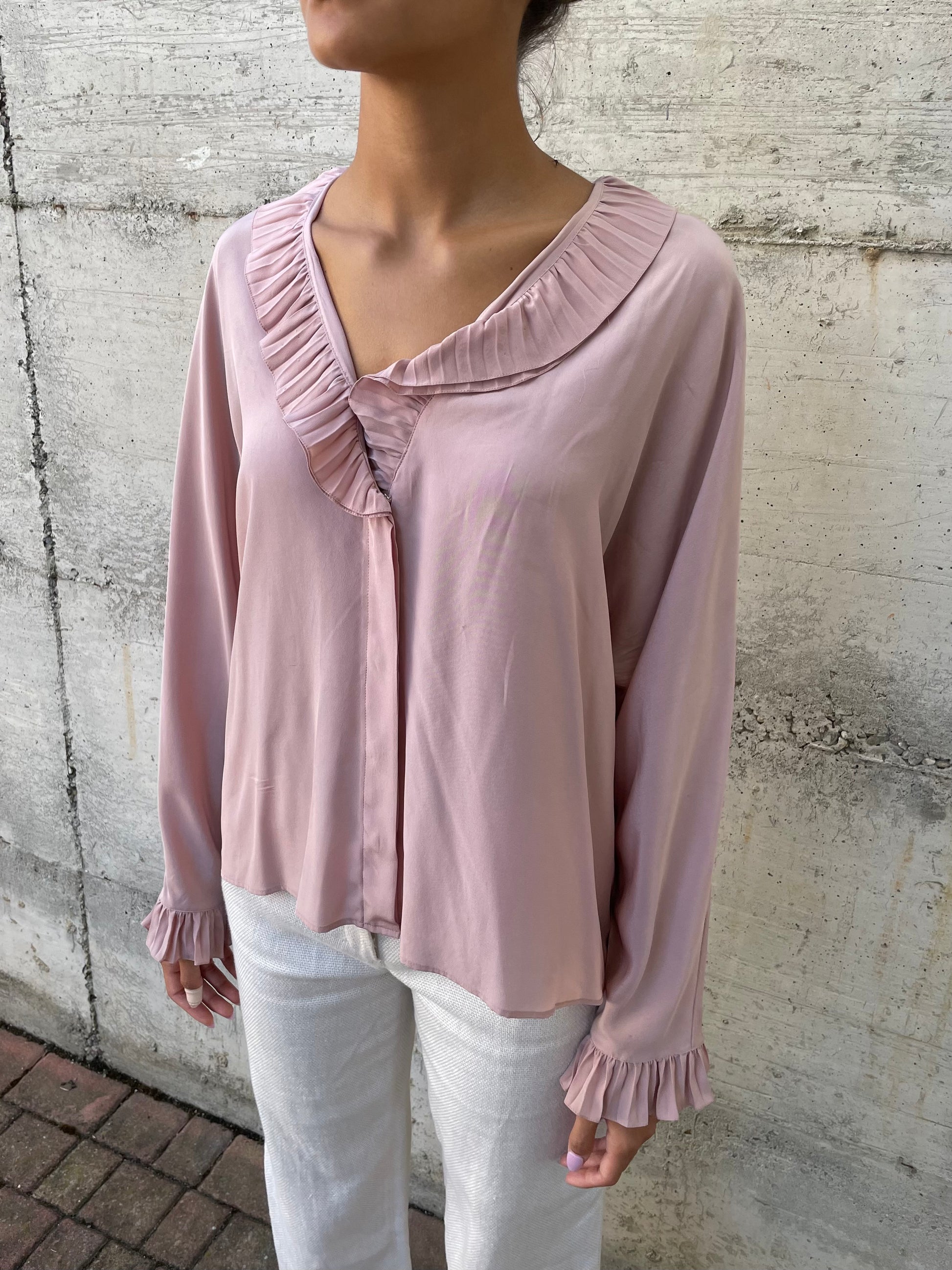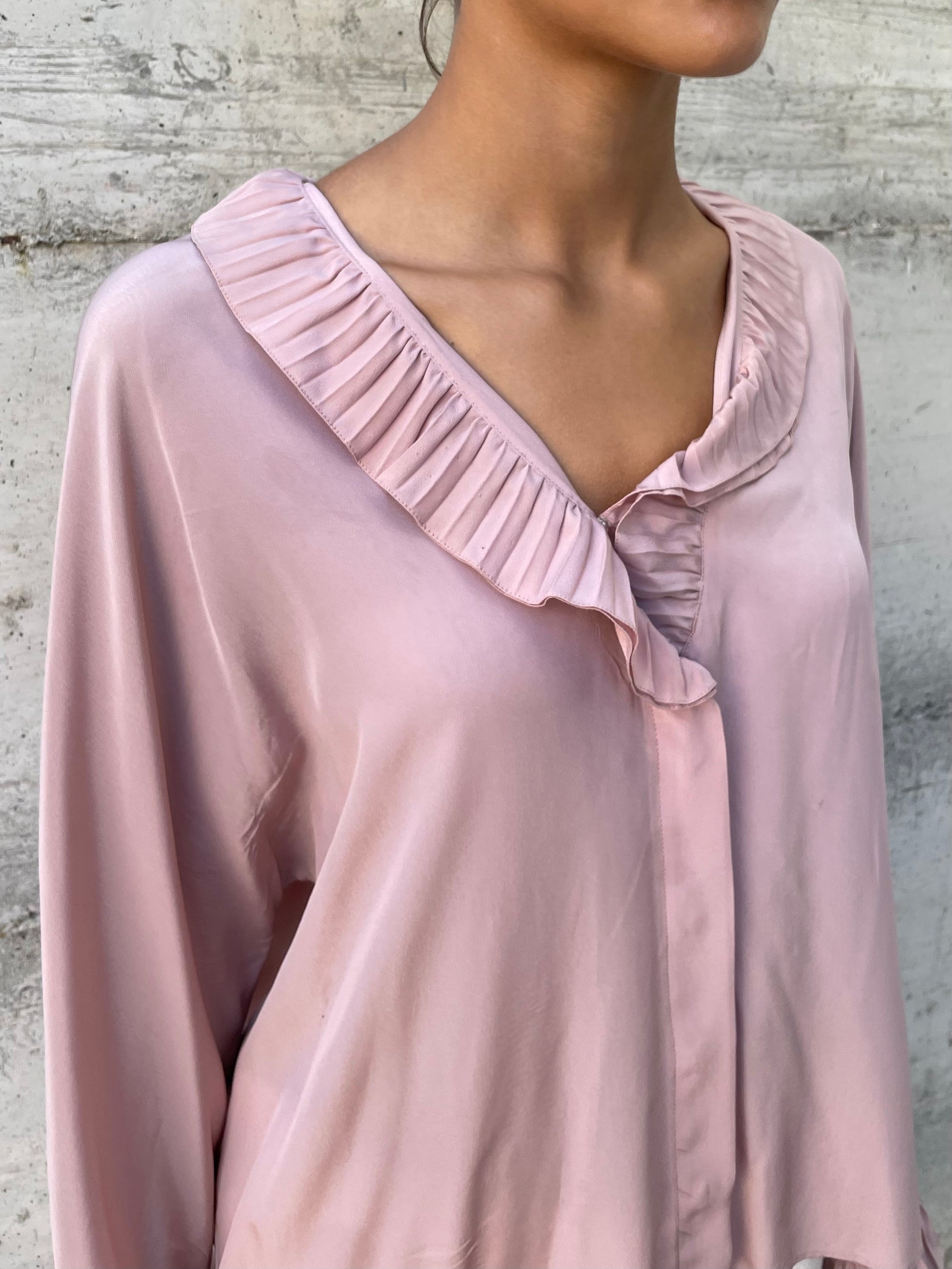 Blusa 100% seta scollo a V e balze, rosa antico, taglia L