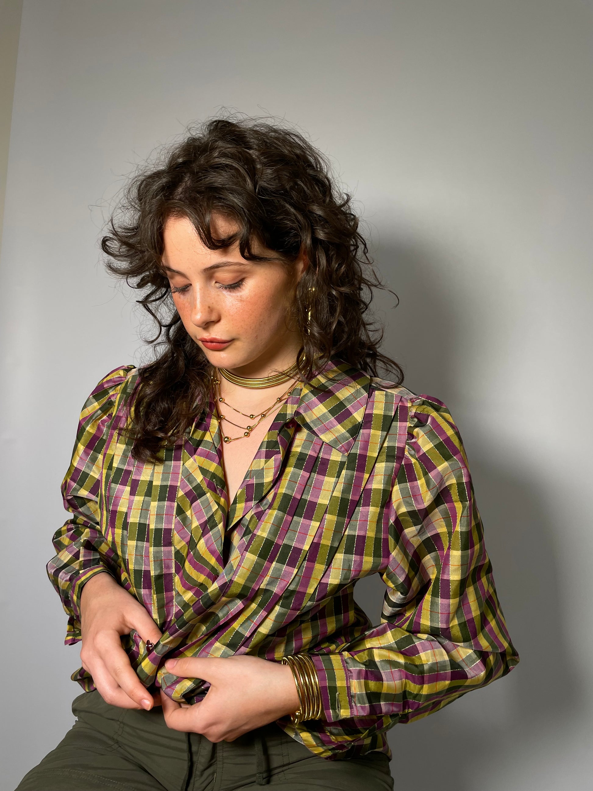 Blusa vintage tartan viola lilla e verde lime, con filo di lurex e balze frontali.