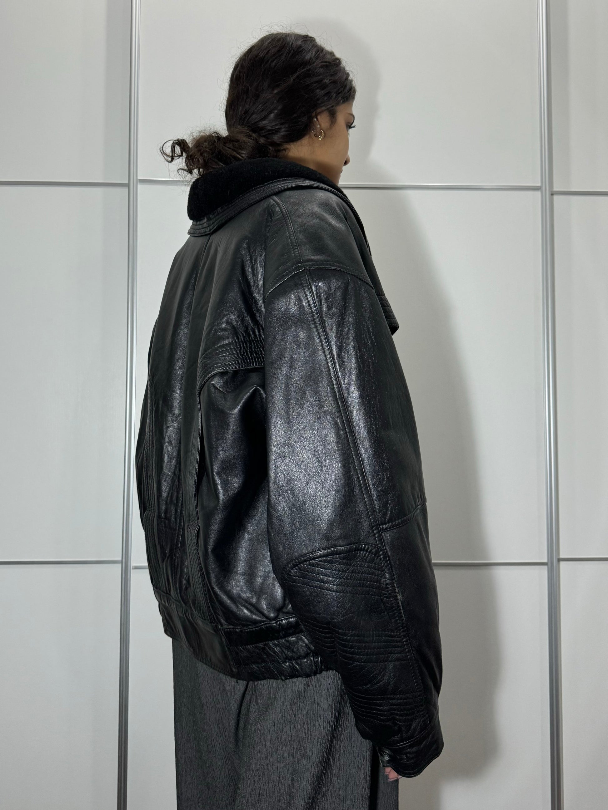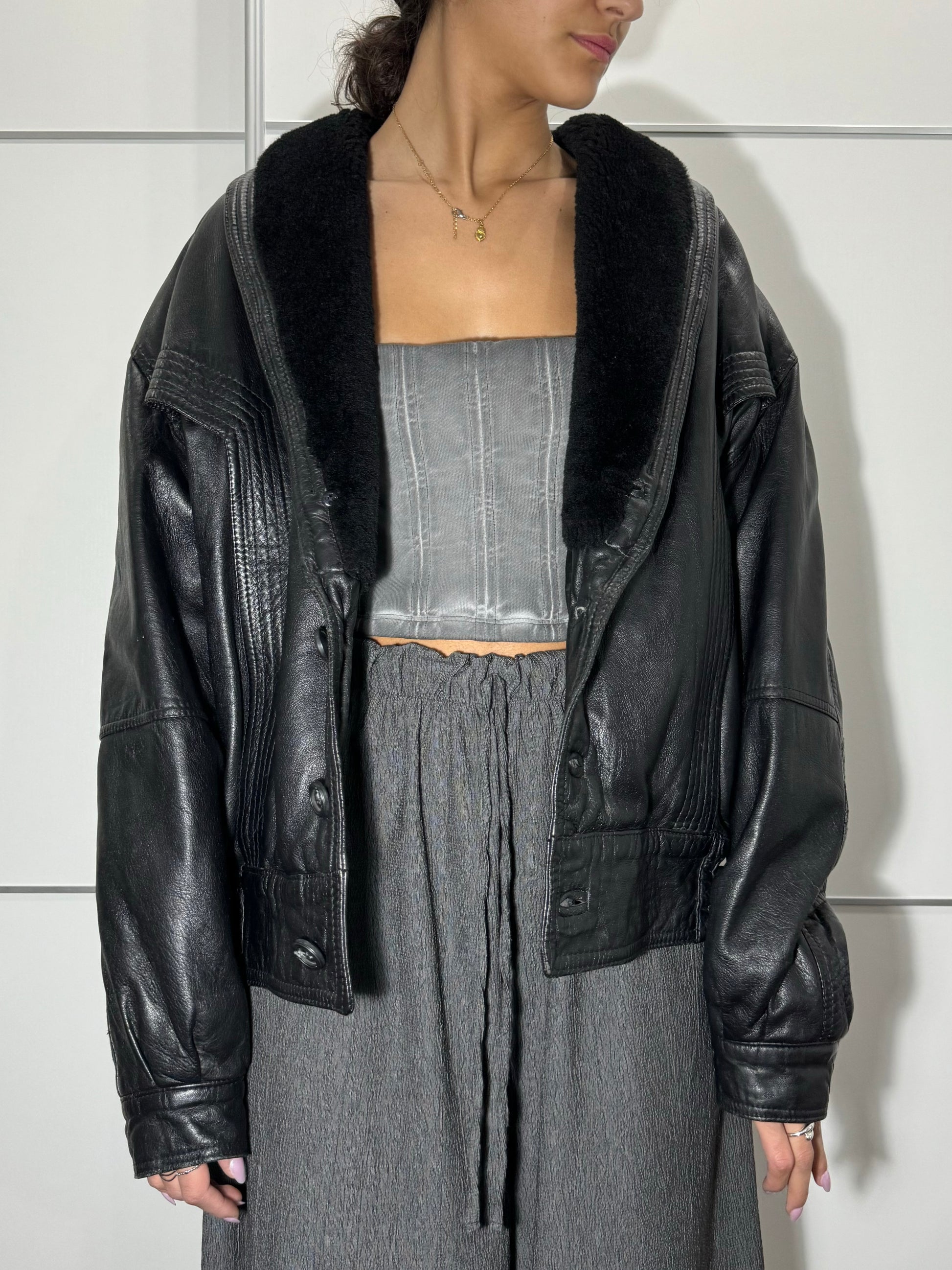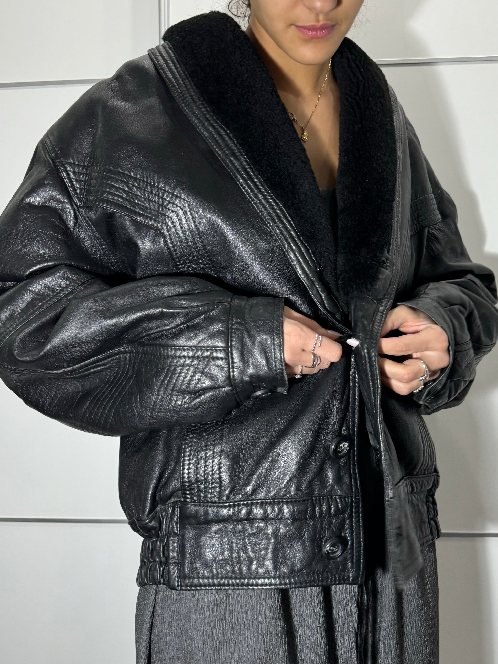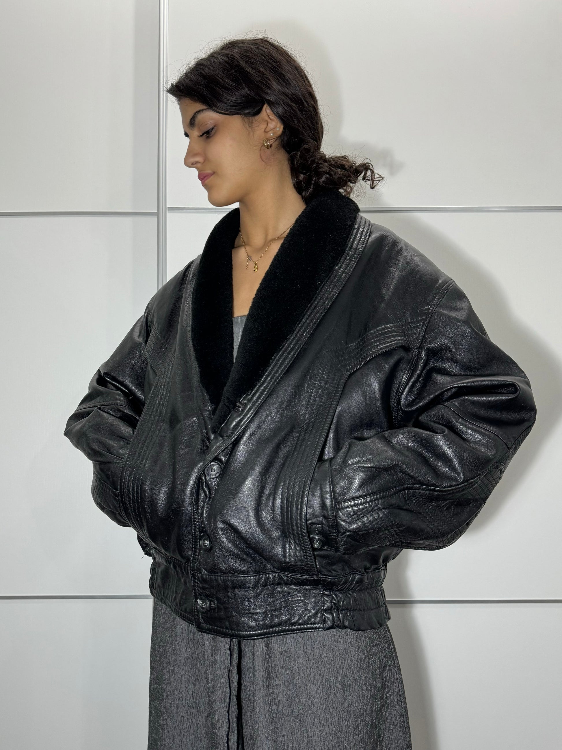 Bomber in vera pelle lucida nera, foderato e imbottito.