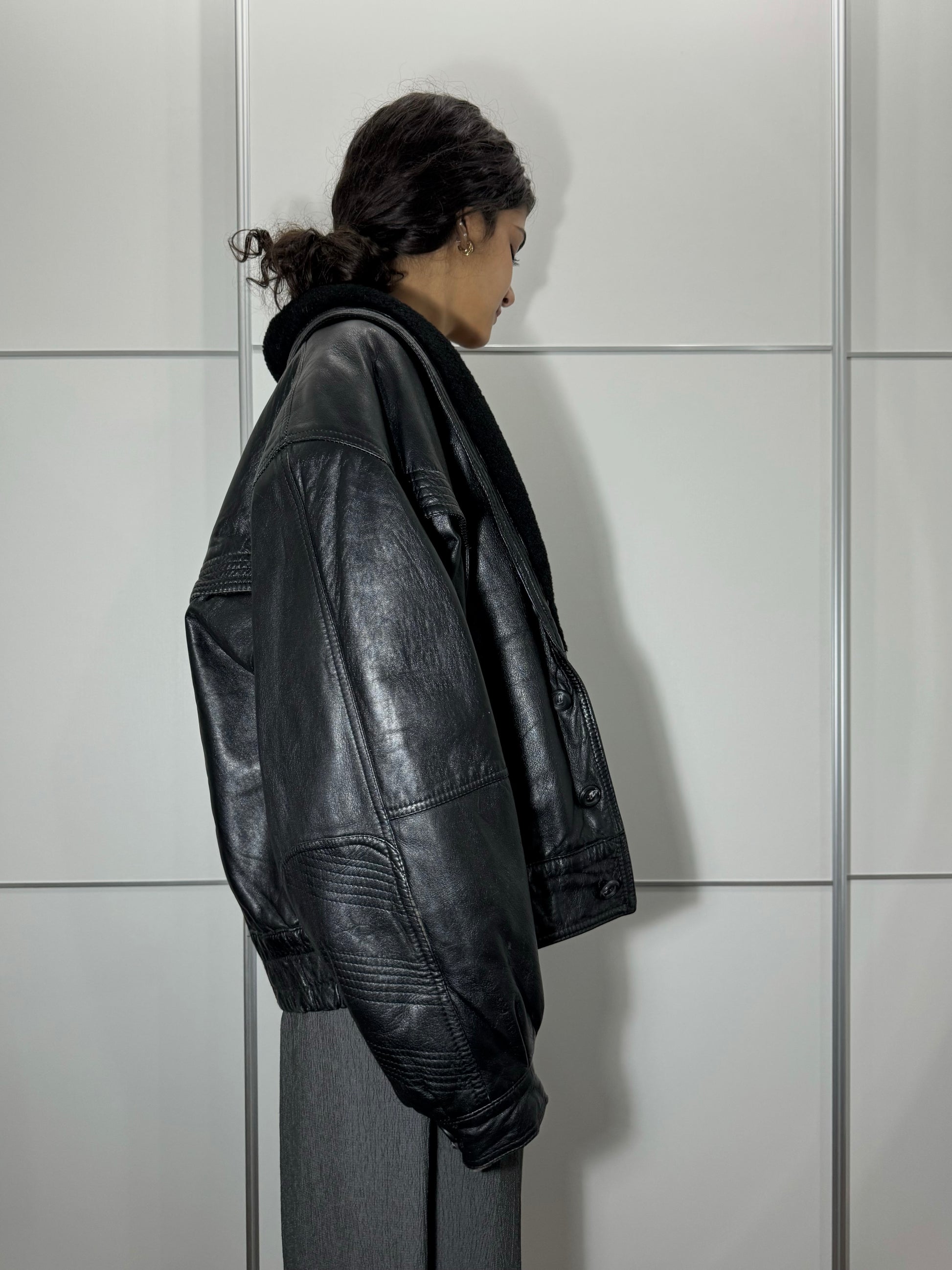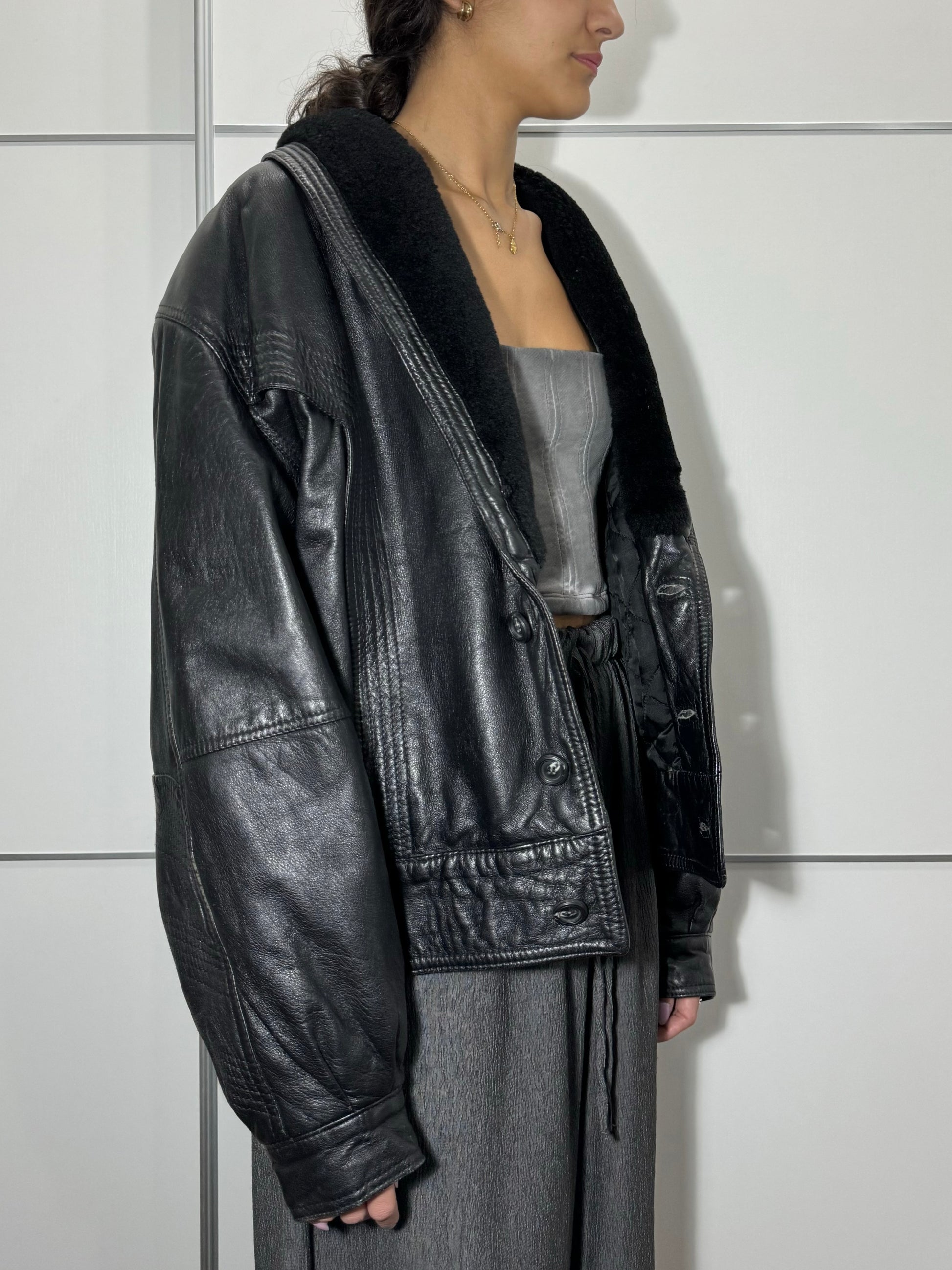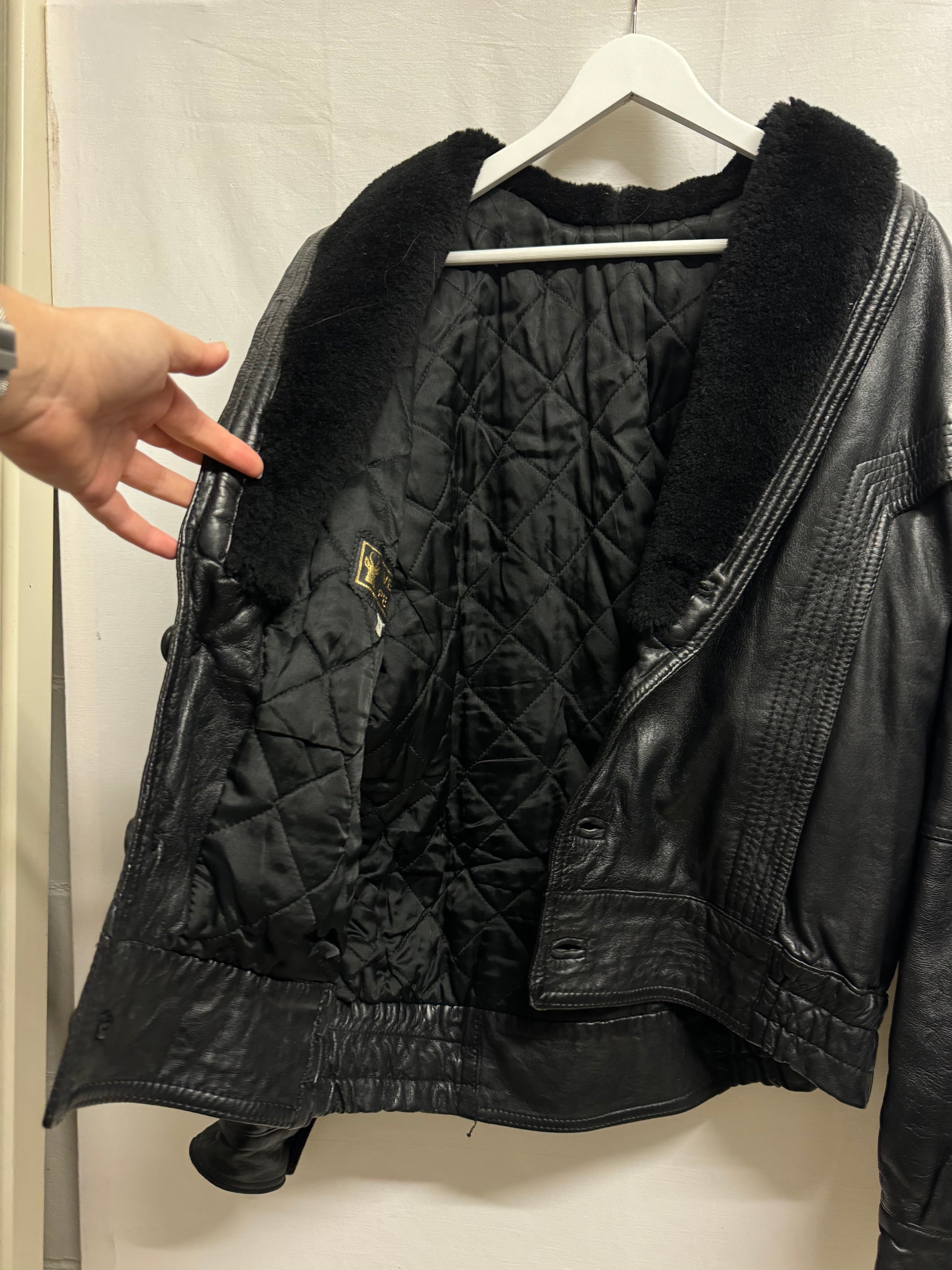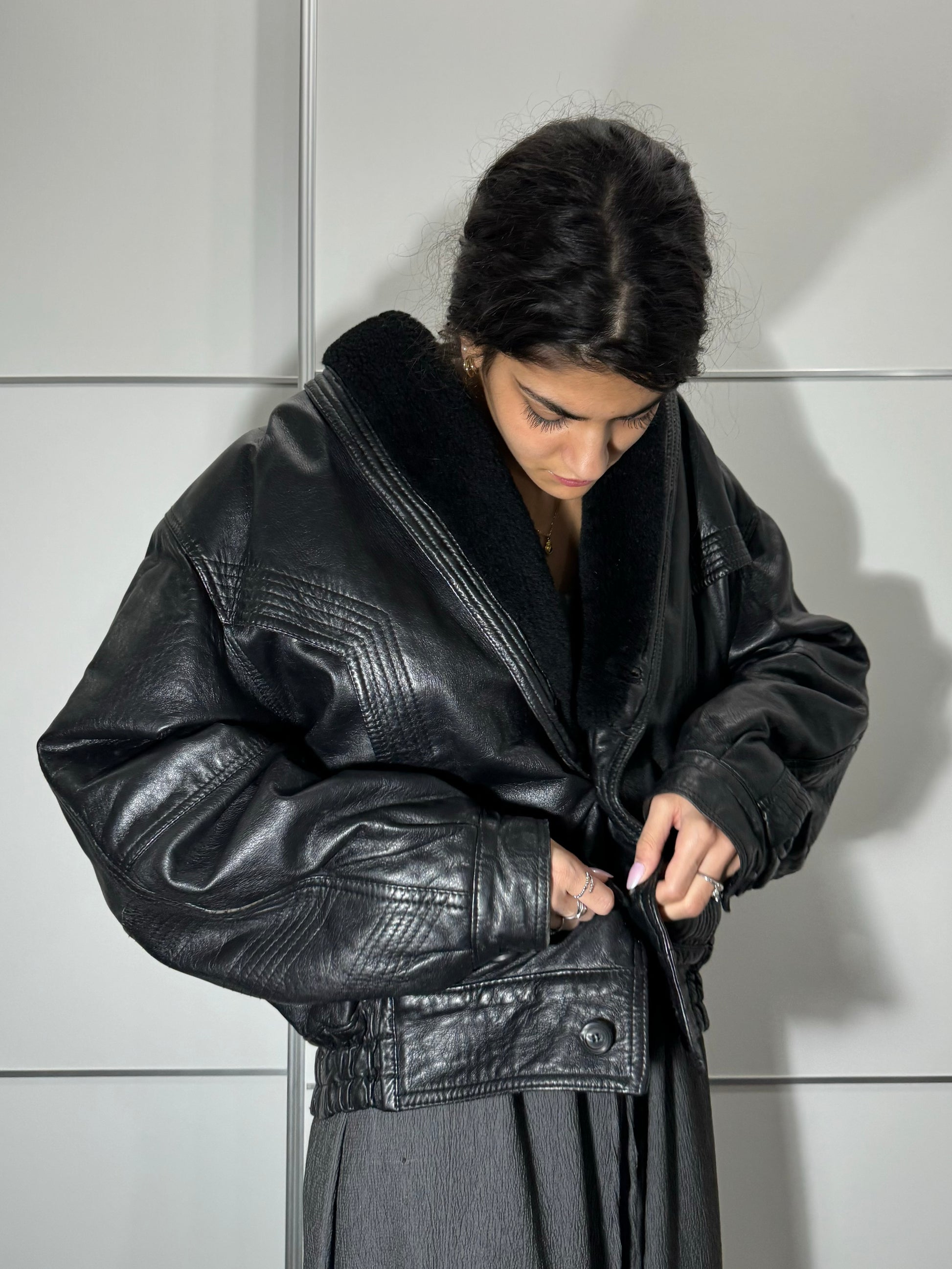 Bomber in vera pelle lucida nera, foderato e imbottito.