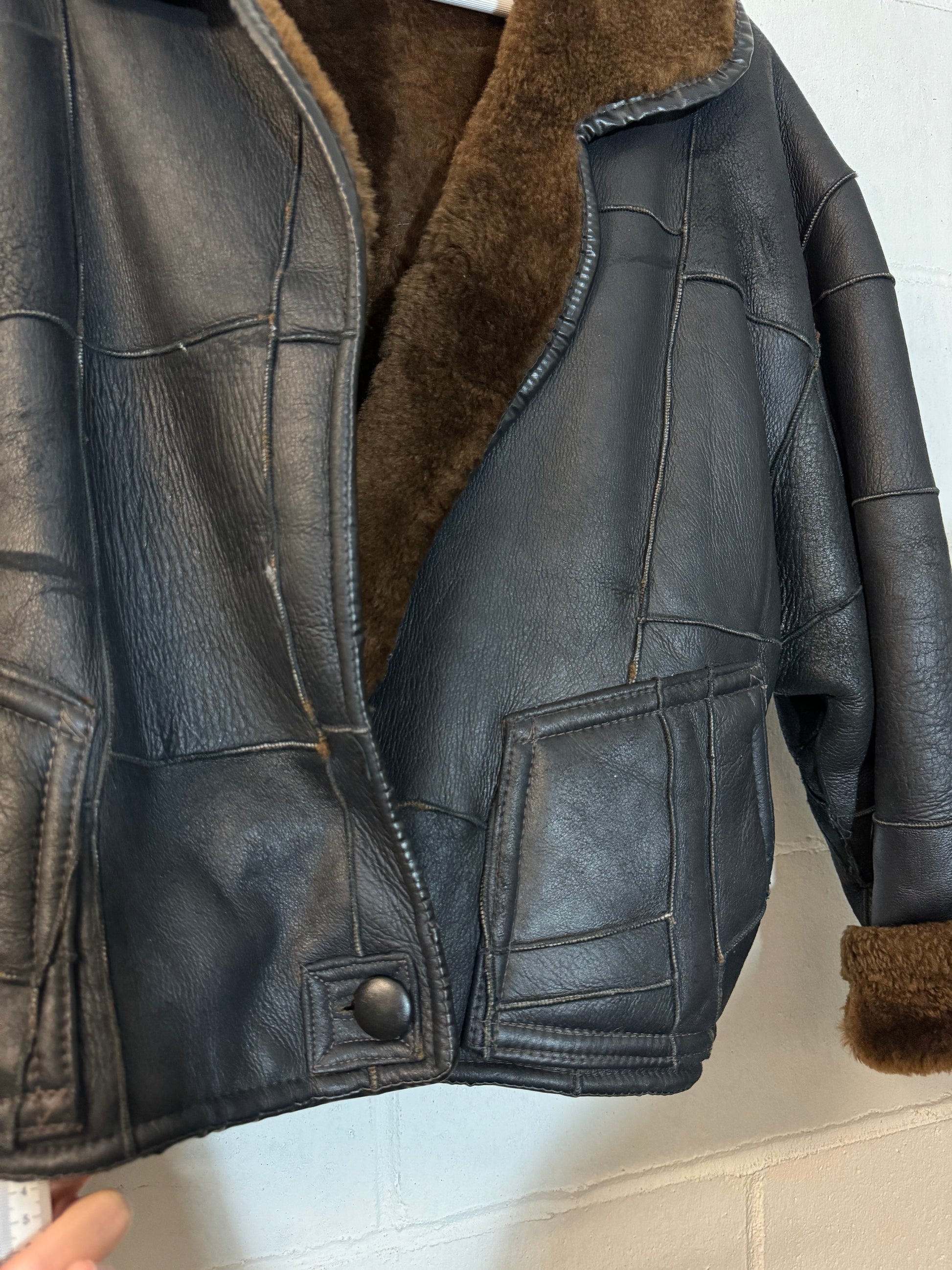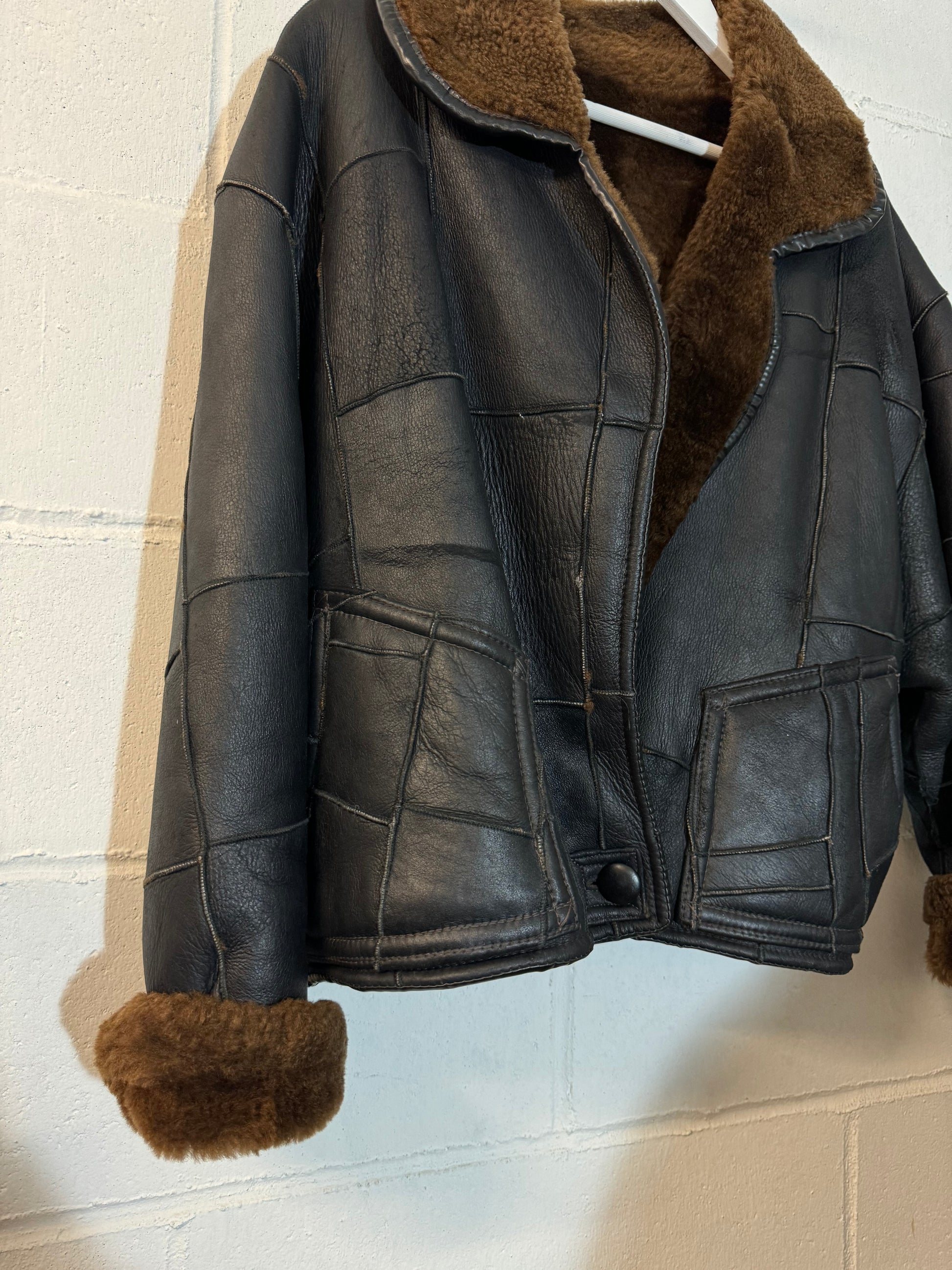 Bomber Shearling cropped. Esterno in nappa nera patchwork, interno a pelo raso cioccolato. Taglia S donna