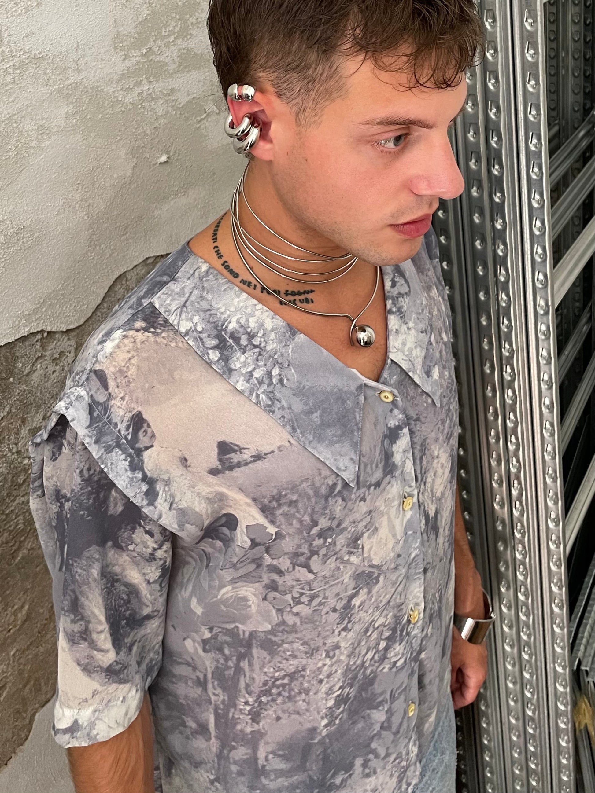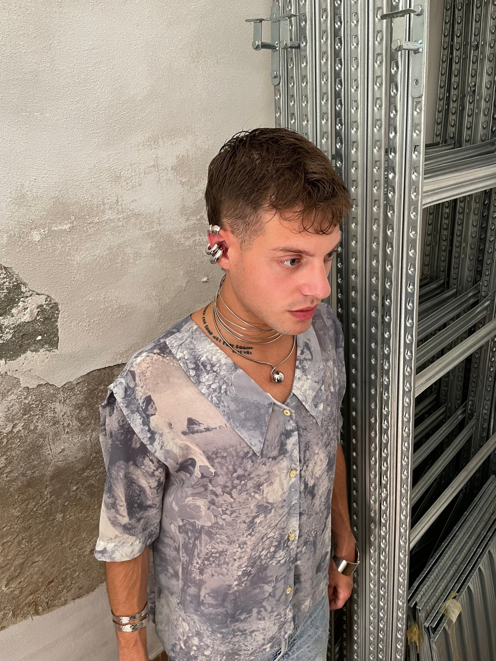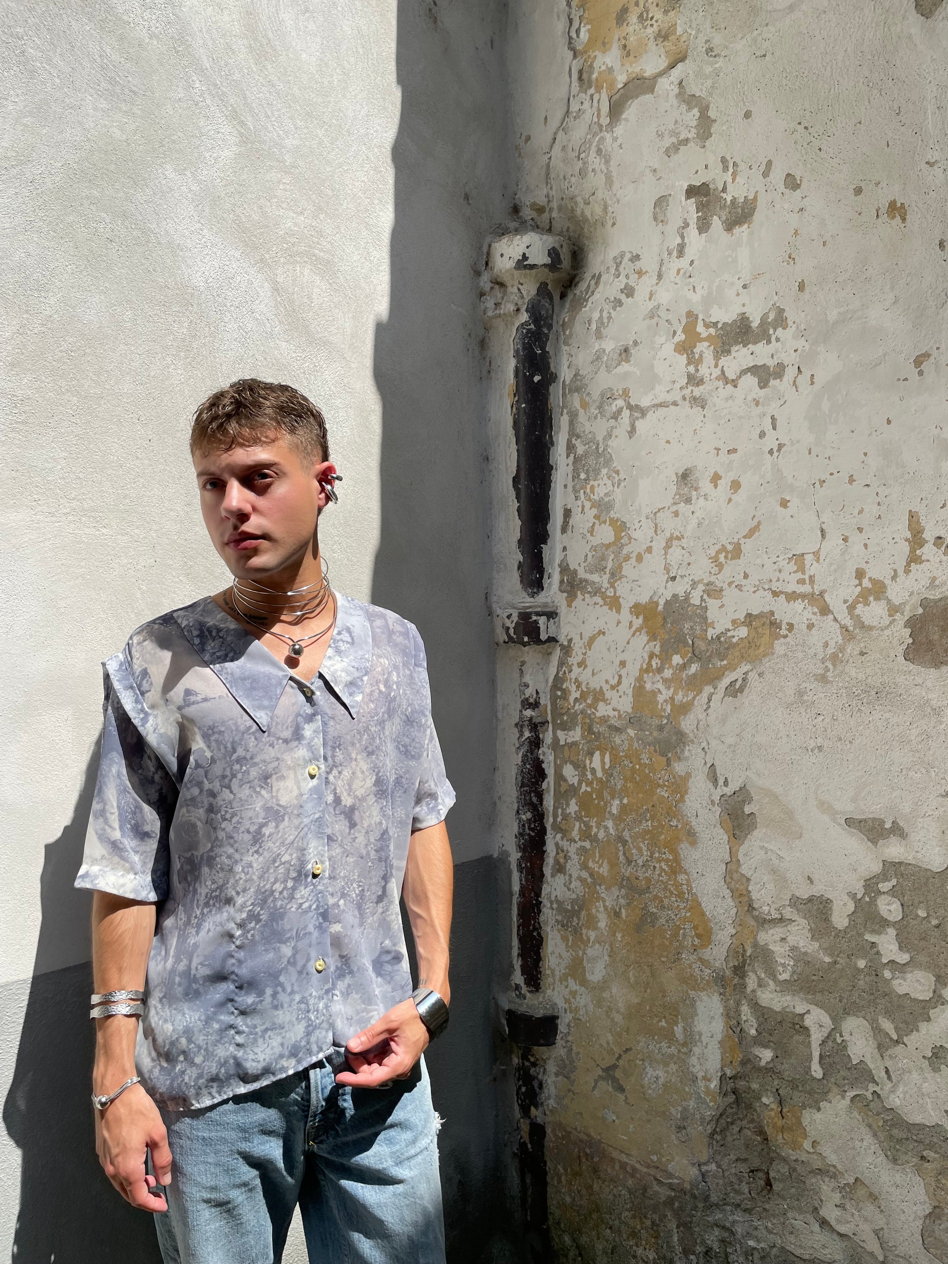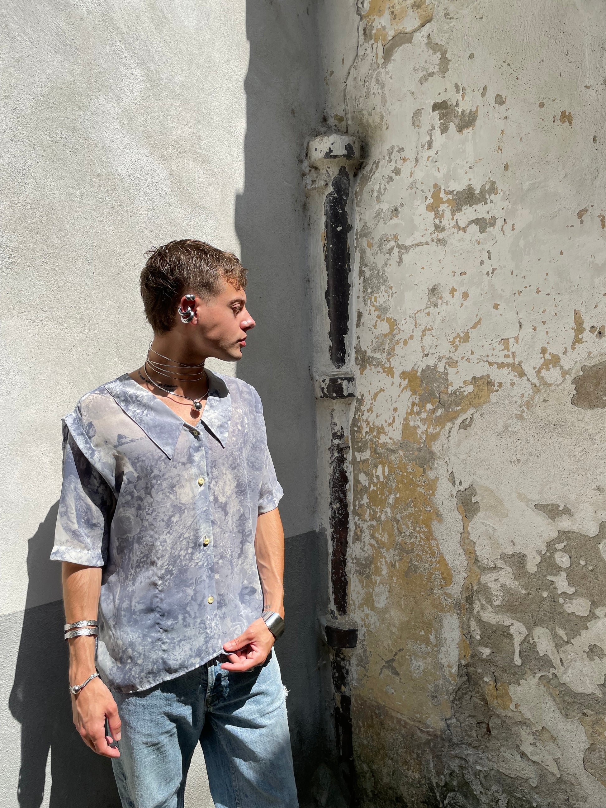 Colletto con scollo profondo, pattern con dipinto indaco e bianco, spalla con bordino rinforzato per dare struttura.