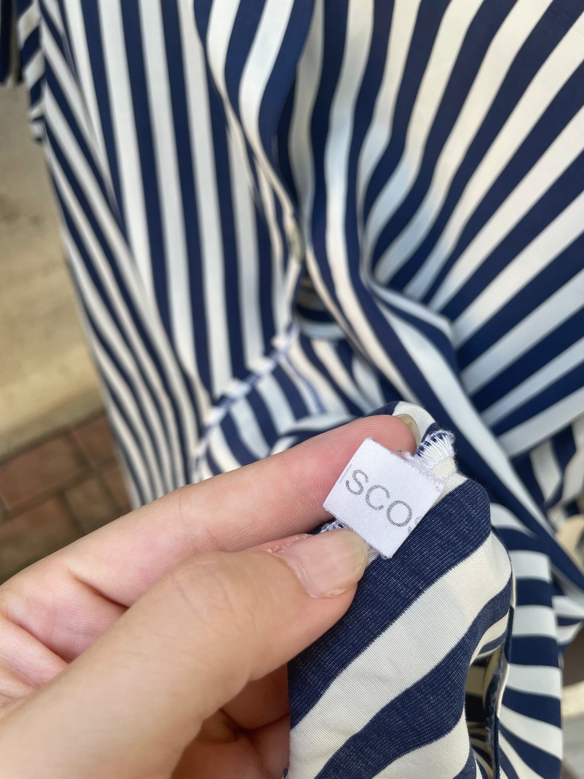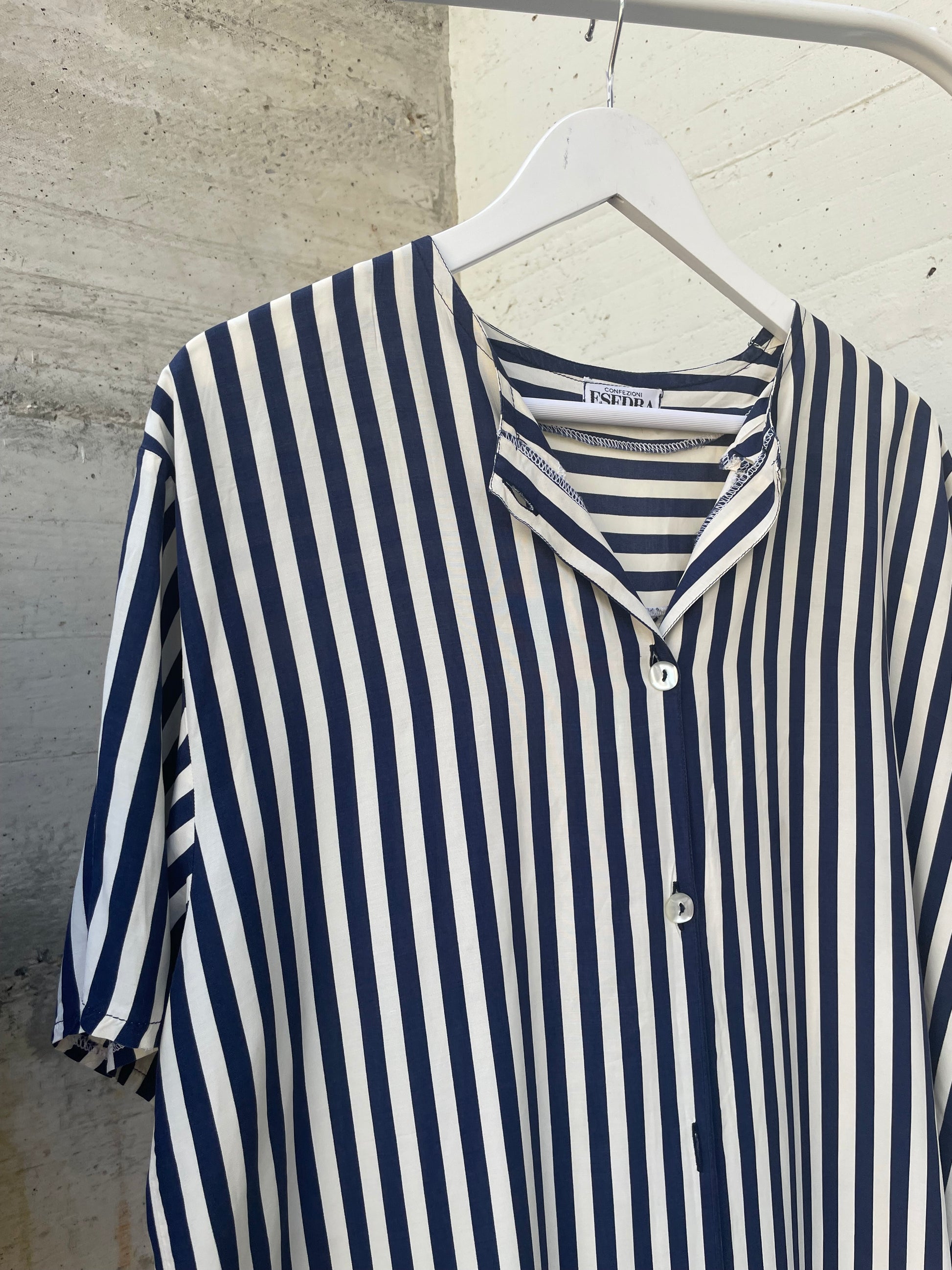 Produzione sartoriale Made in Italy, a righe verticali bianche e blu. Collo a barchetta, chiusura con bottoncini e spacchetti tondi laterali.