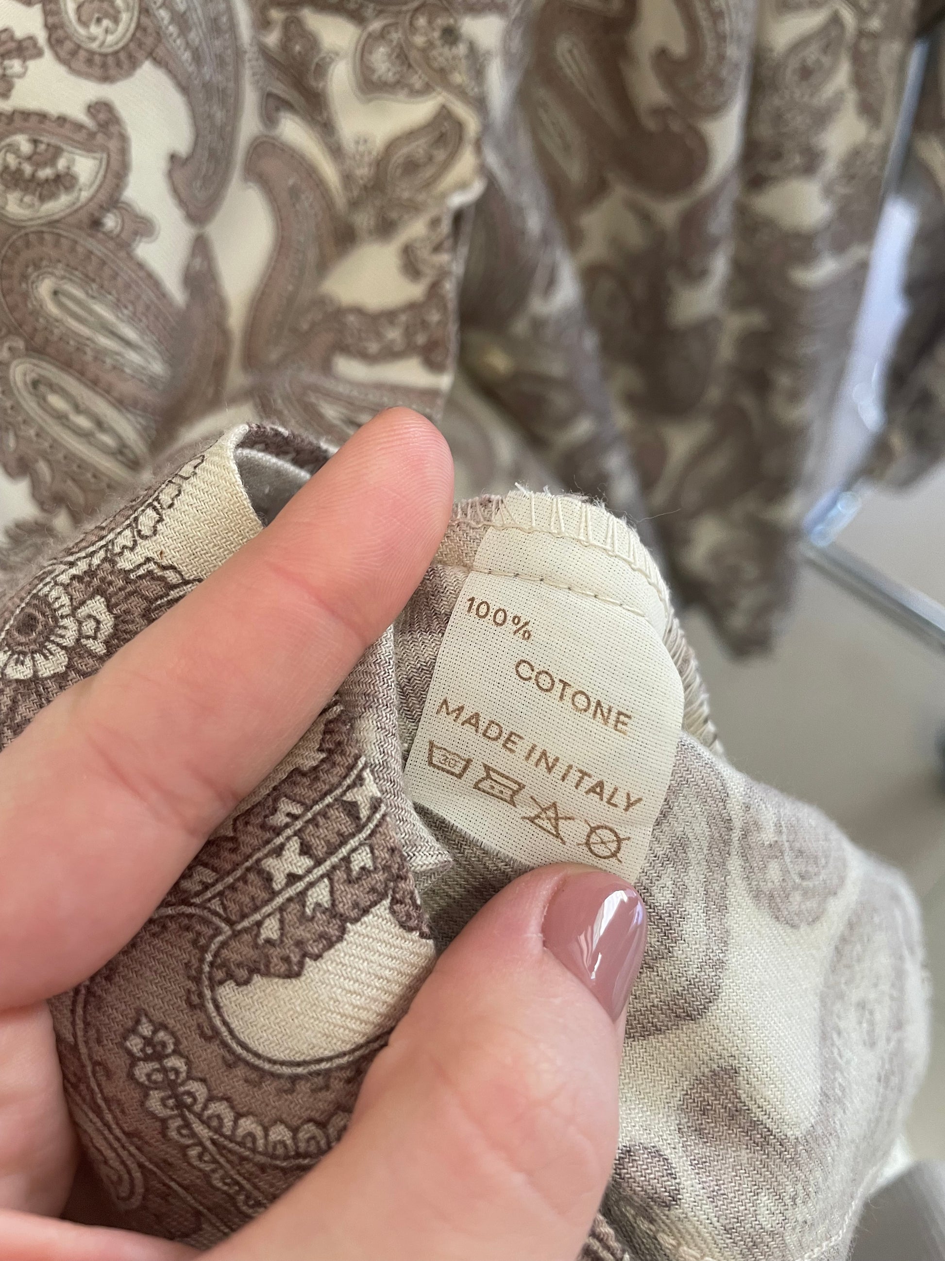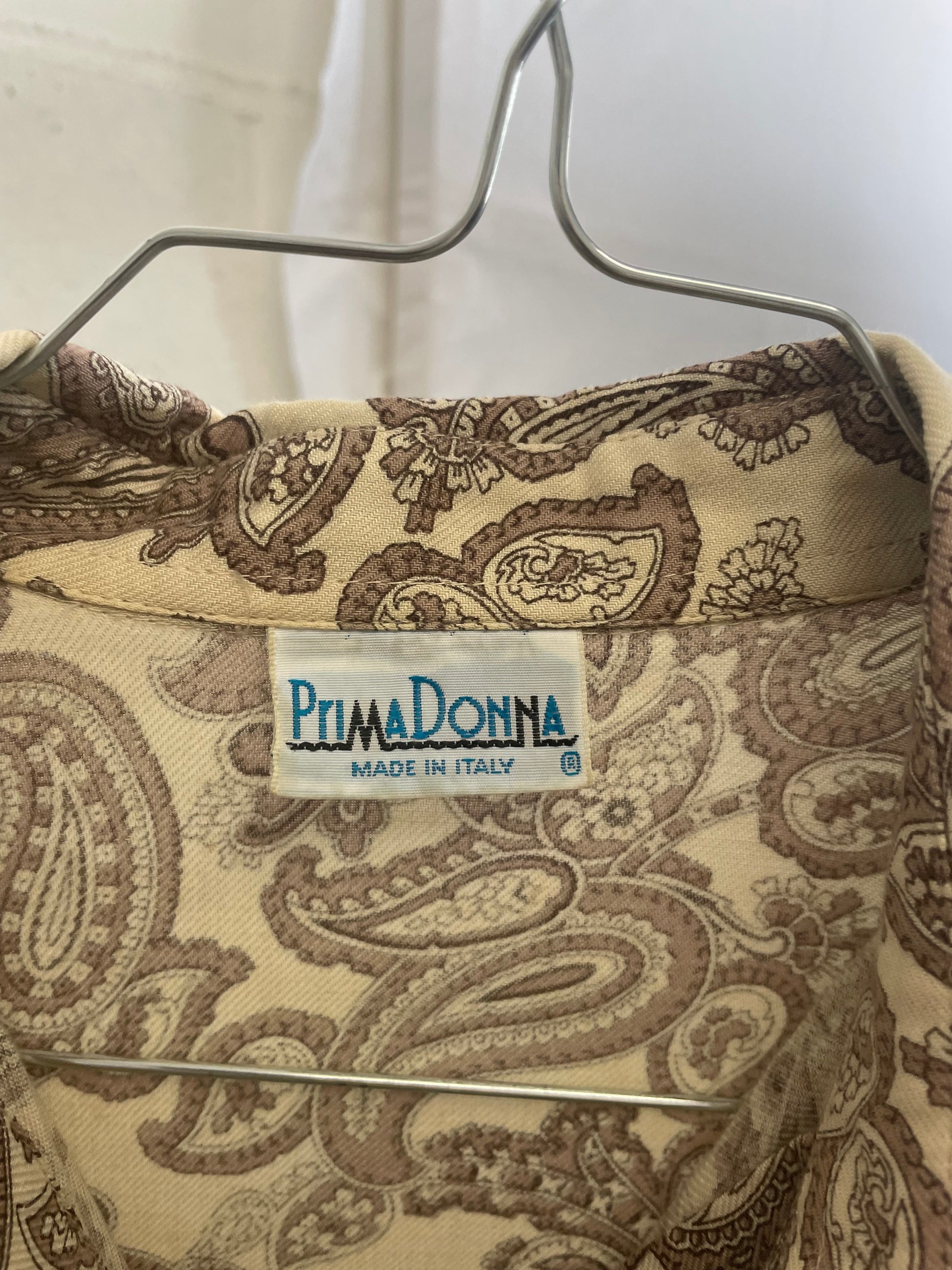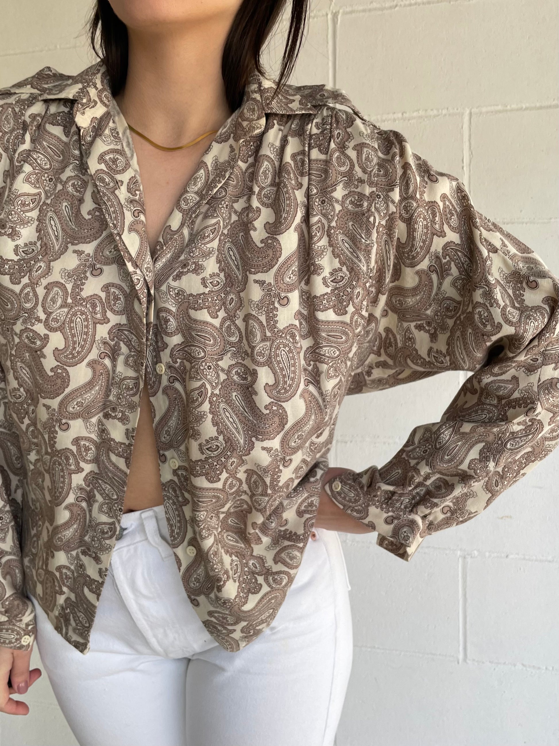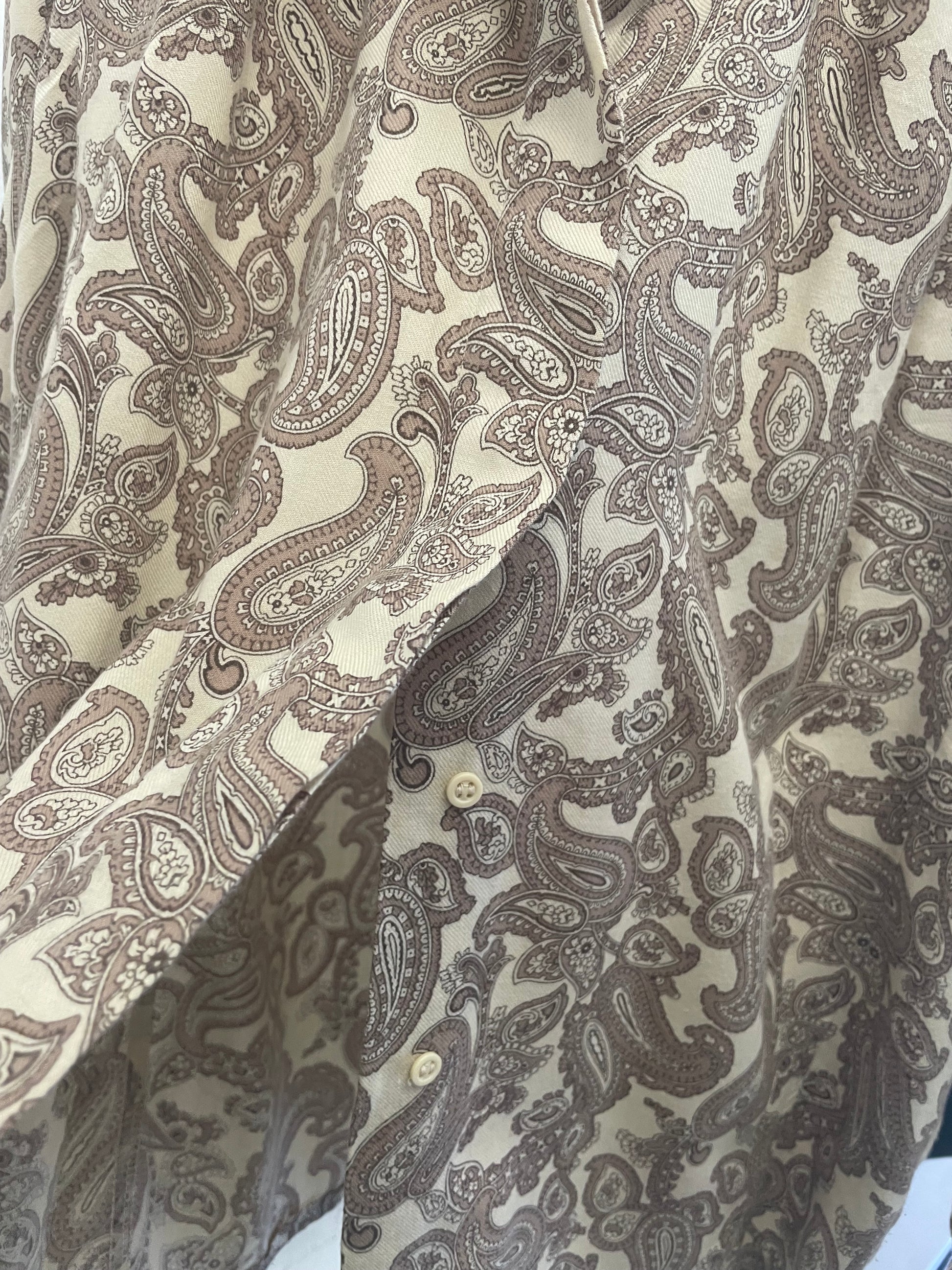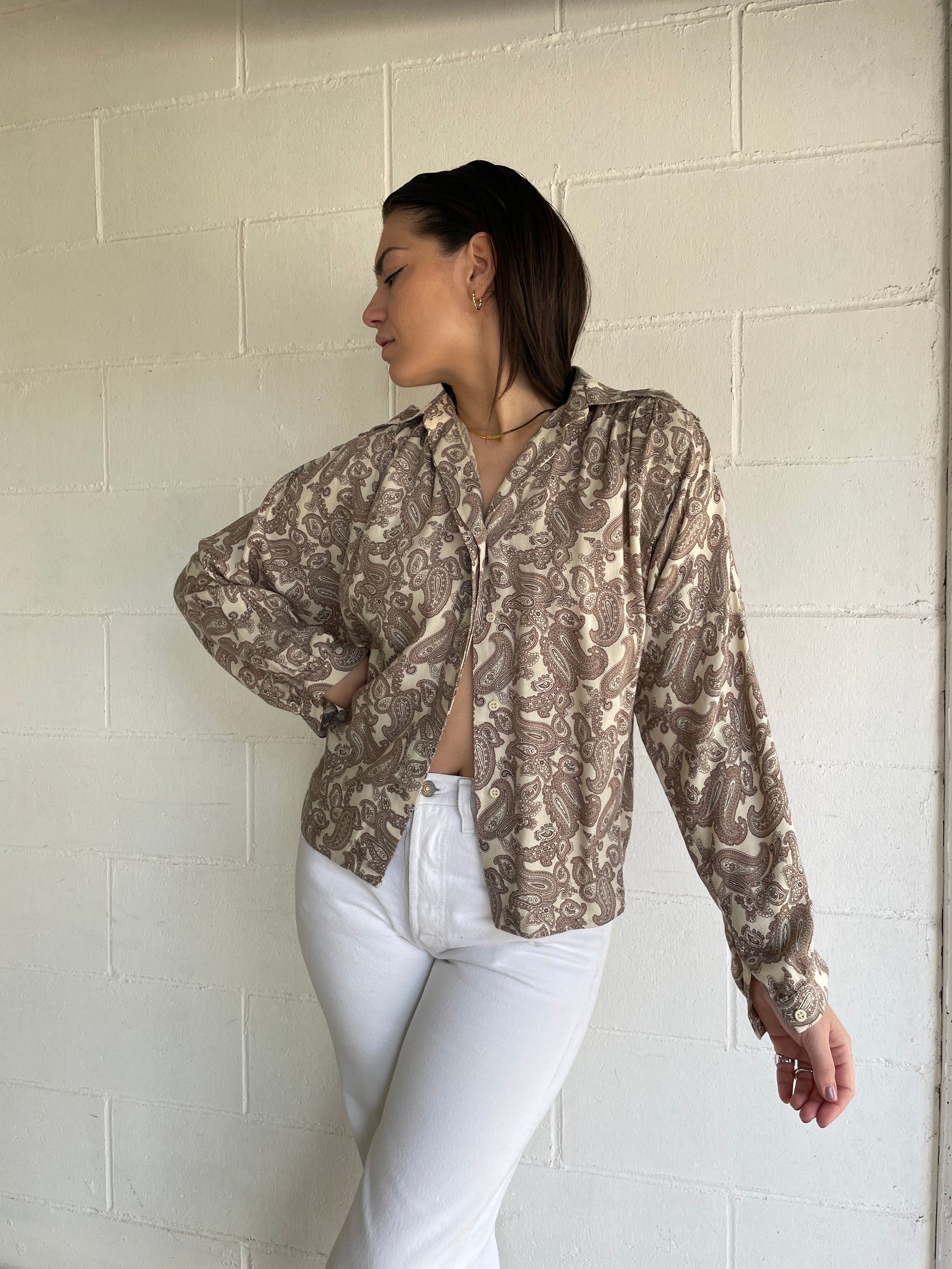 Camicia a manica lunga a sfondo panna con pattern paisley sui toni del marrone. Chiusura con bottoni a scomparsa e rinforzo con drappeggio sulla spalla.