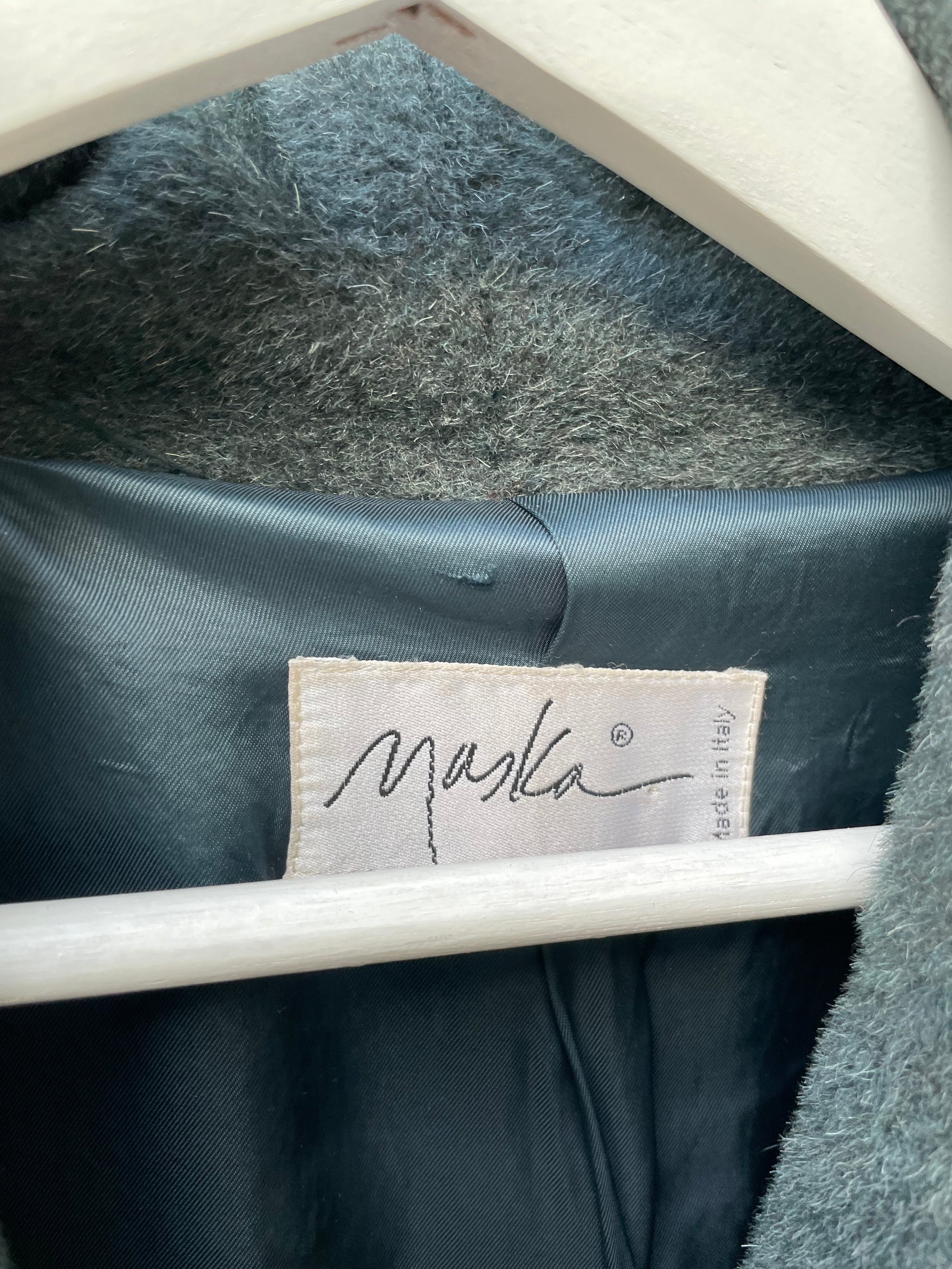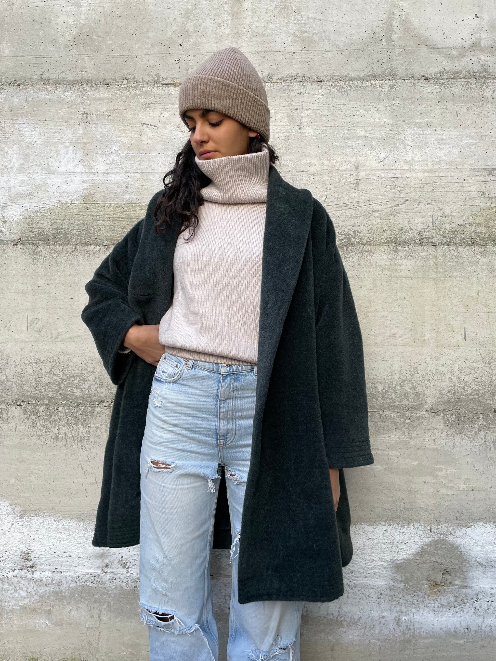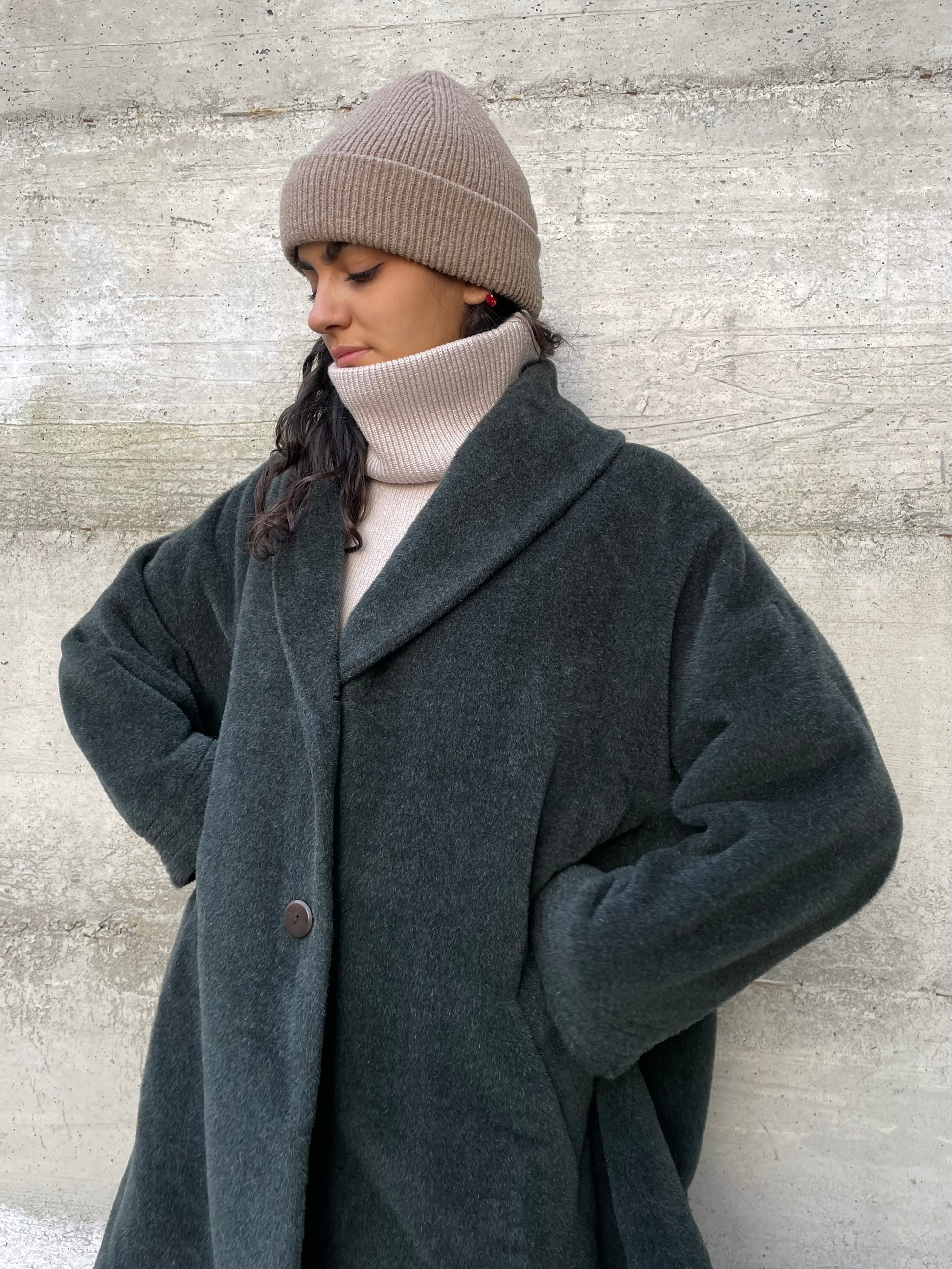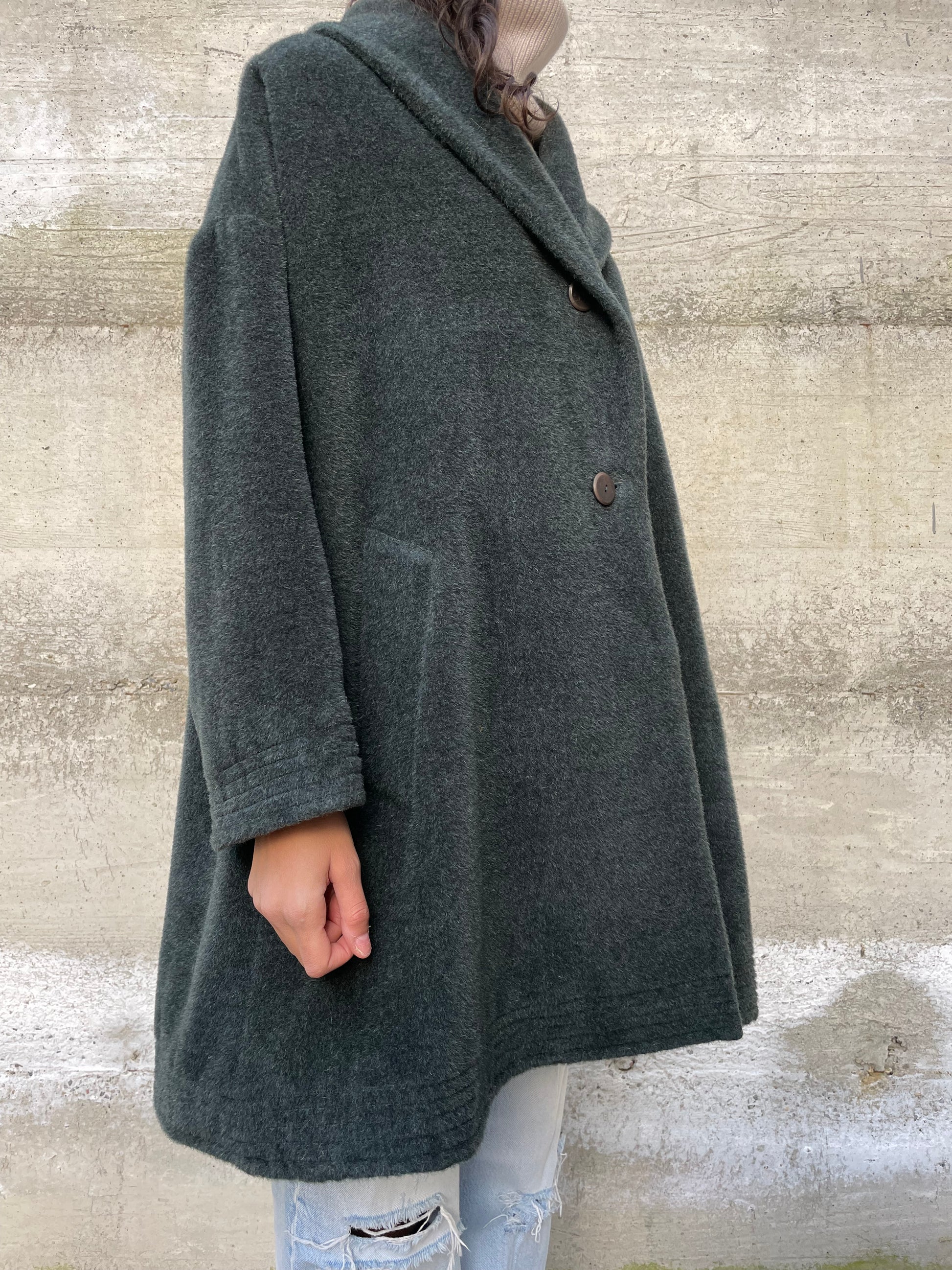 Cappottino a campana verde bosco 50% alpaca, 30% mohair, 20% lana.