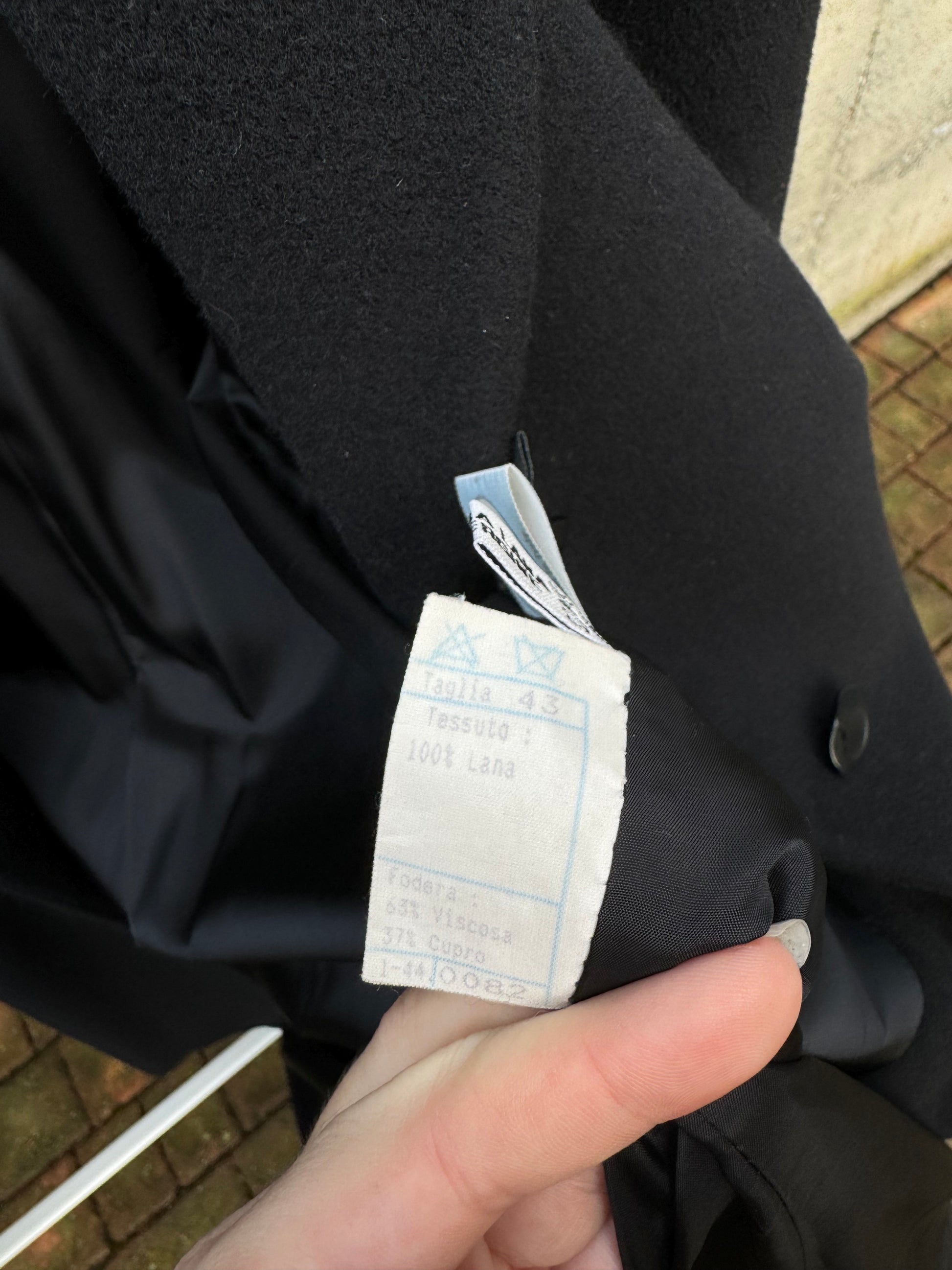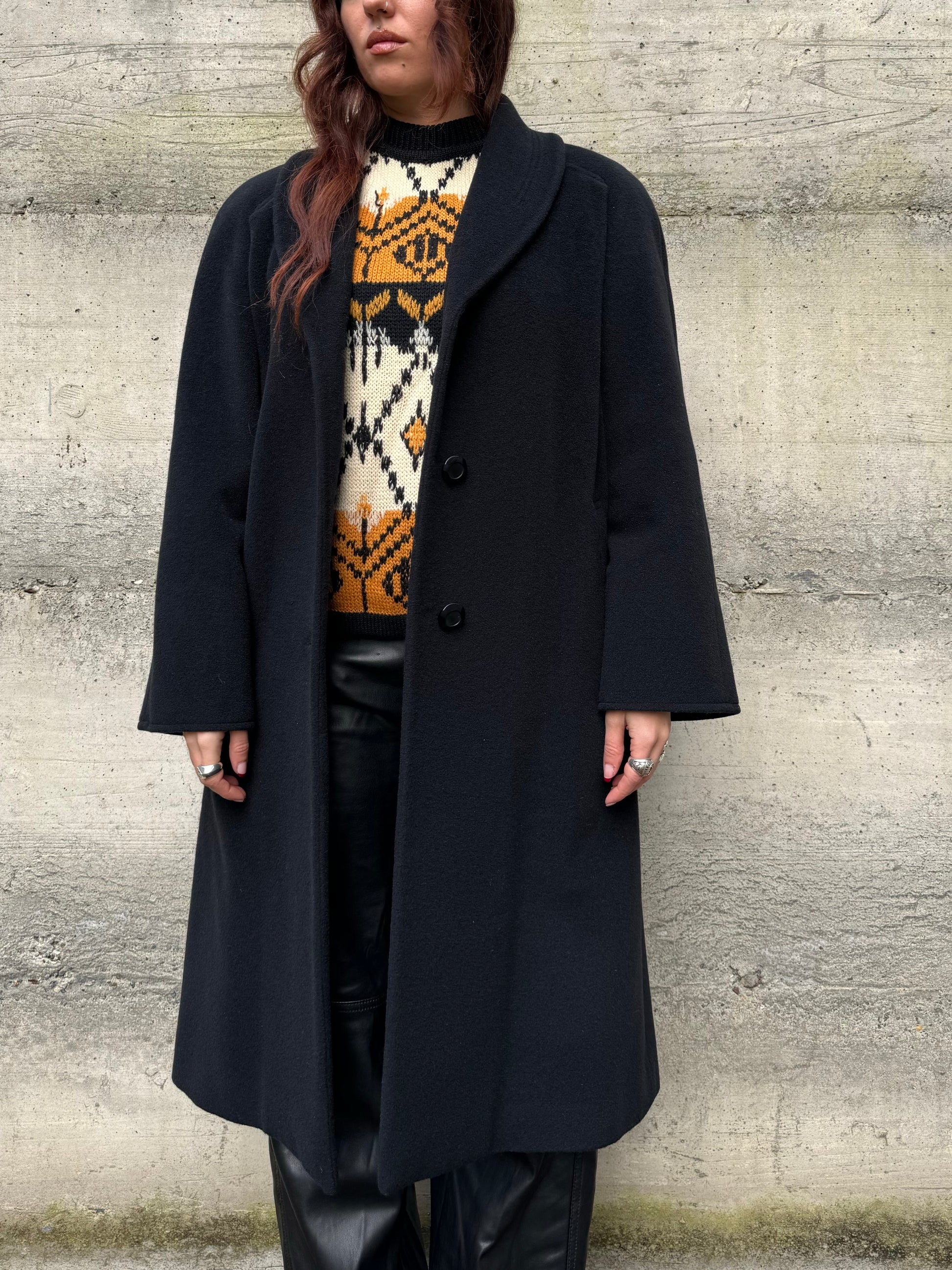 Cappotto monopetto sartoriale nero con spalla scesa e rever arrotondato.