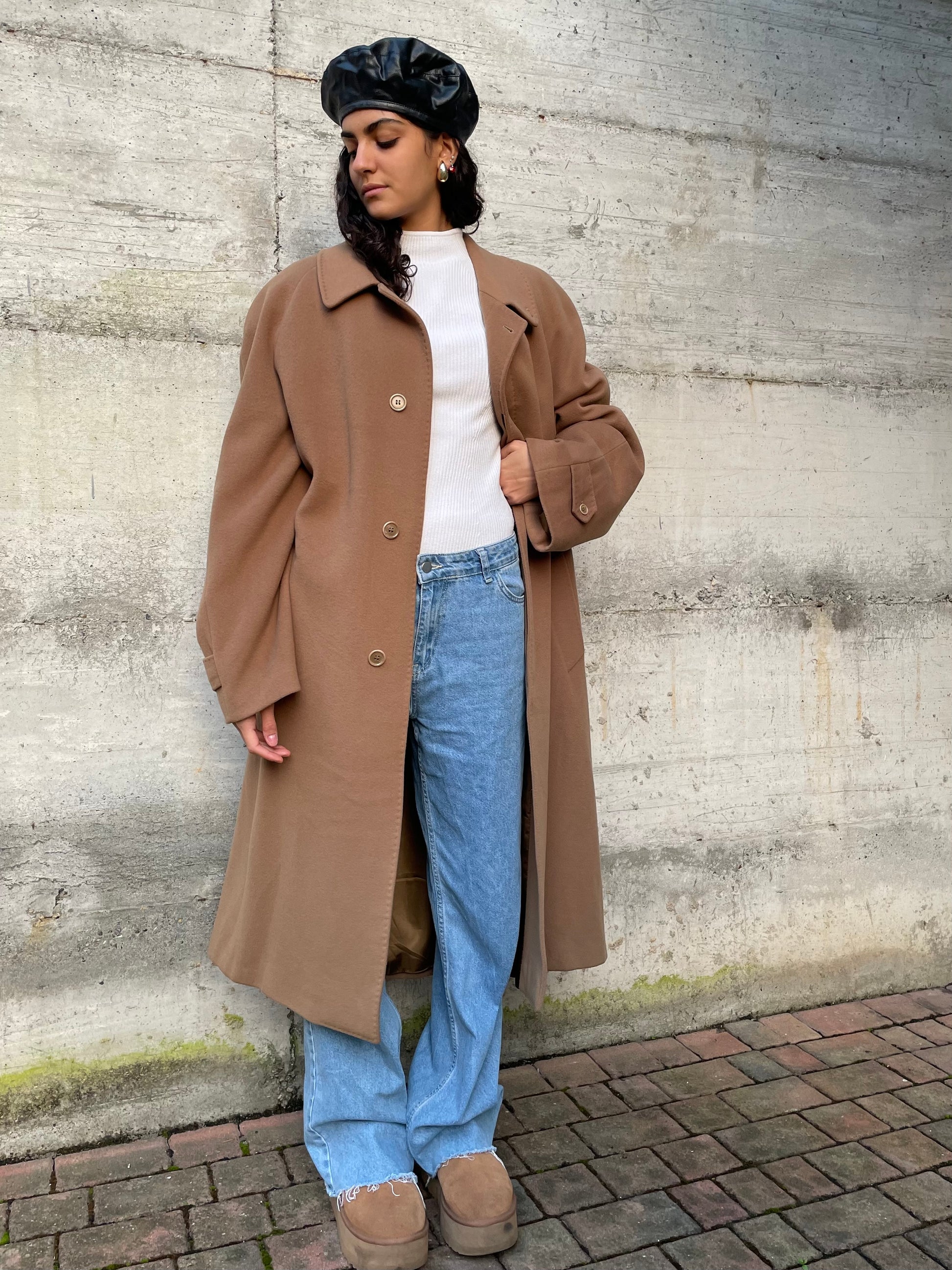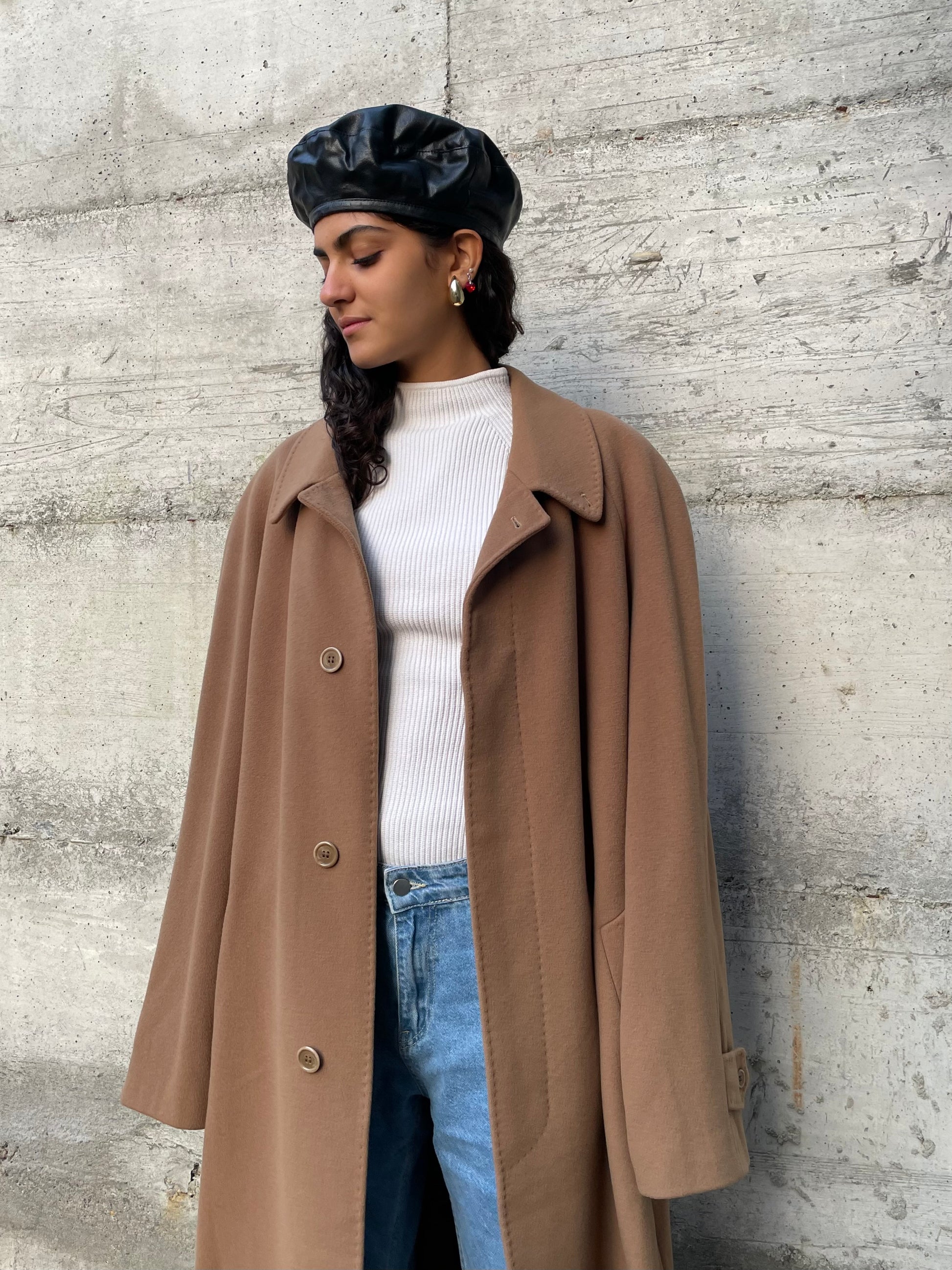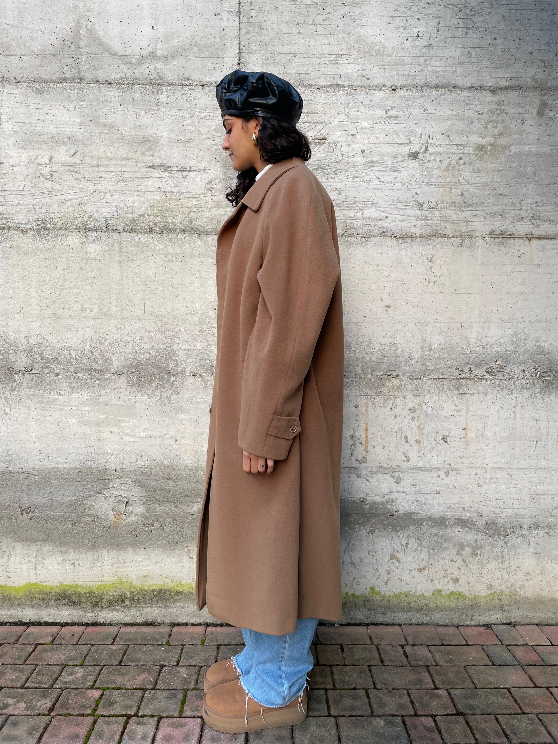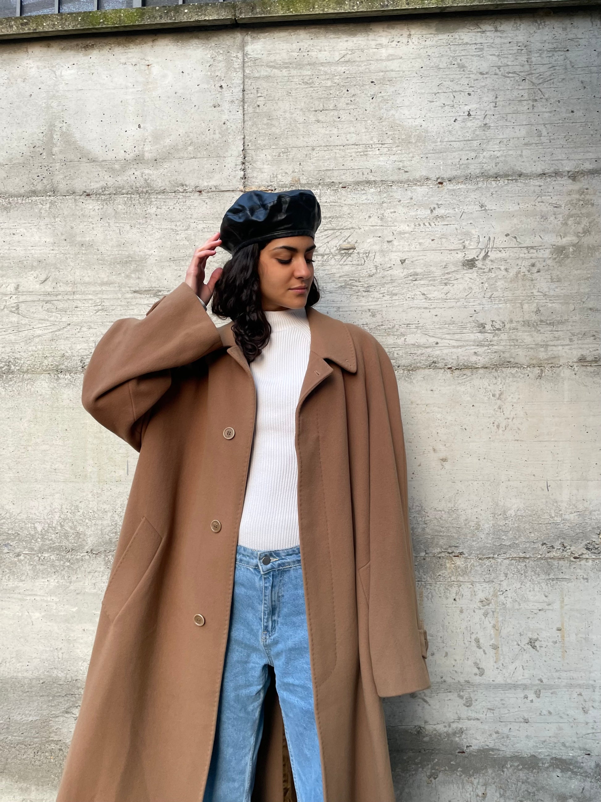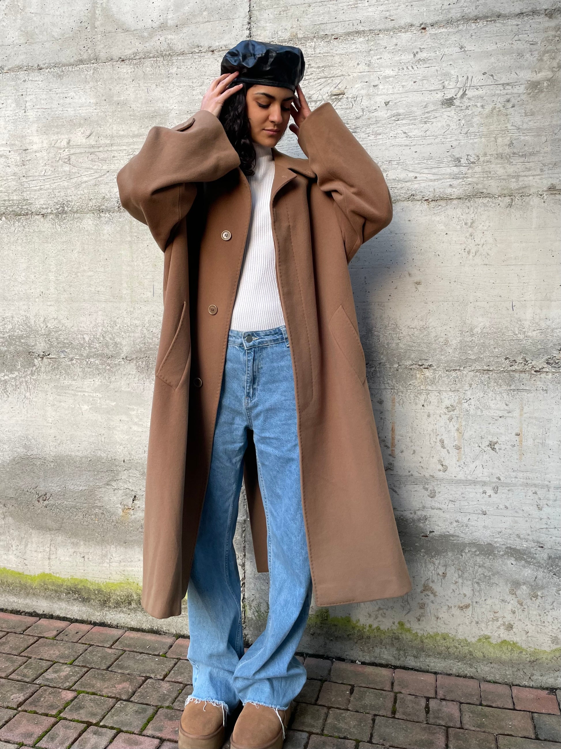 Splendido cappotto monopetto con spalla scesa color cammello.