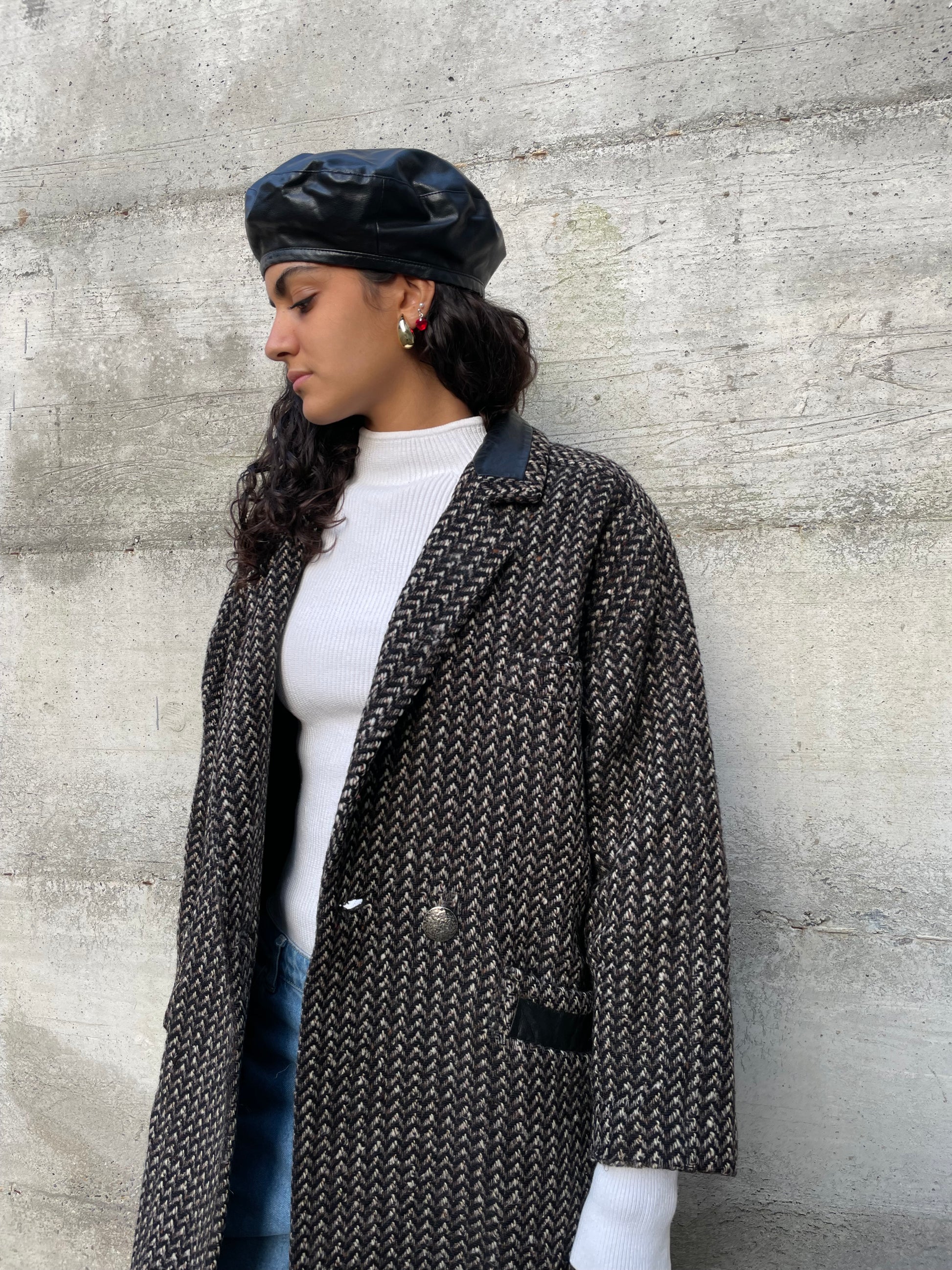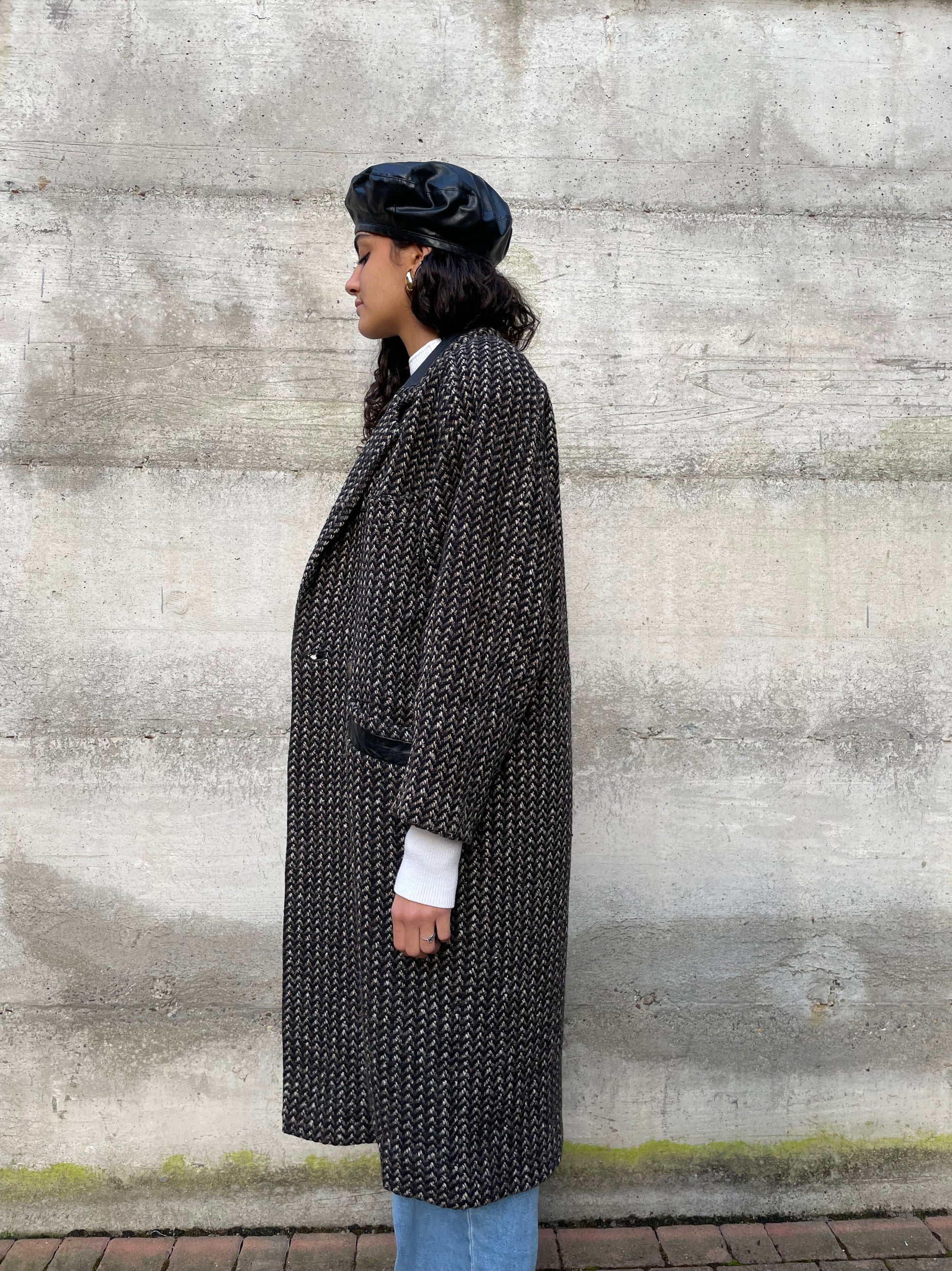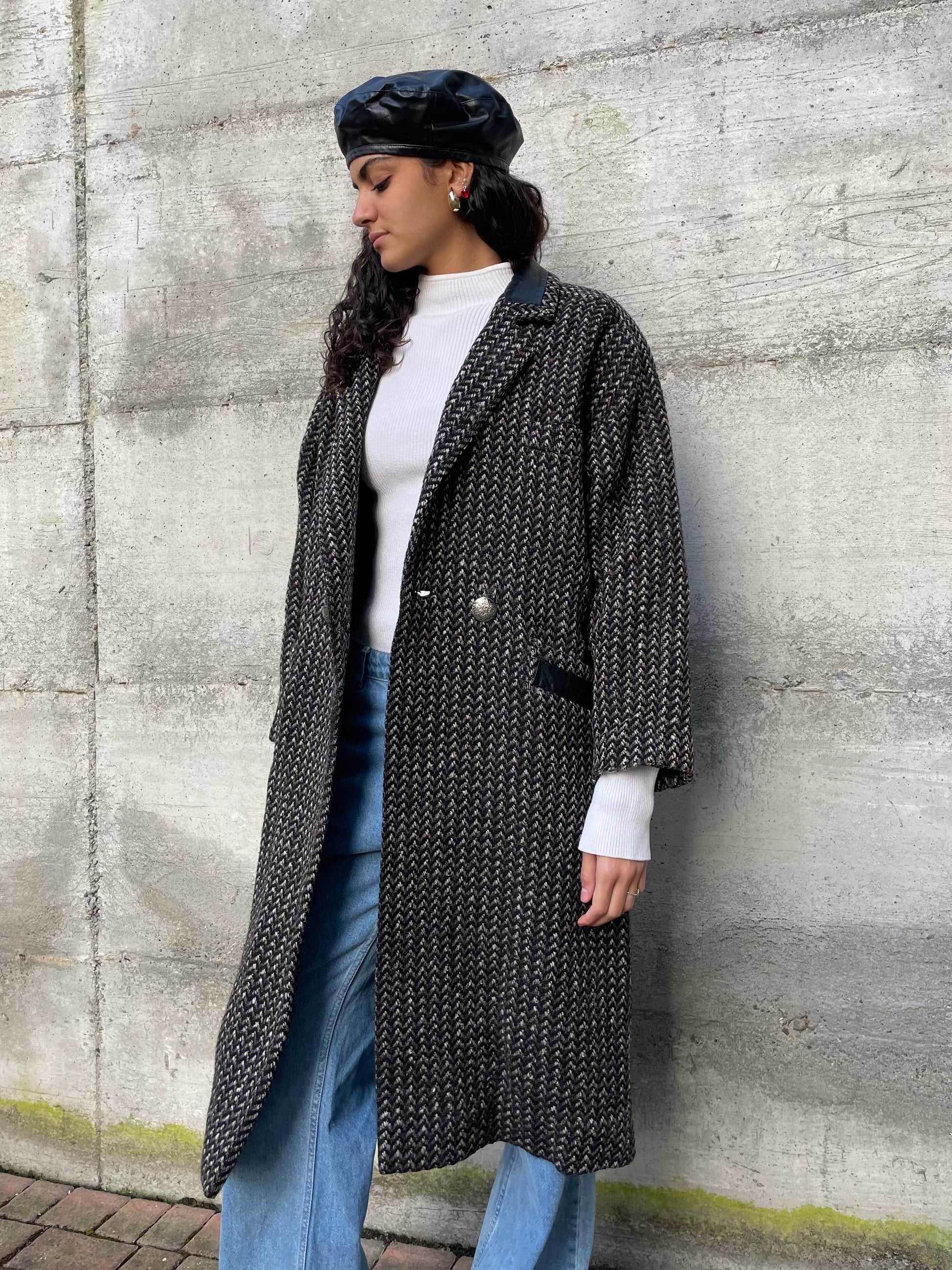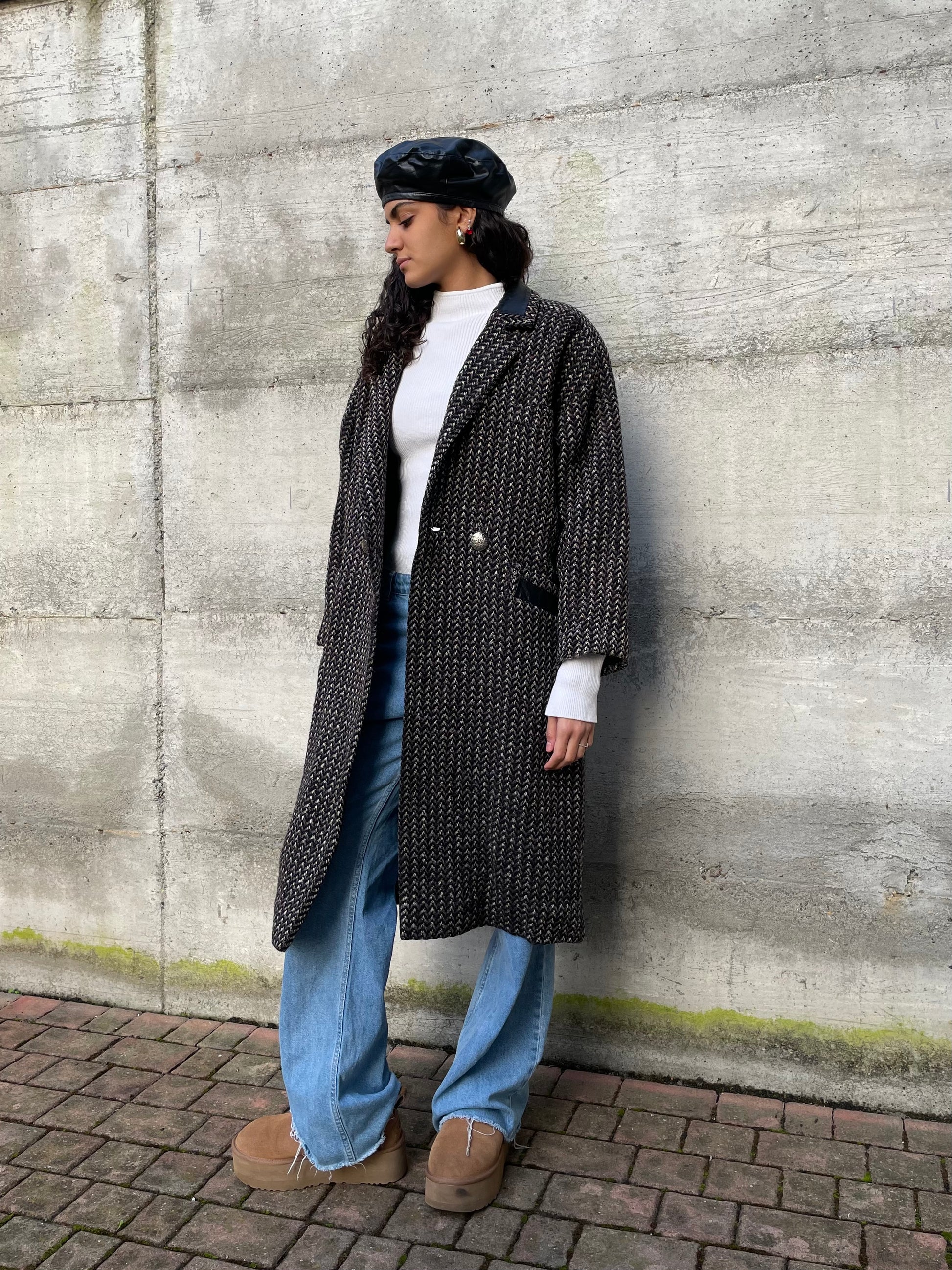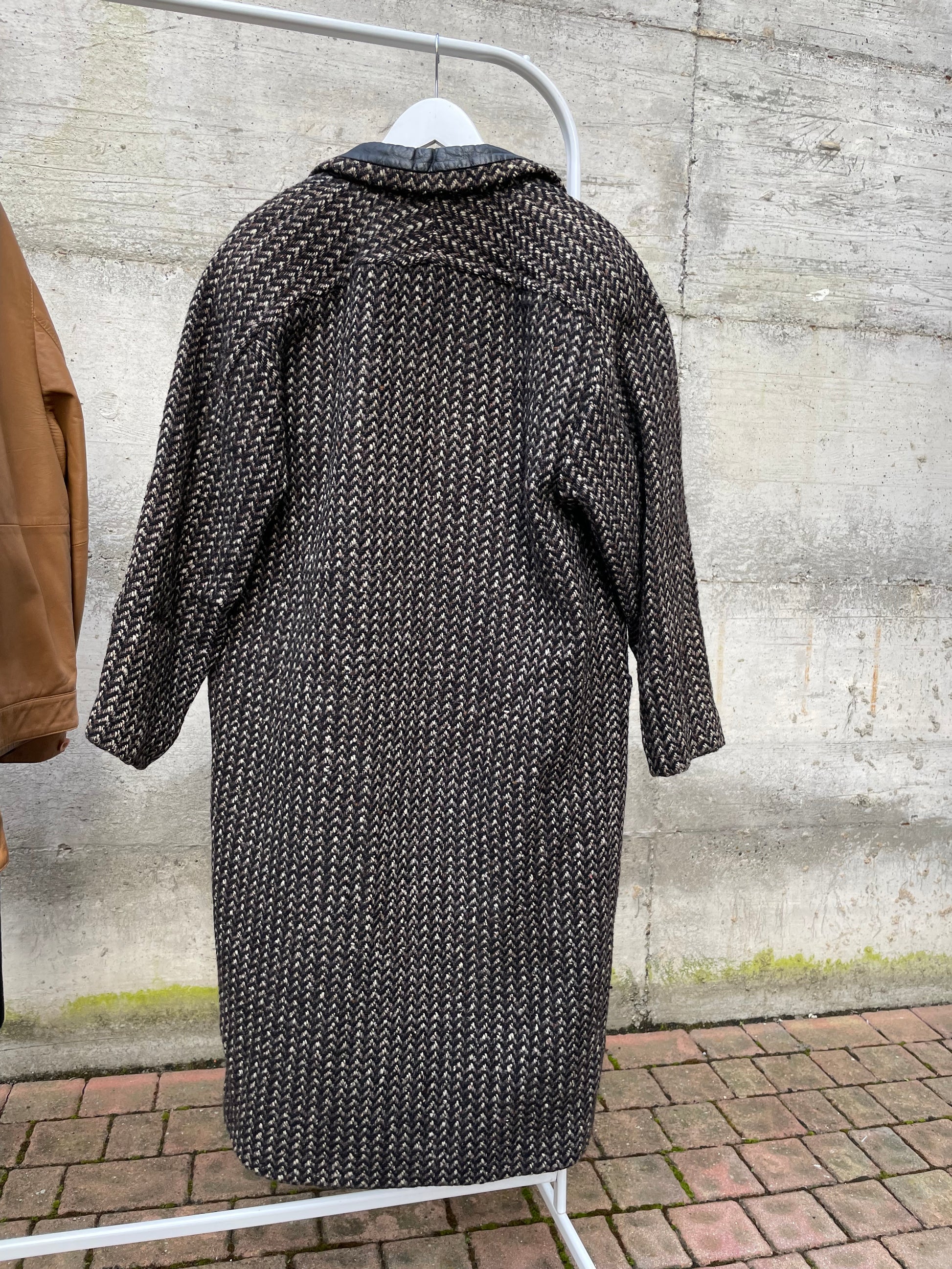 Splendido cappotto doppiopetto con spalla scesa in lana spigata, nero bianco e marrone.
