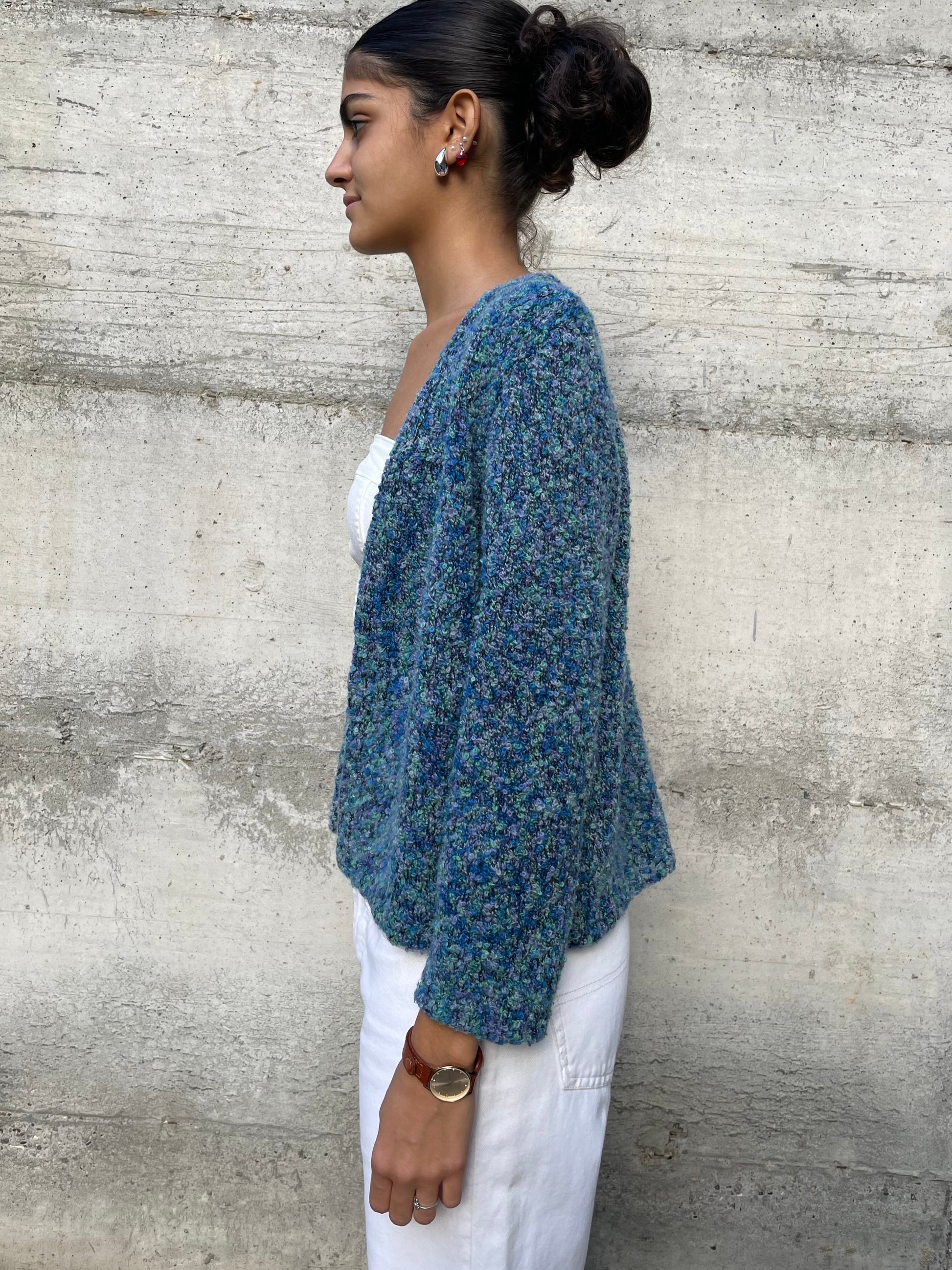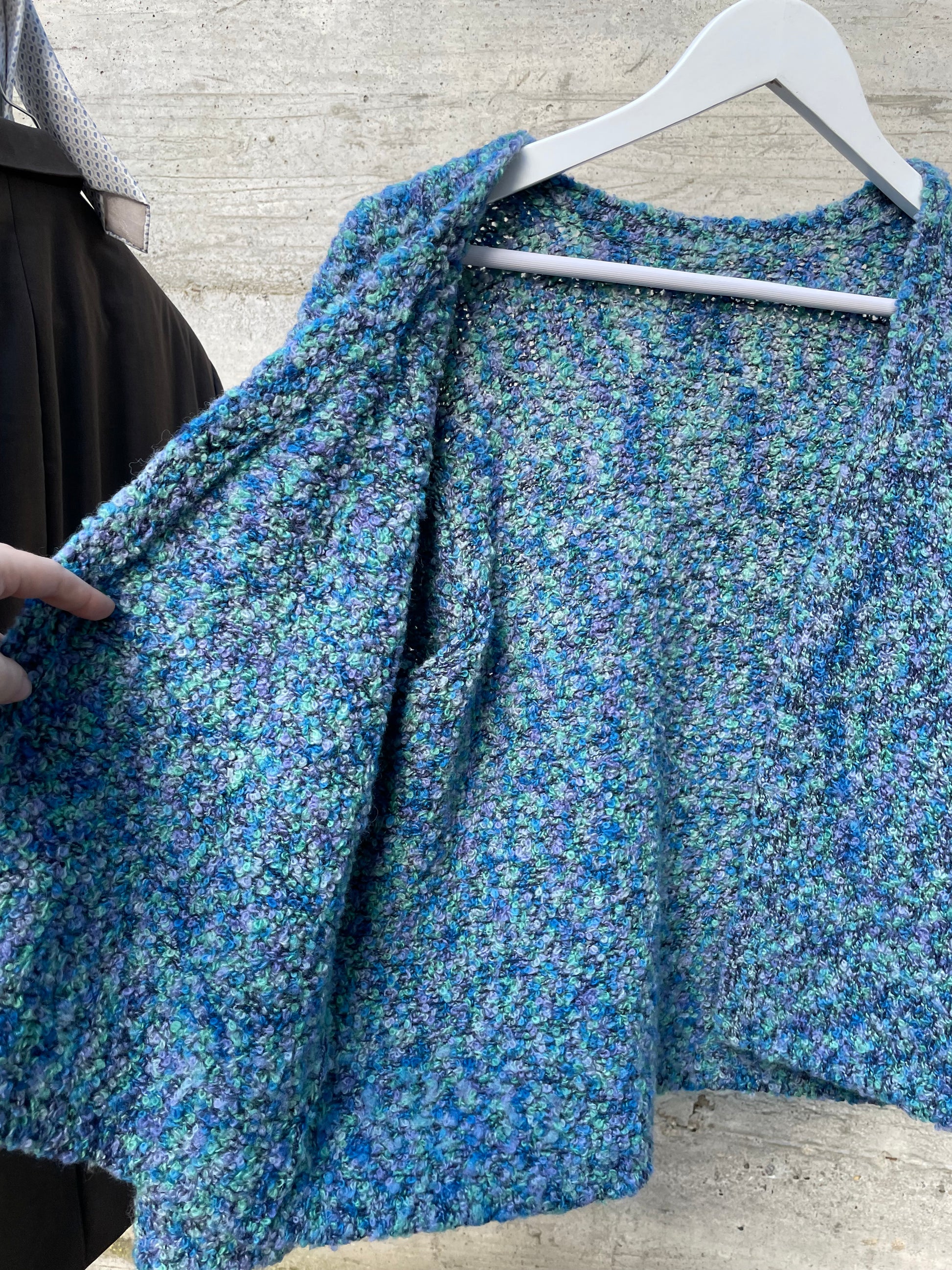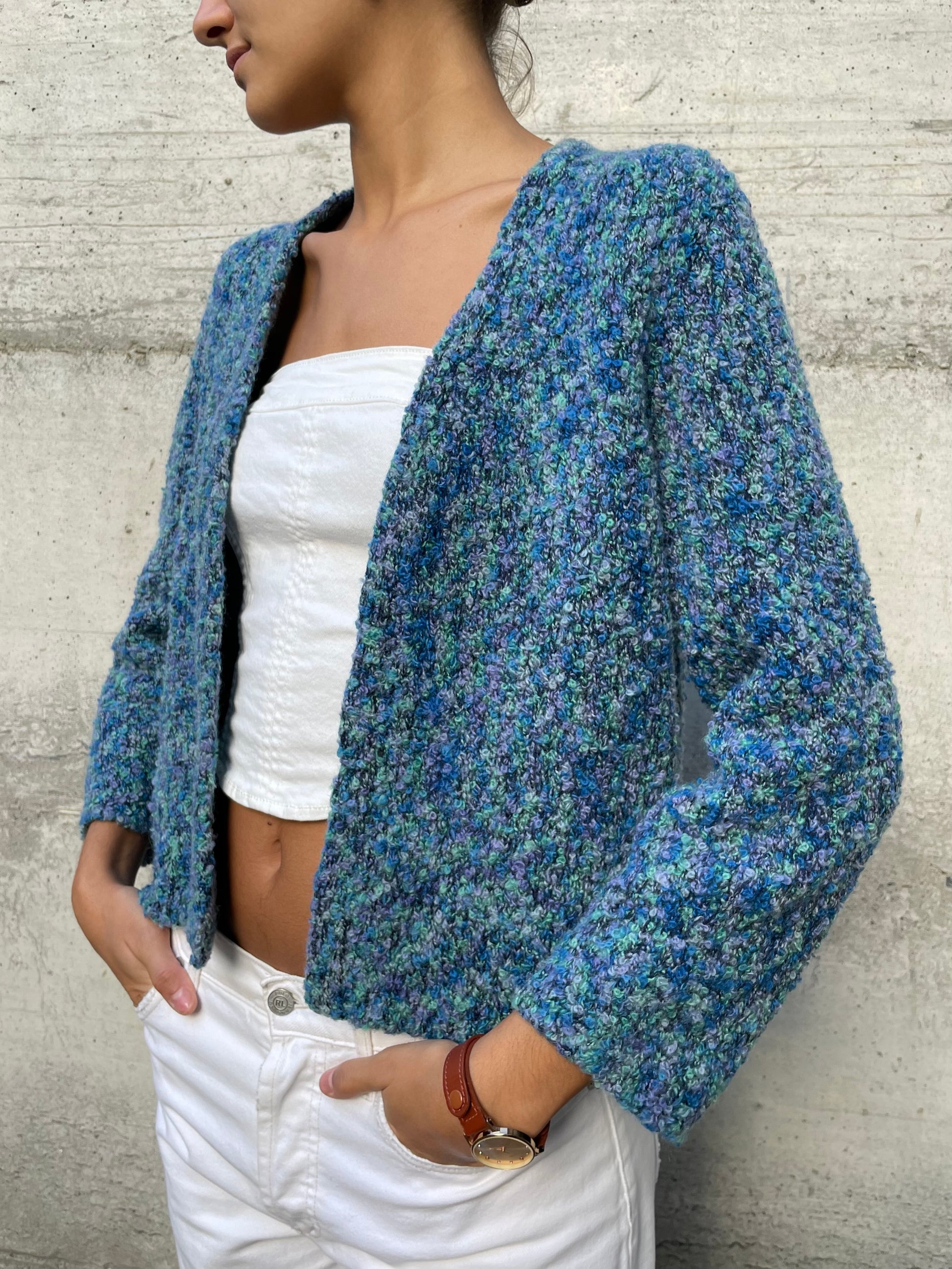 Cardigan cropped aperto sartoriale, sfumato tra il blu, il viola e il turchese.