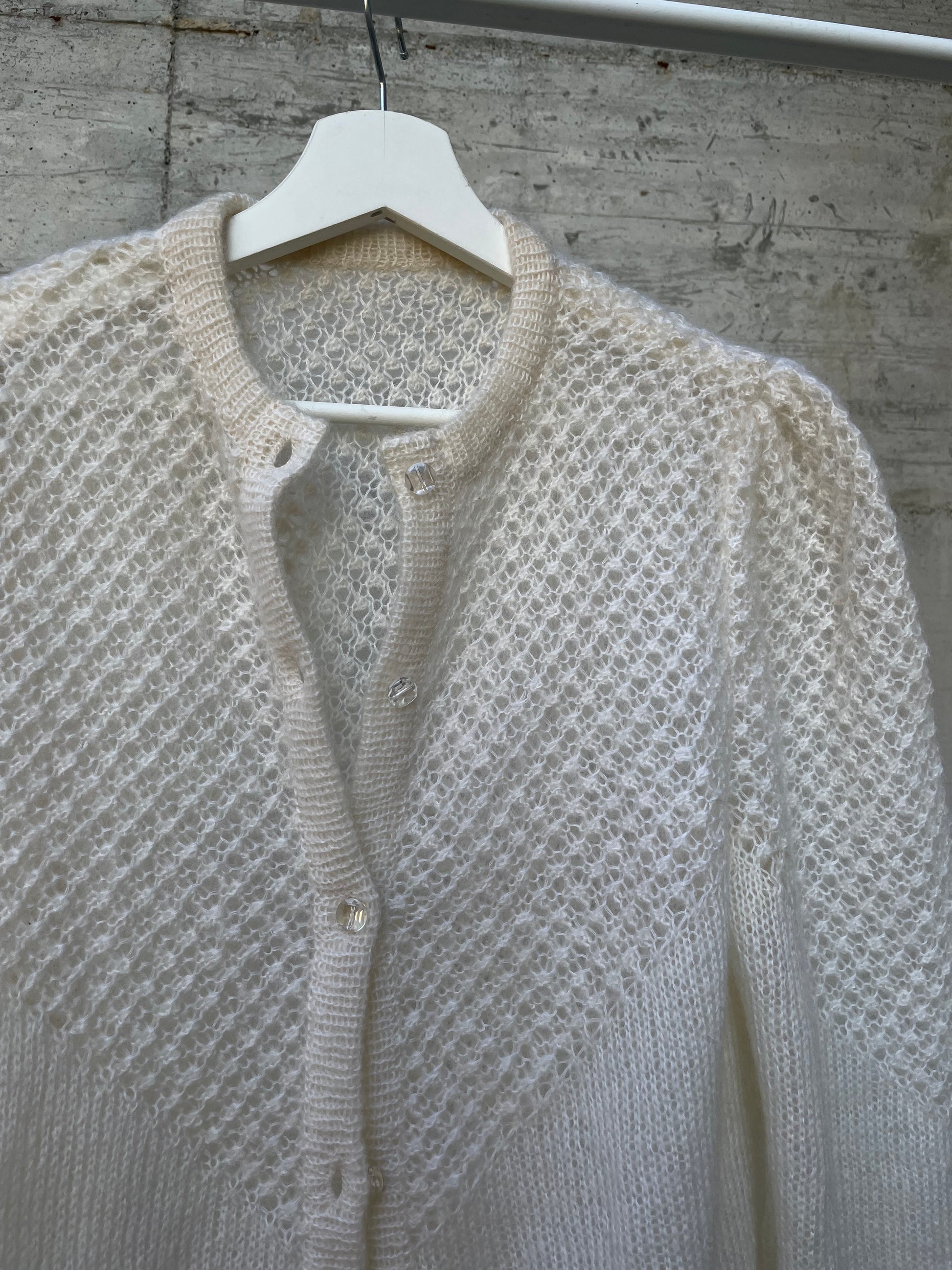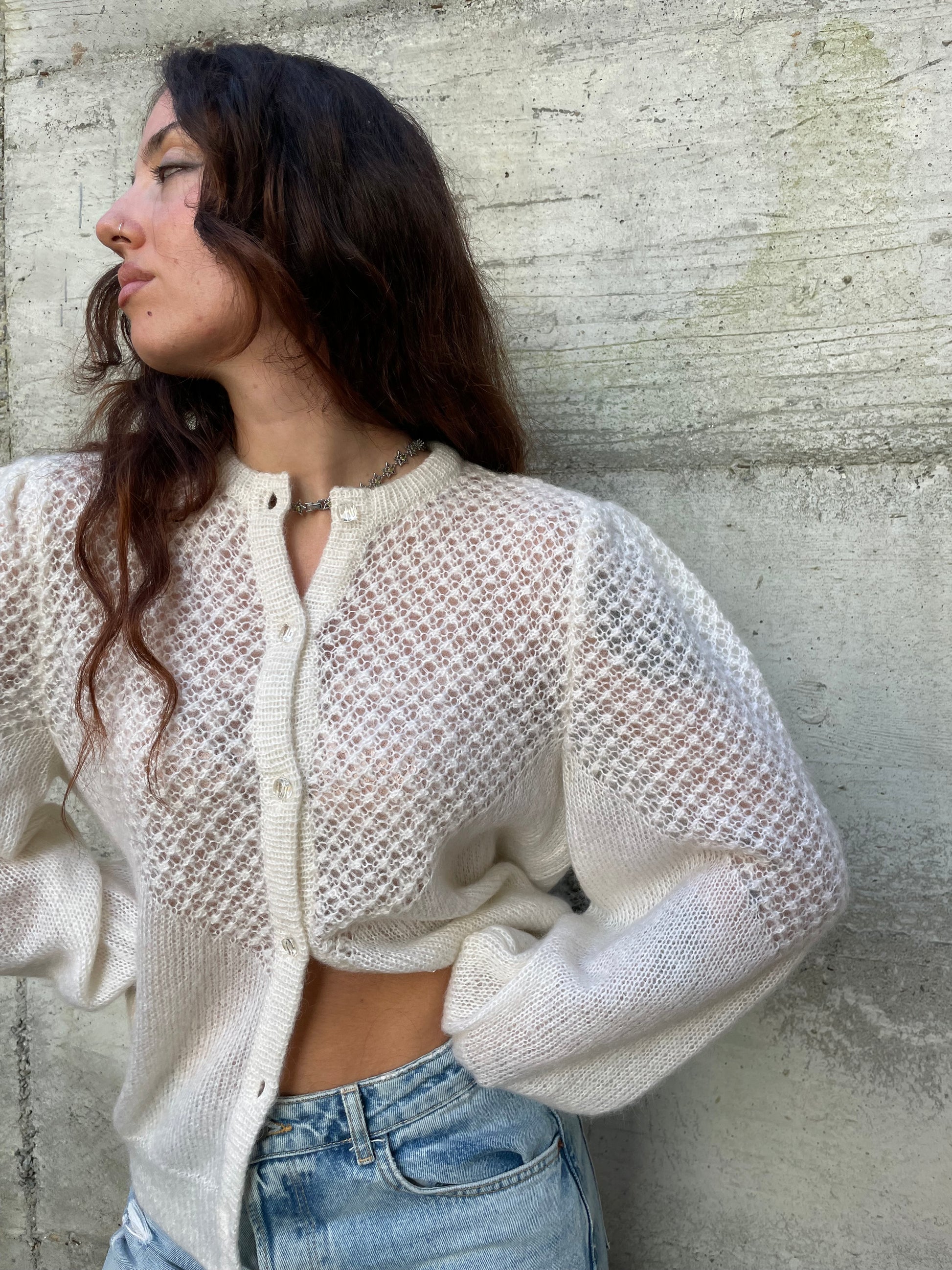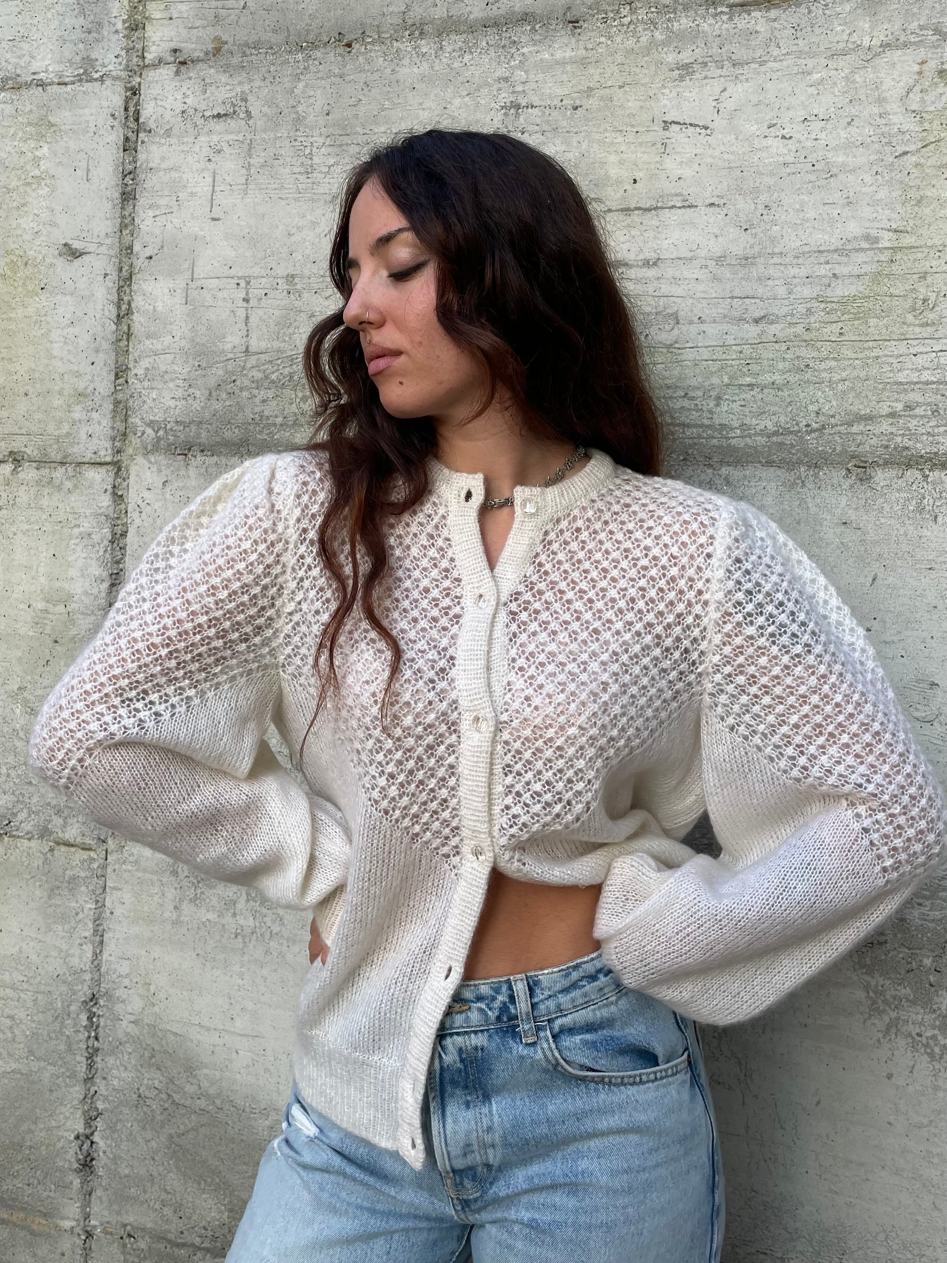 Splendido cardigan burro realizzato a mano, con manica a sbuffo e bottoncini gioiello.