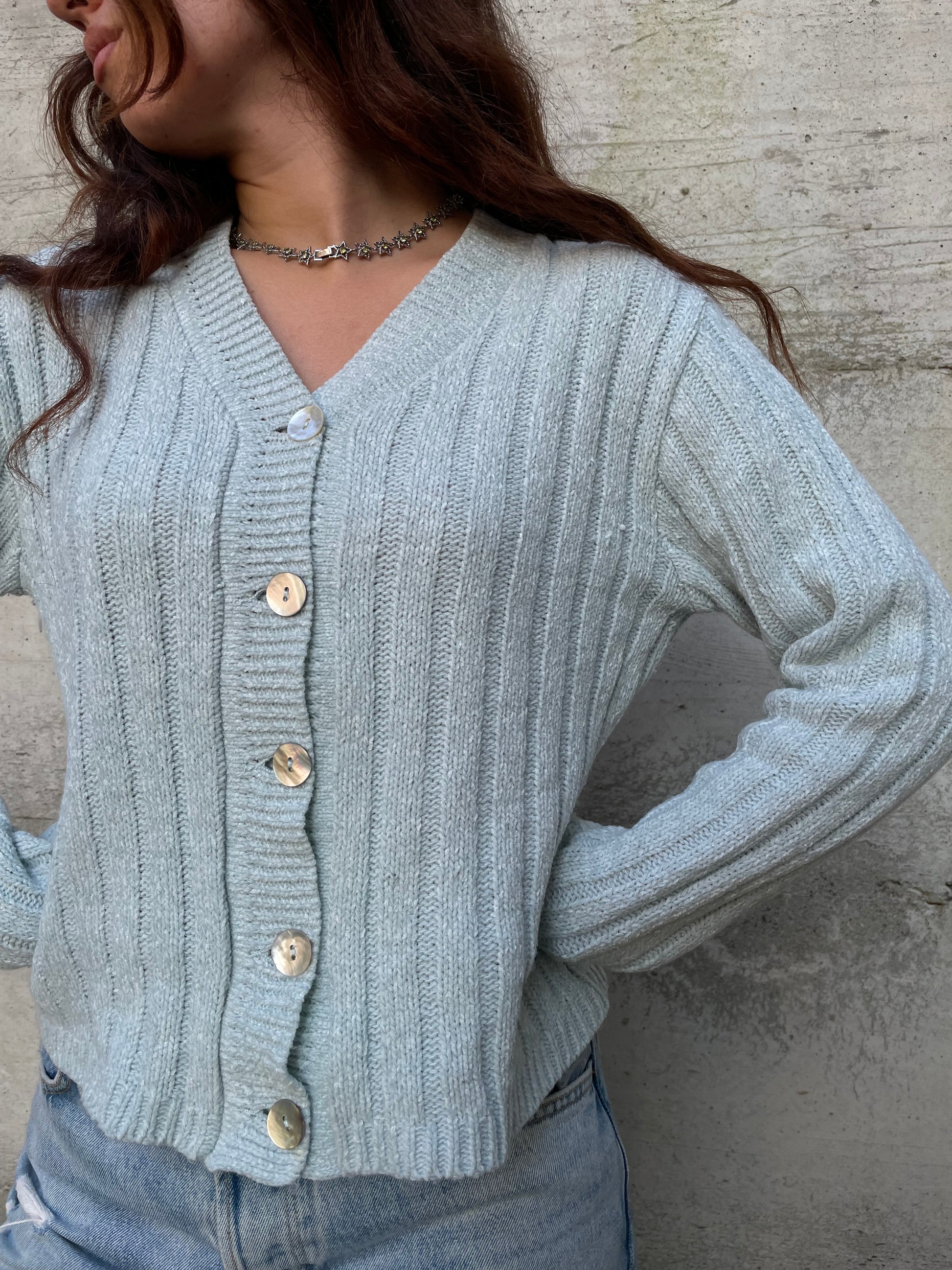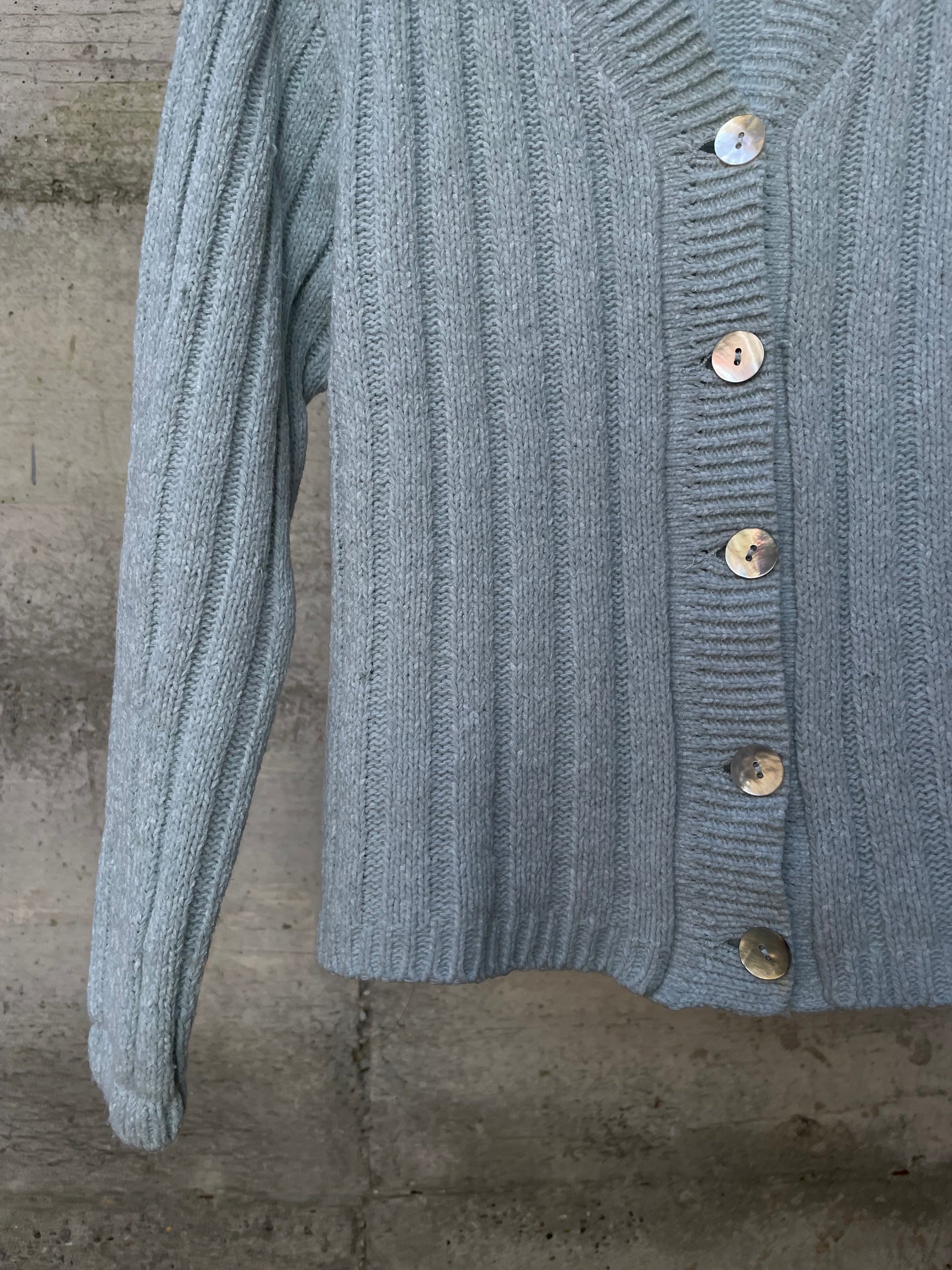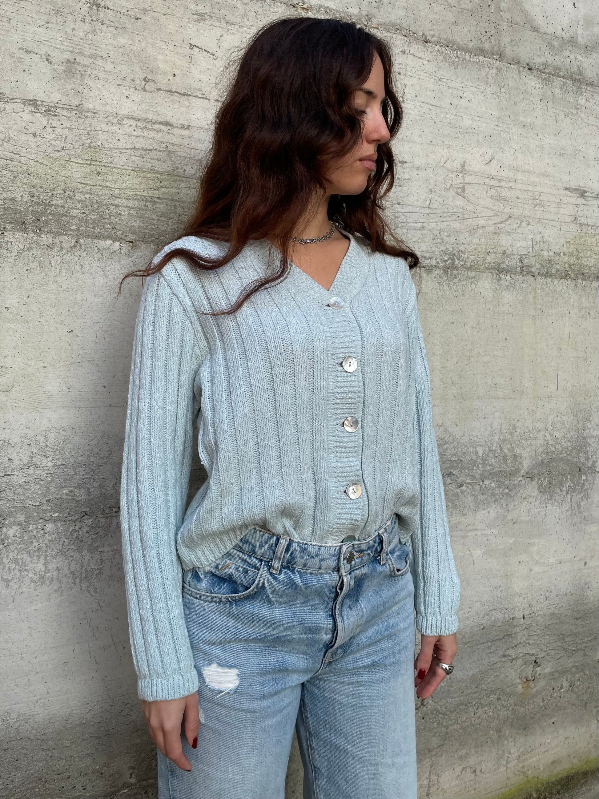Cardigan turchese 85% lana 15% viscosa, scollo a V e bottoncini in madreperla.