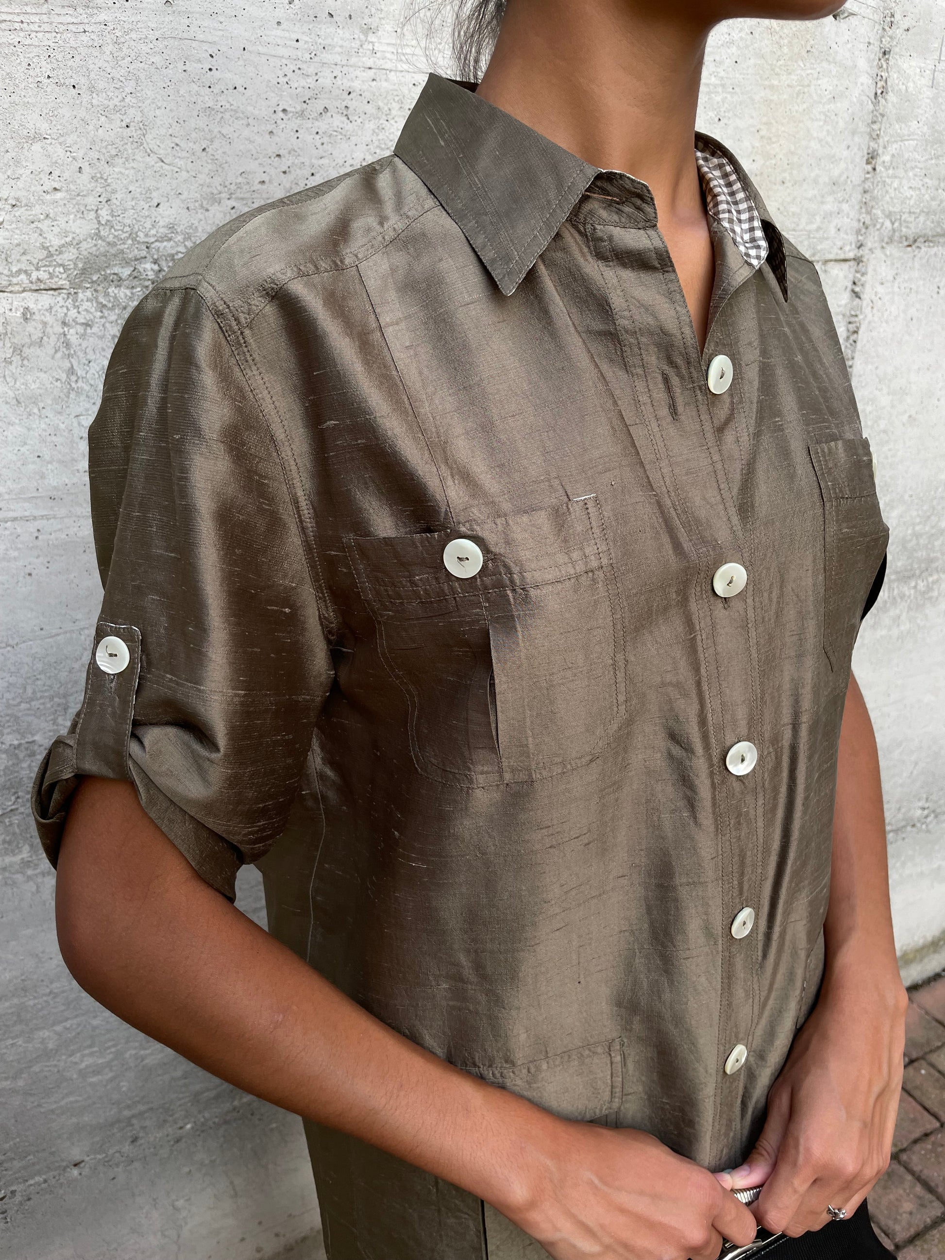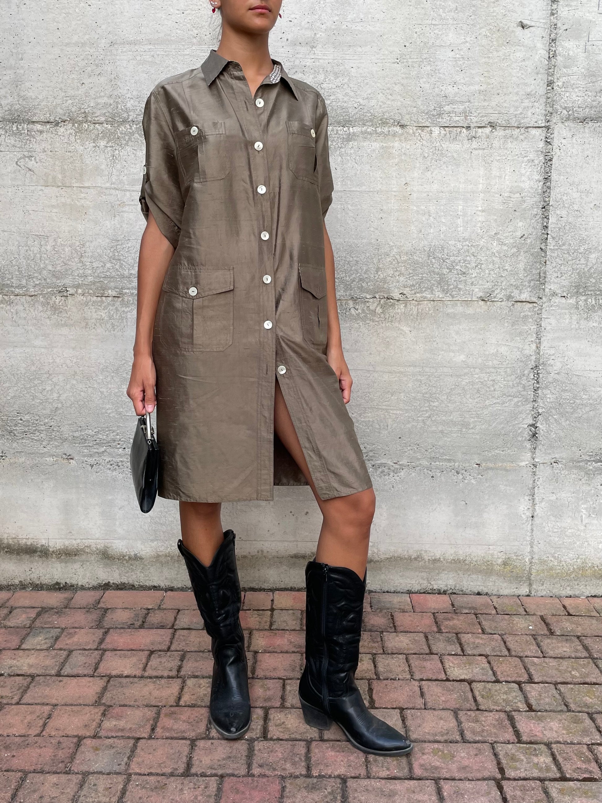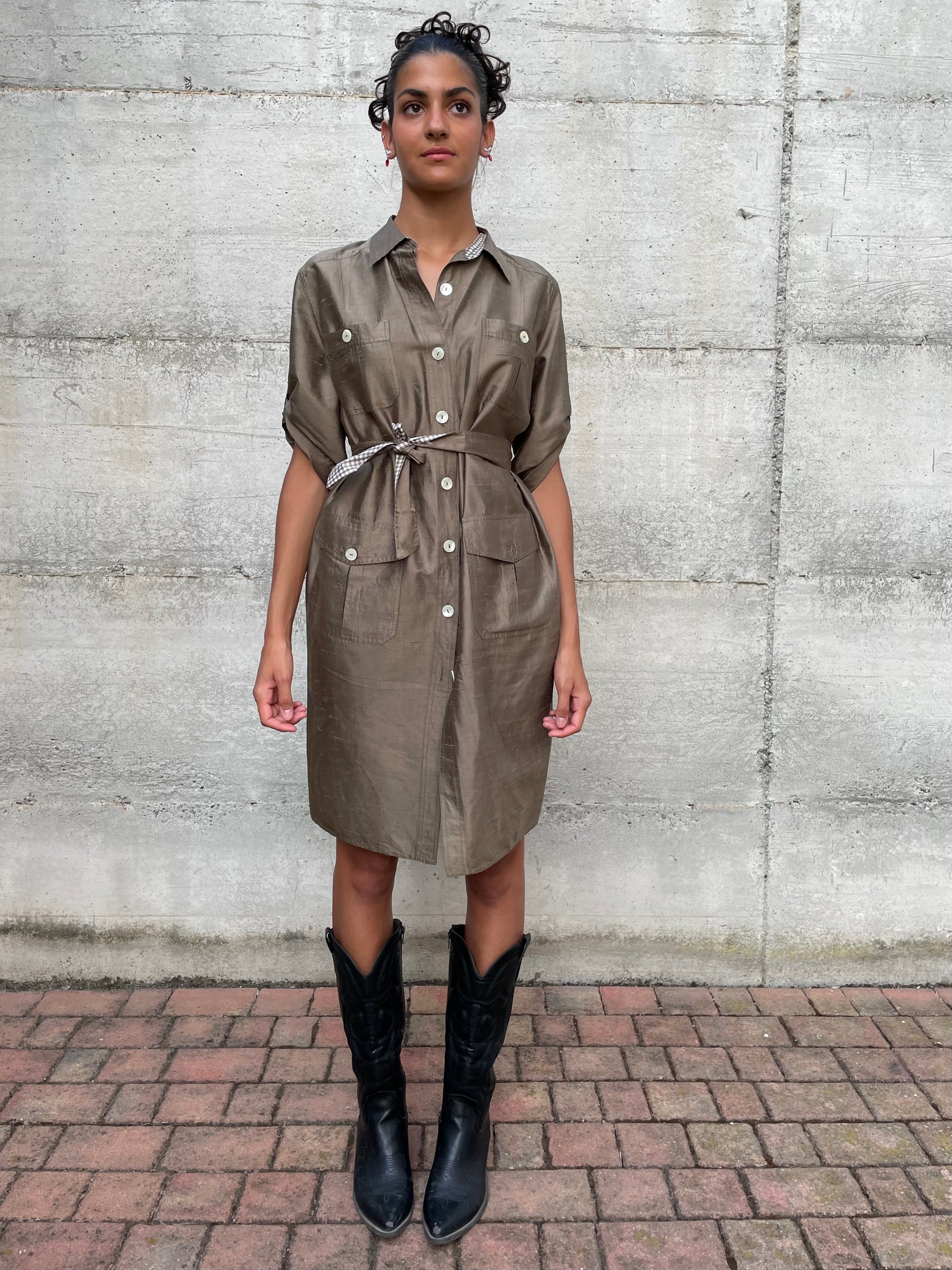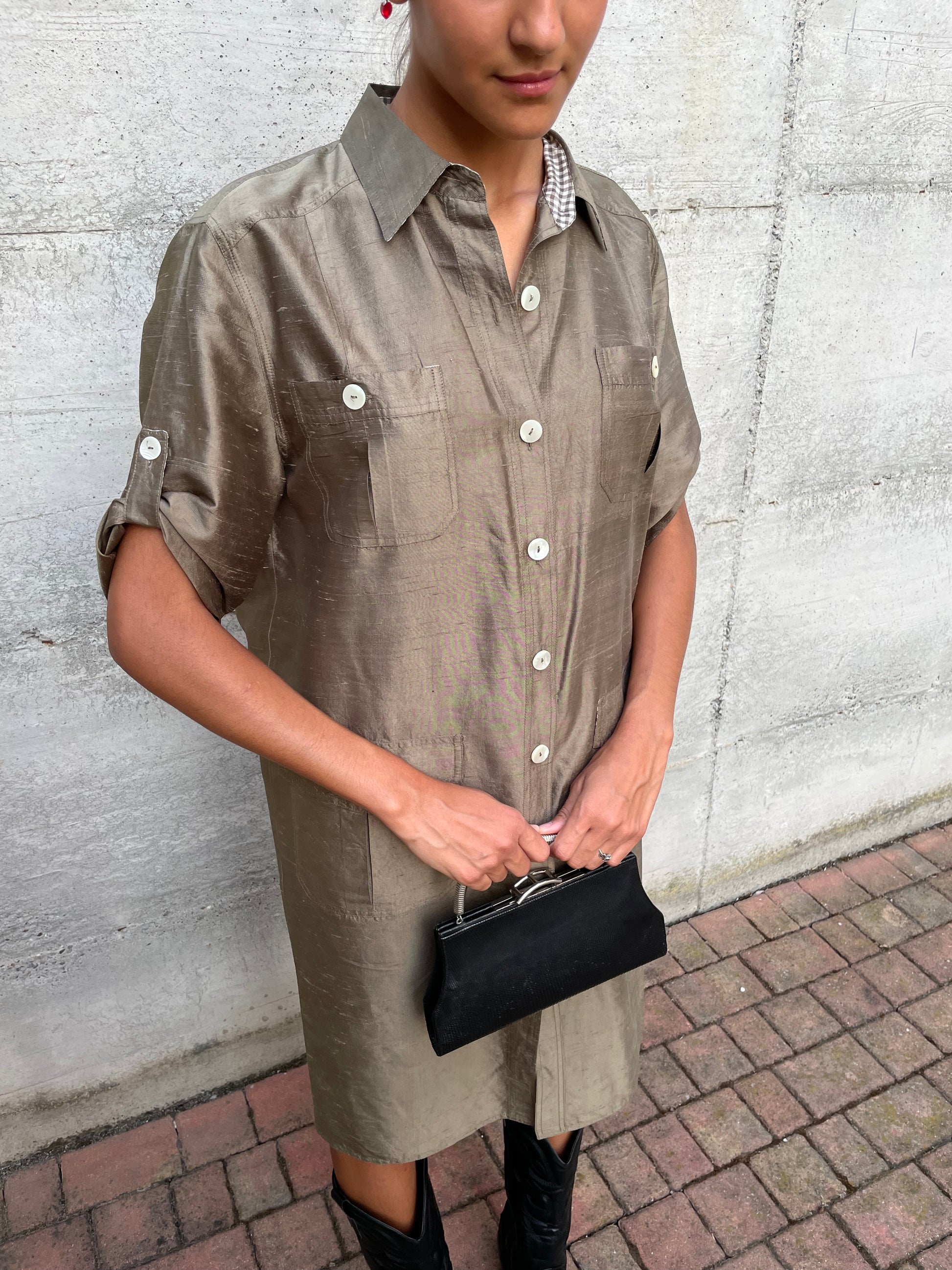 Chemisier midi 100% shantung di seta verde oliva - taglia M