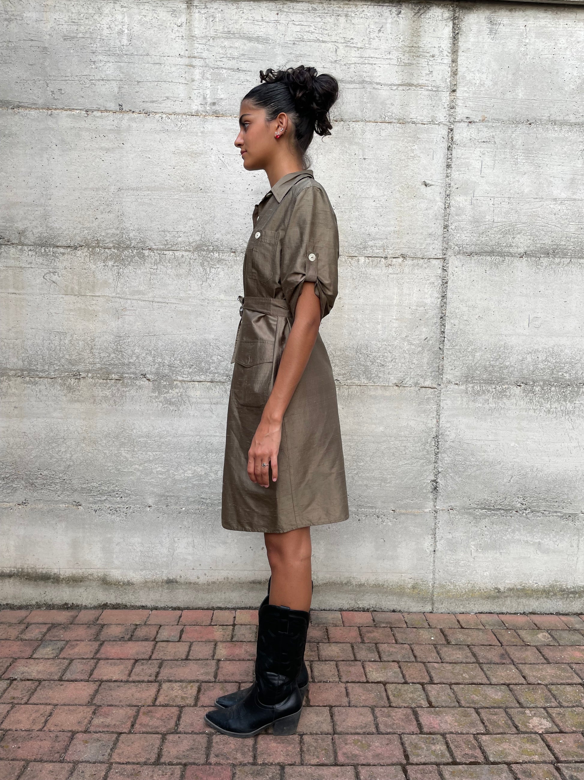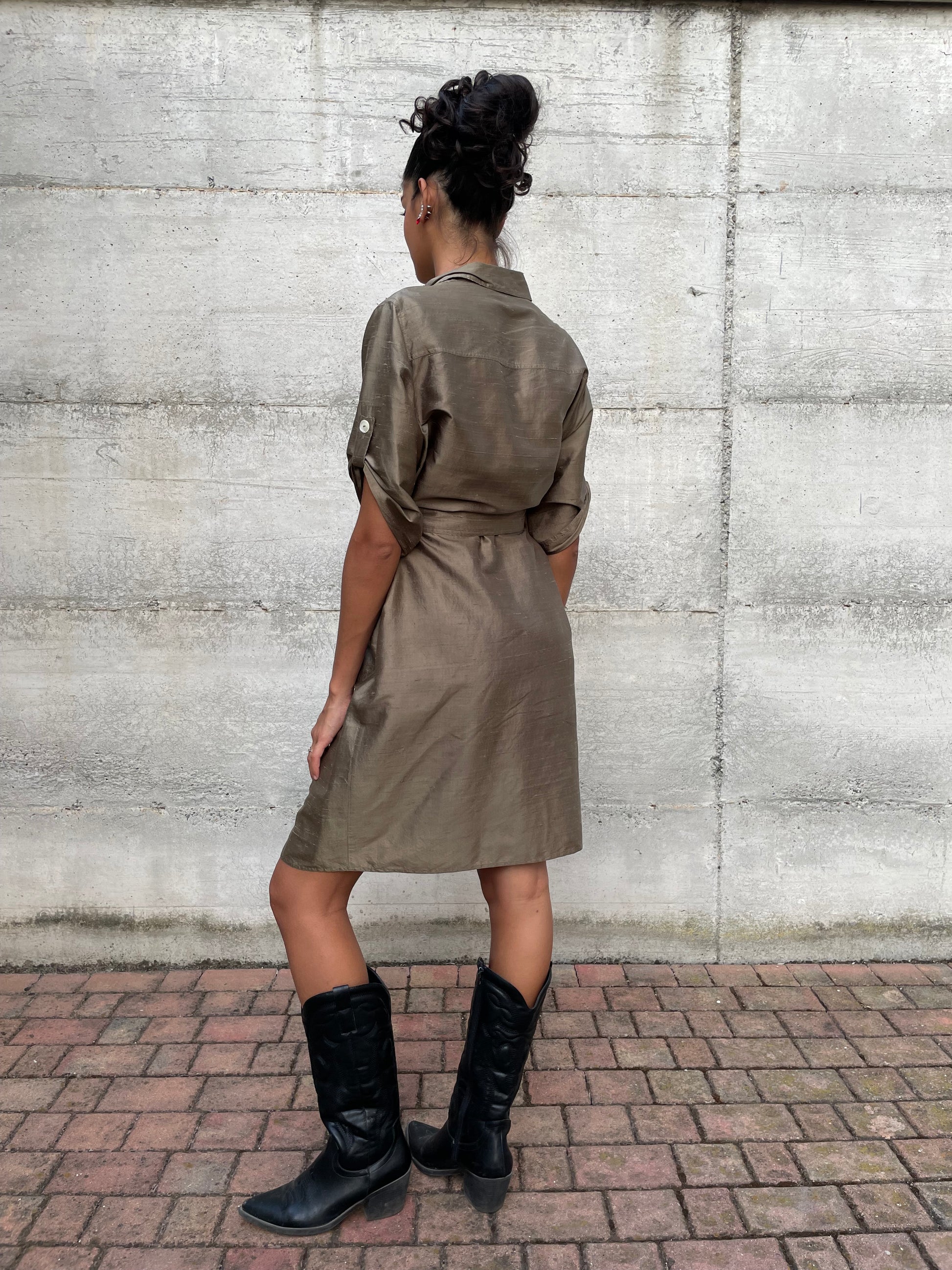 Abito midi chemisier sartoriale 100% shantung di seta, verde militare.