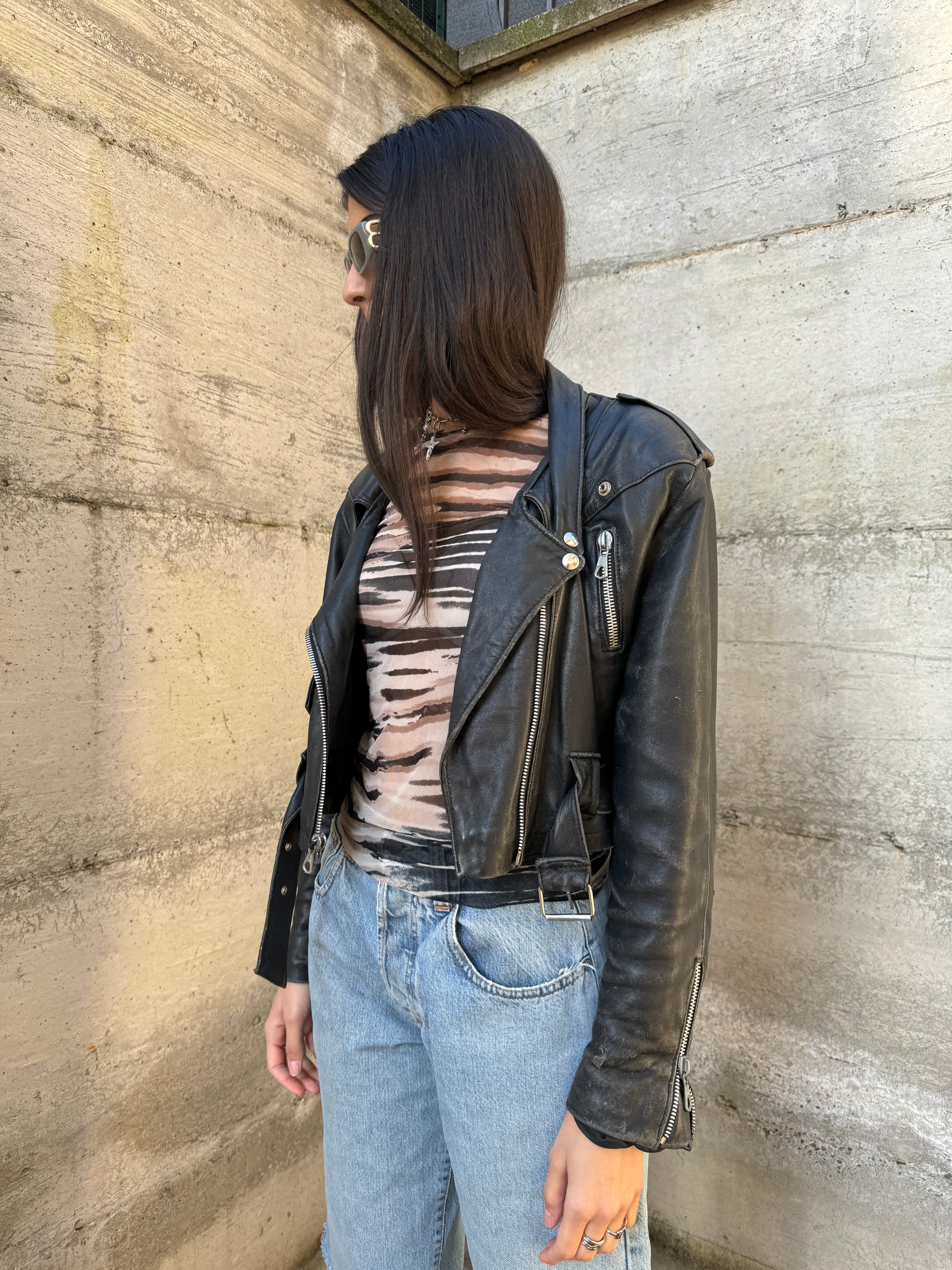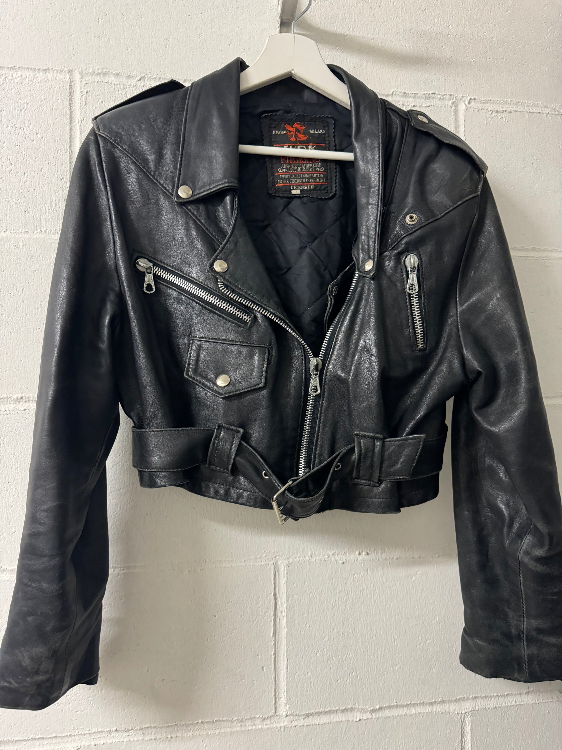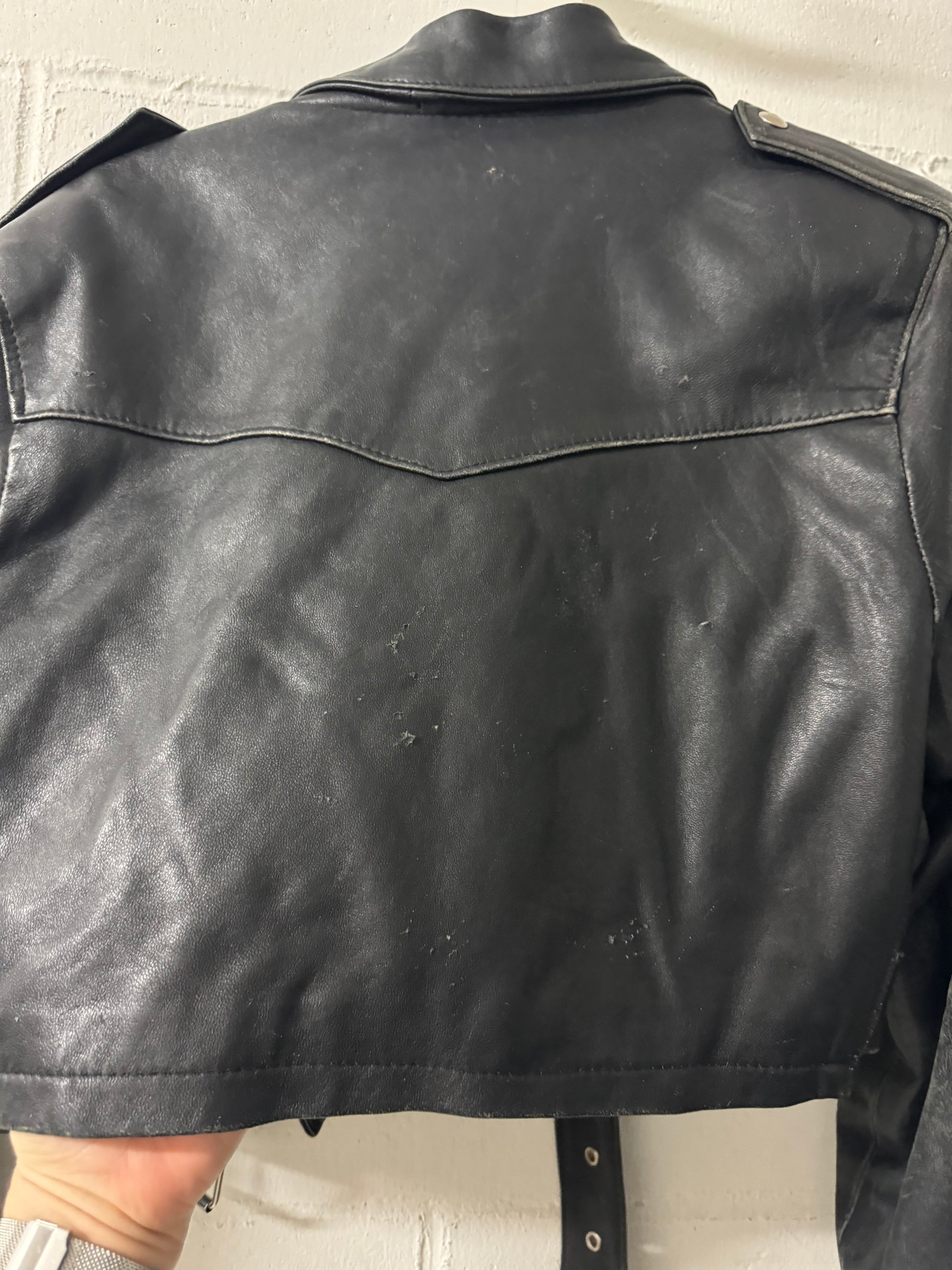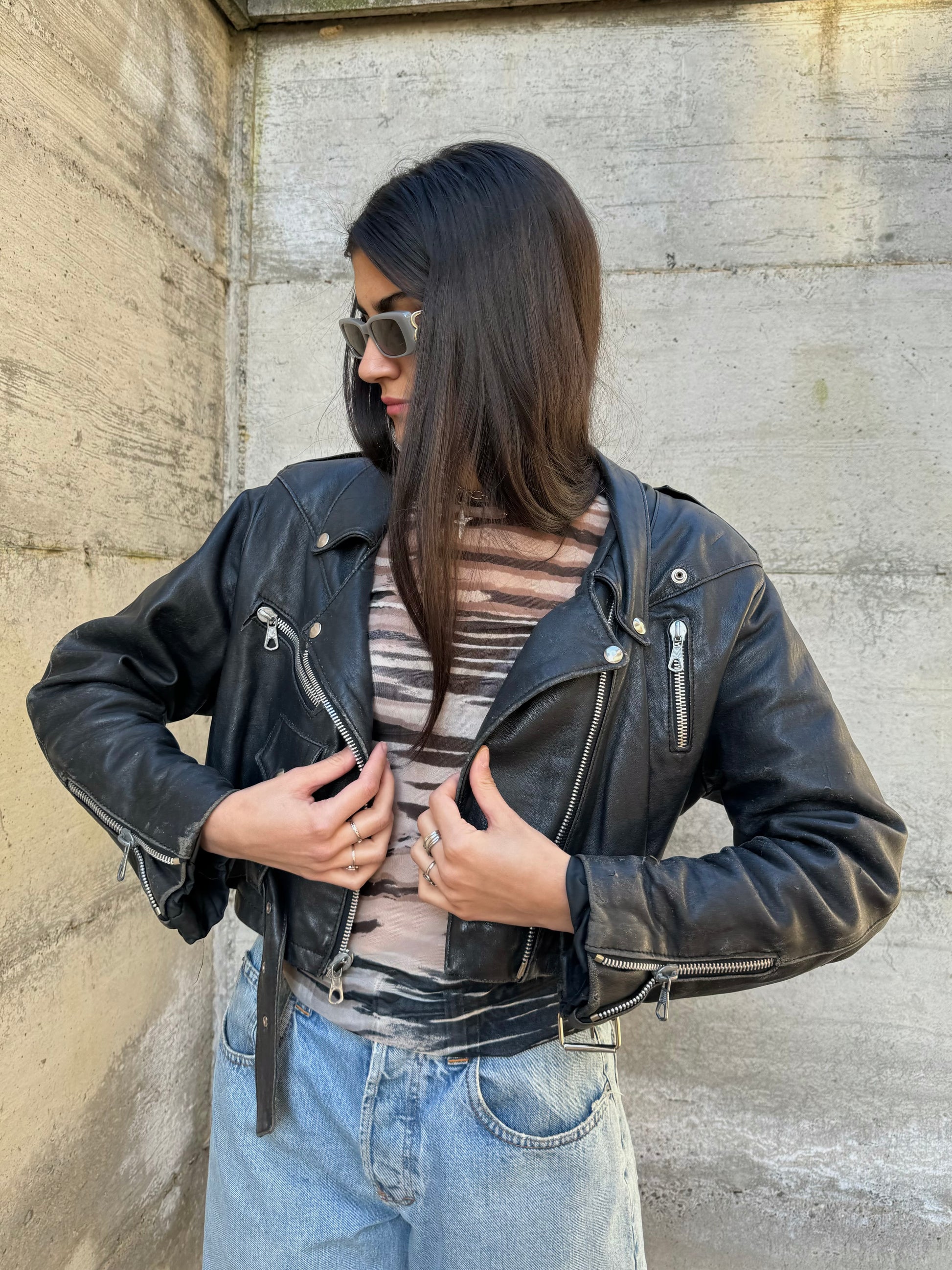 Chiodo nero crop in vera pelle nappata (morbida e leggera).