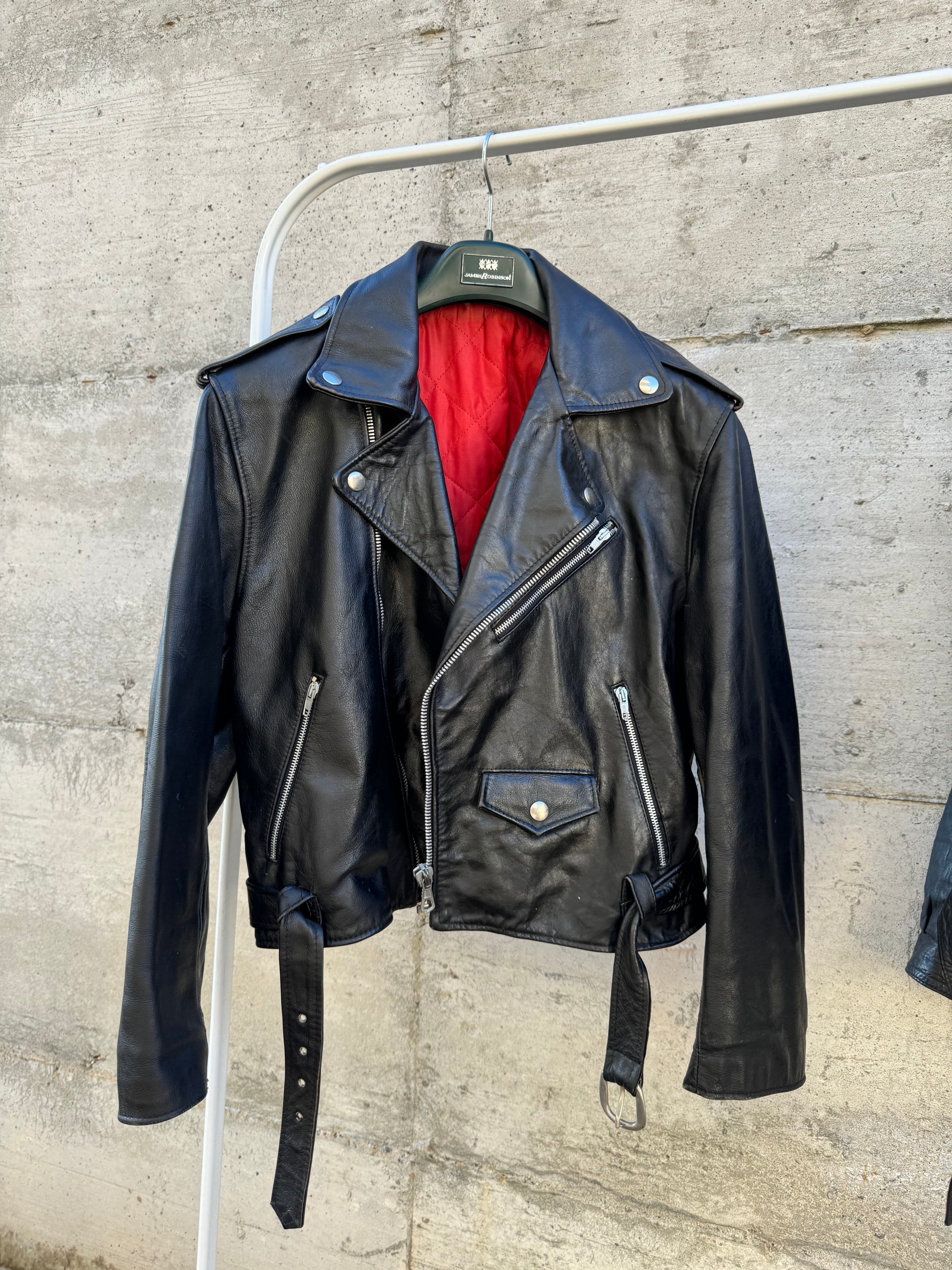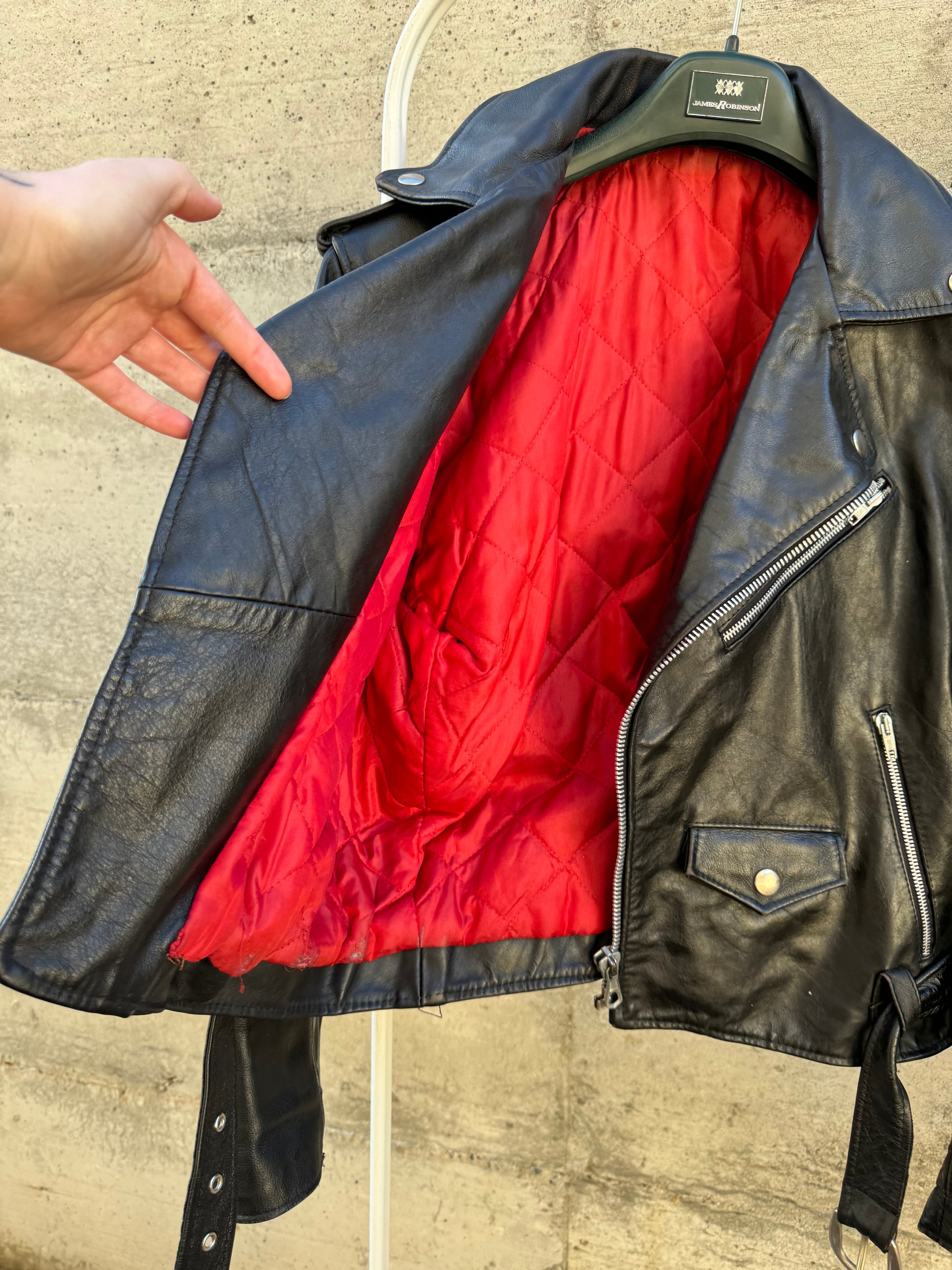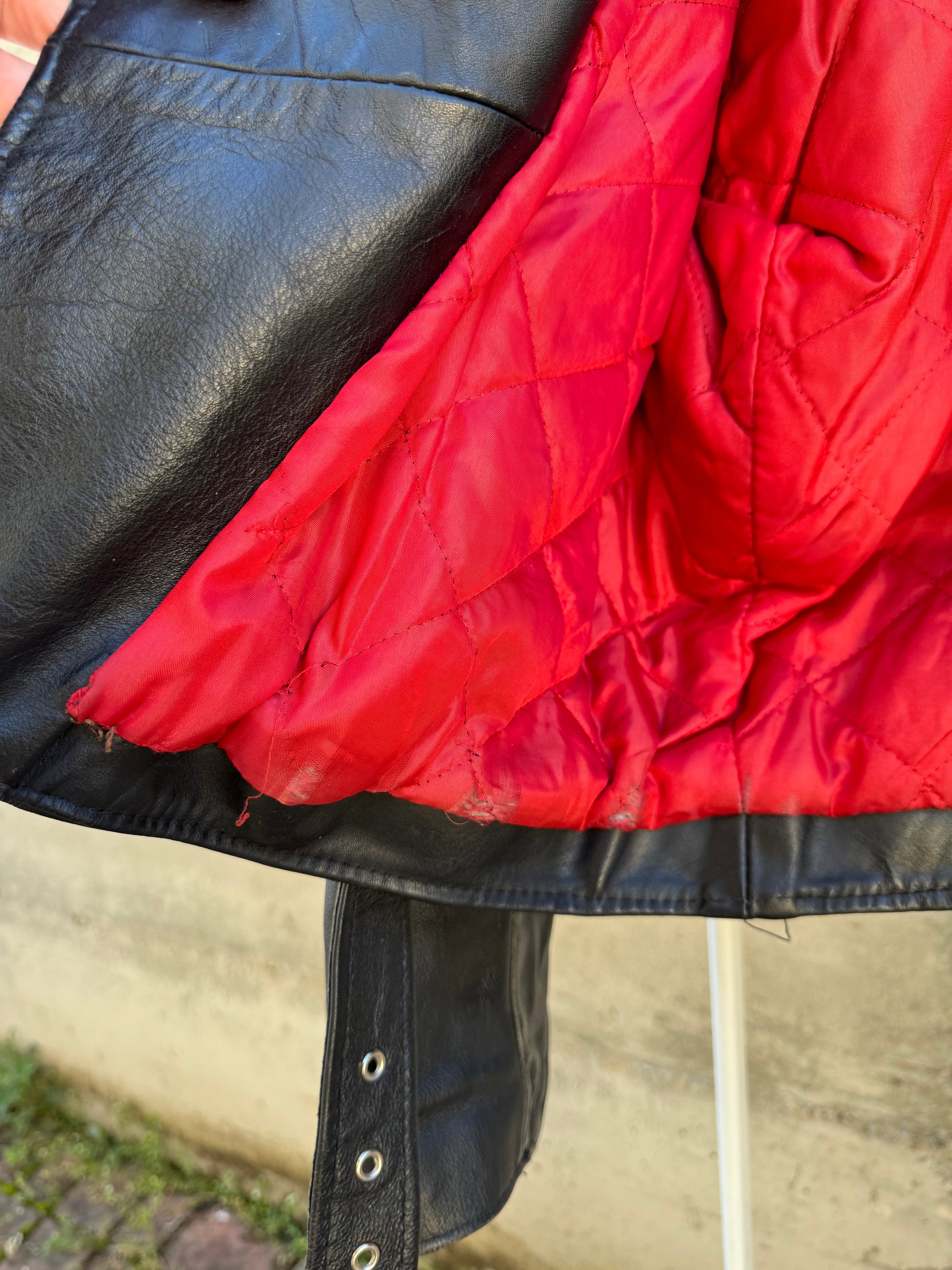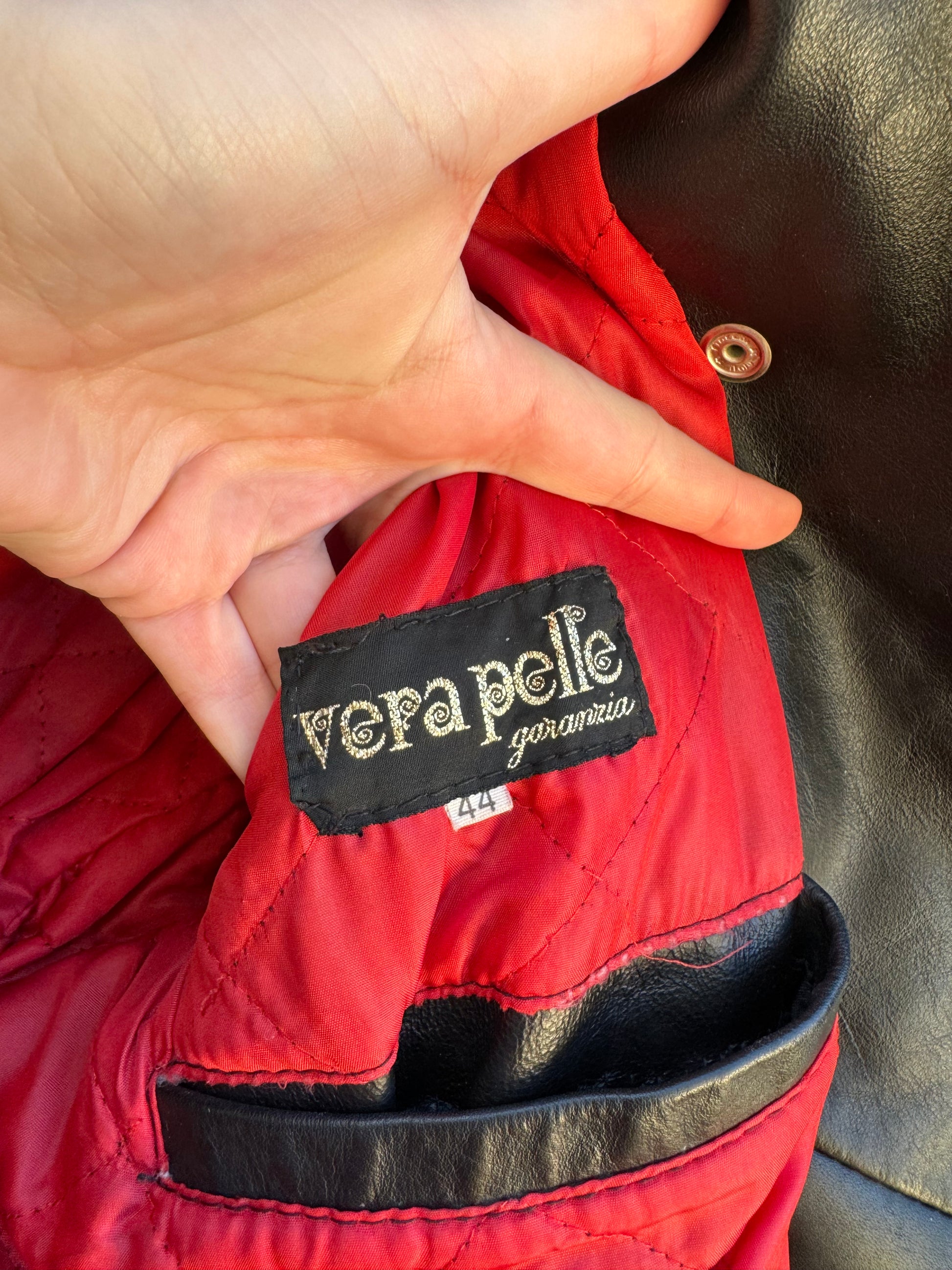 Chiodo in cuoio con fodera rossa leggermente imbottita.