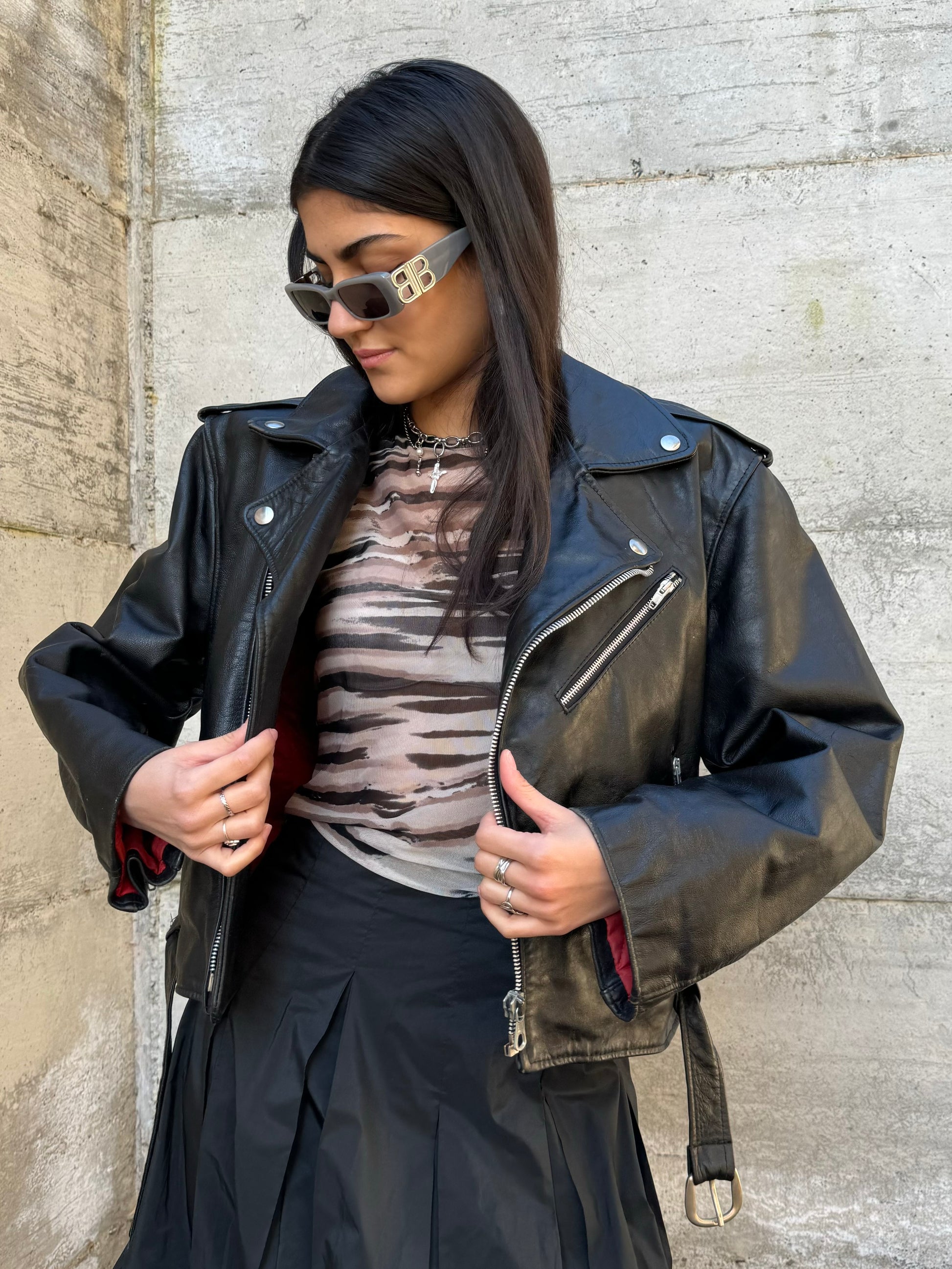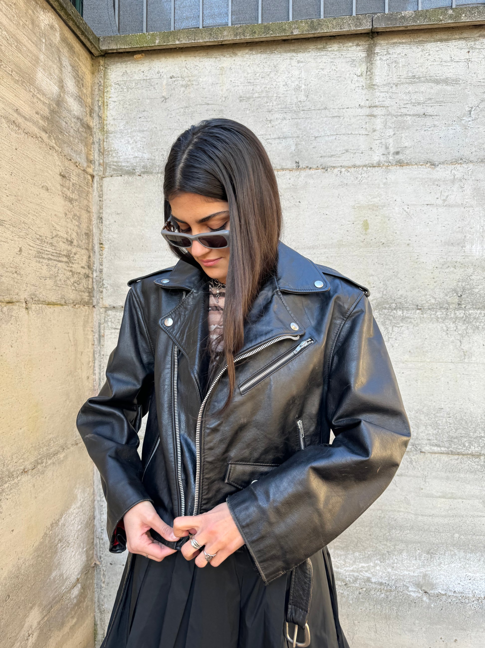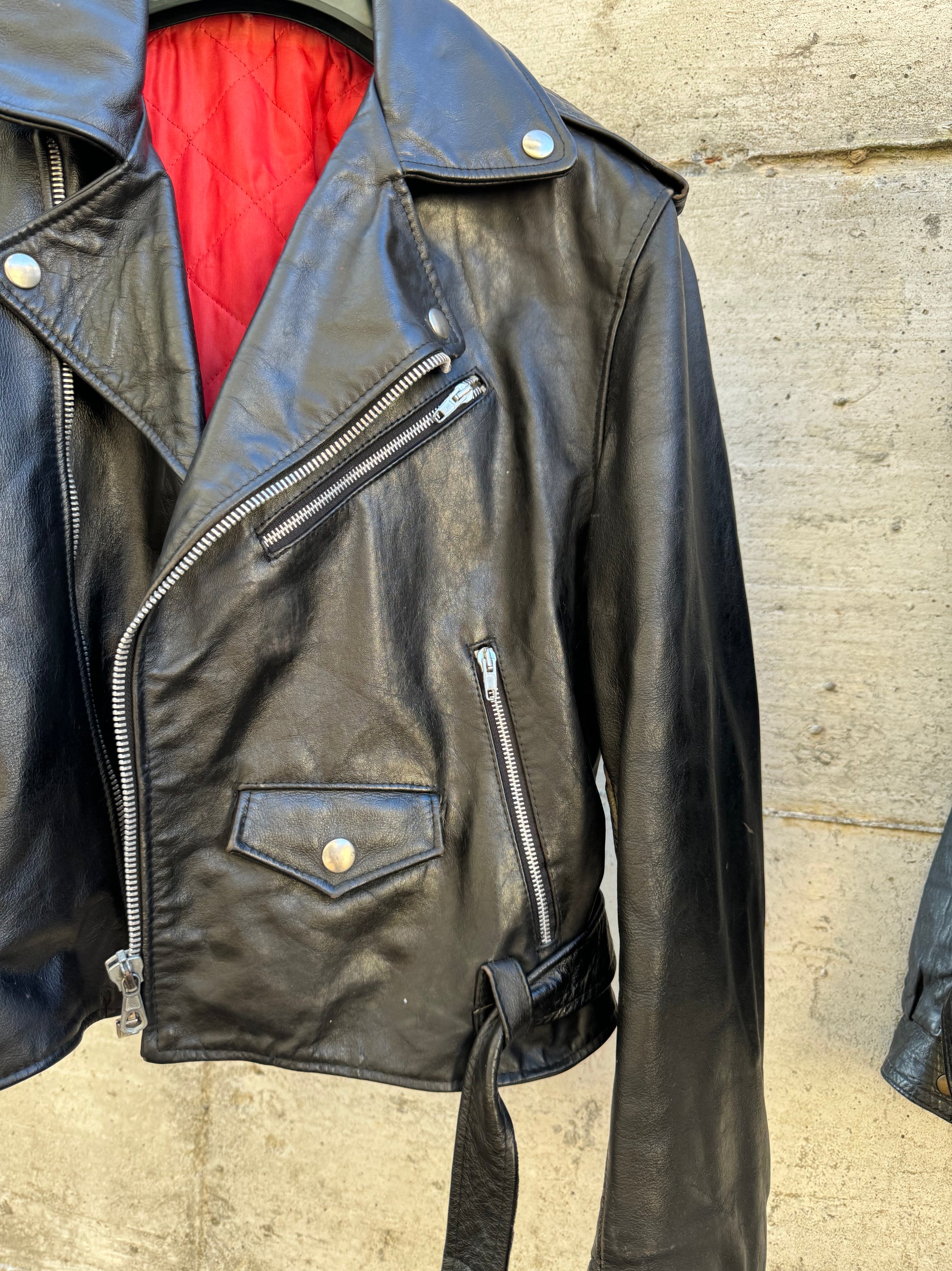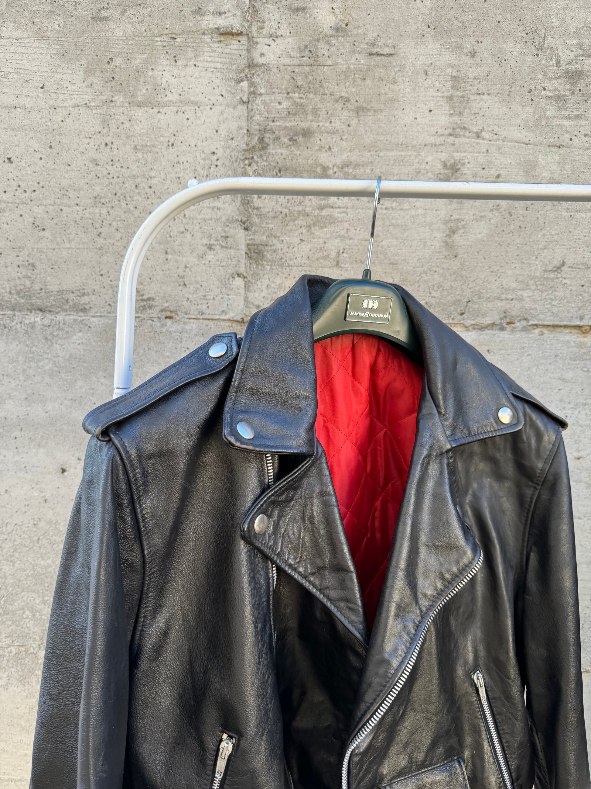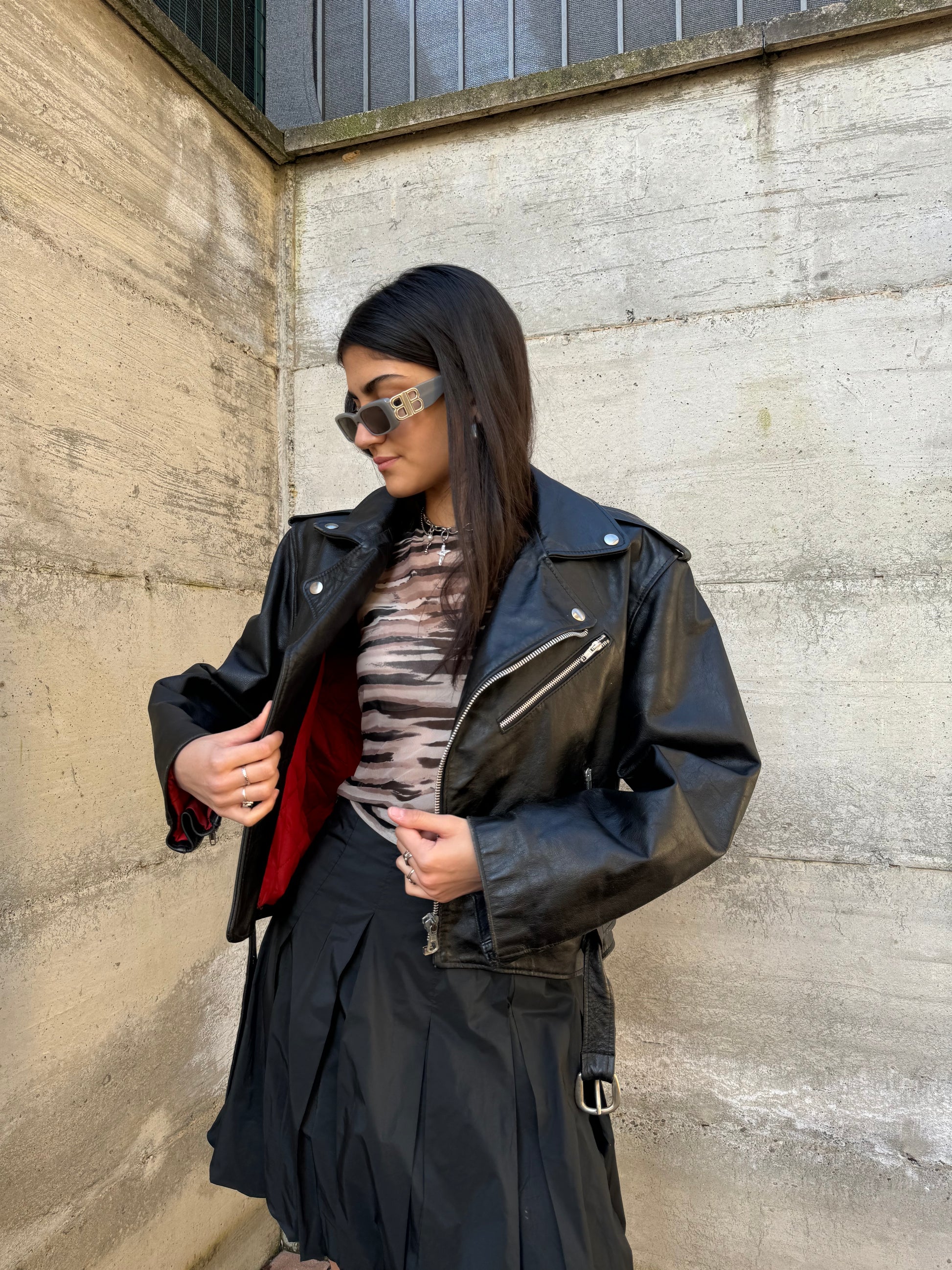 Chiodo in cuoio con fodera rossa leggermente imbottita.
