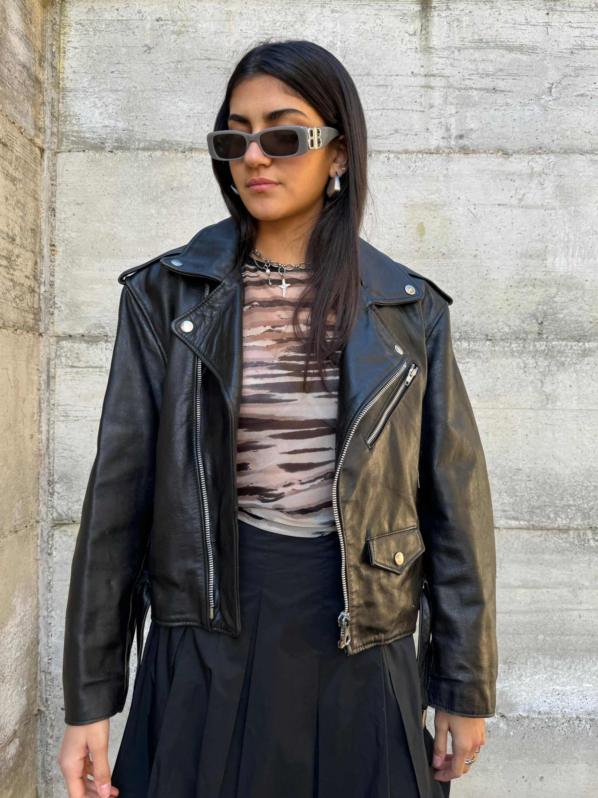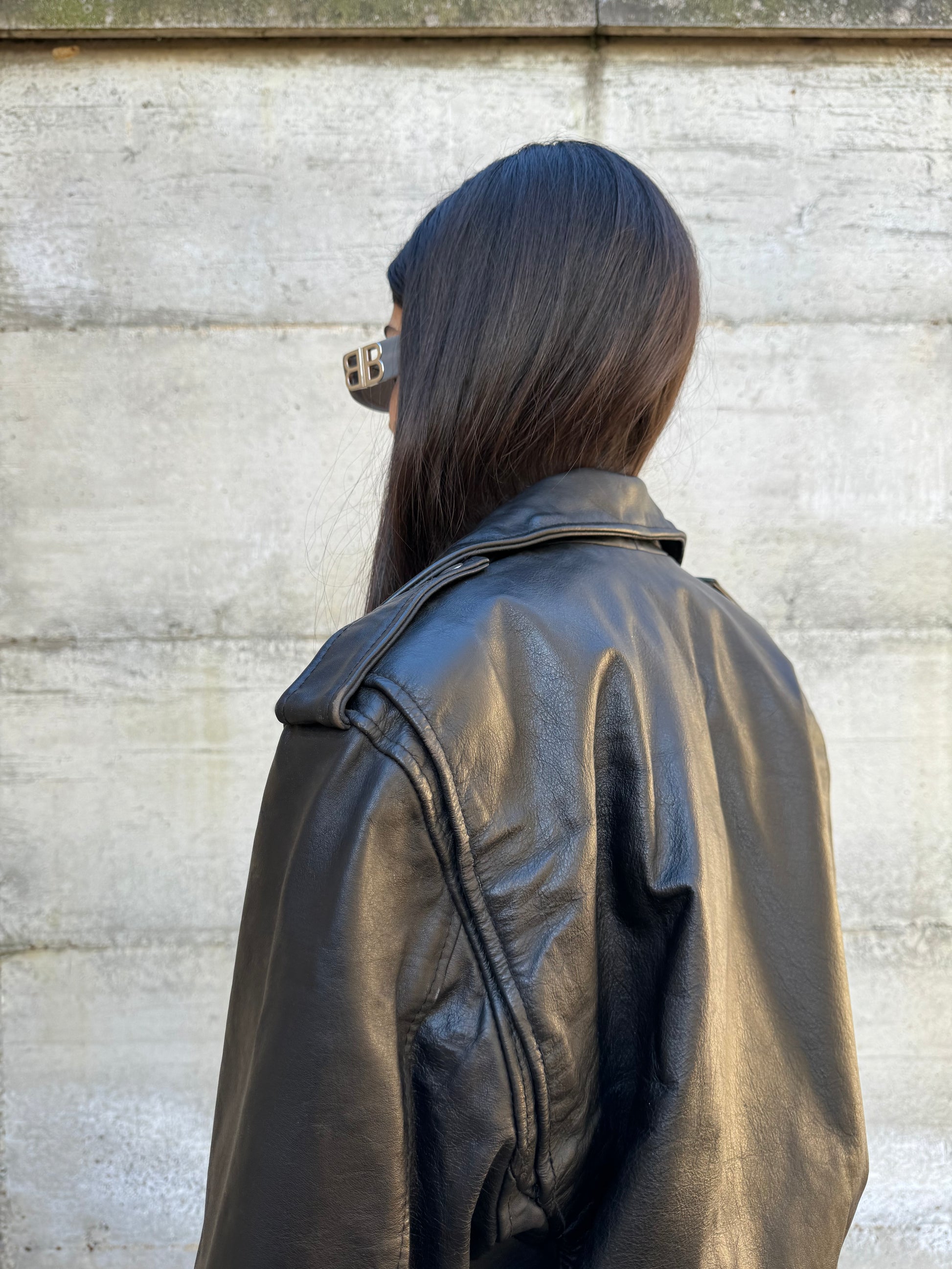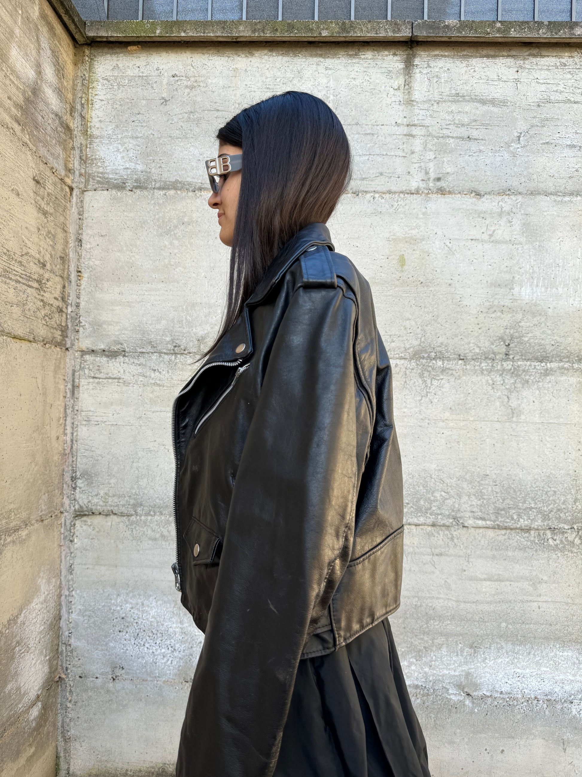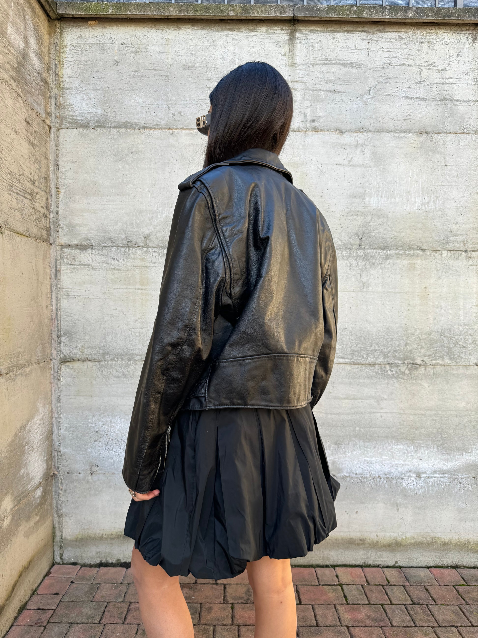 Chiodo in cuoio con fodera rossa leggermente imbottita.