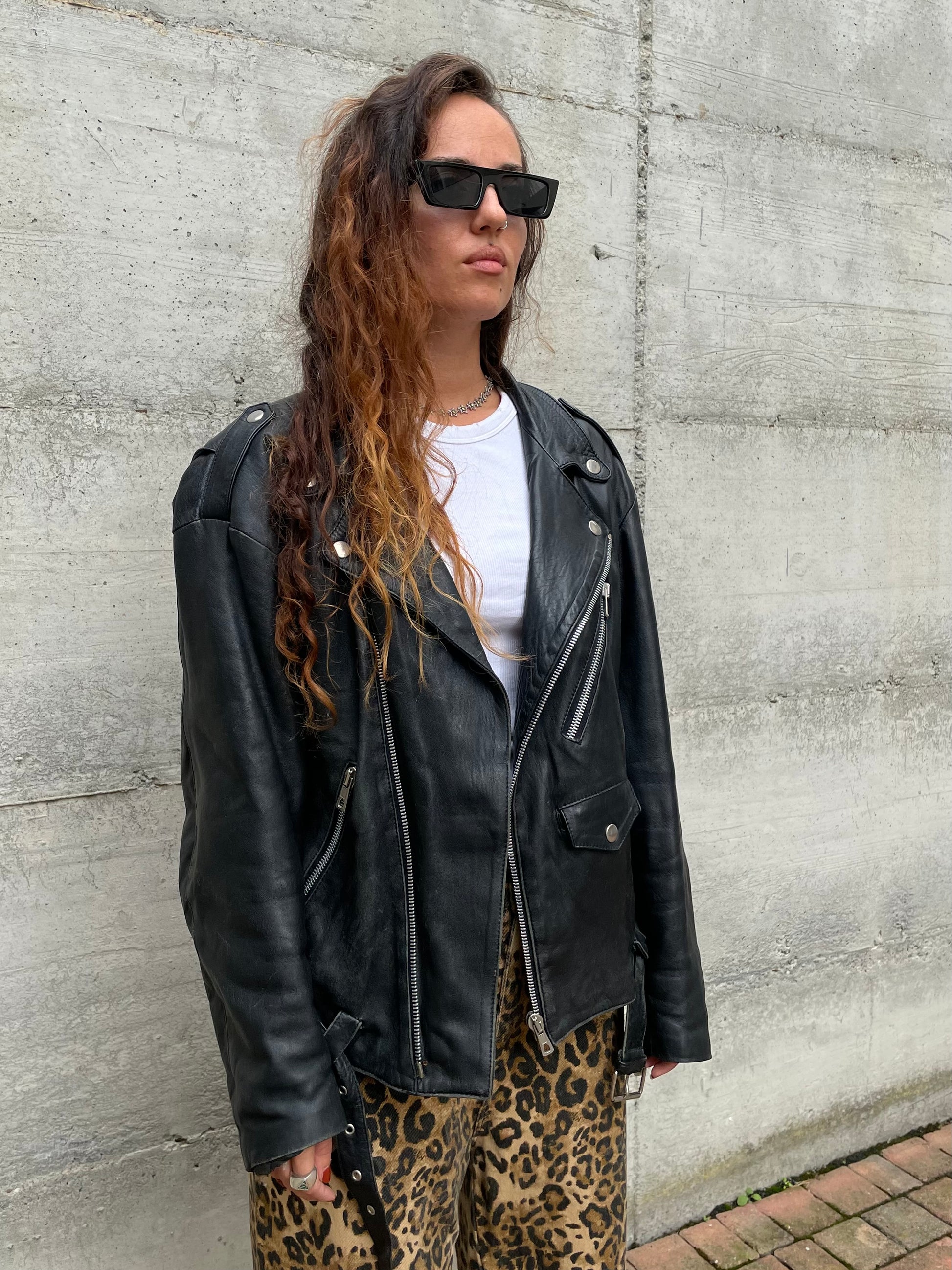 Chiodo vintage in vera pelle nero, modello classico doppiopetto con cerniera e cintura in vita.