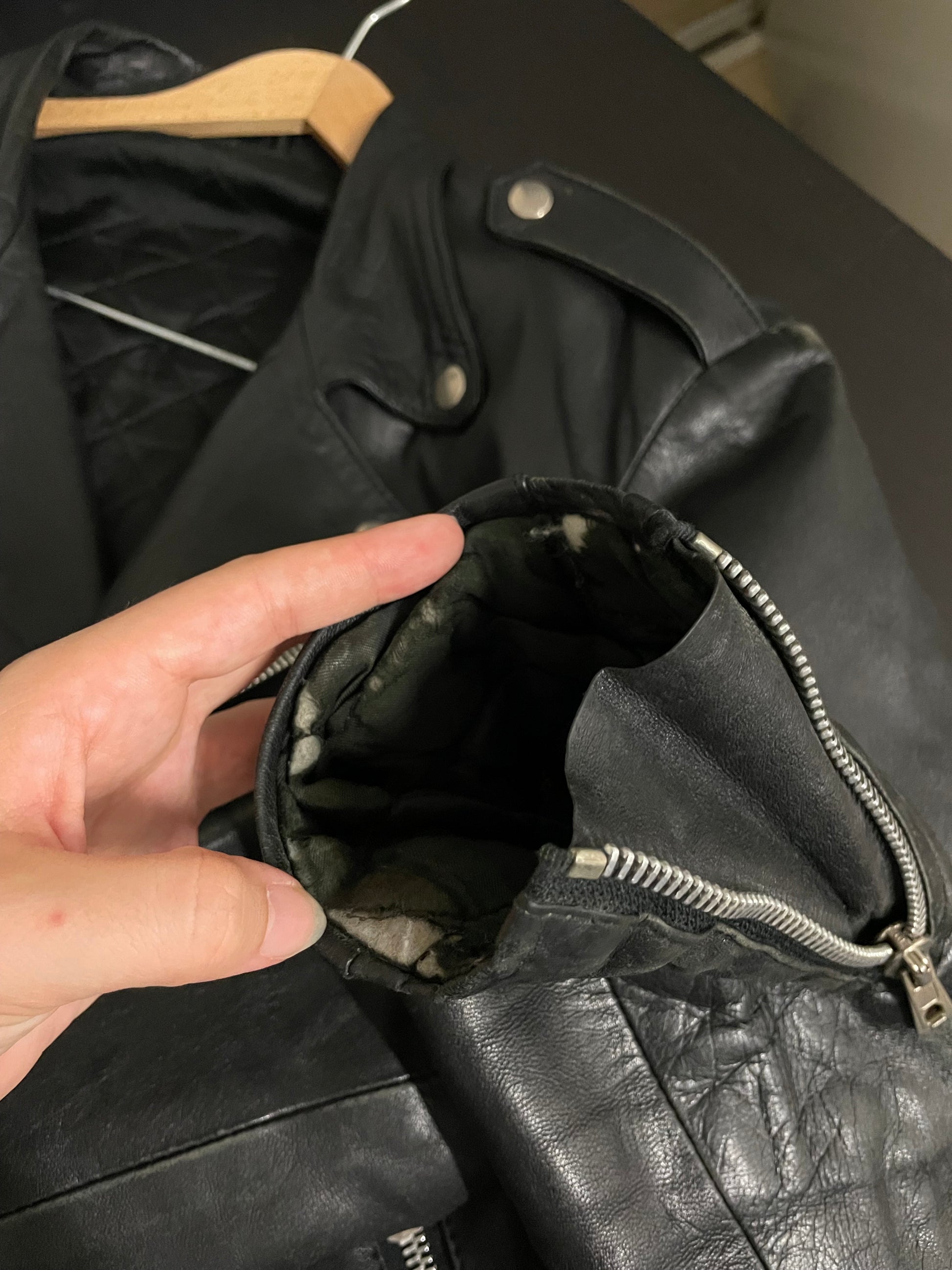Non presenta tagli o segni d'usura esterni, unico difetto interno, fodera dei polsini scucita come da foto.