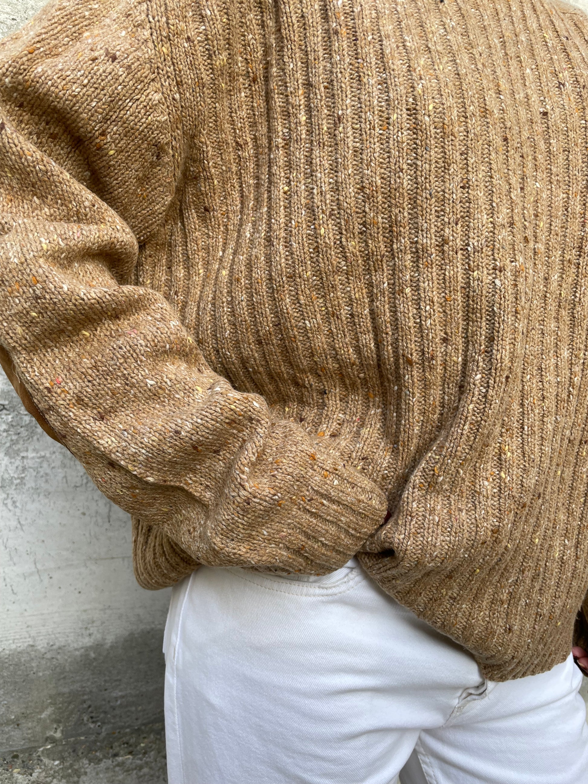 Tessuto melange color biscotto, con toppe sui gomiti.