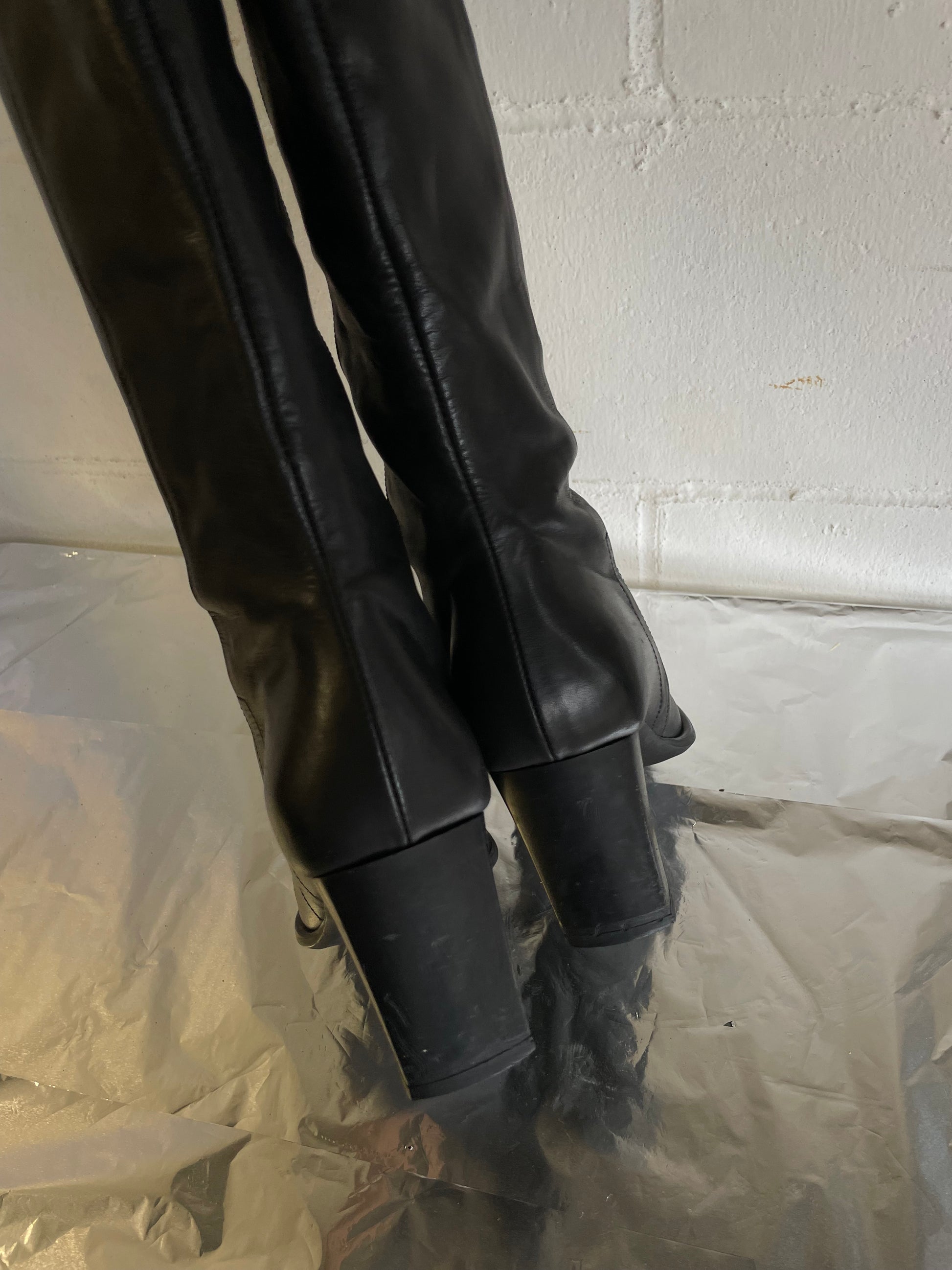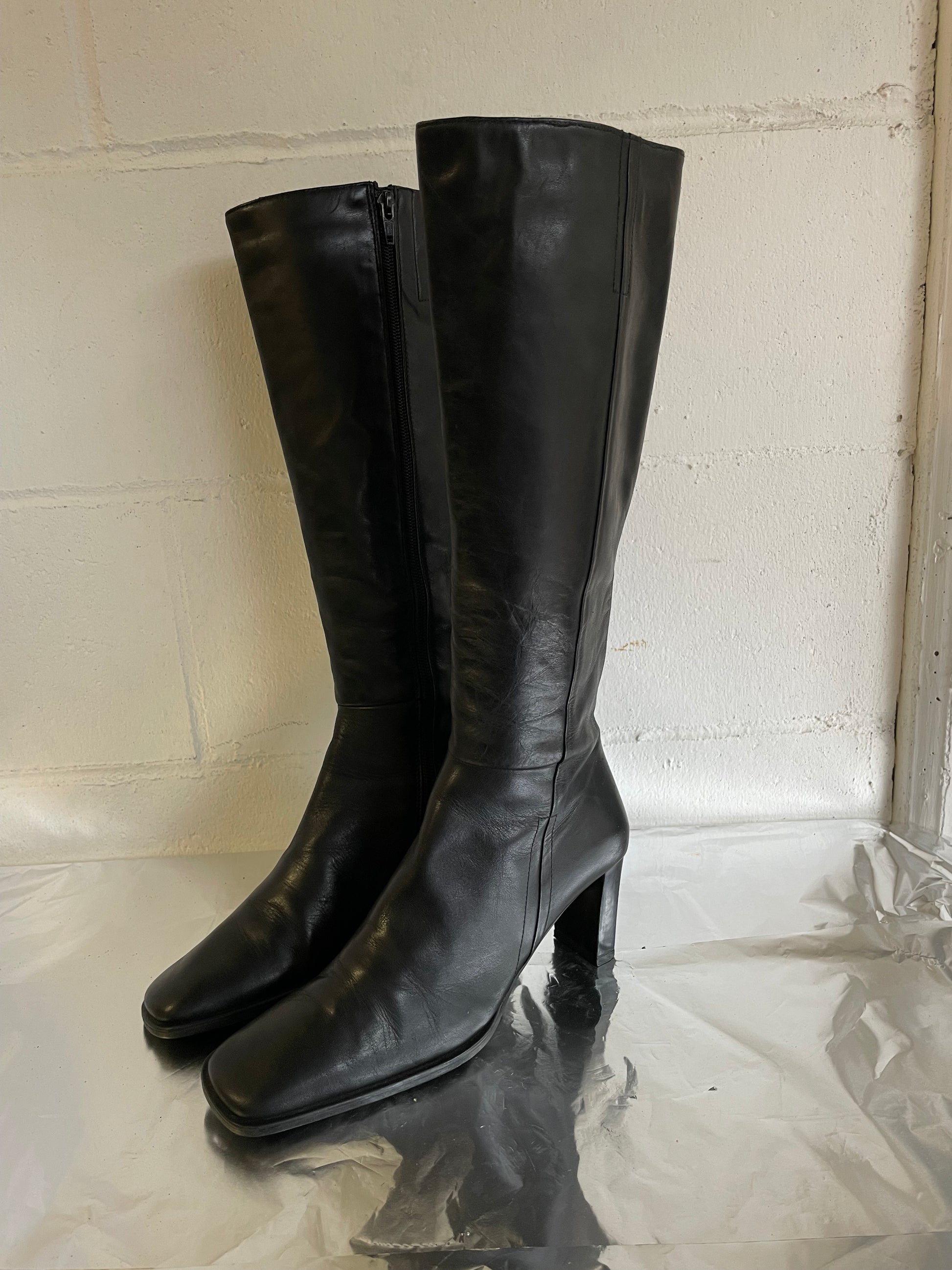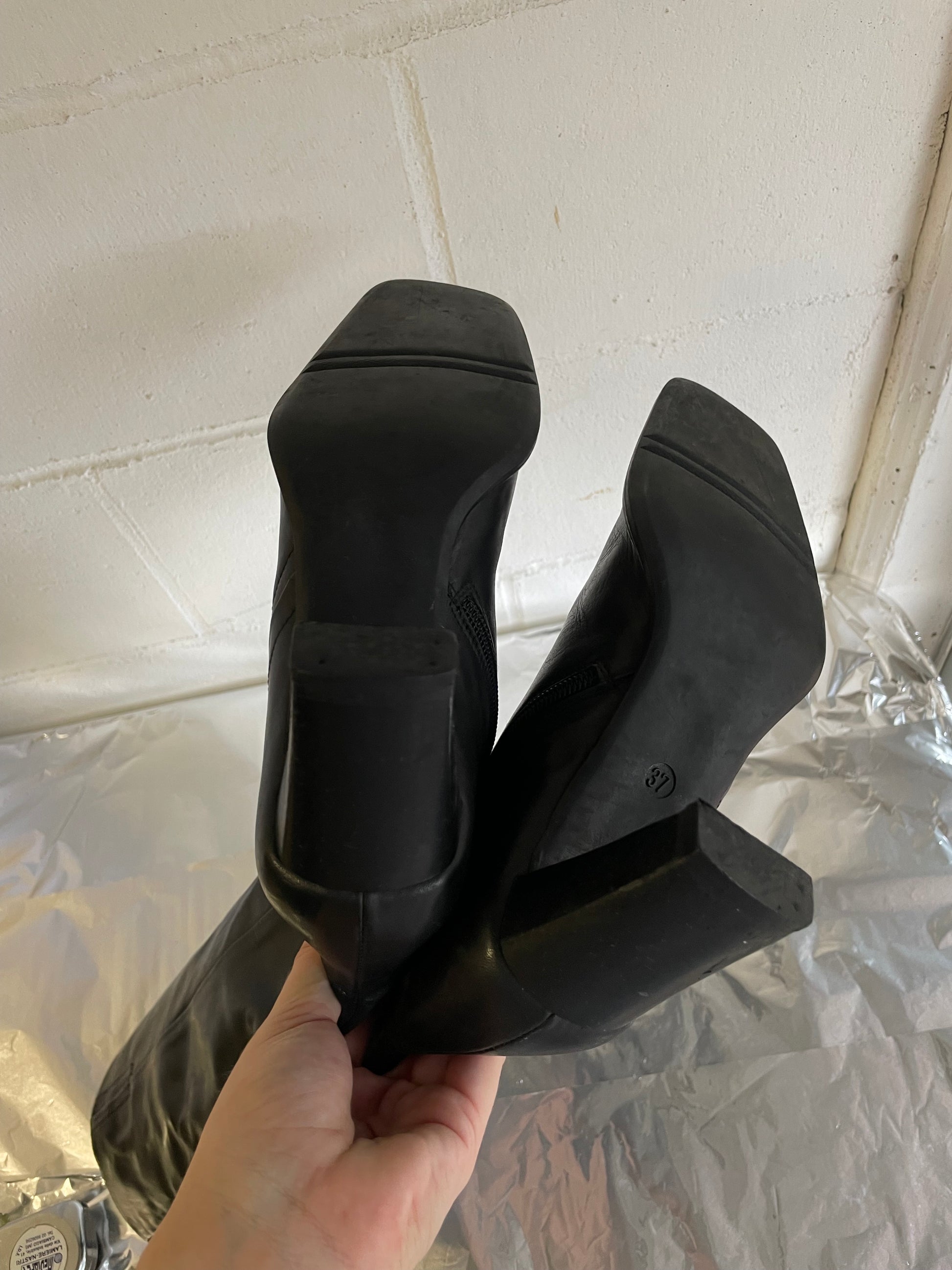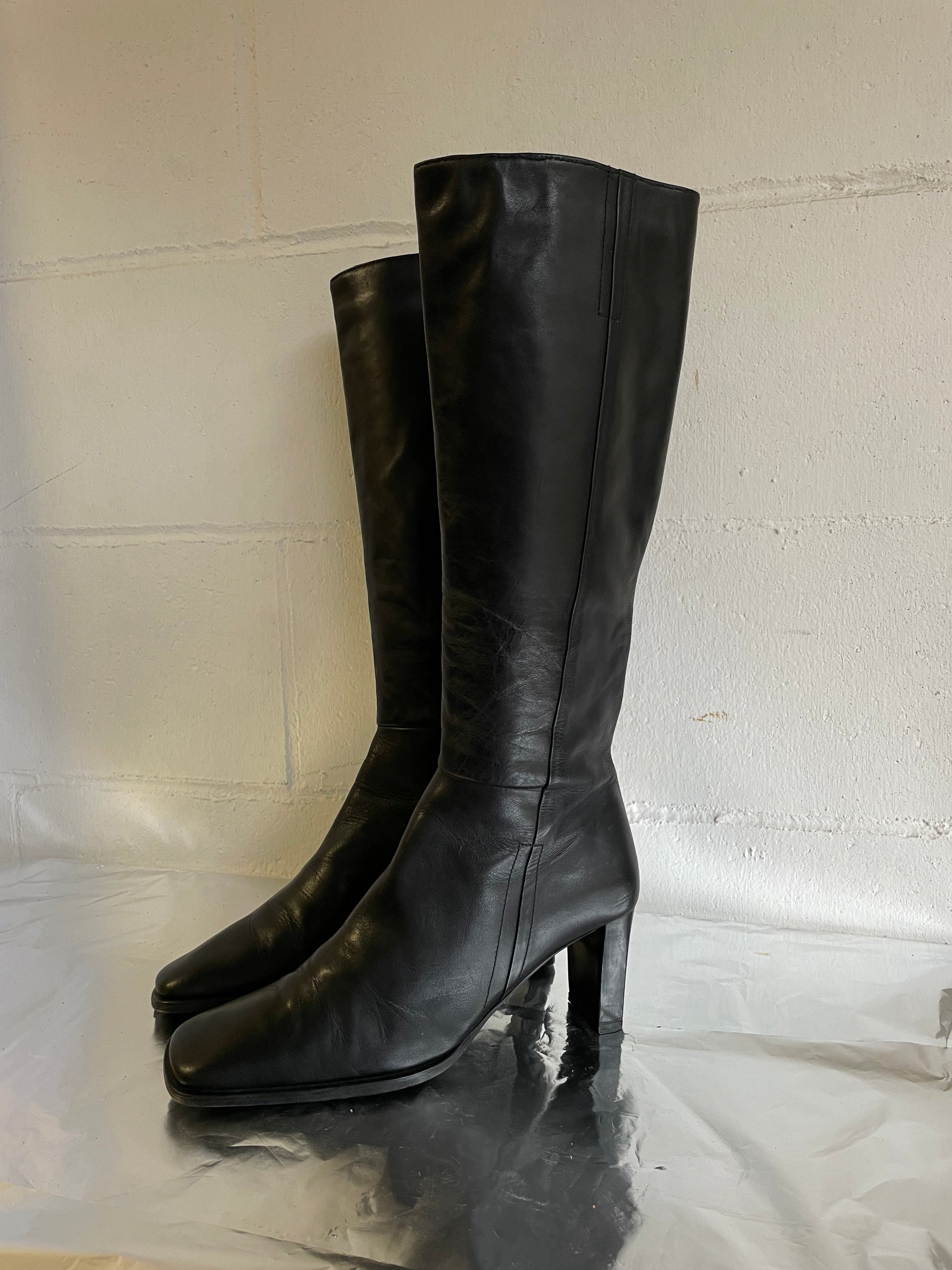 EU 37 - Stivale vintage vera pelle nero, punta quadrata e tacco grosso 7cm