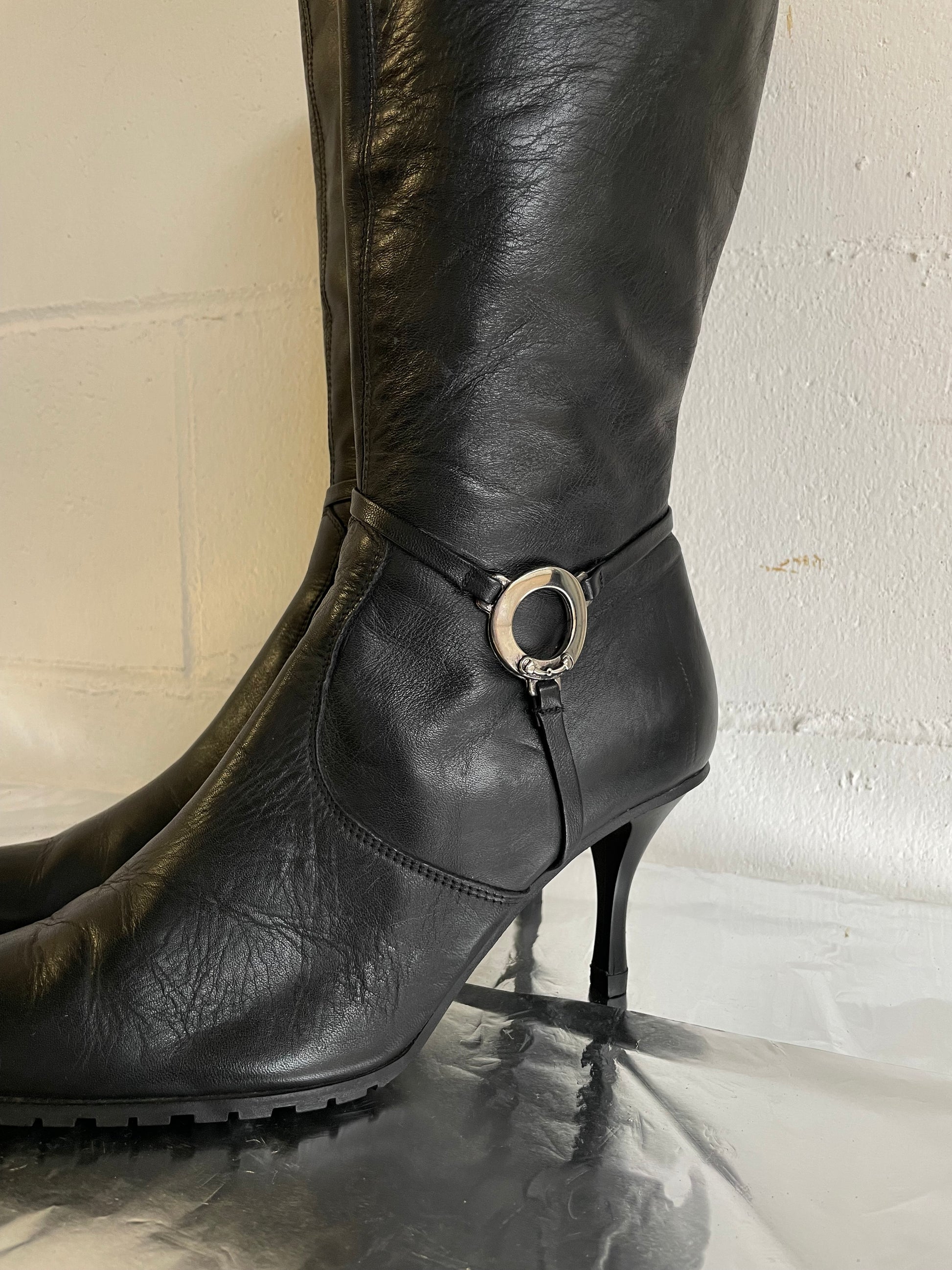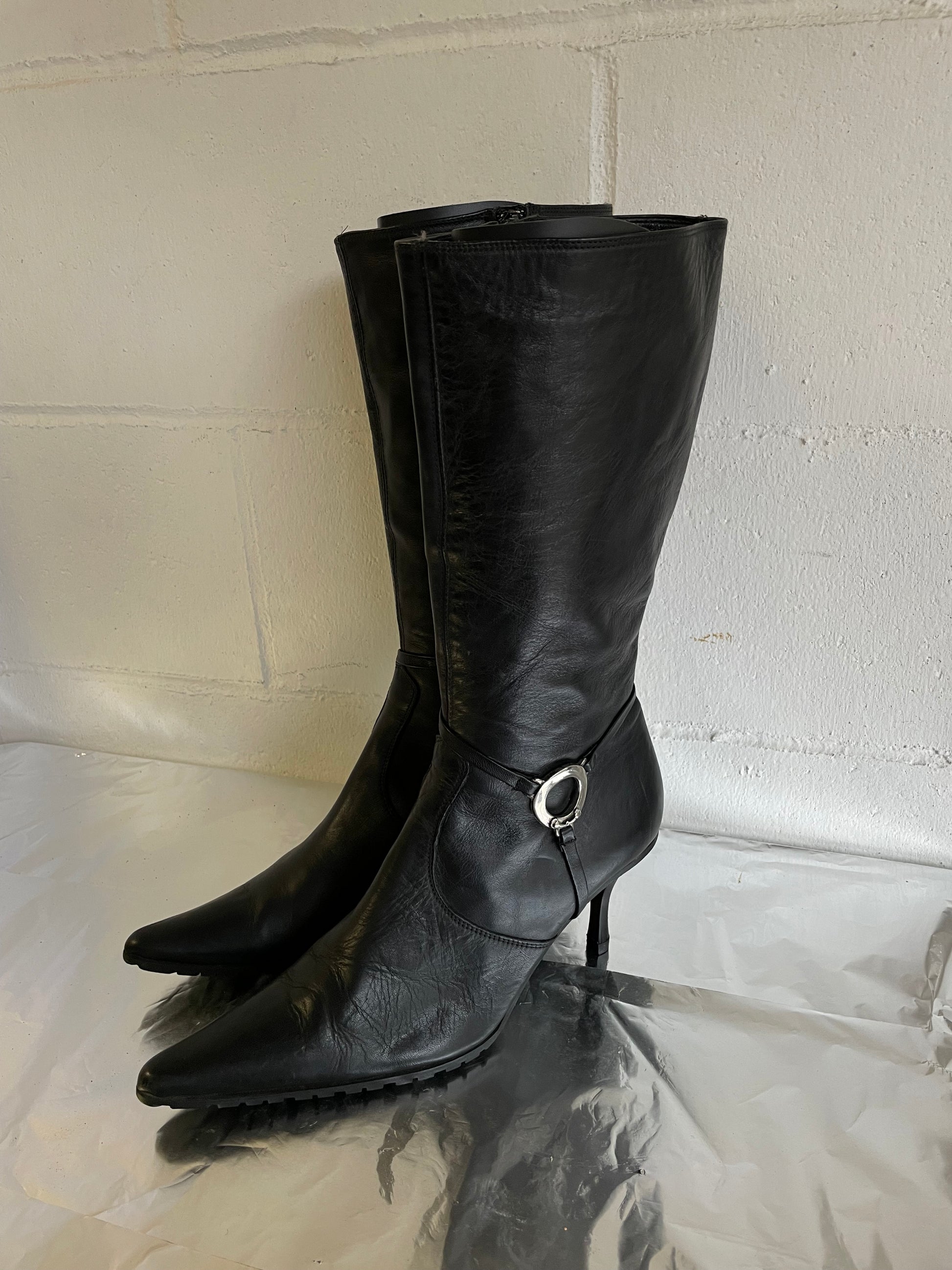 EU 39 - Stivale vintage vera pelle nero a punta, tacco 8cm