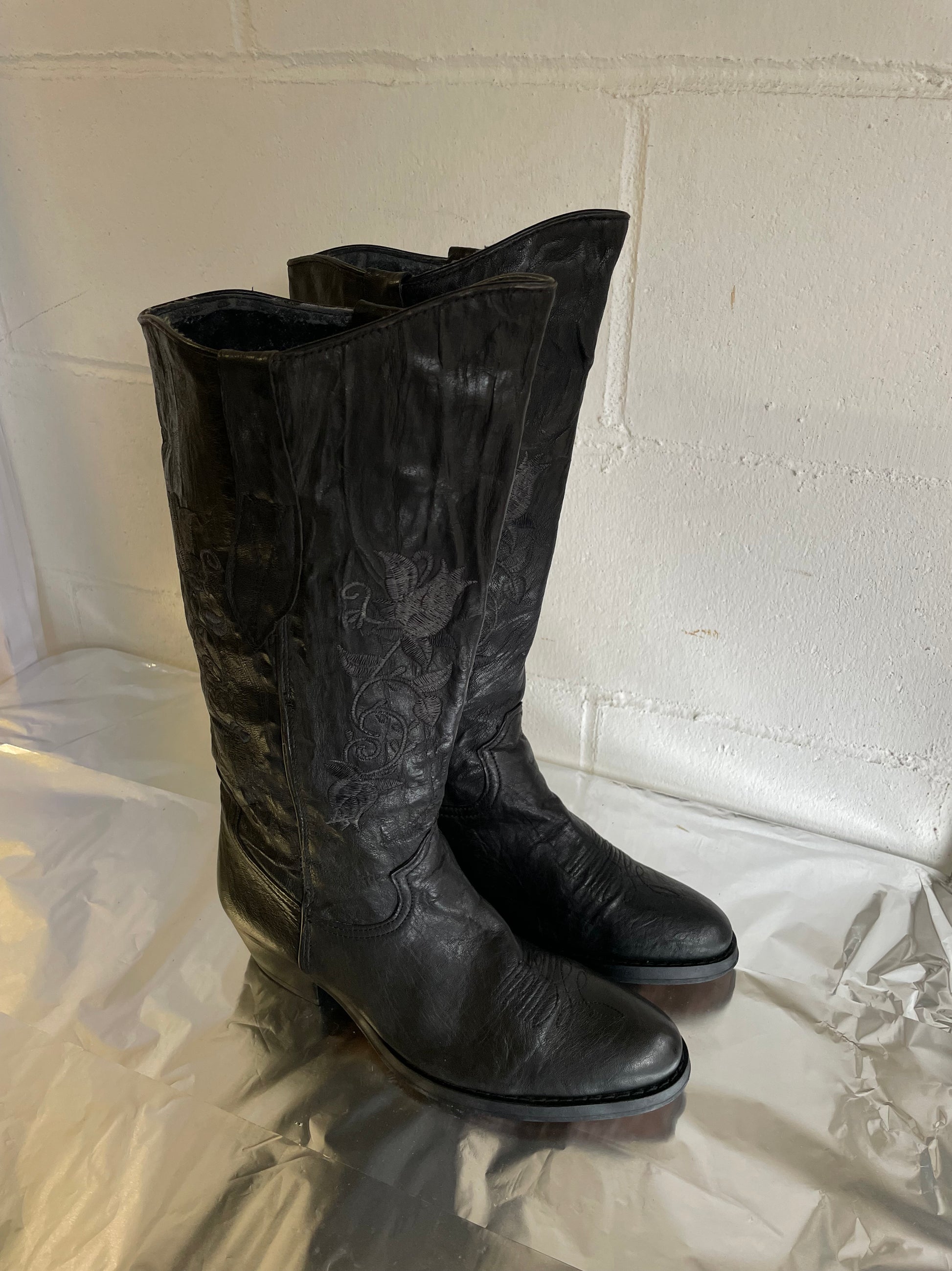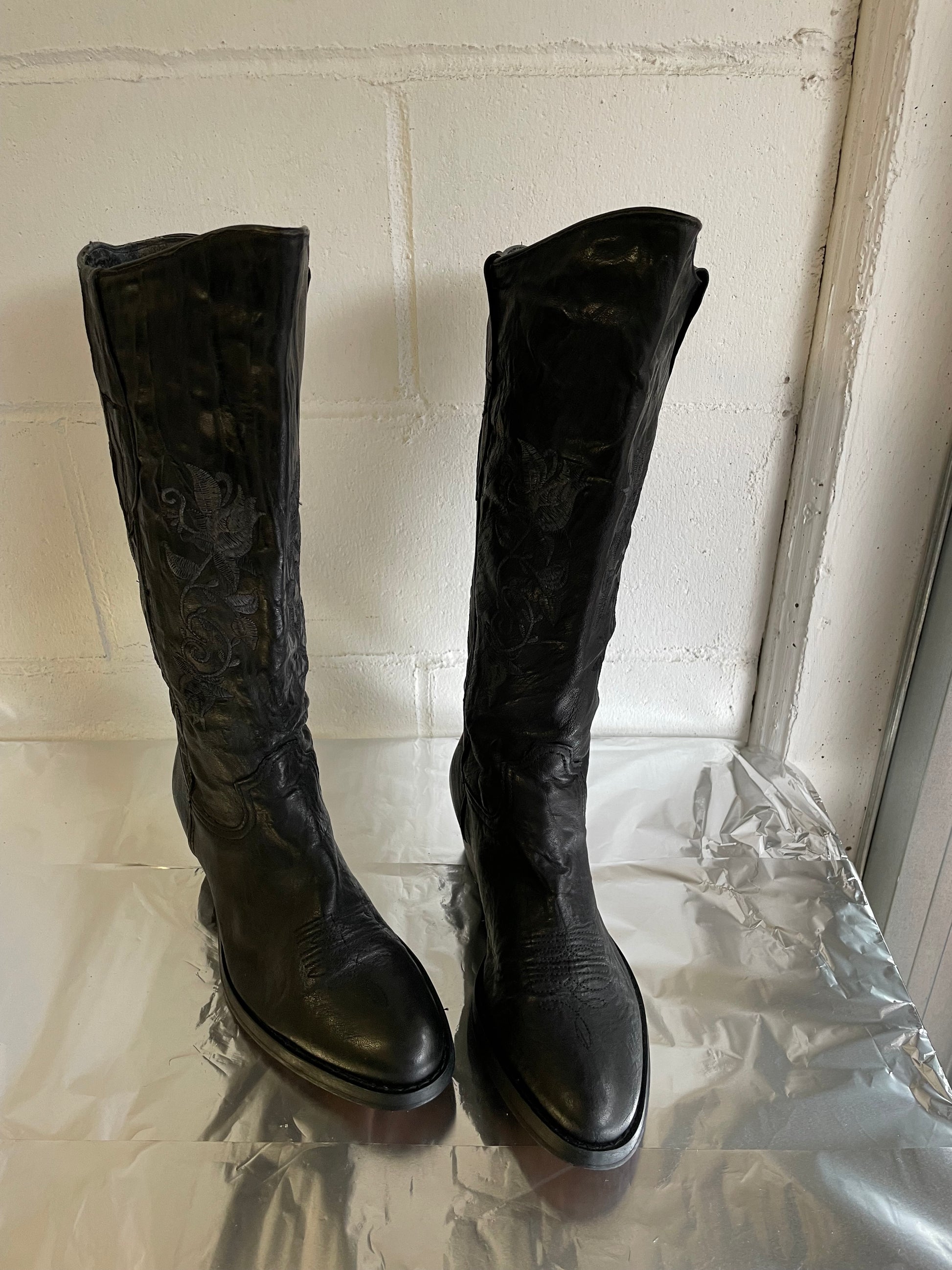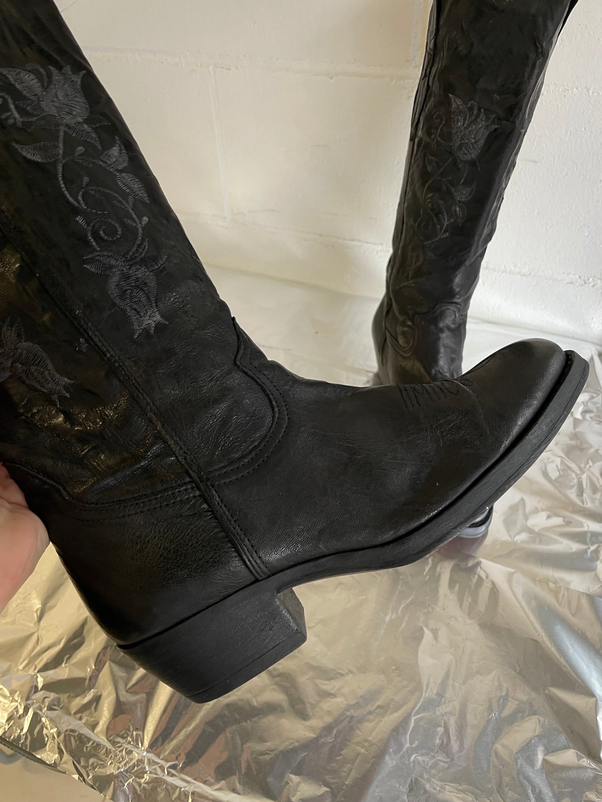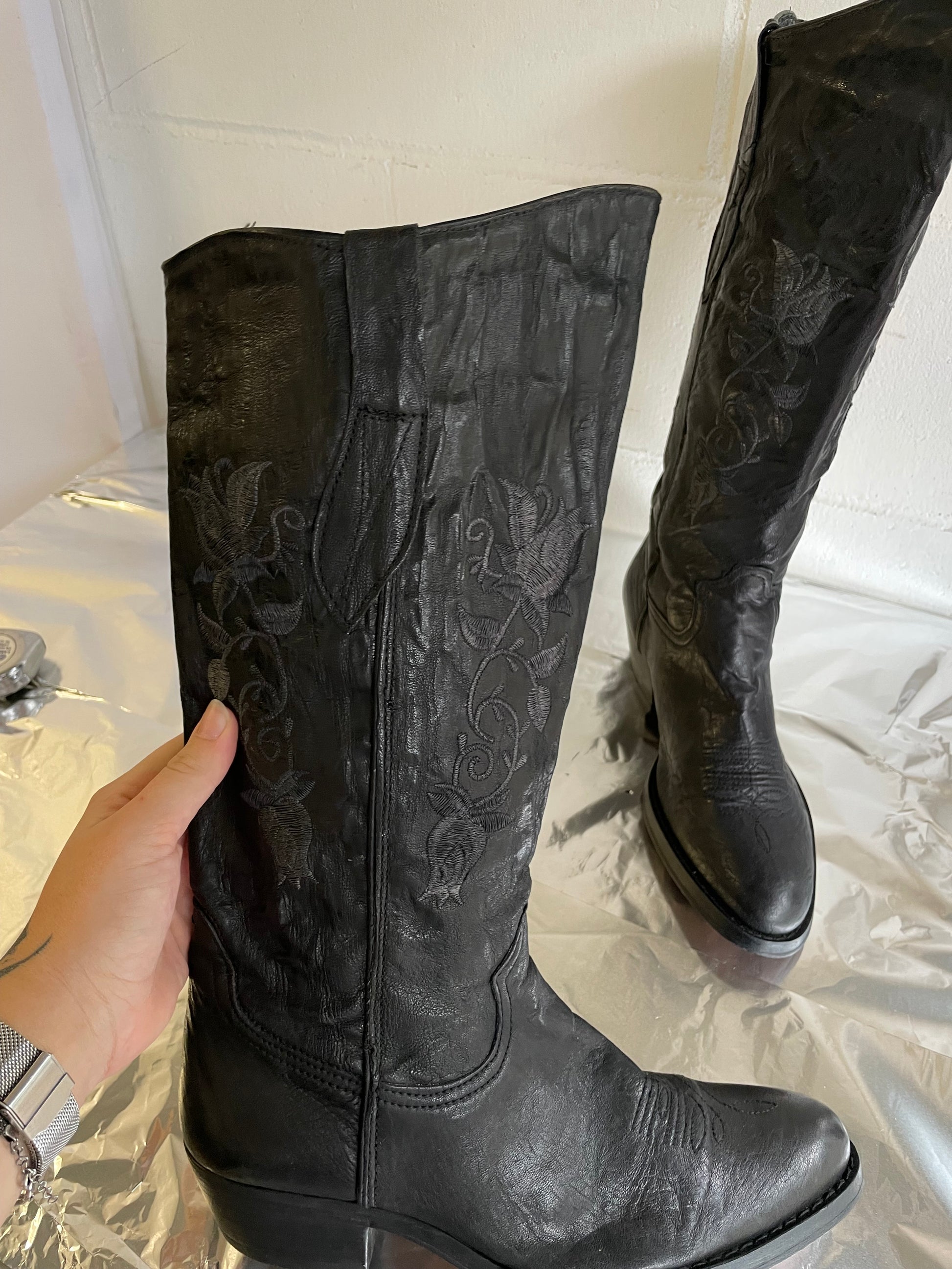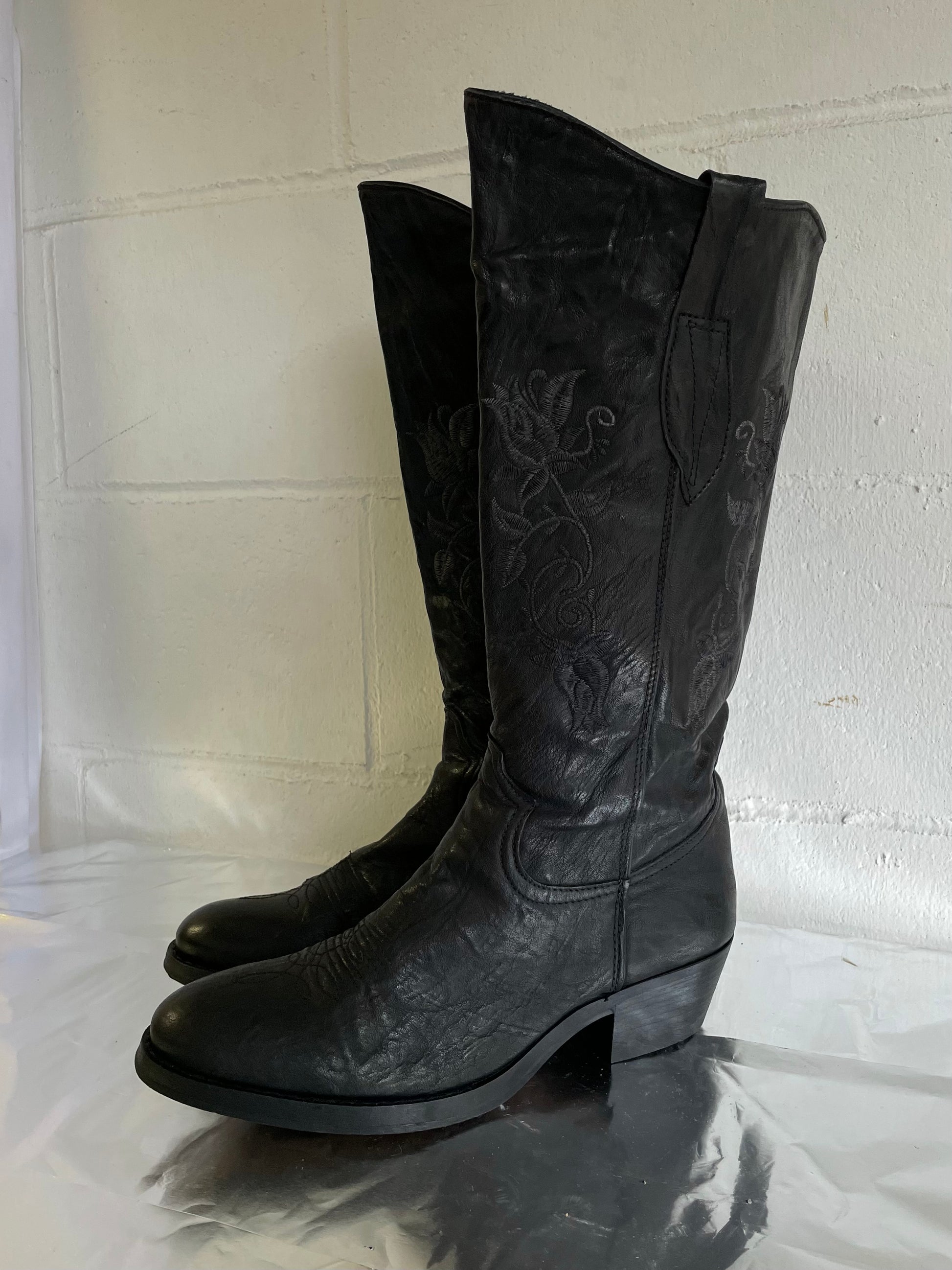 Texani vintage vera pelle neri, tacco basso, punta stondata e lavorazioni con ricami.