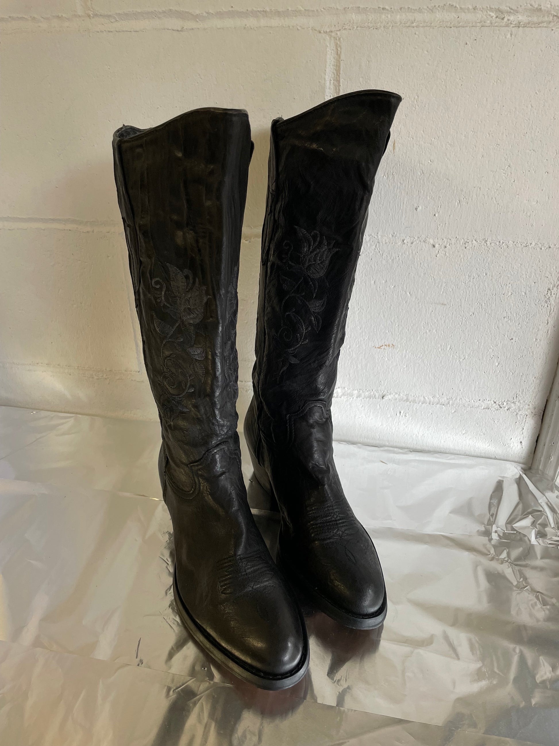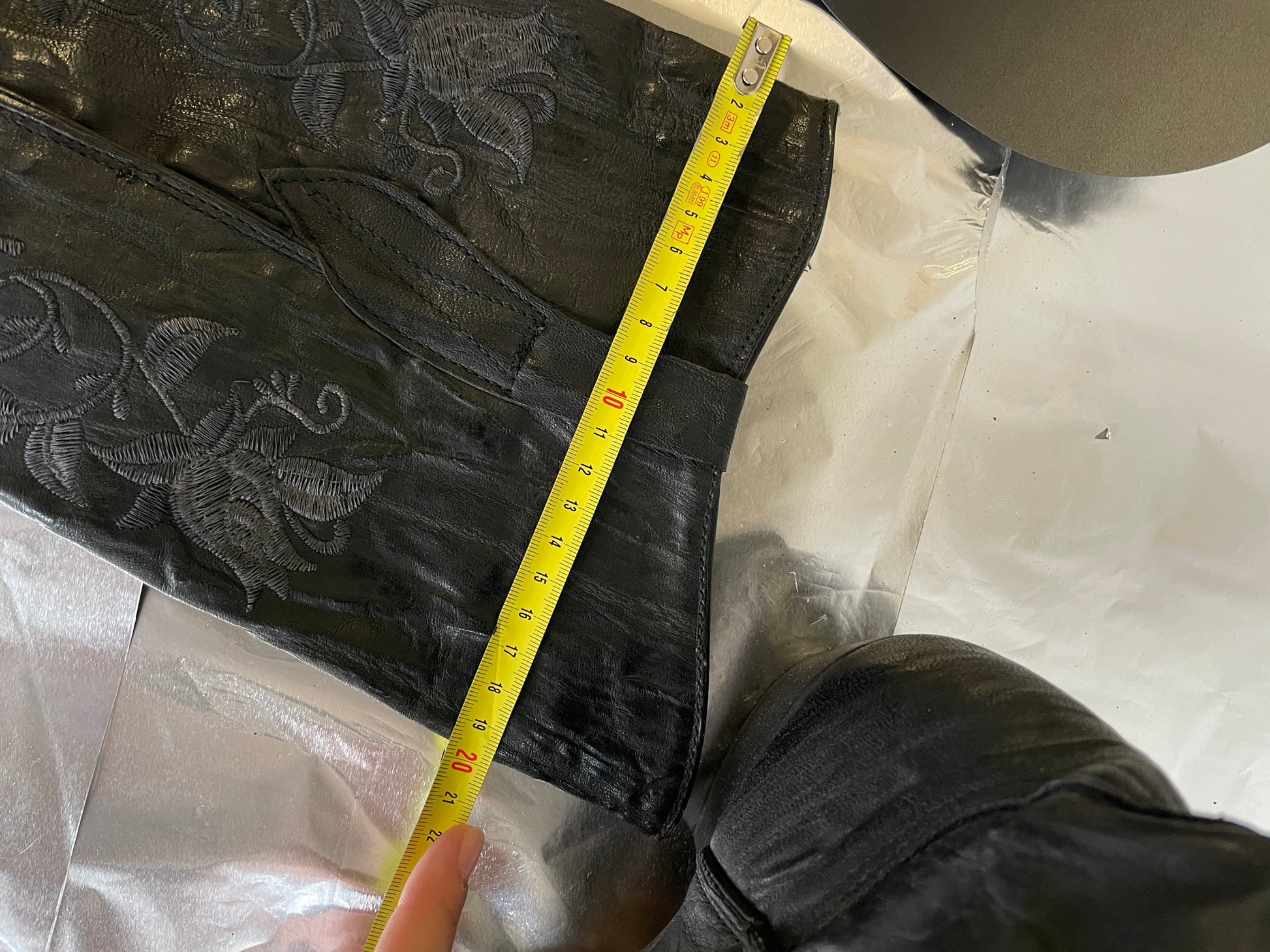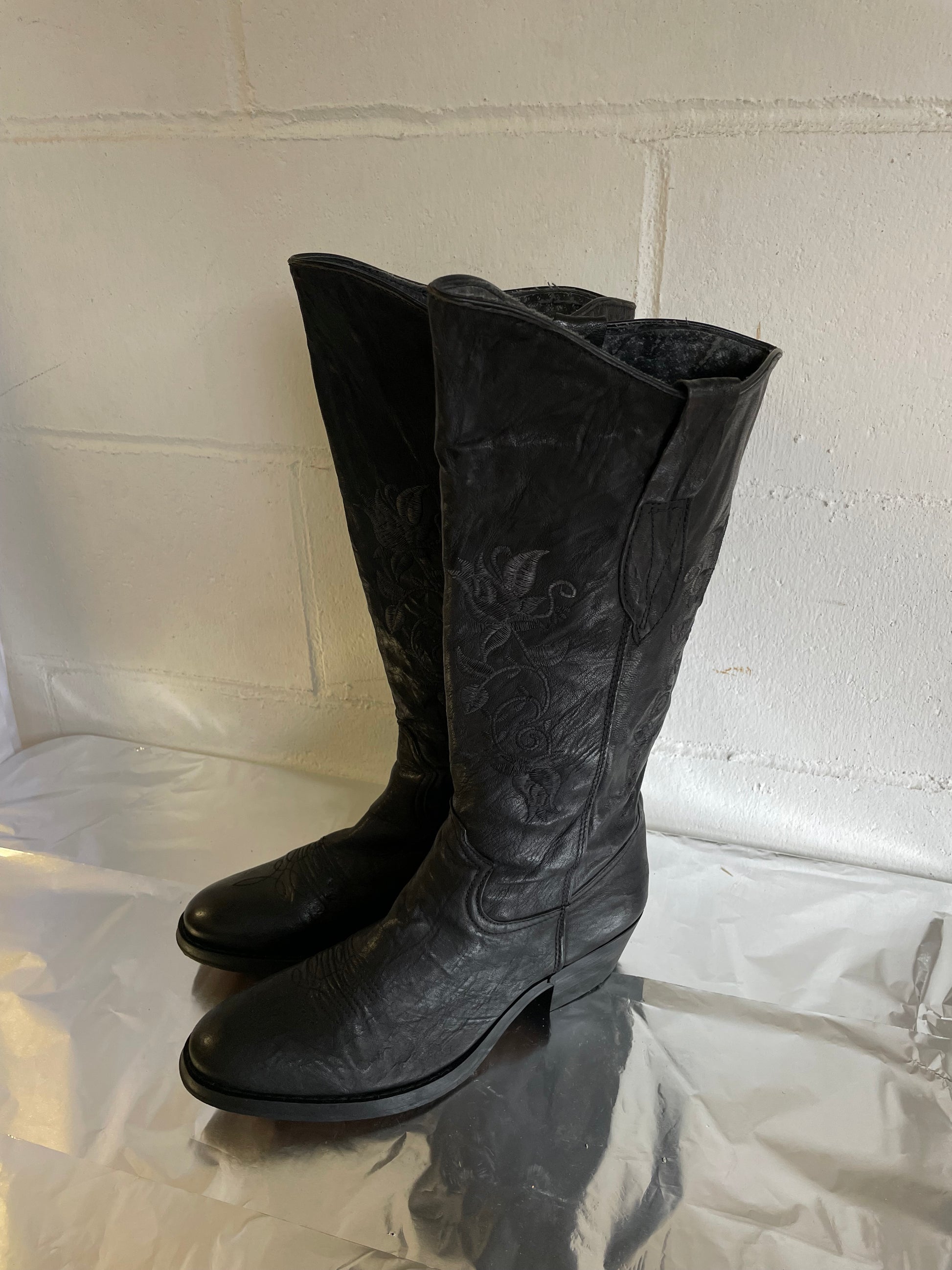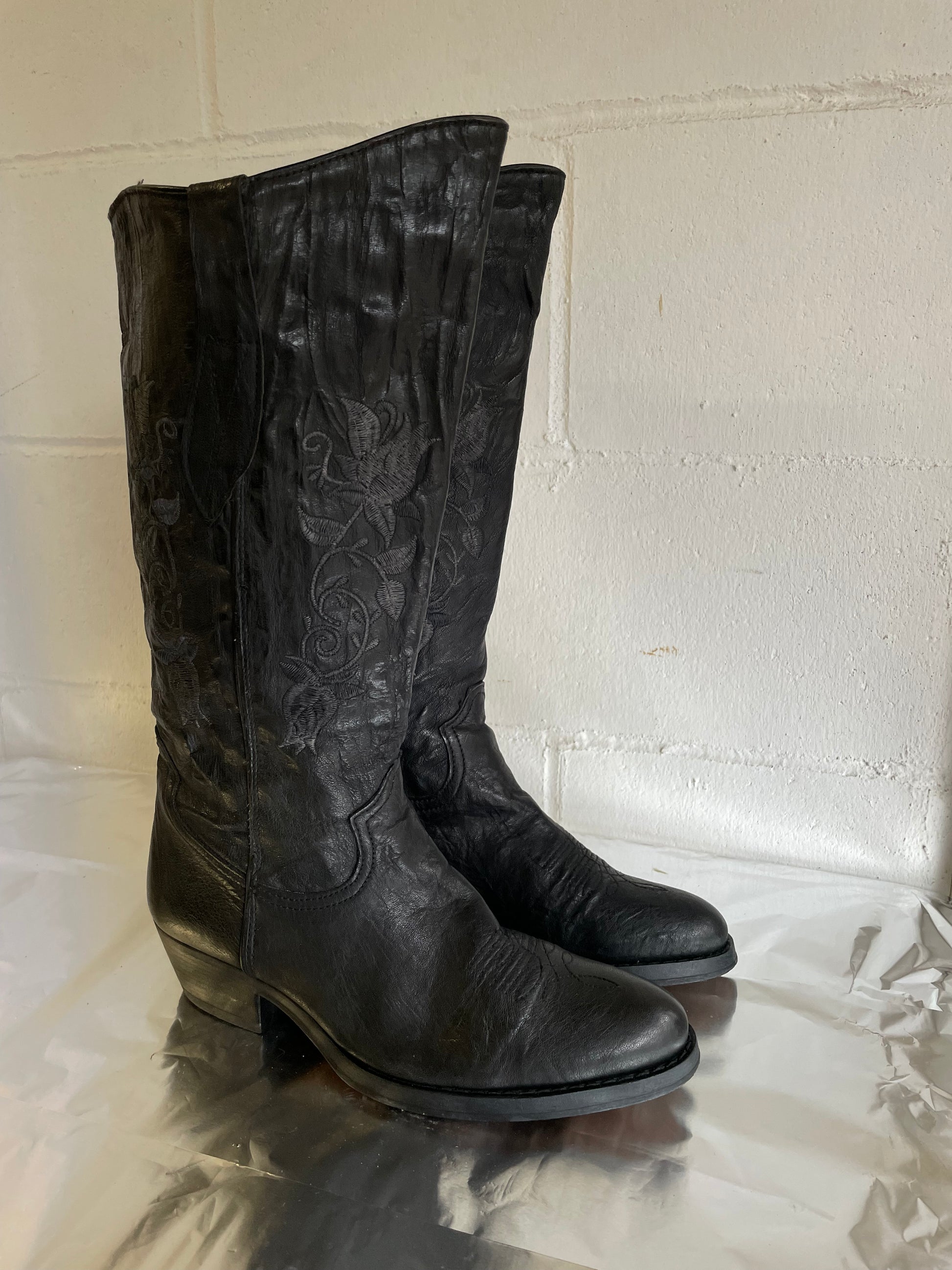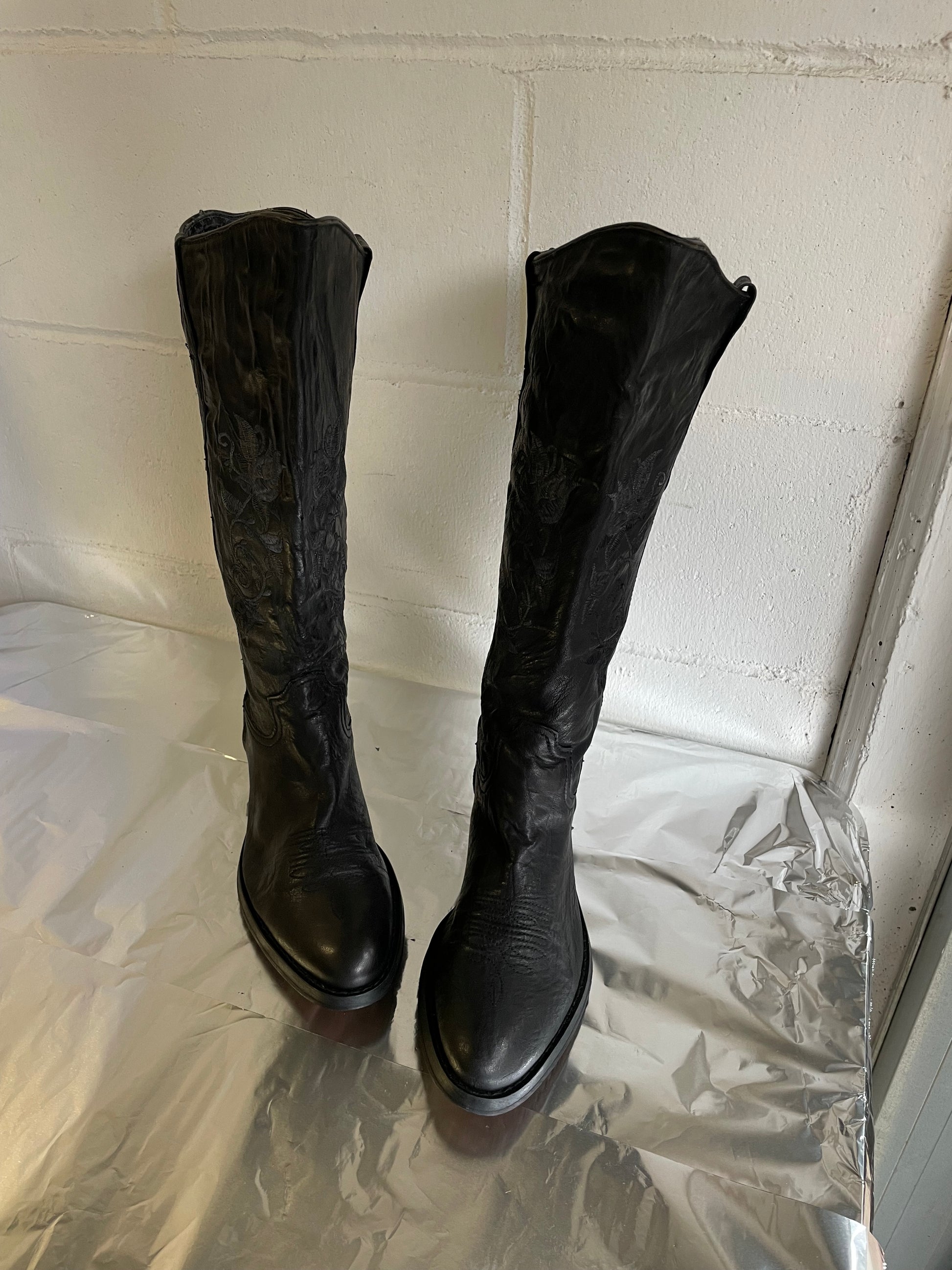 Texani vintage vera pelle neri, tacco basso, punta stondata e lavorazioni con ricami.