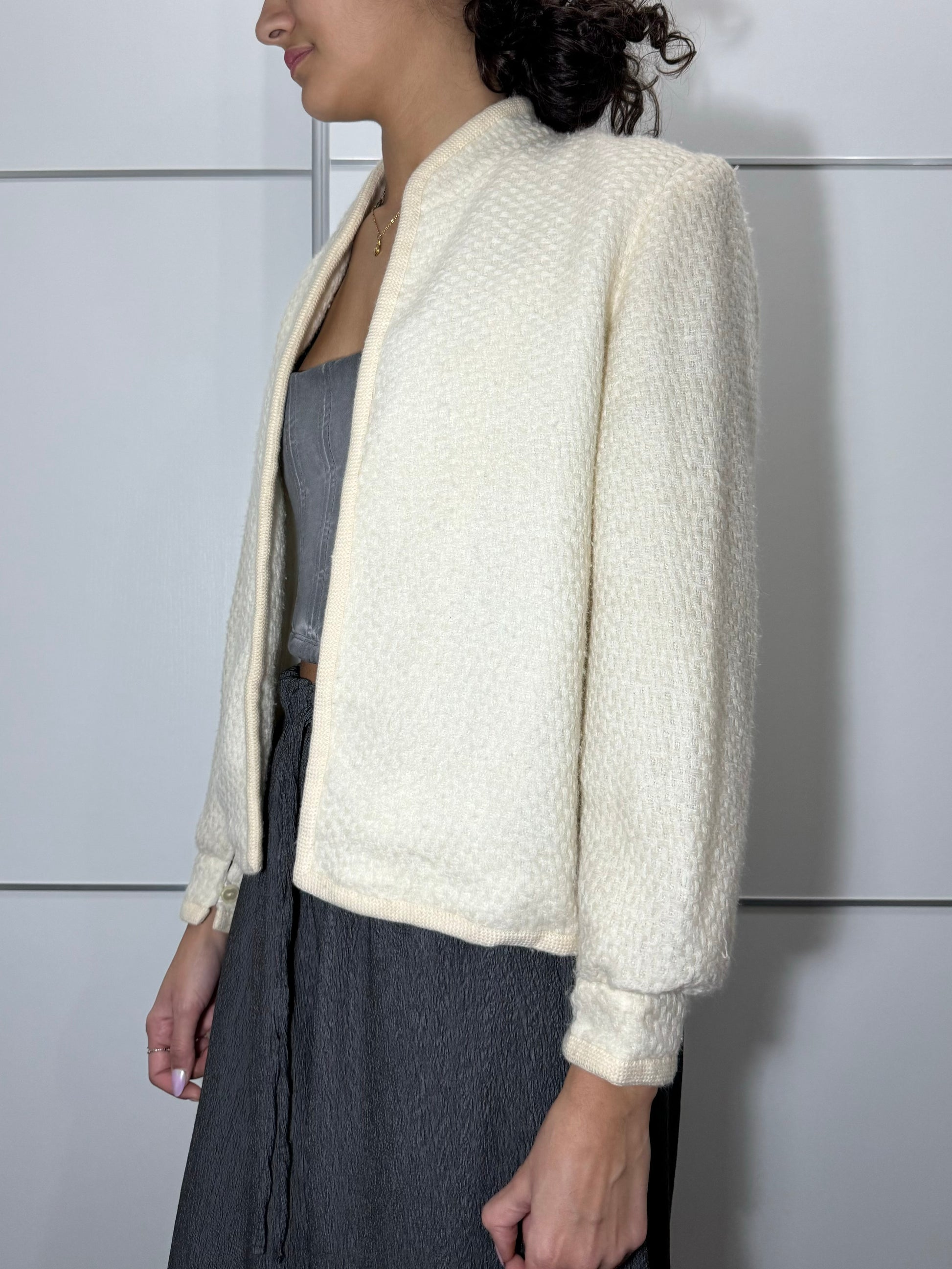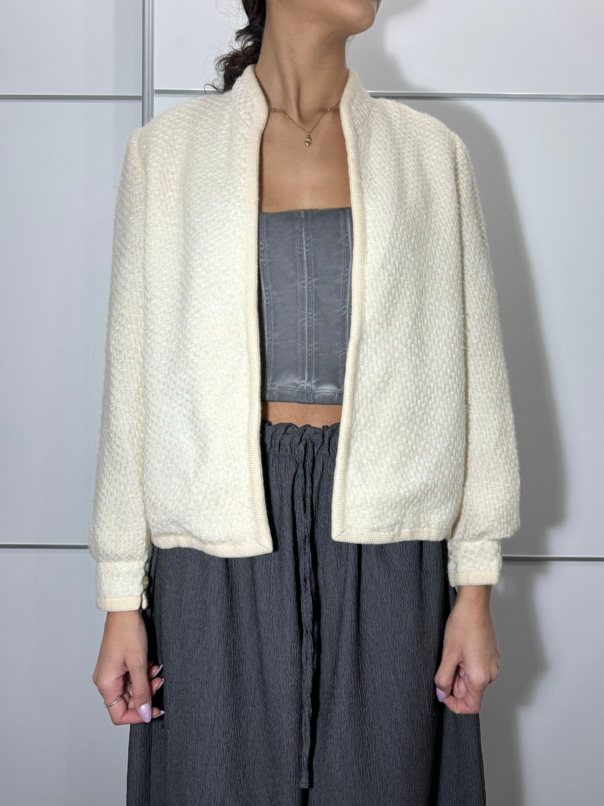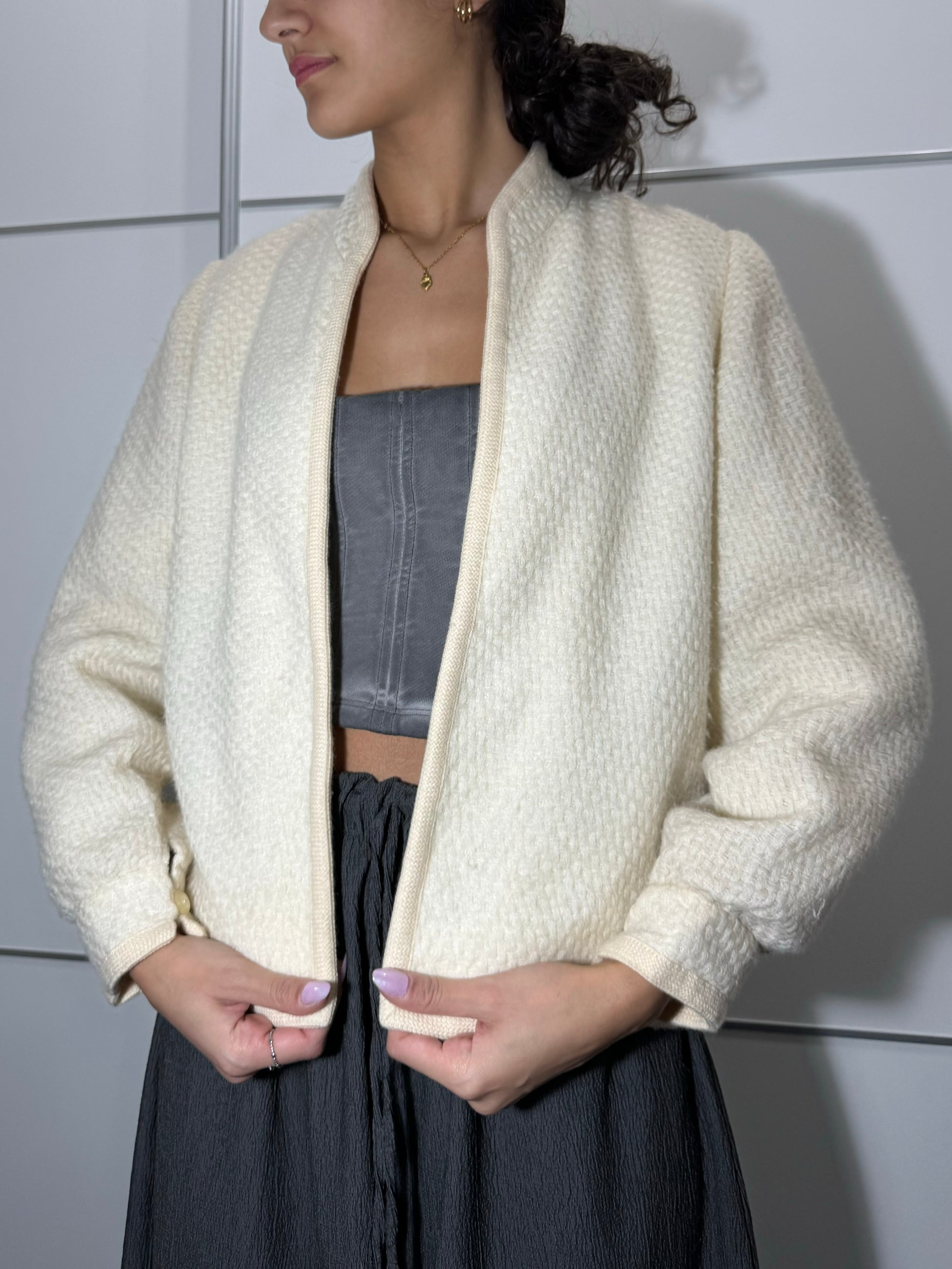 Giacchina bolero color burro lavorata e con bordino strutturato.