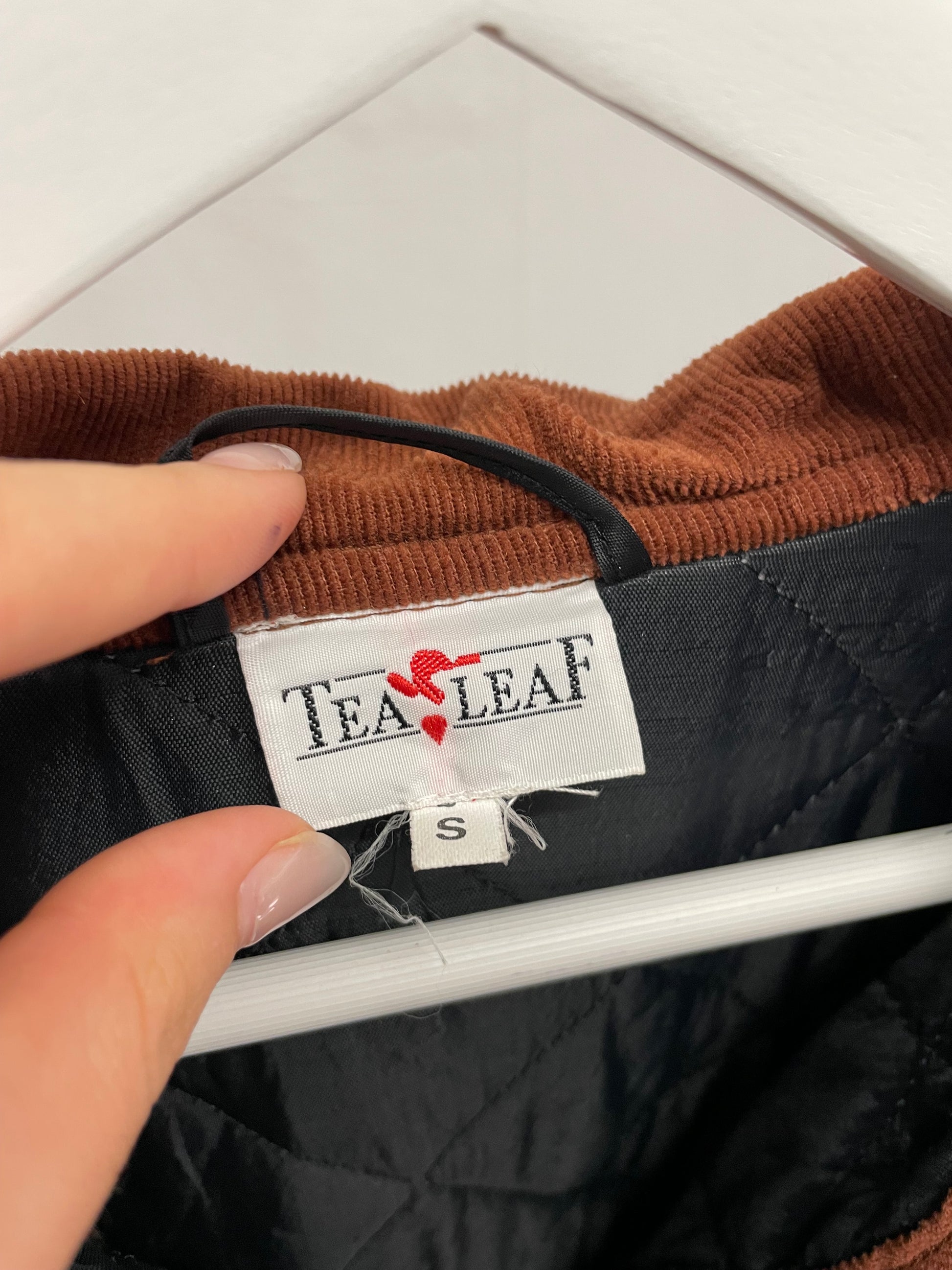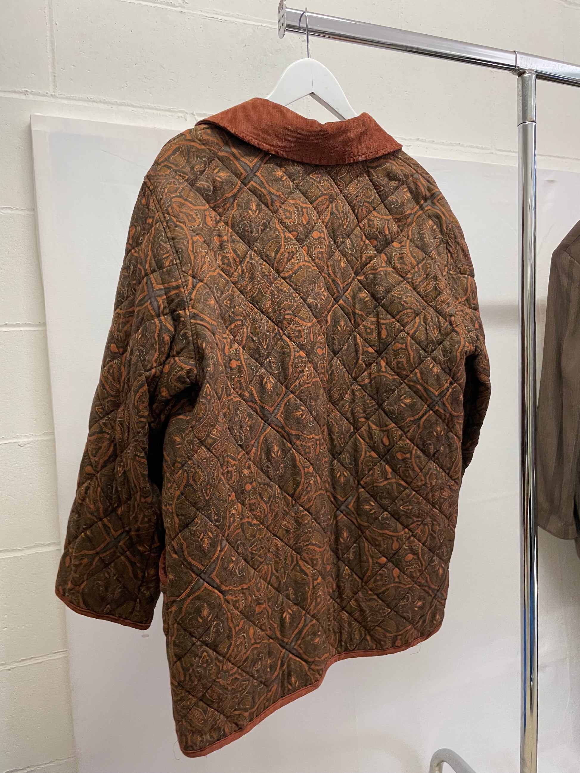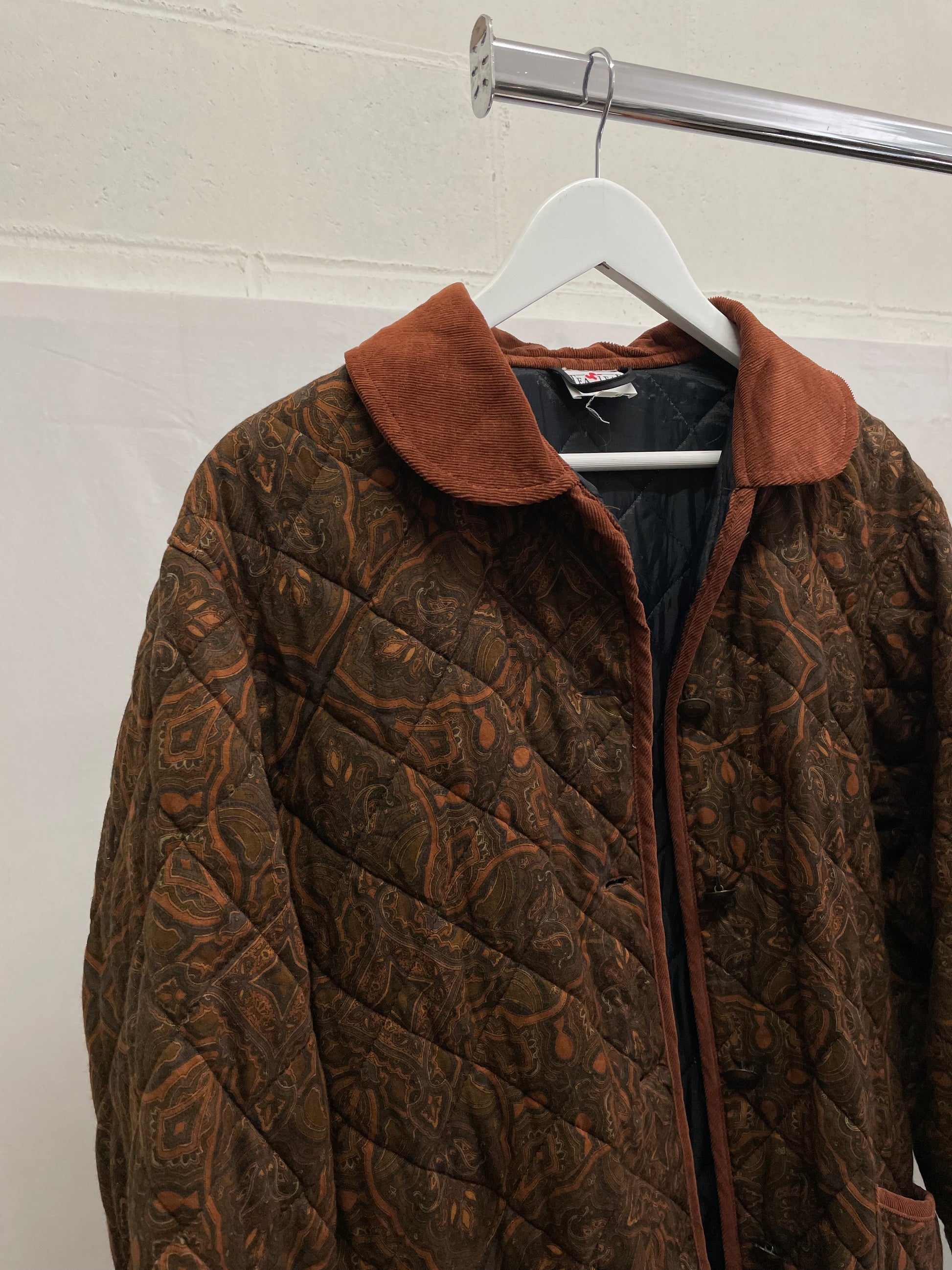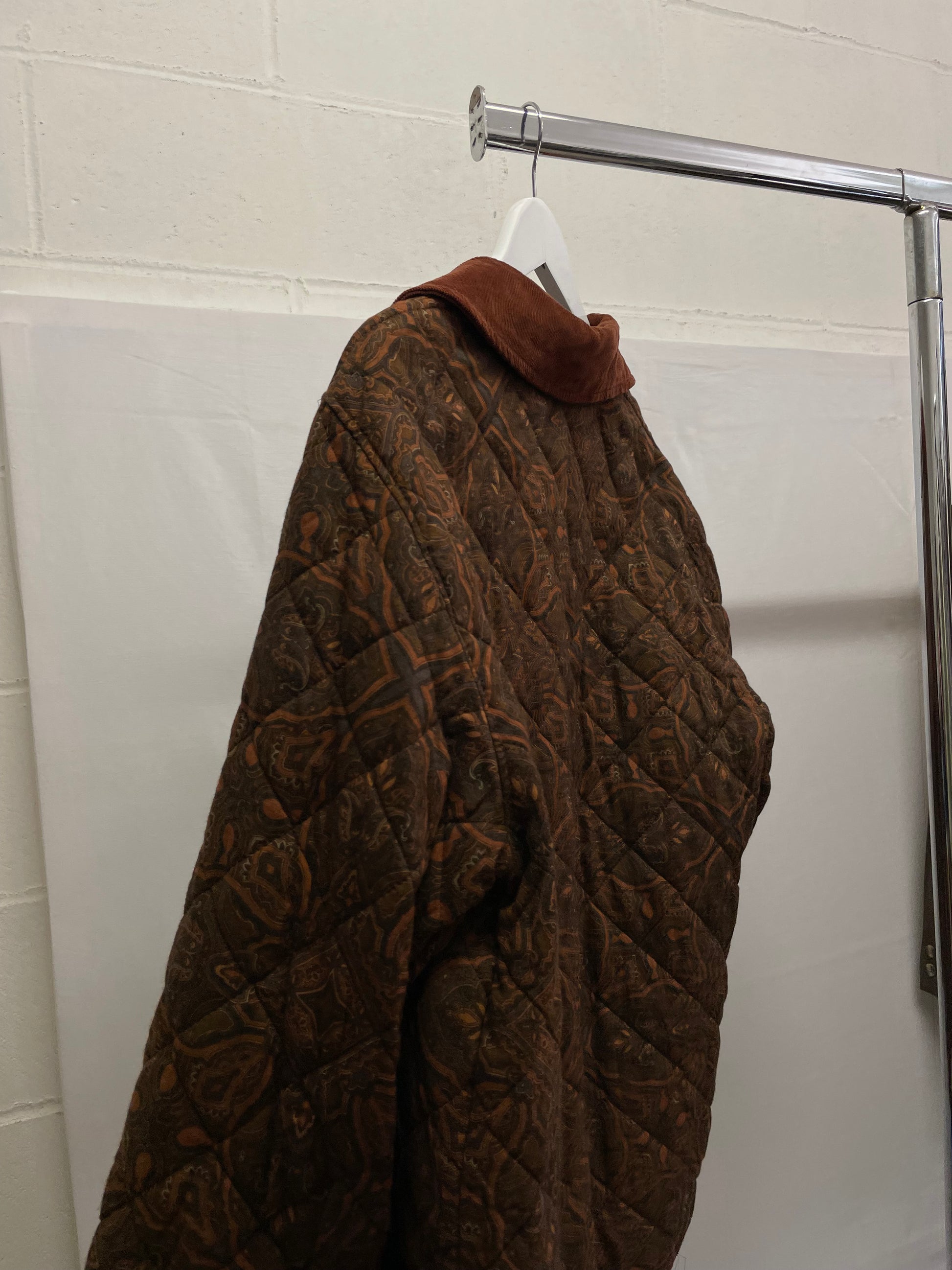 Giacca husky trapuntata leggera pattern paisley cioccolato, con colletto e bordini in velluto e bottoni in metallo.