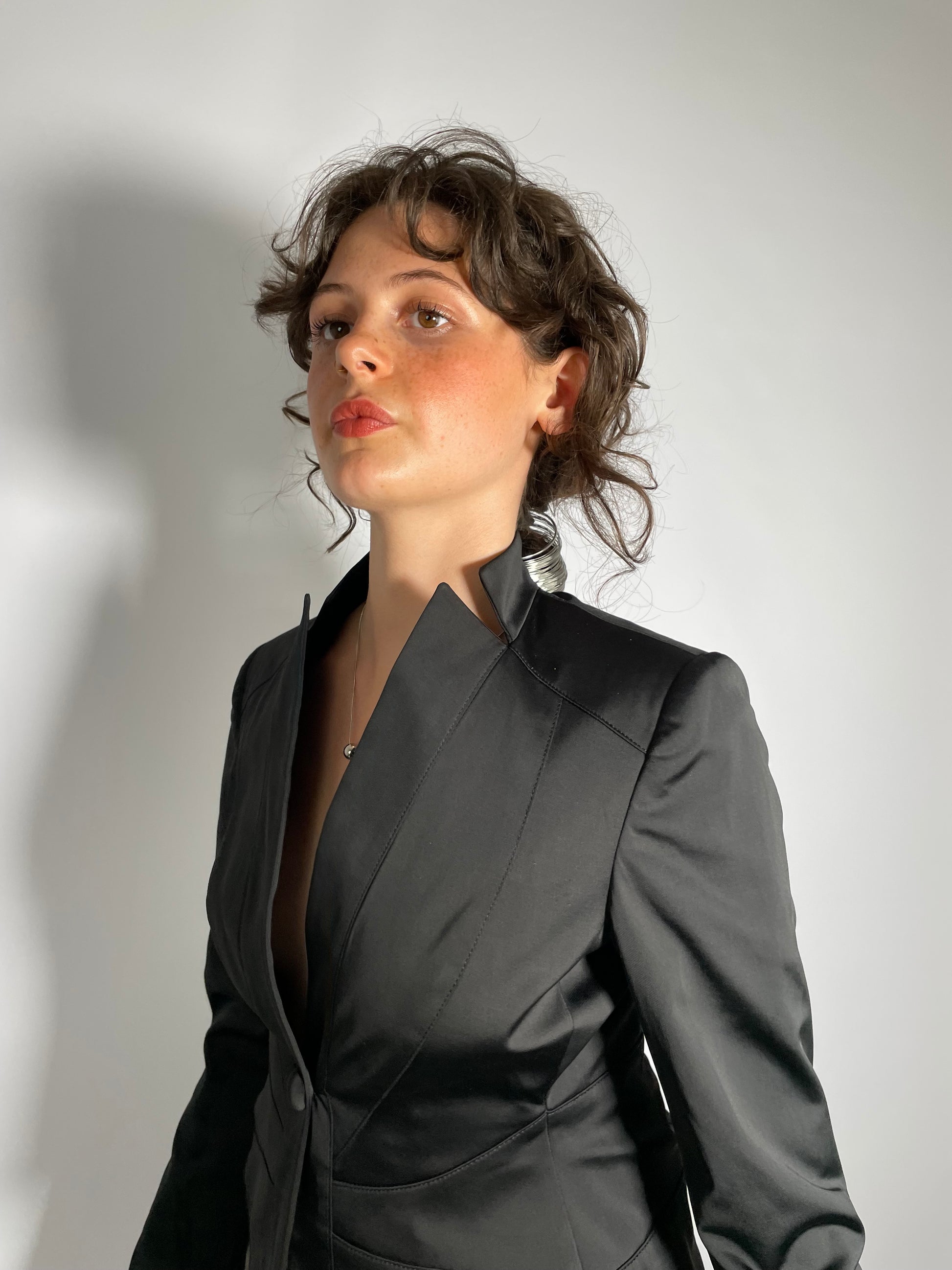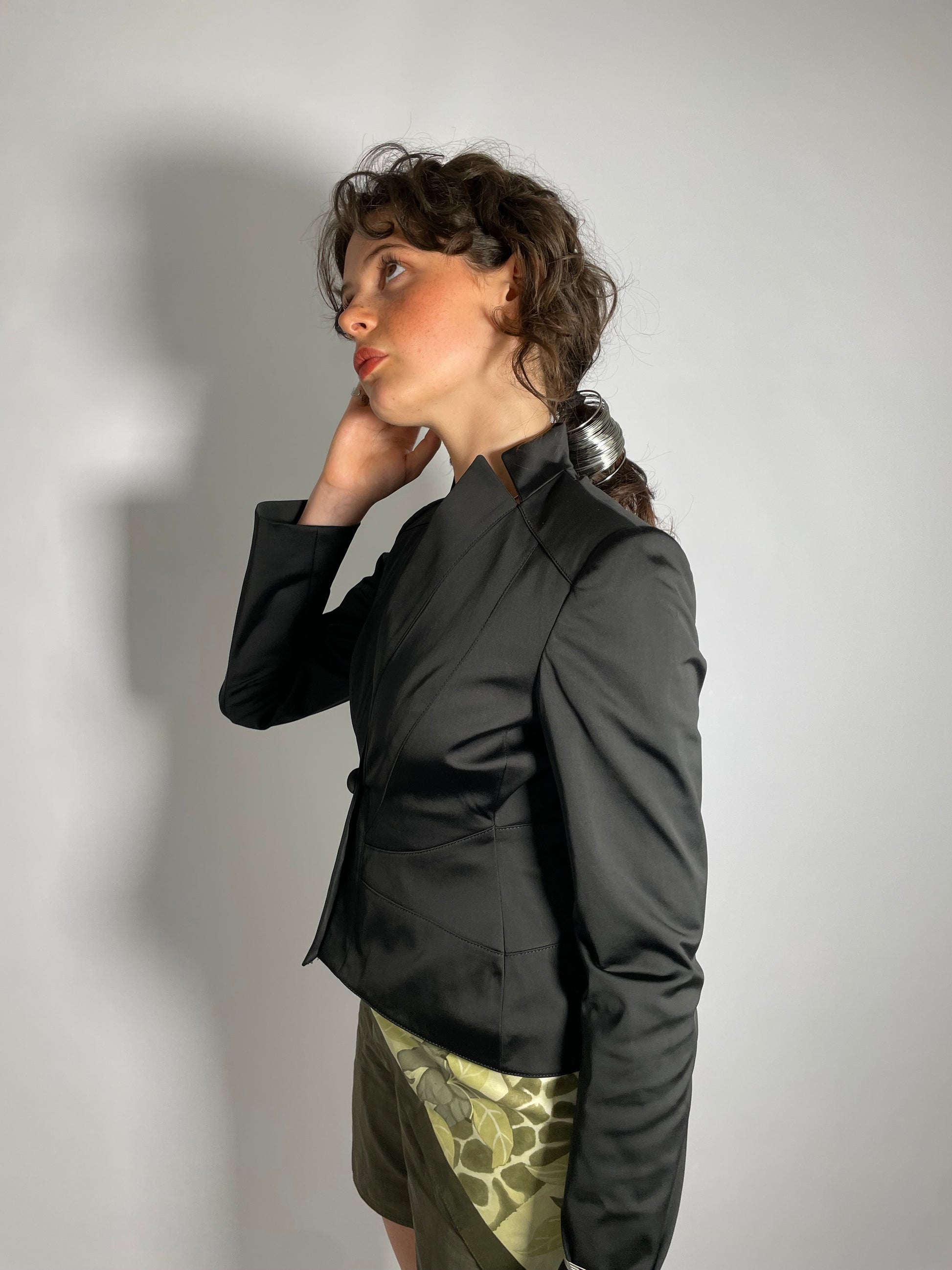 Chiusura frontale con un bottone, focus sul punto vita, colletto dal taglio quasi futuristico🤩 un pezzo davvero iconico!