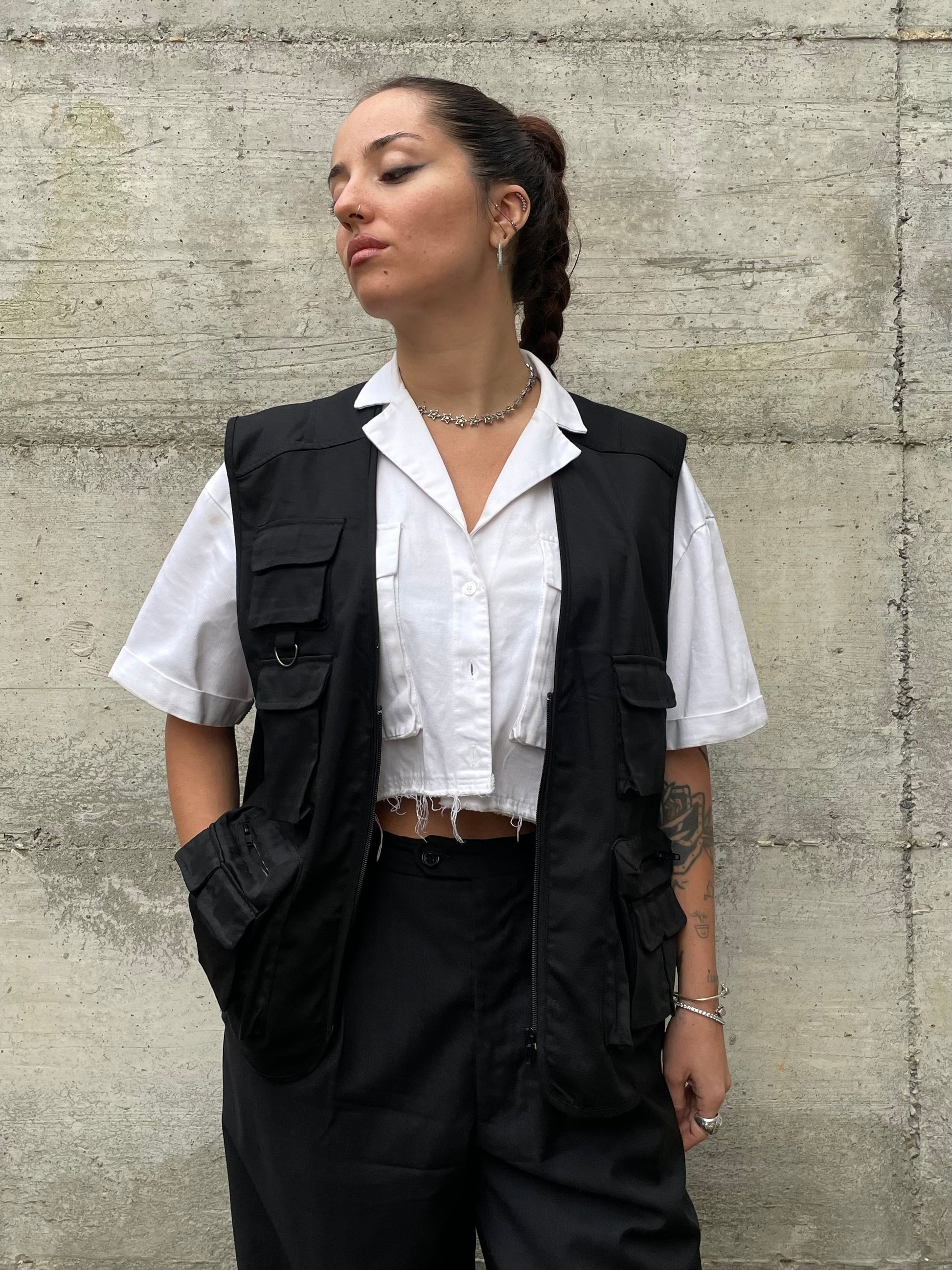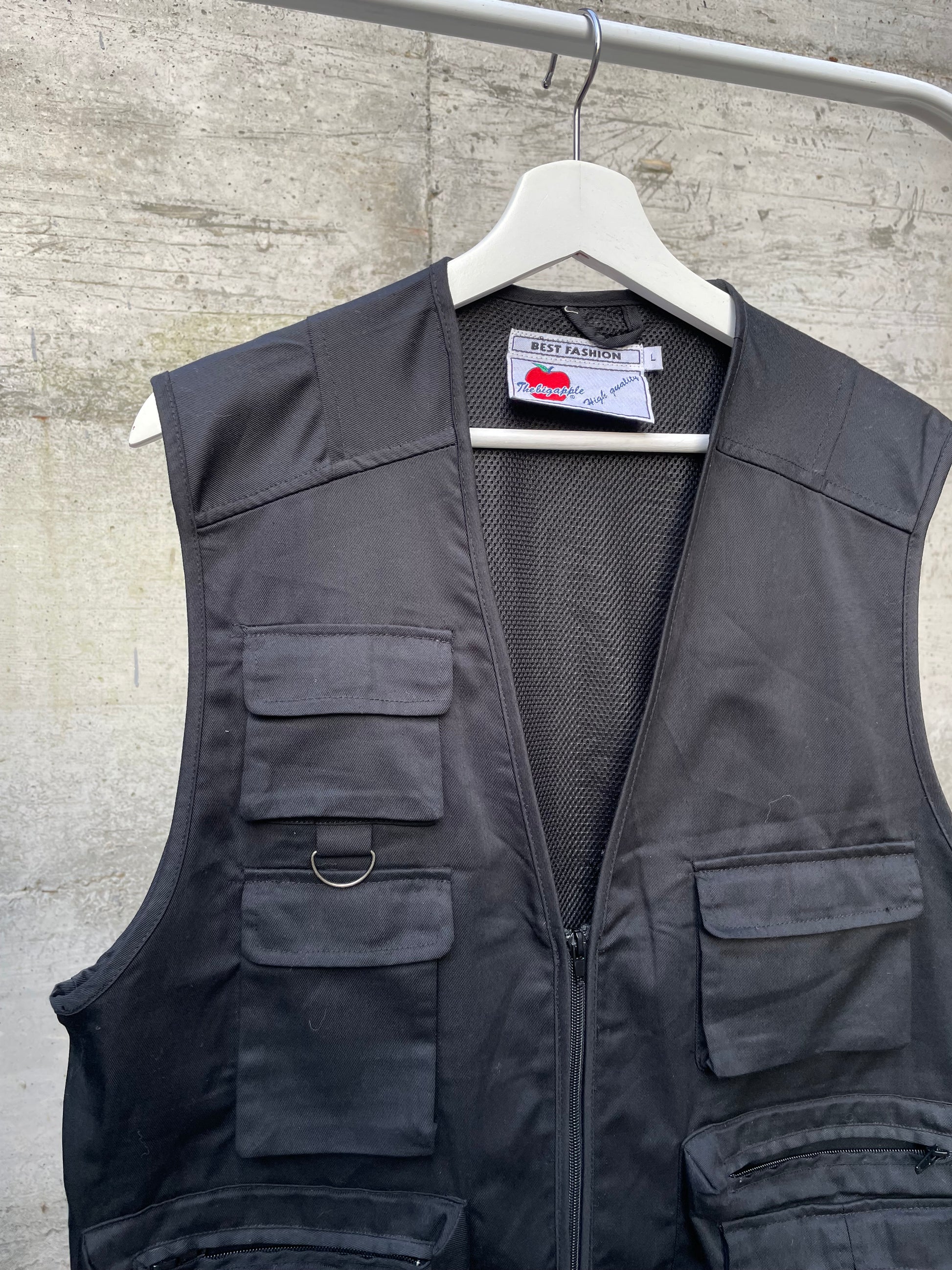 Gilet cargo nero multitasche, in misto poly e cotone.