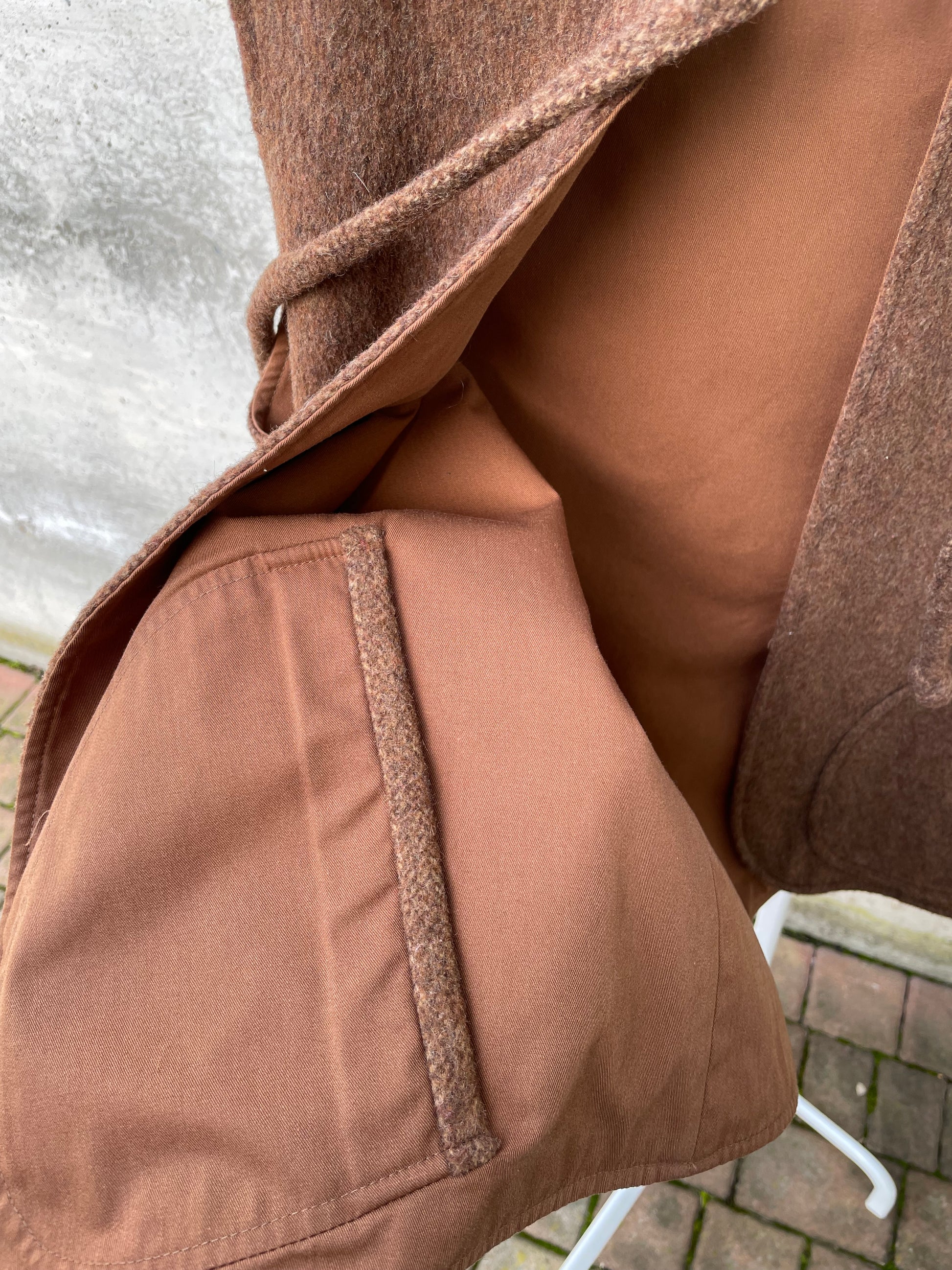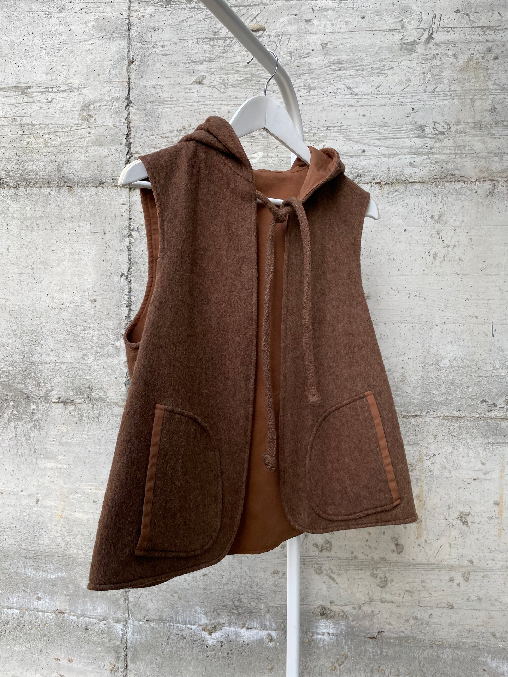 Gilet double face sartoriale con cappuccio, tasche e cordini frontali per allacciarlo.