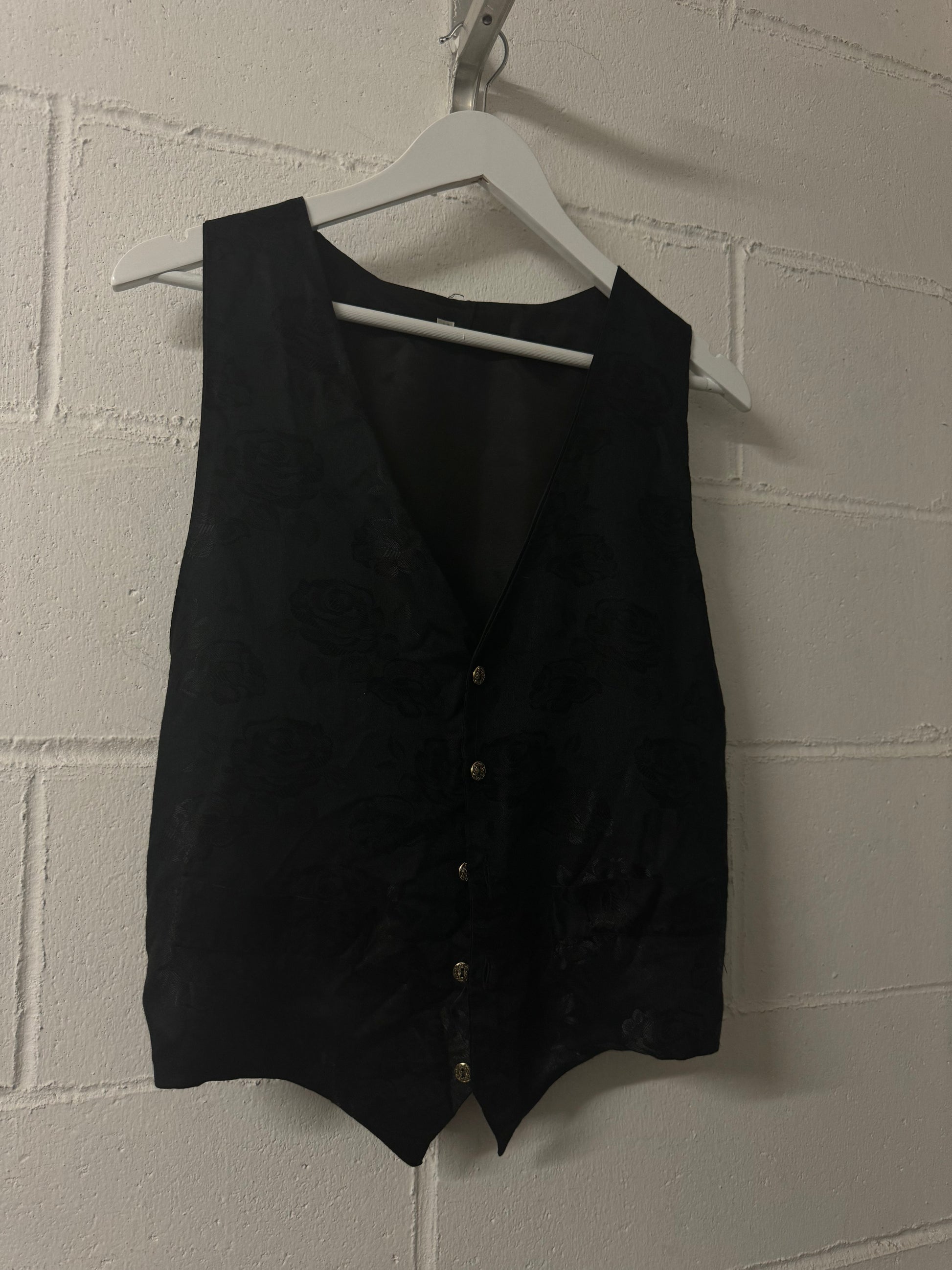 Gilet nero in raso di seta damascato, con bottoncini gioiello dorati.