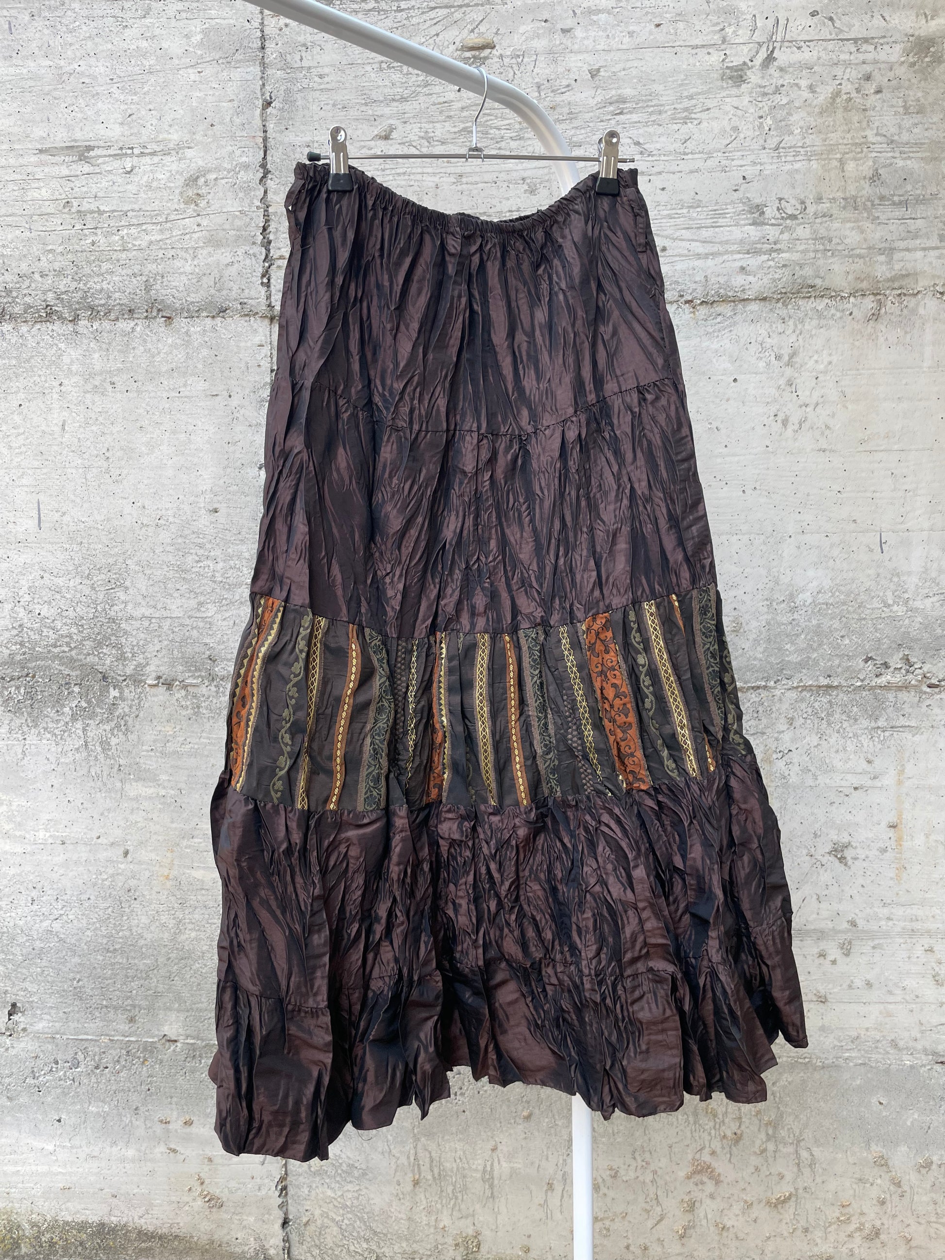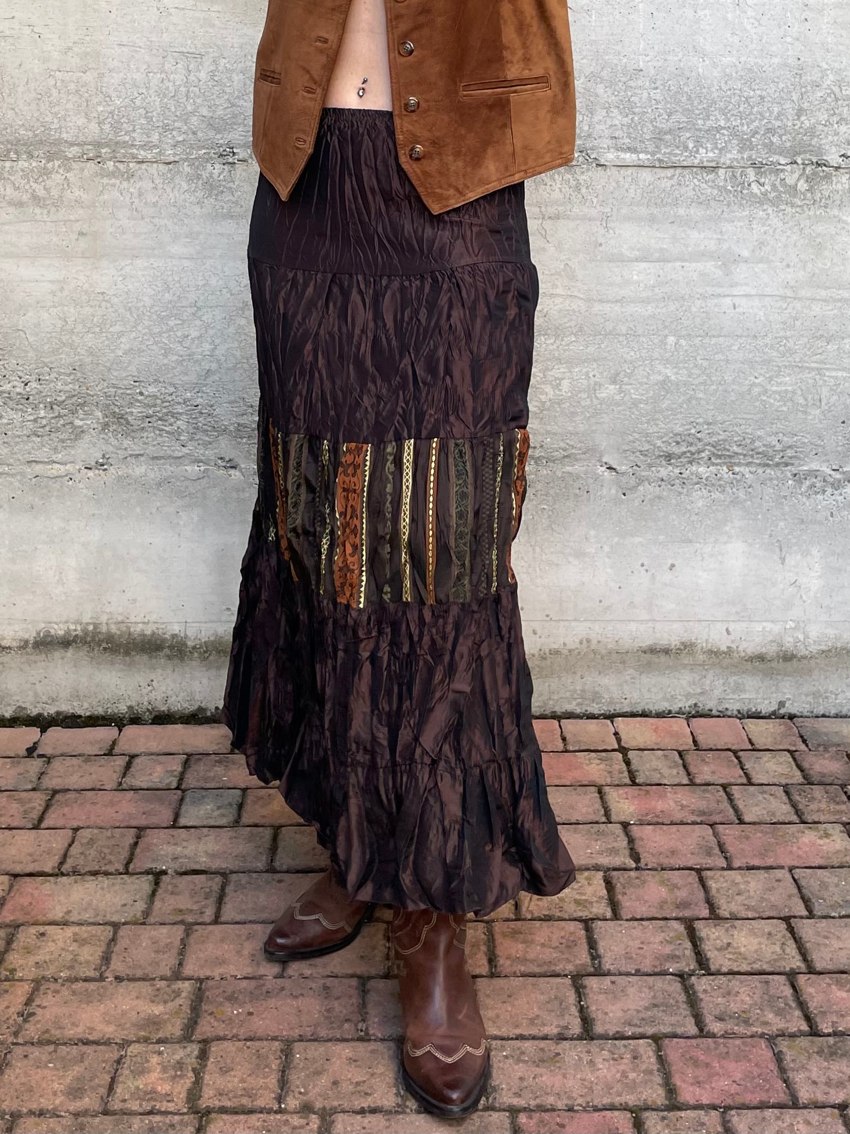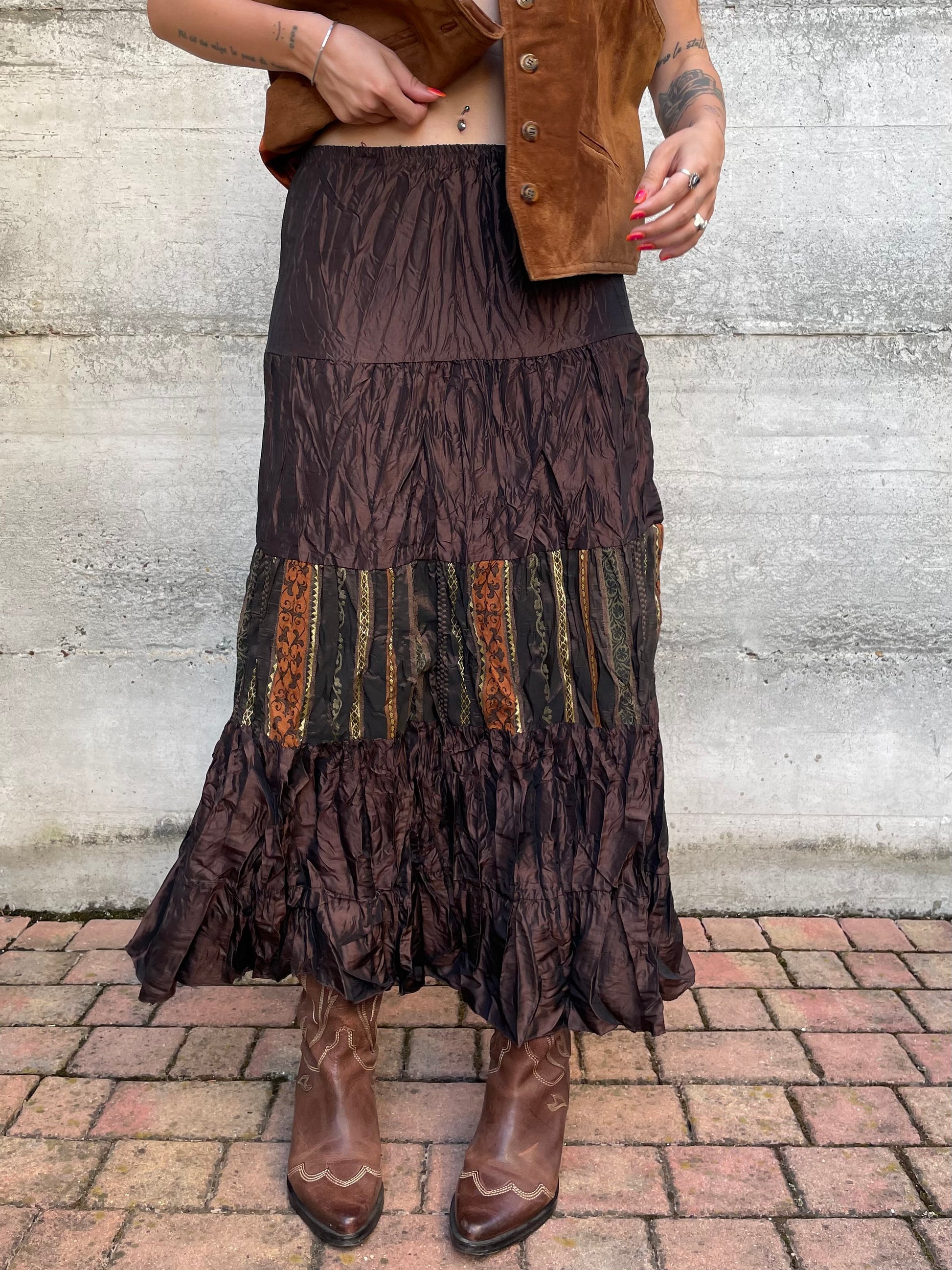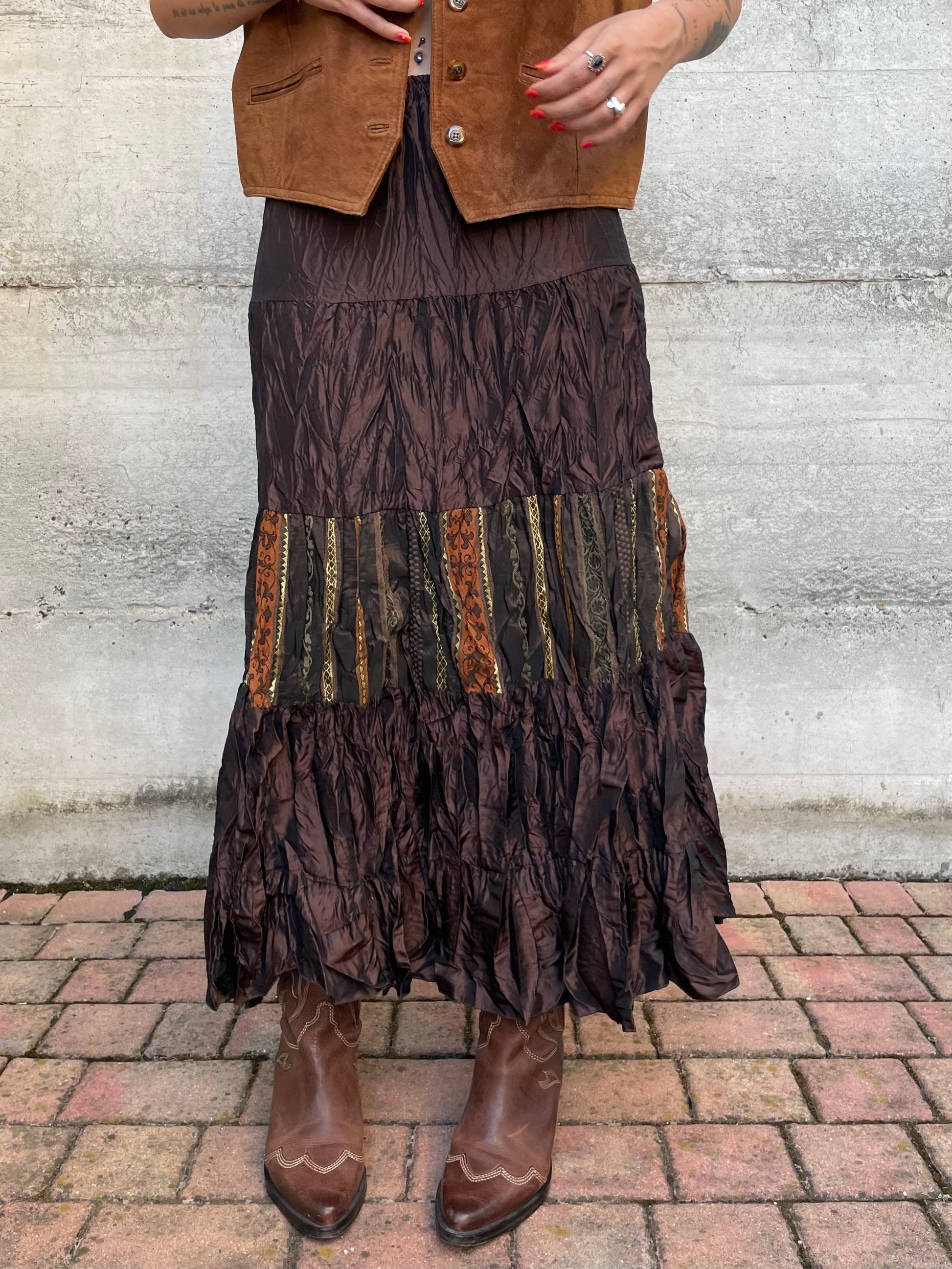 Gonna lunga marrone increspata con inserto etnico, taglia M