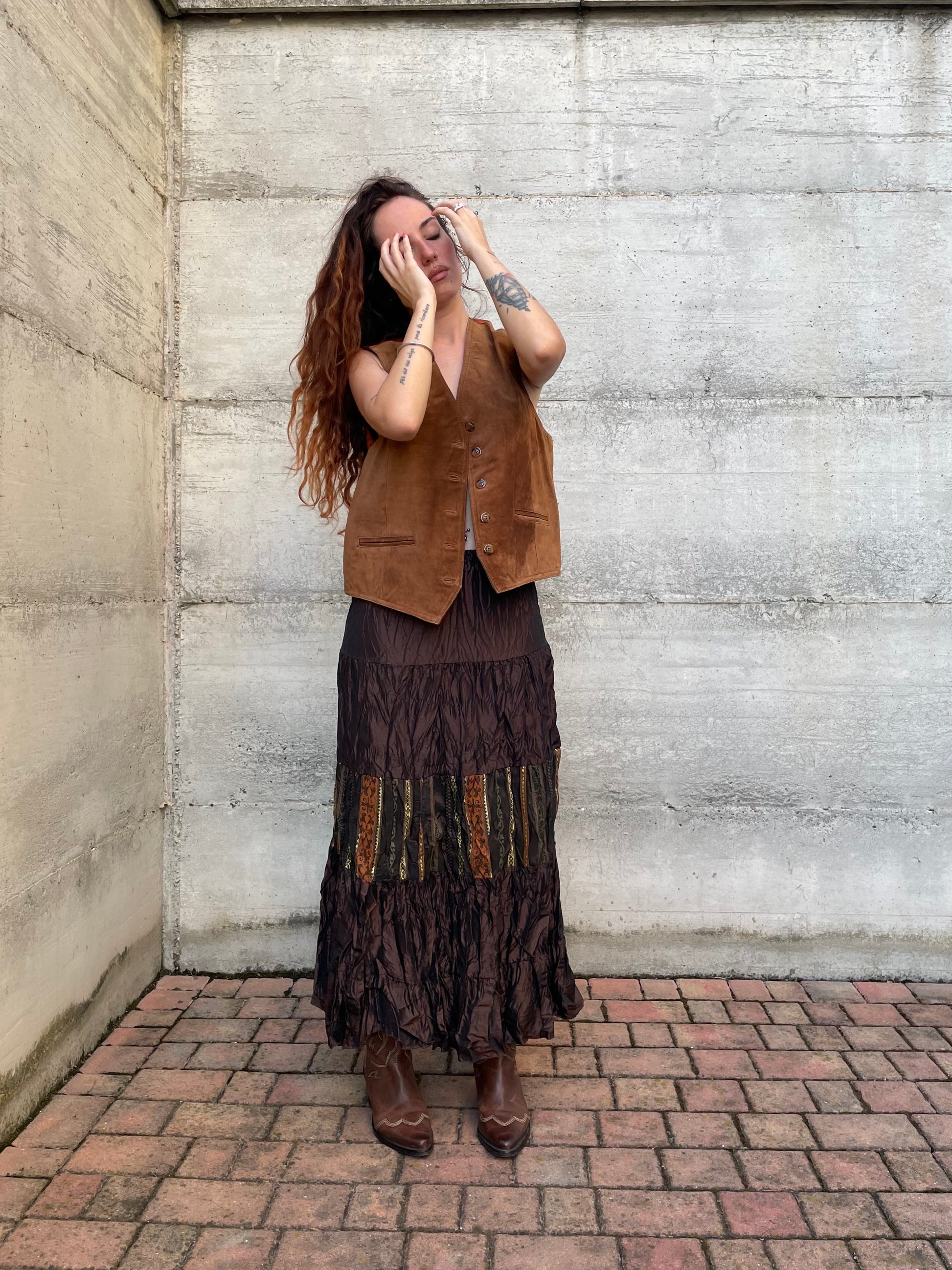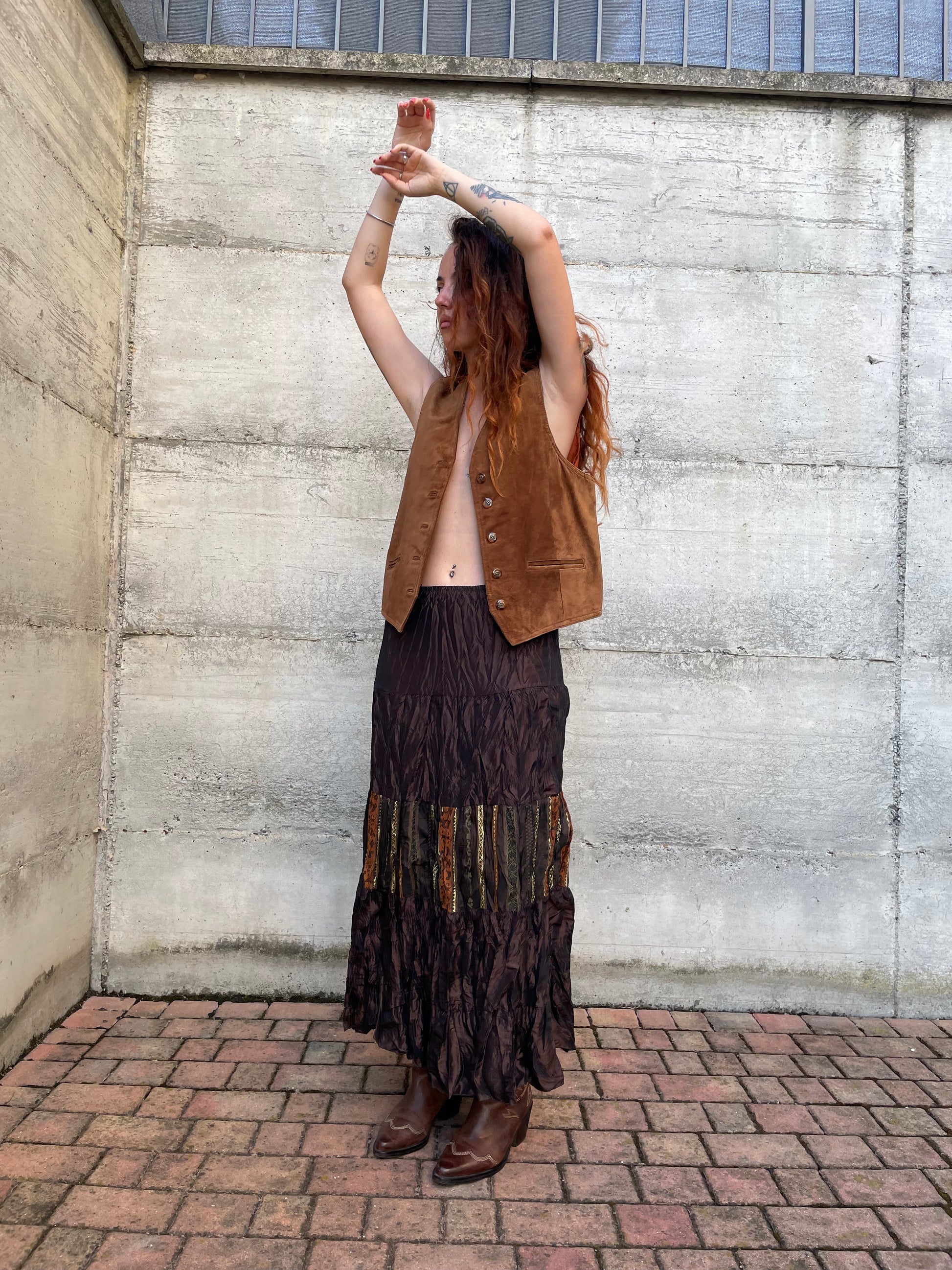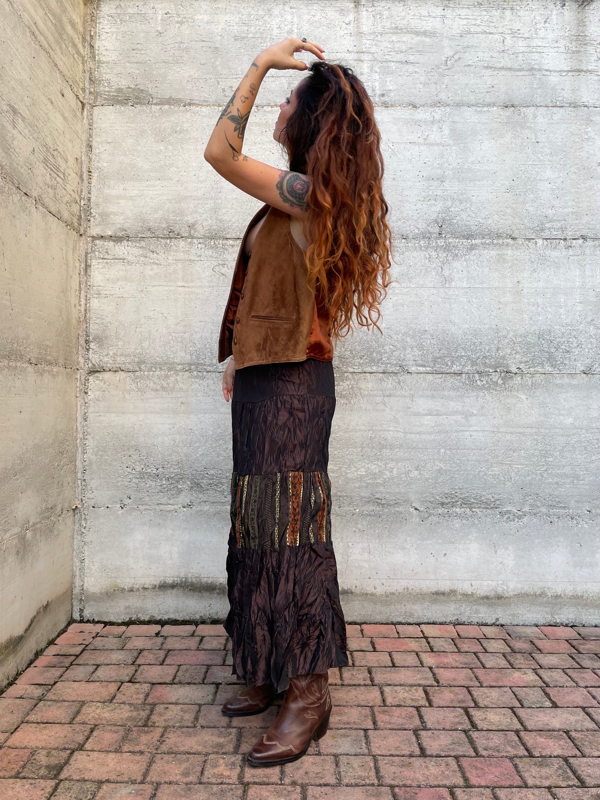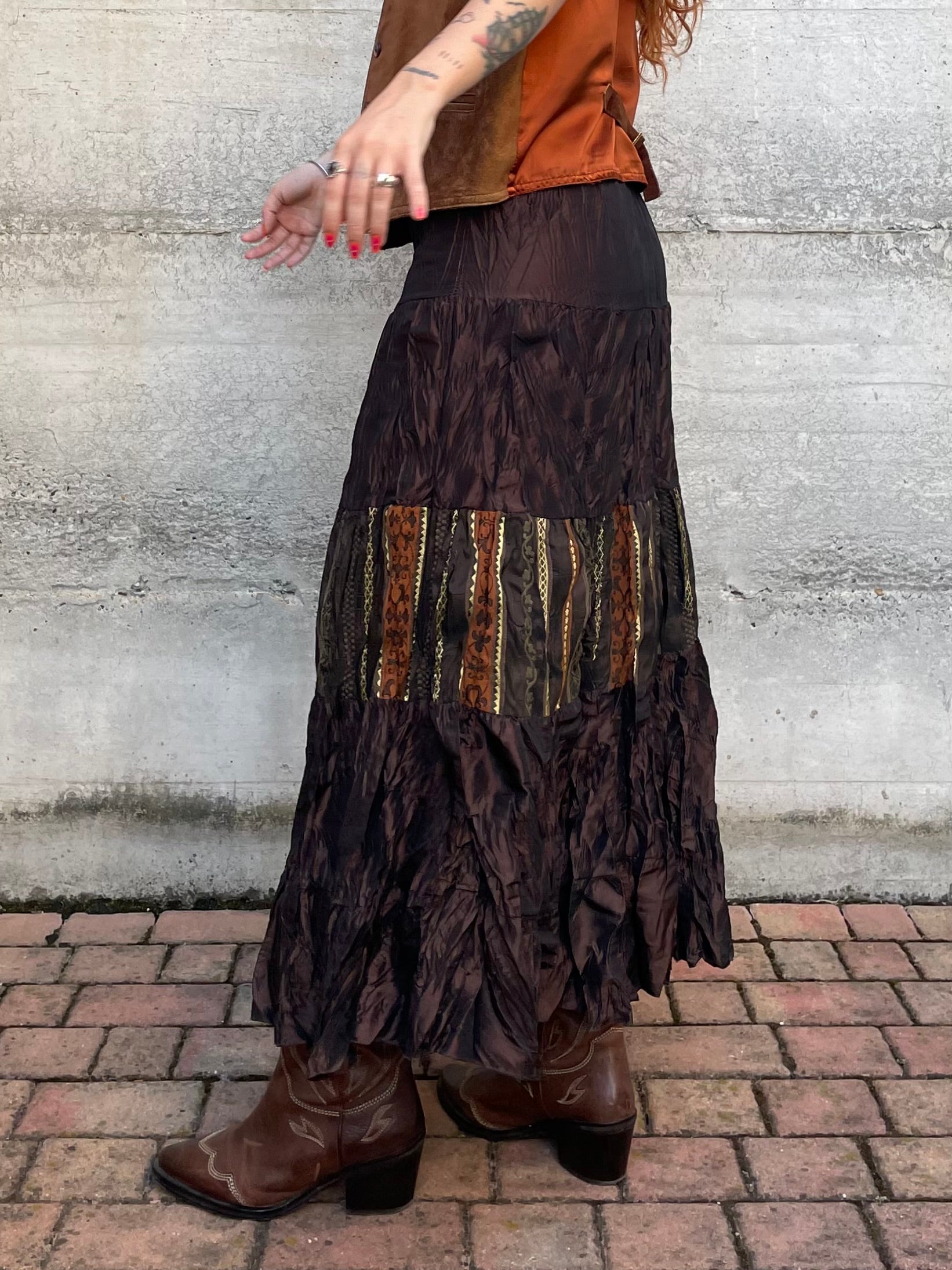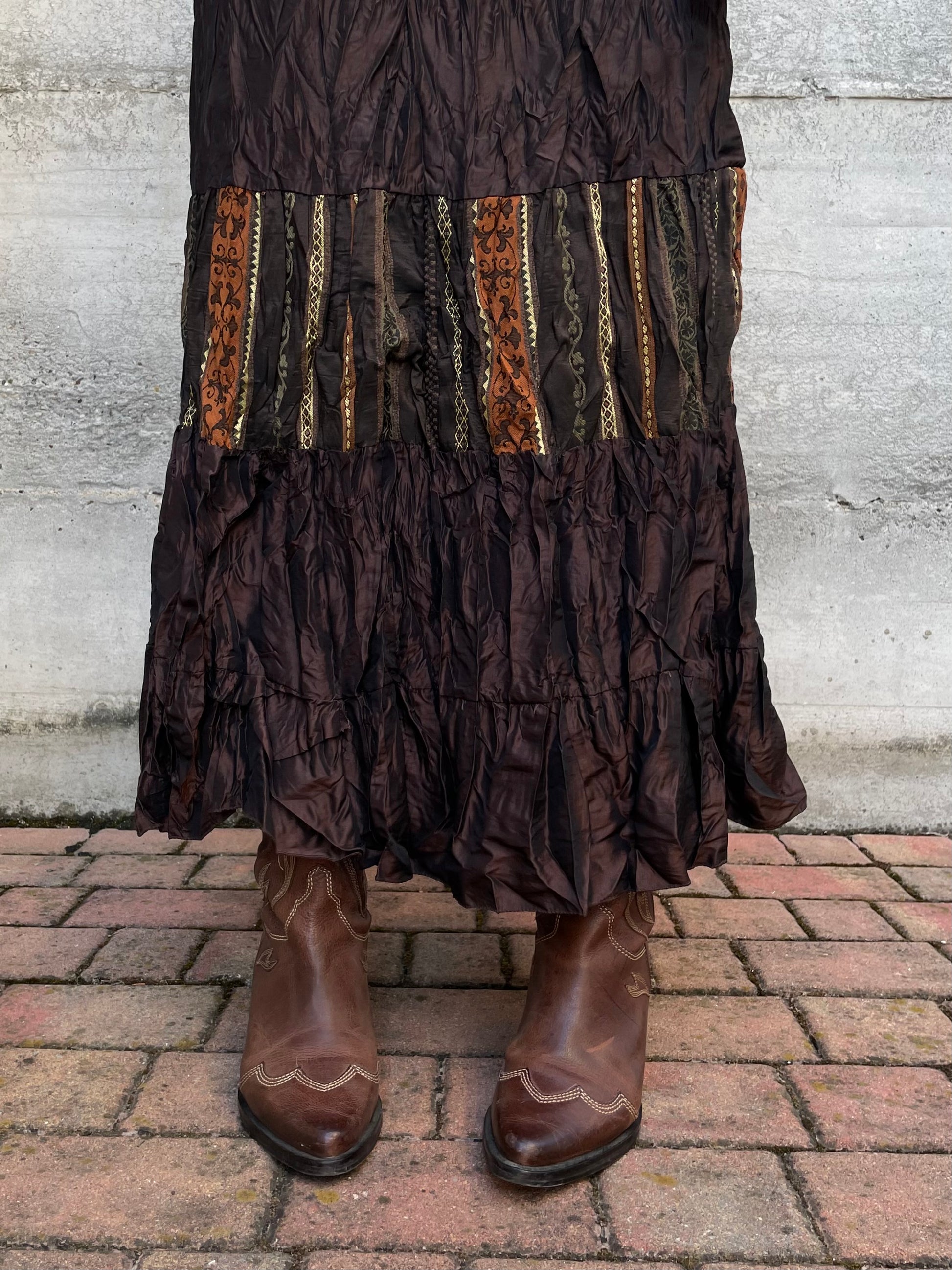 Gonna lunga marrone increspata con inserto etnico, taglia M