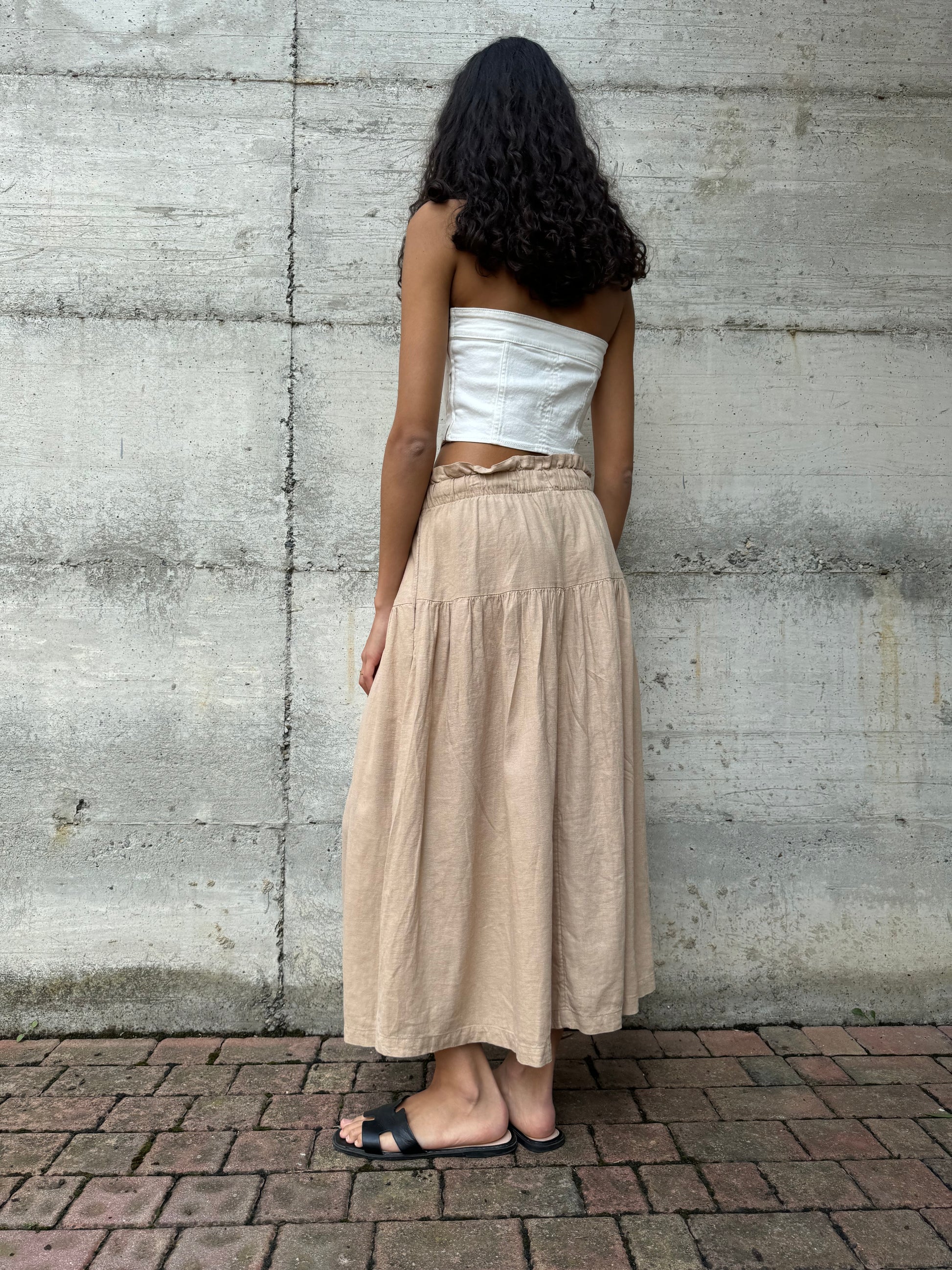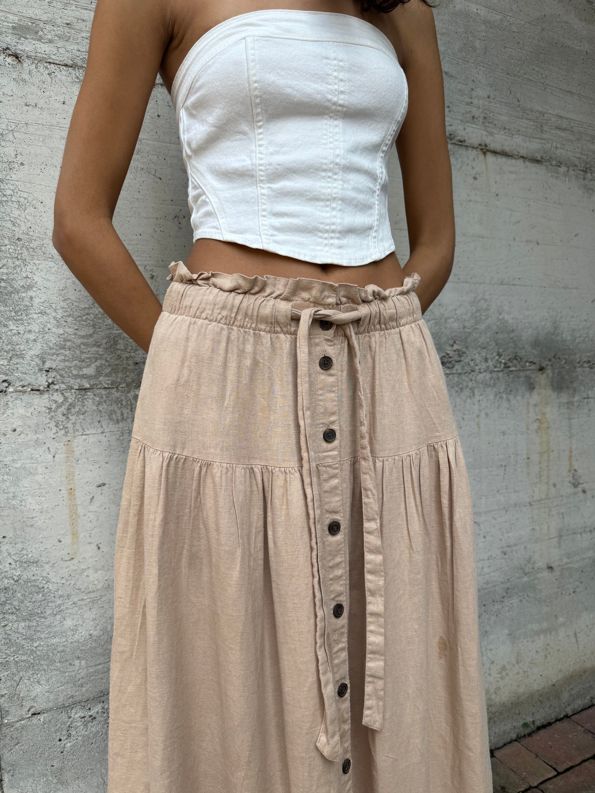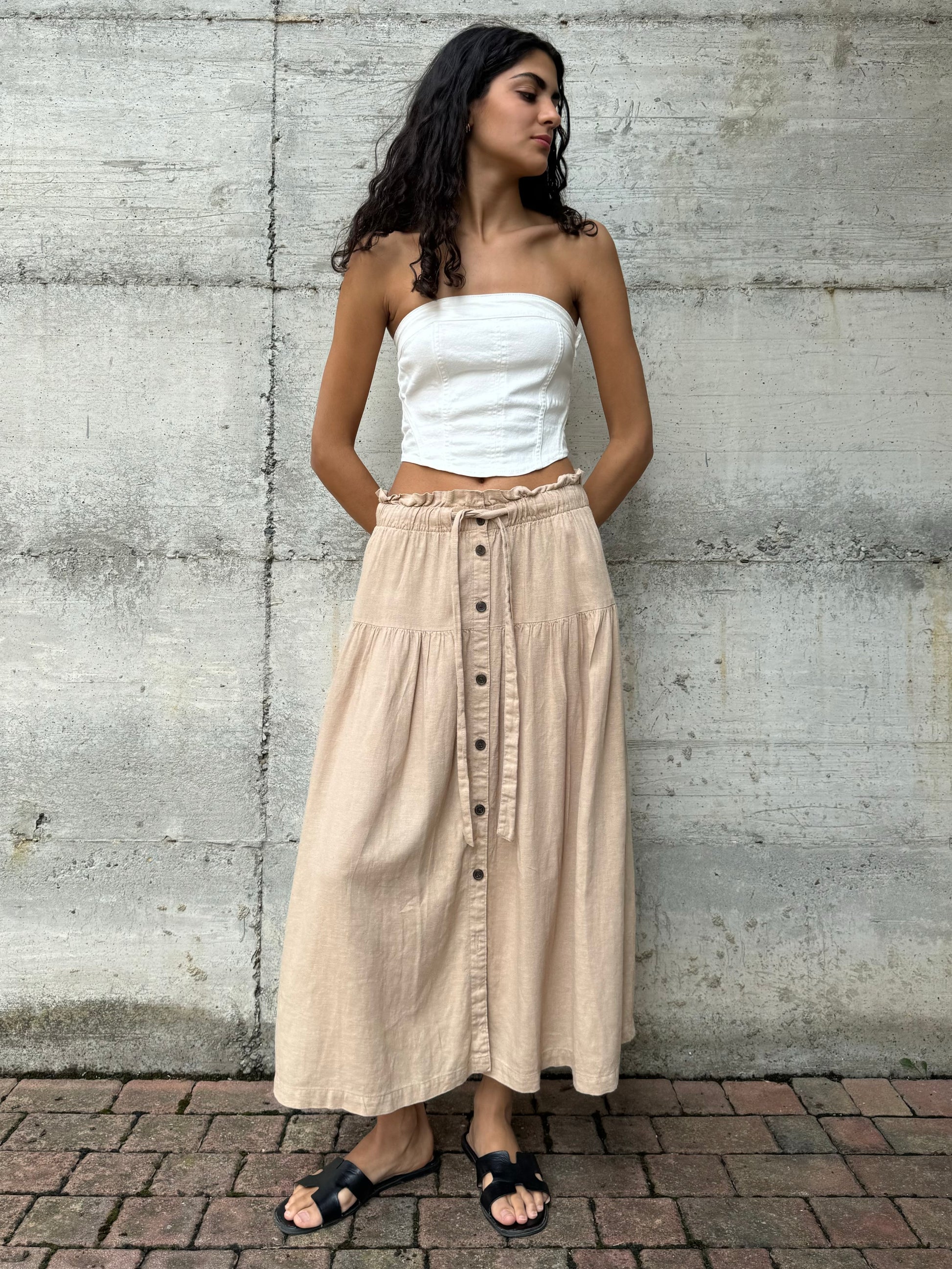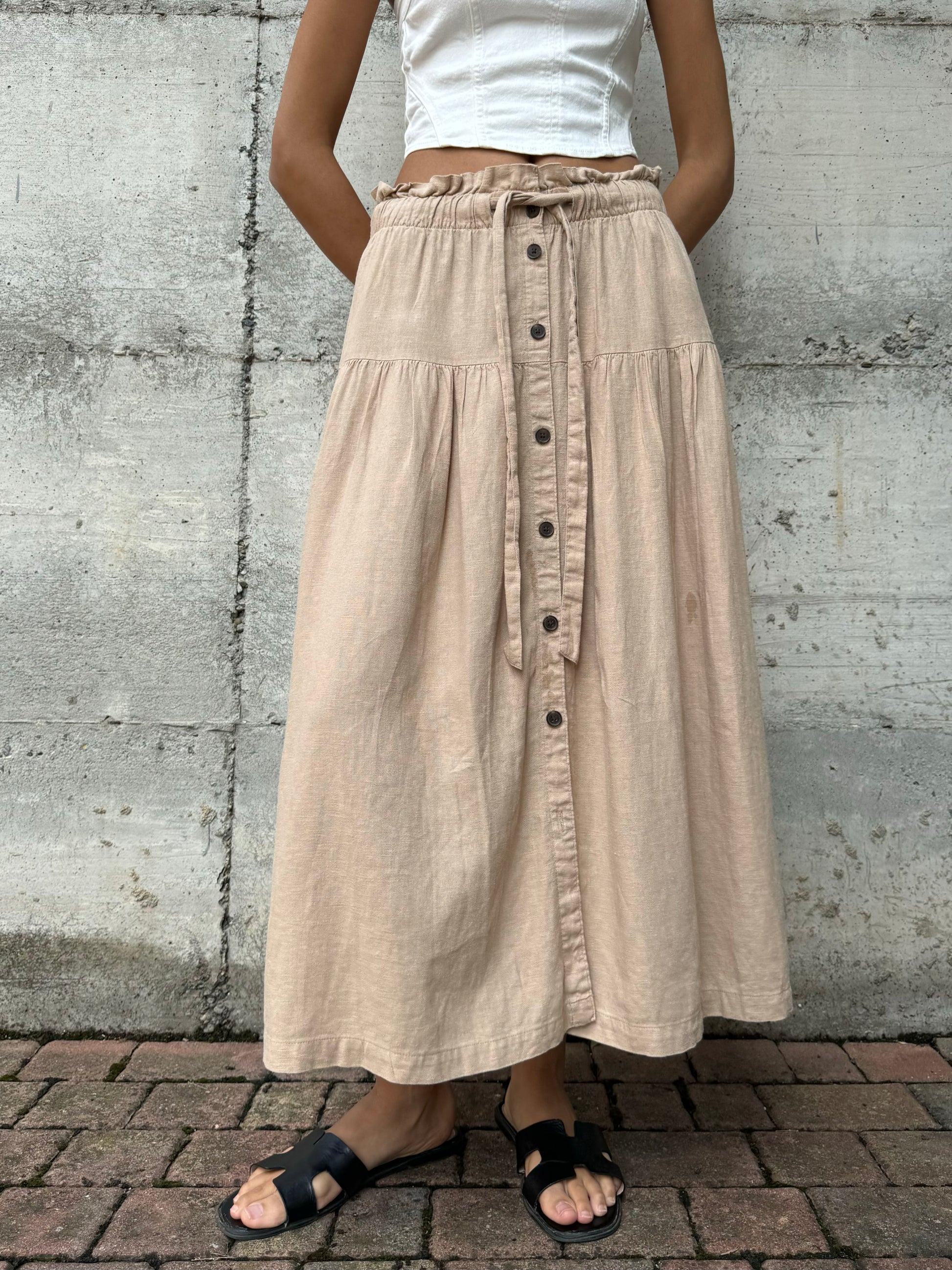 Gonna midi a ruota con coulisse in vita e bottoni frontali a scopo estetico.