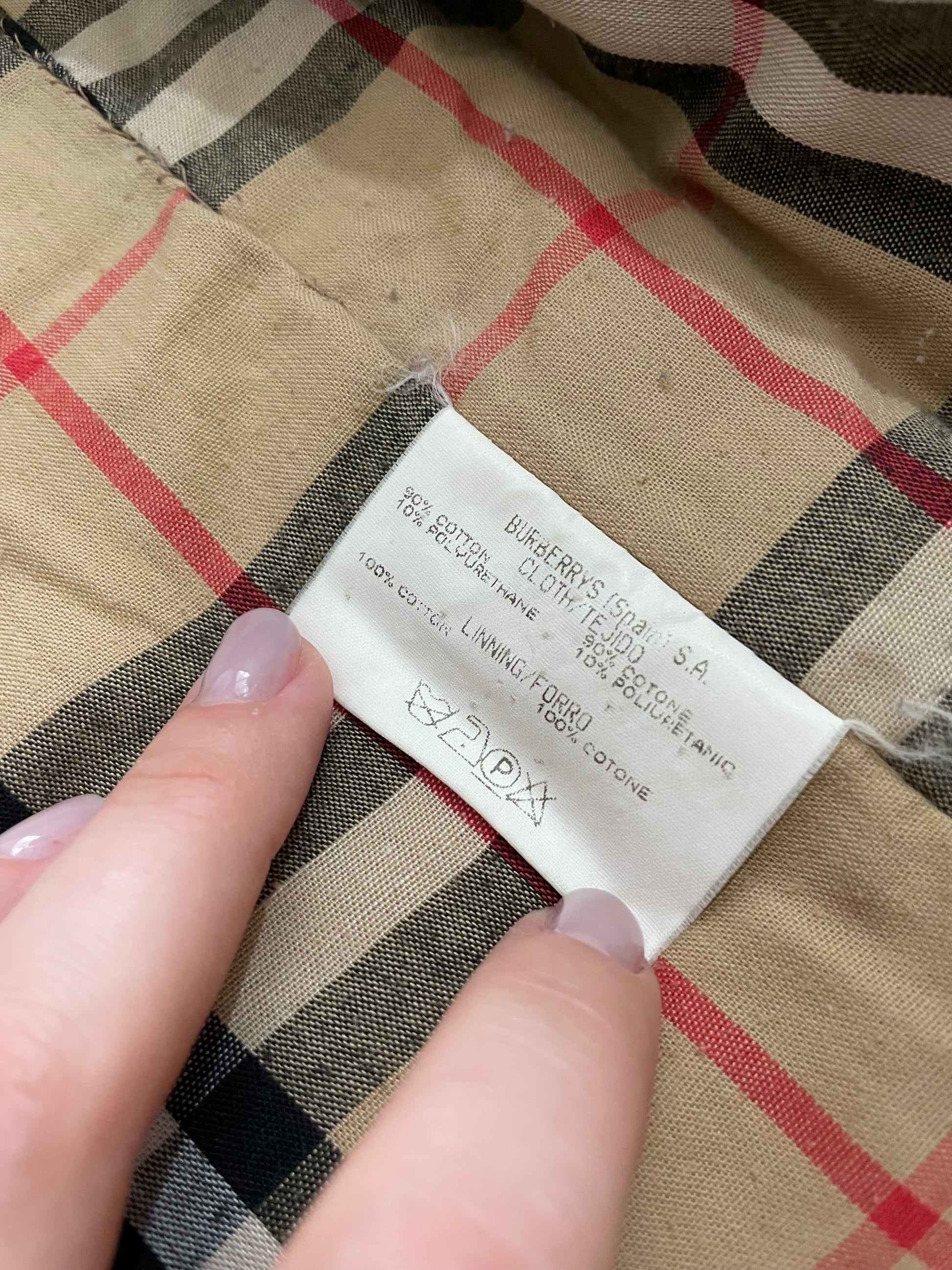 Esterno beige, colletto e bordi in velluto marrone, fodera sempre in cotone con il classico check.