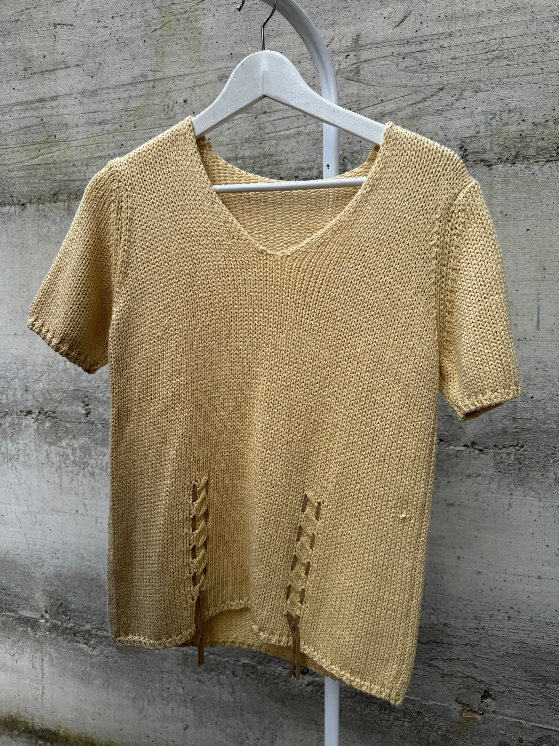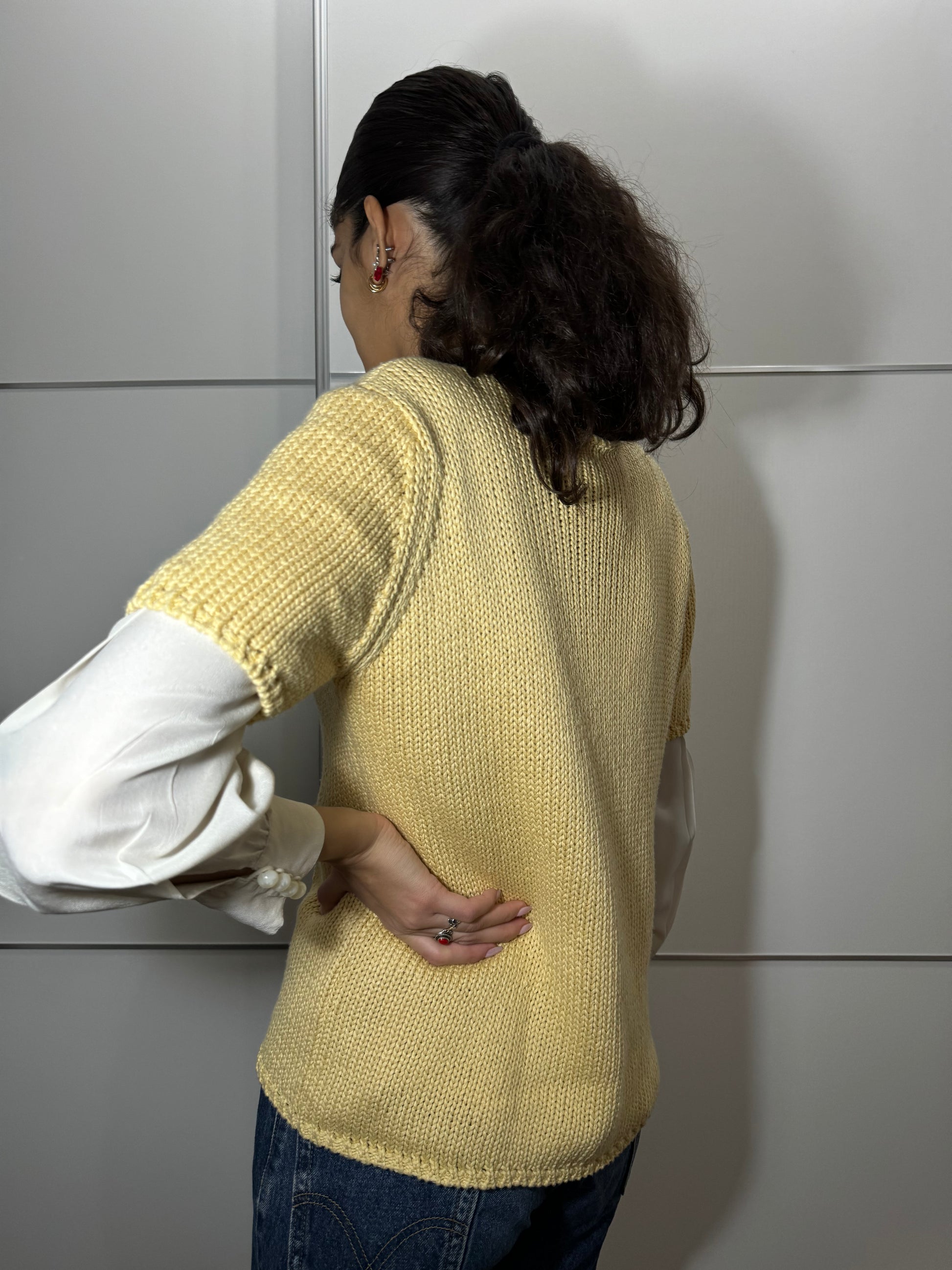 Maglioncino crochet girocollo a manica corta, giallo, al tatto direi in cotone spesso.