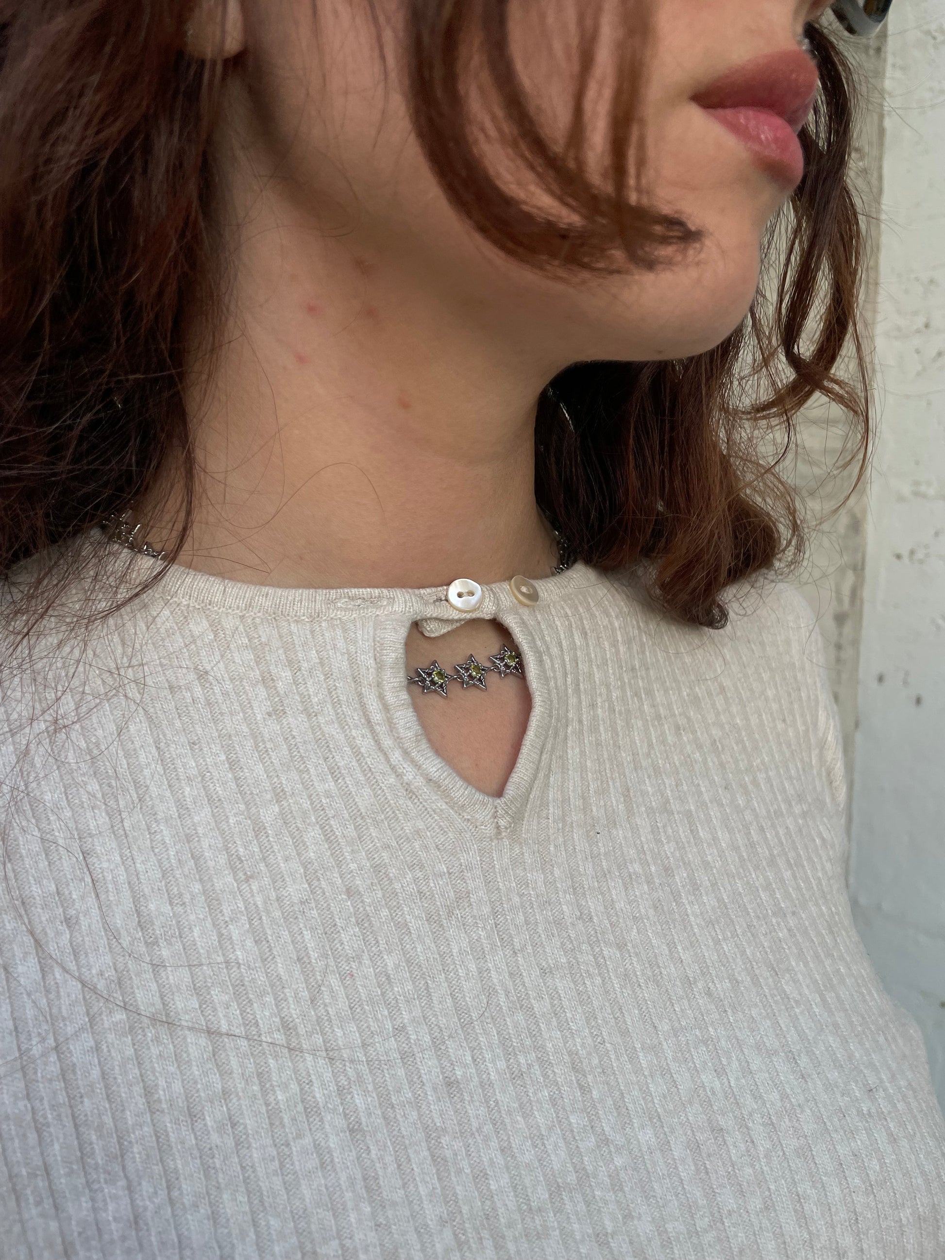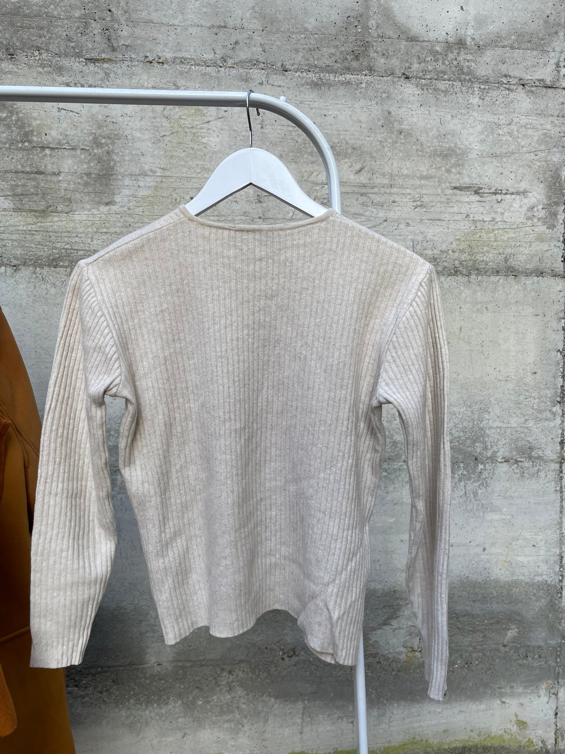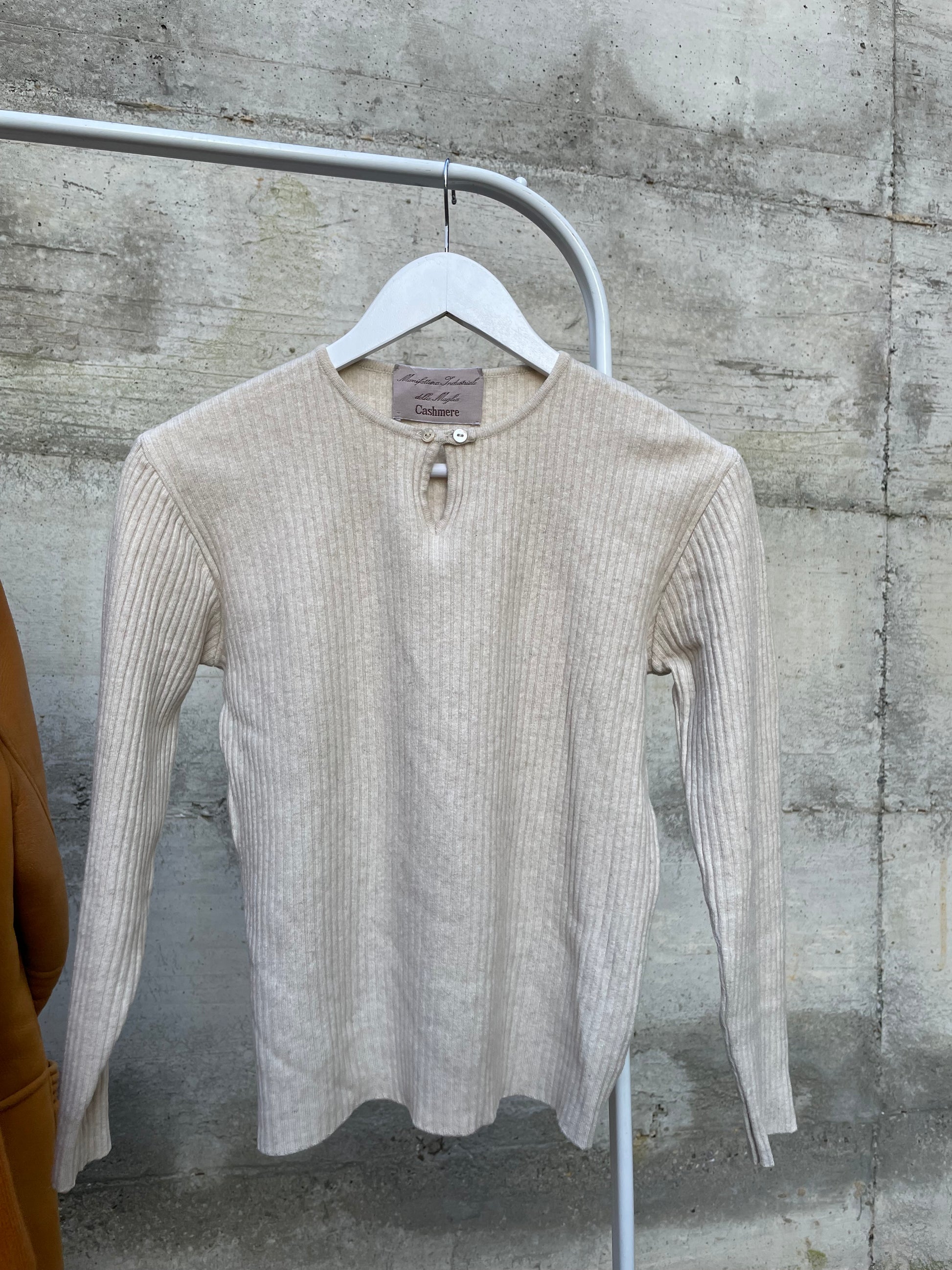 Splendido maglioncino sottogiacca sabbia in puro cashmere, con dettaglio cut out regolabile con bottoncino.