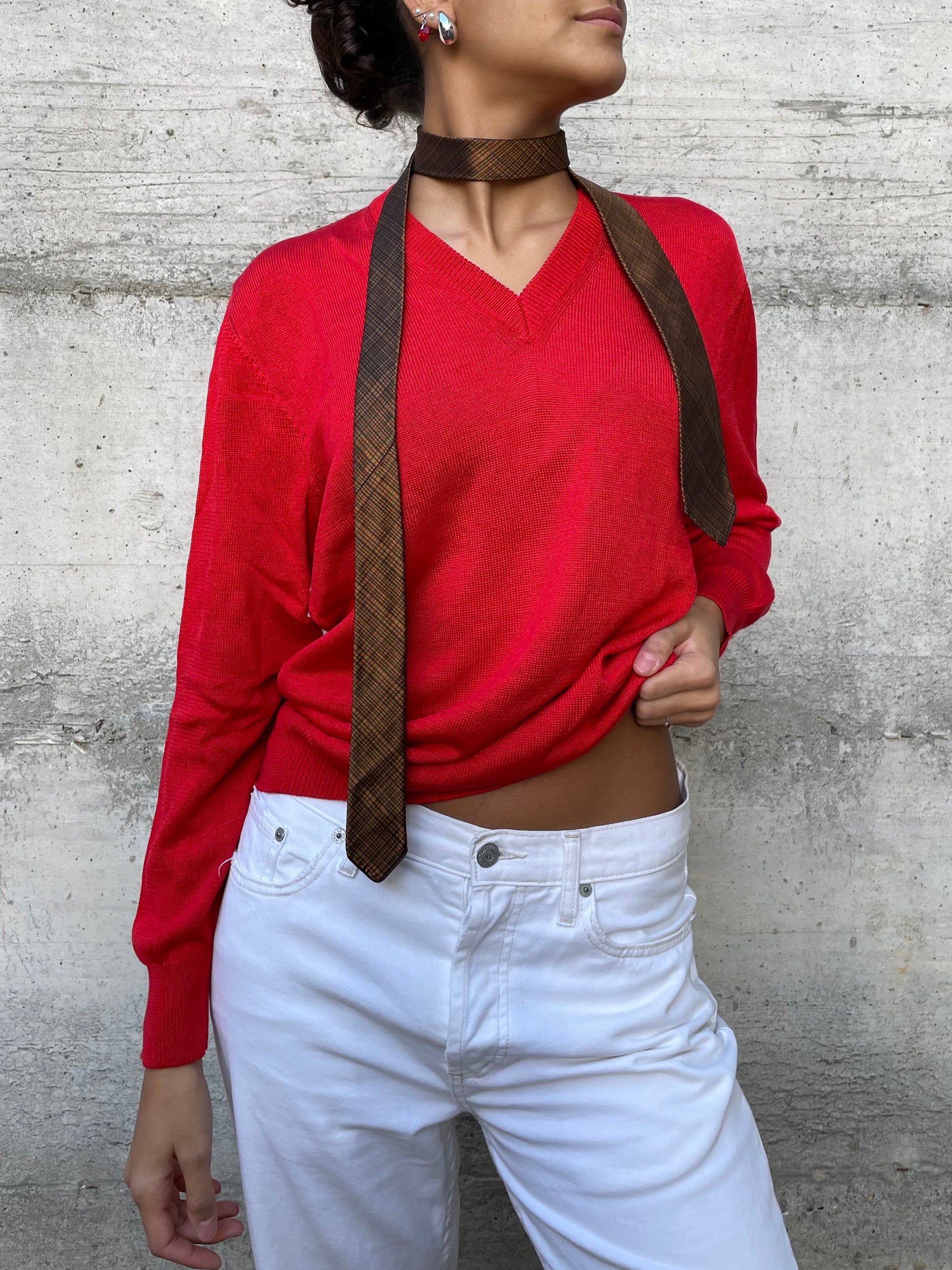 Maglioncino sartoriale in cotone rosso acceso, con scollo a V, 100% cotone.