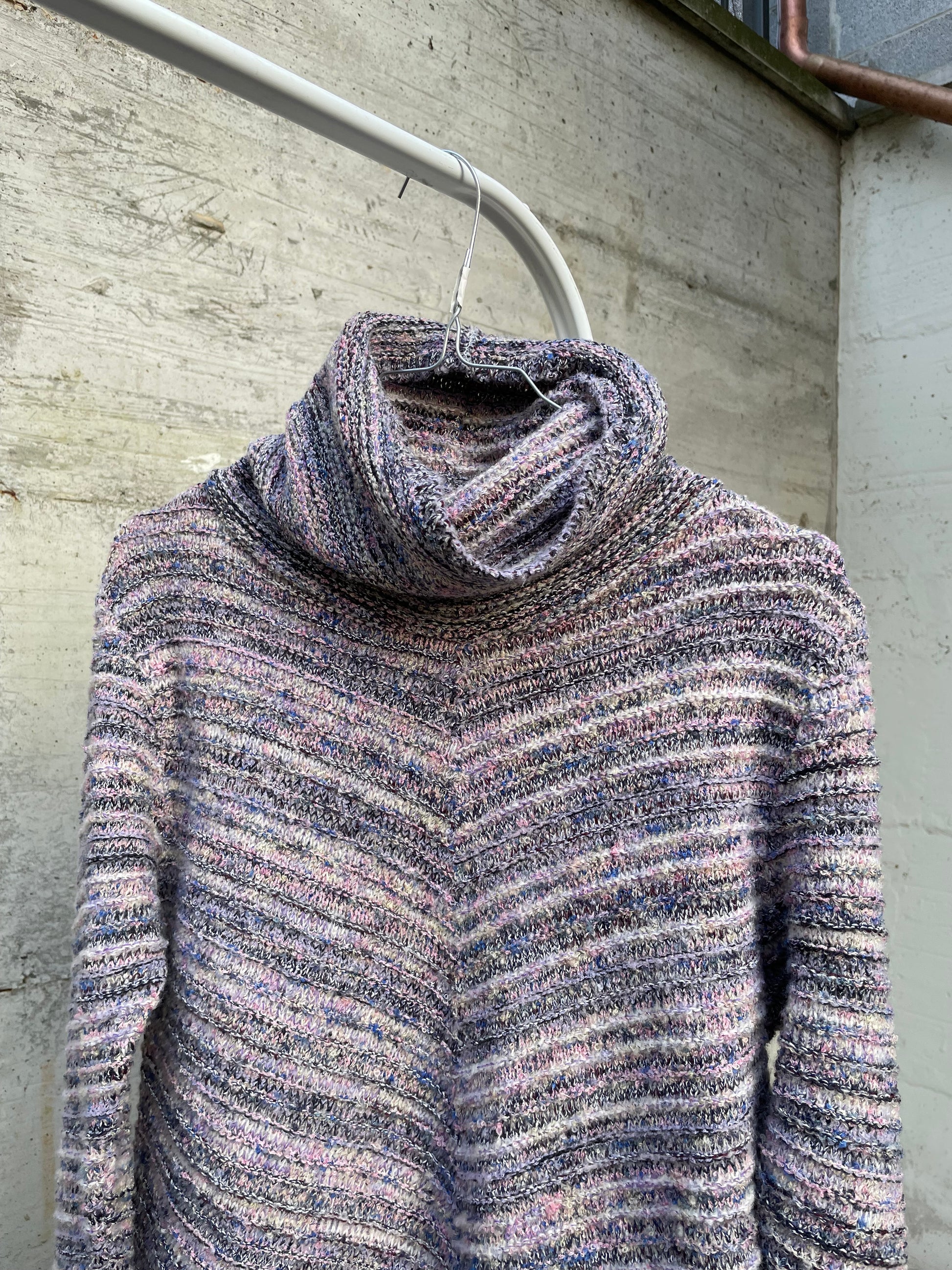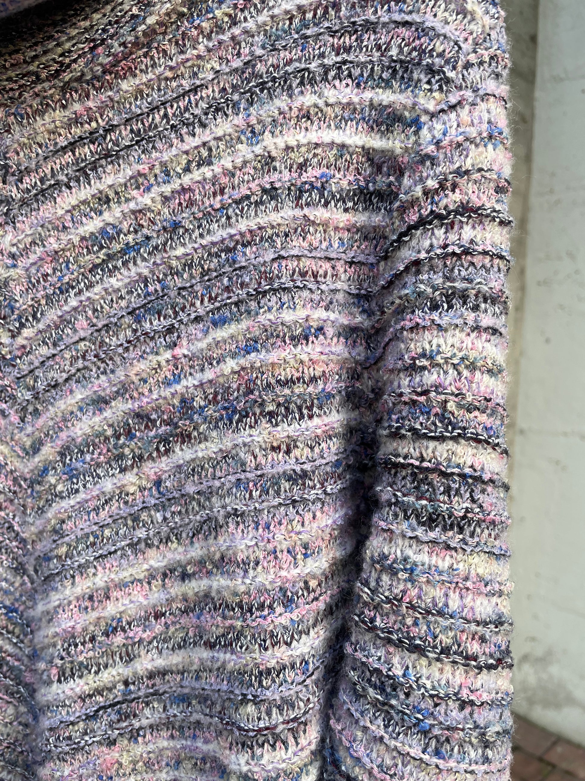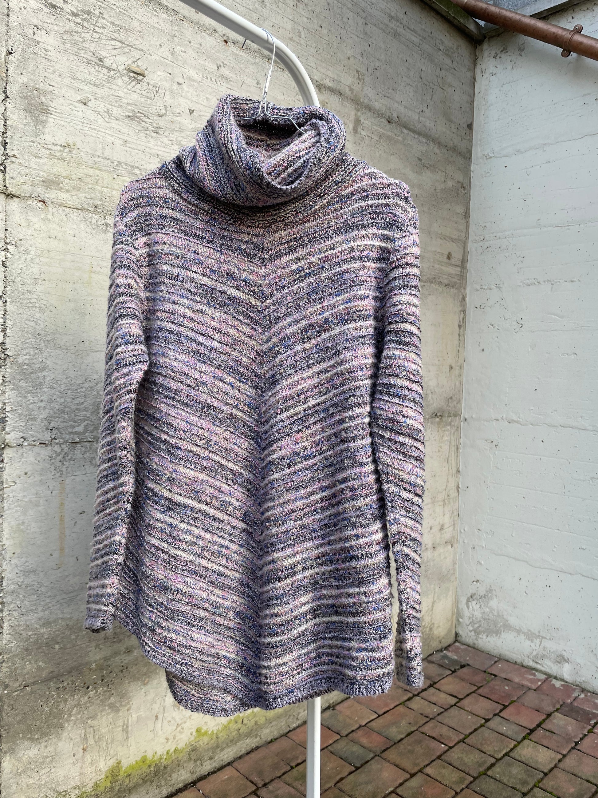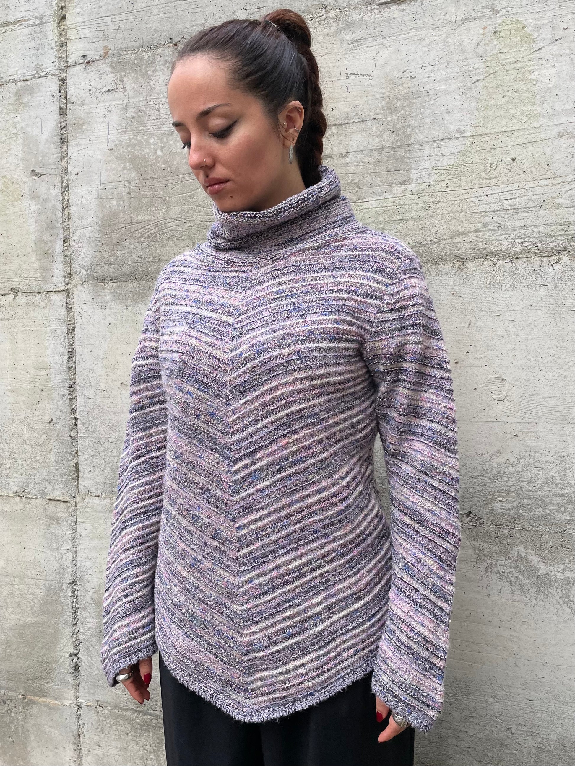 Maglione a collo alto in misto lana Missoni vibes, sui toni del bianco, blu e rosa.
