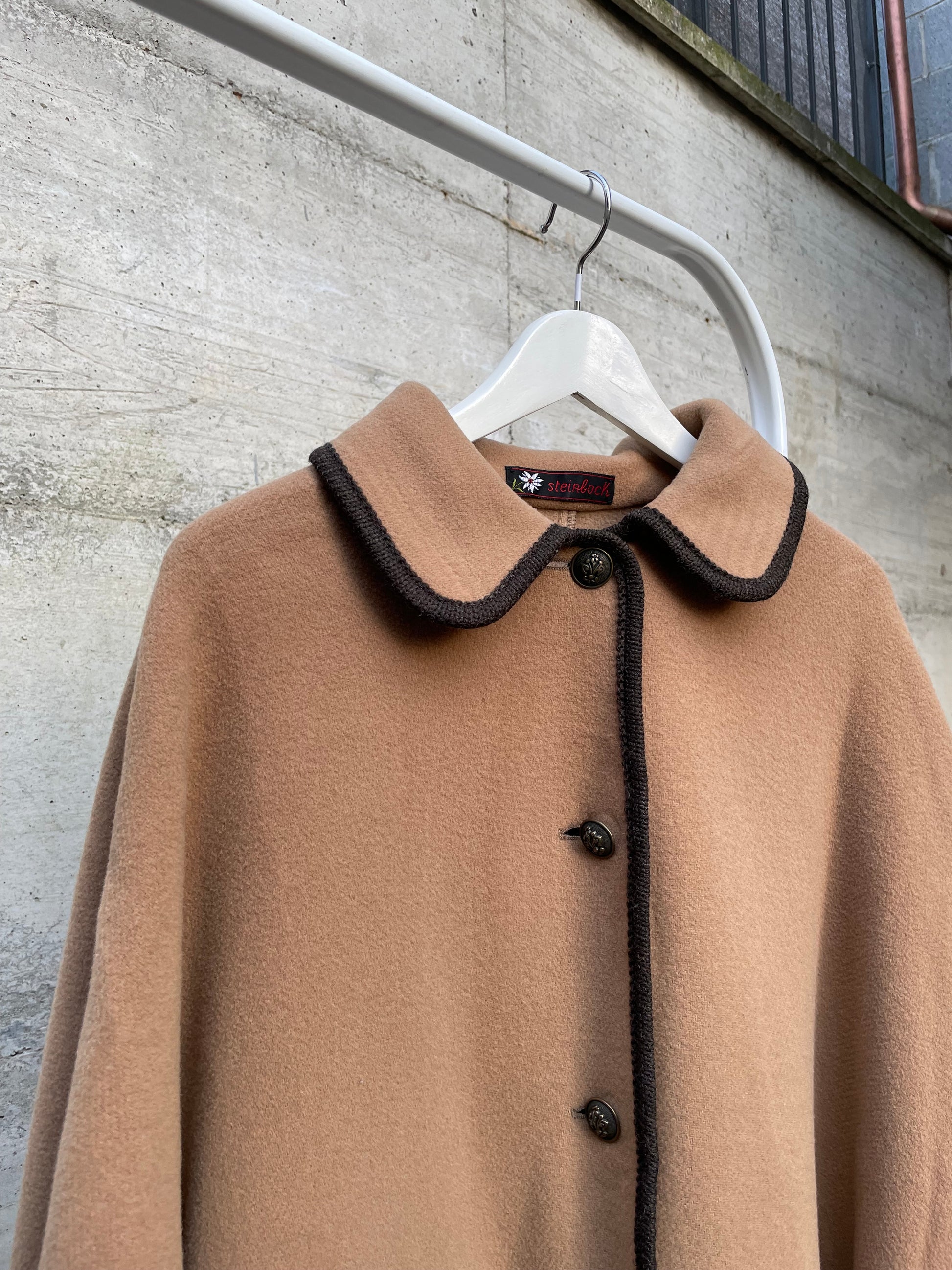 Color biscotto, bordata in marrone scuro e con bottoni metallici.
