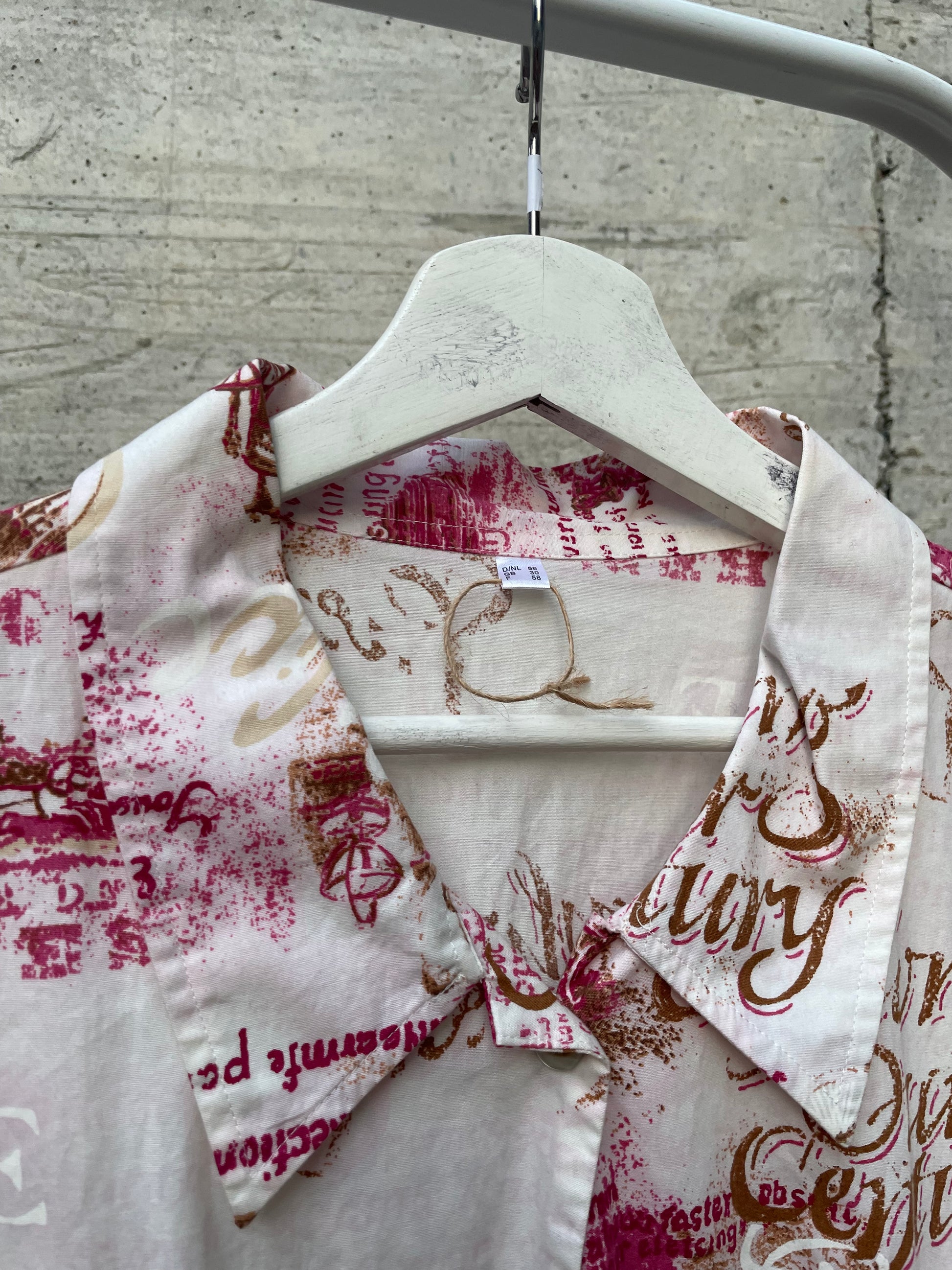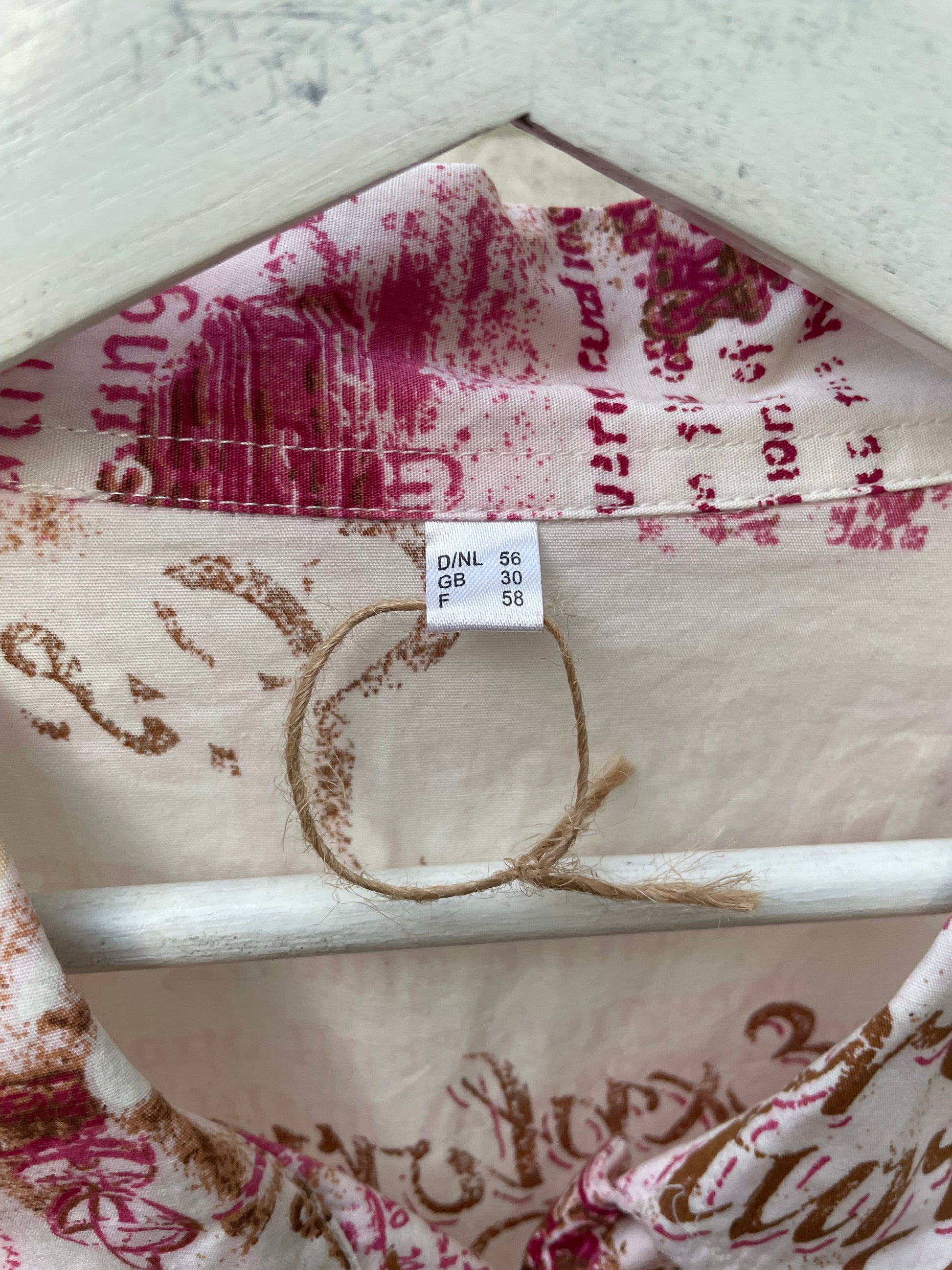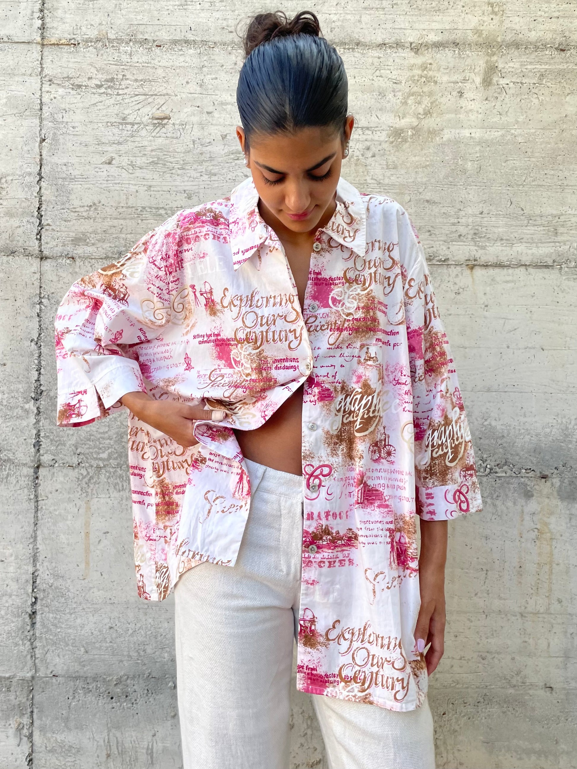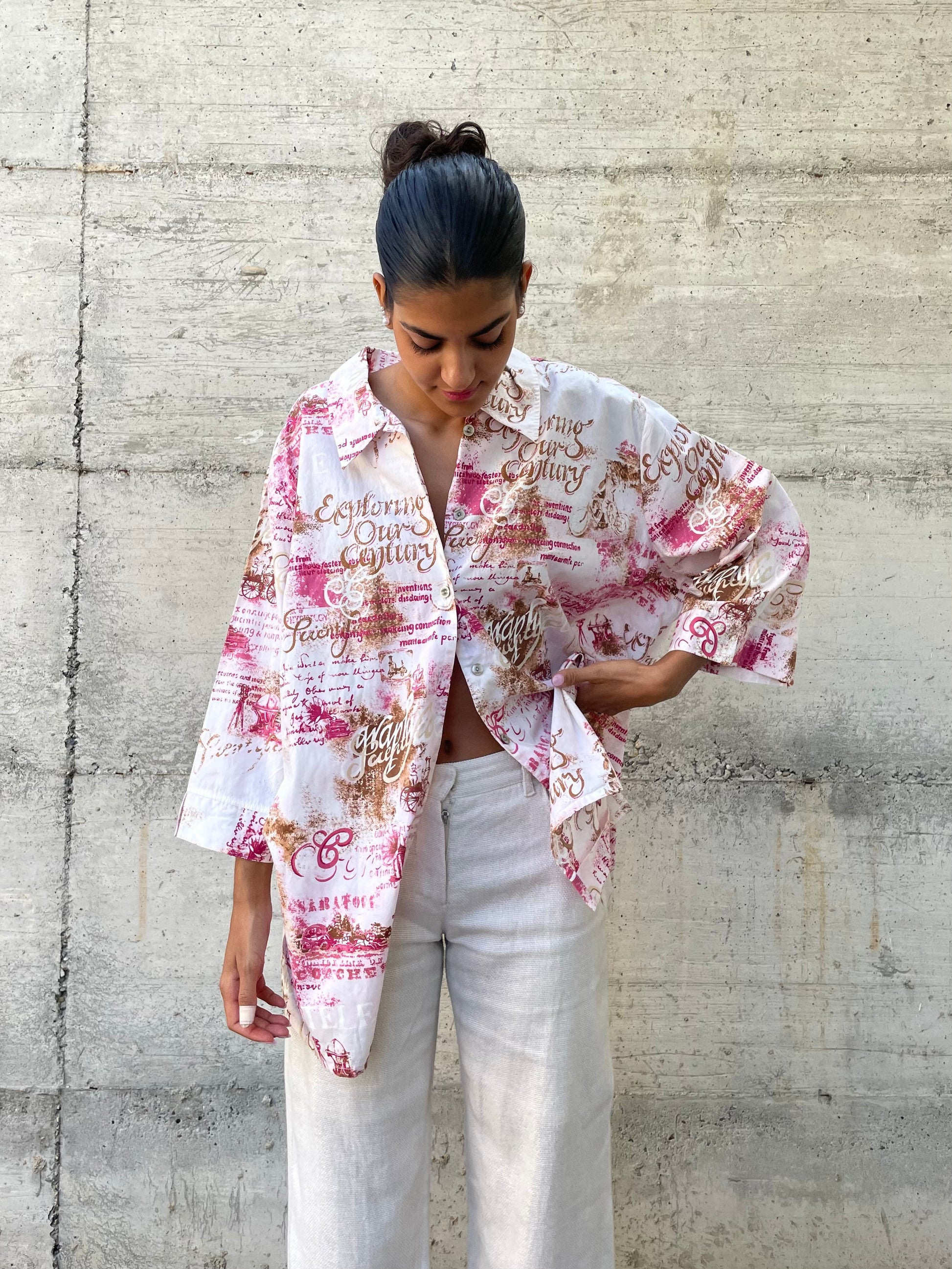 Maxi camicia taglio kimono 100% cotone, a fantasia sui toni del fucsia e marrone su sfondo bianco.