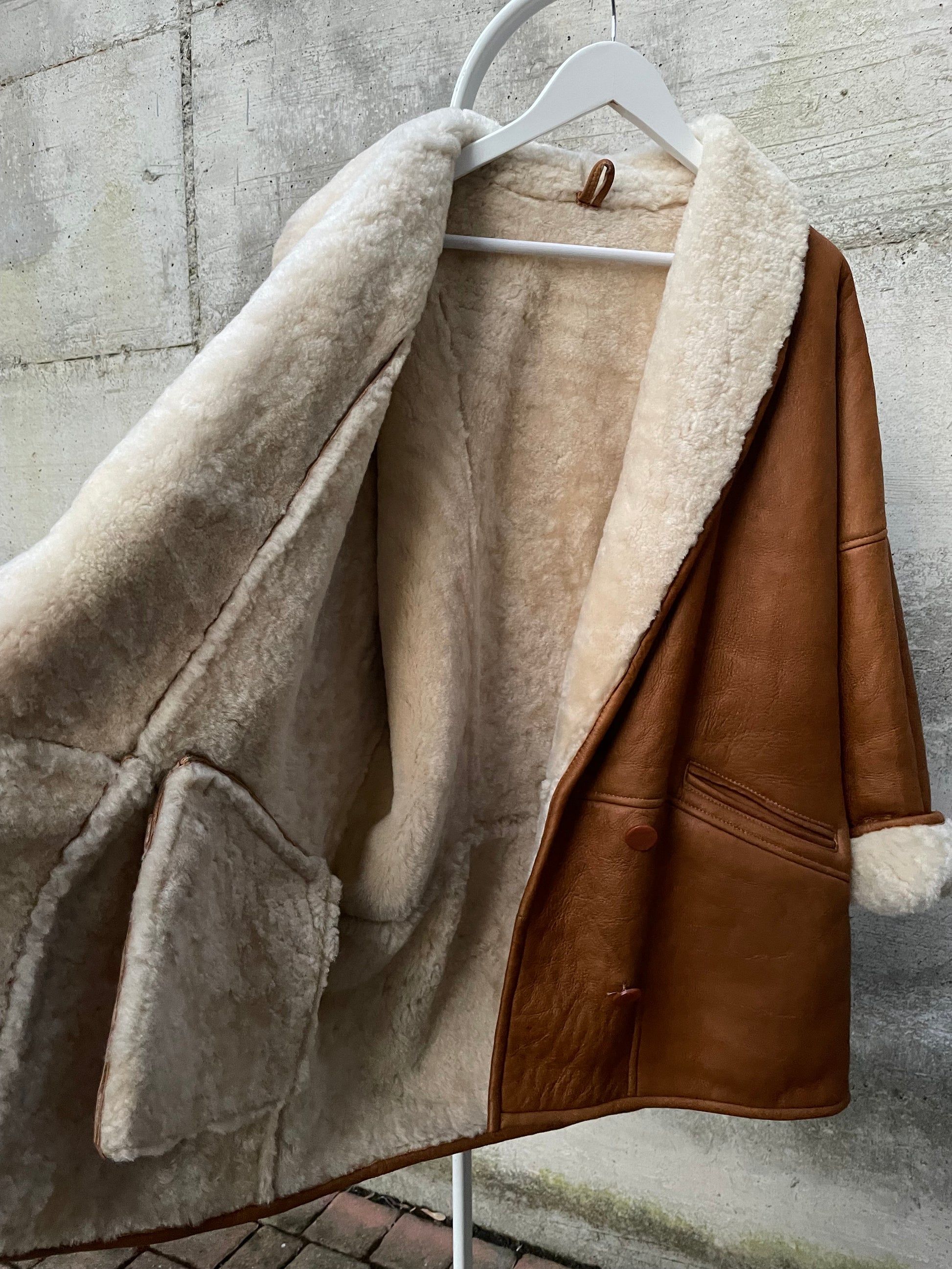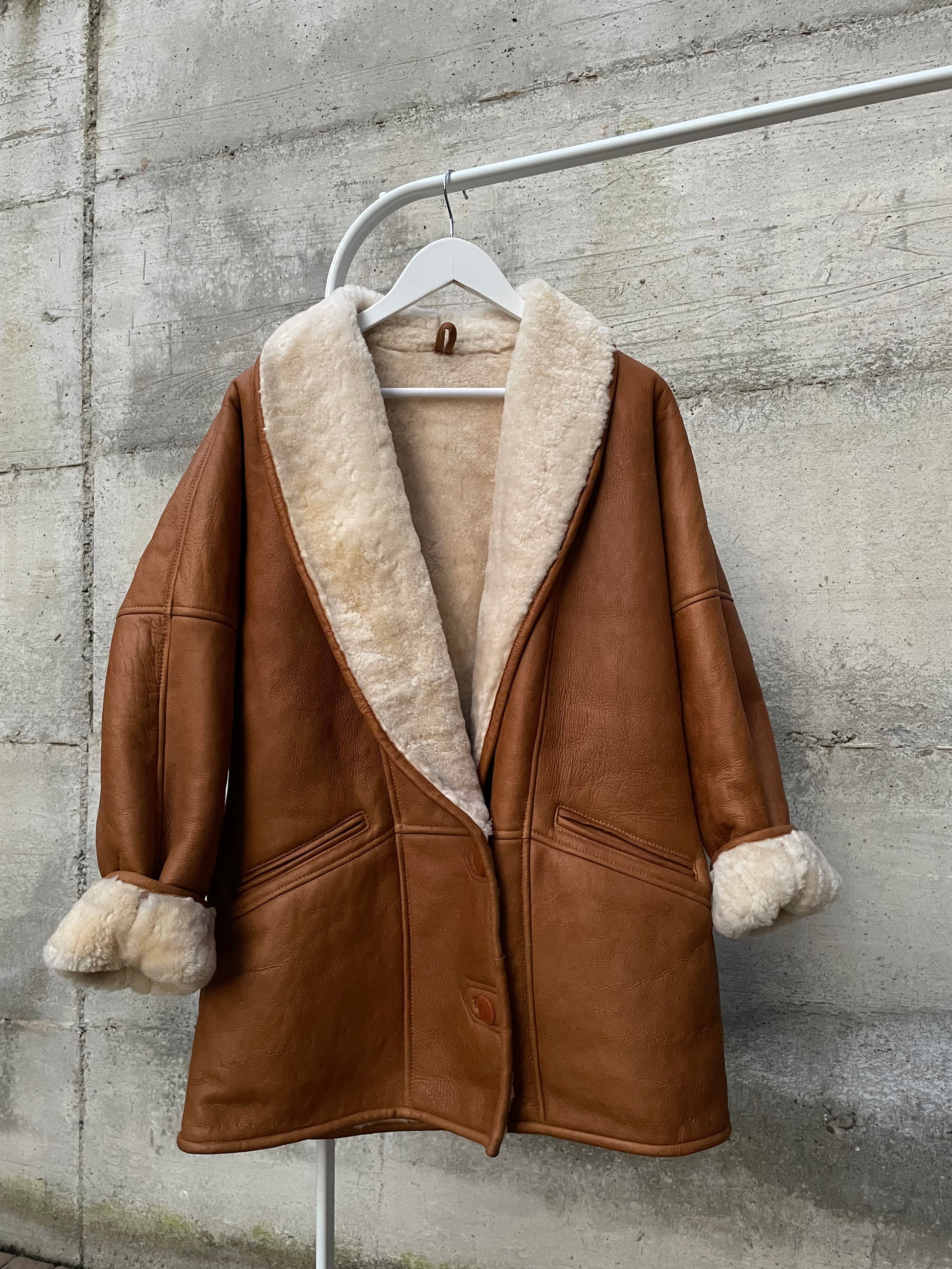 Montone originale Shearling in pelle color caramello, pelo interno raso bianco.